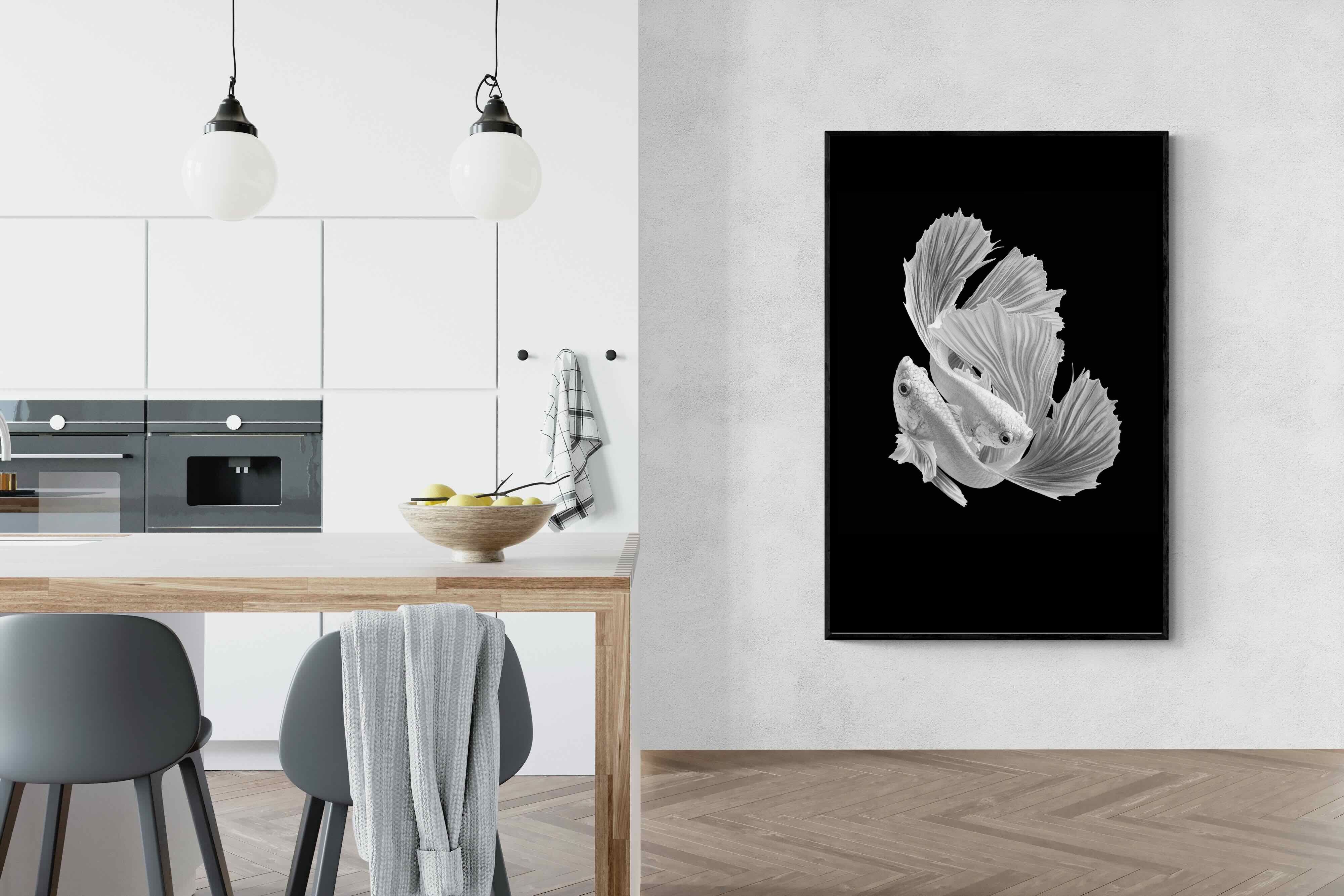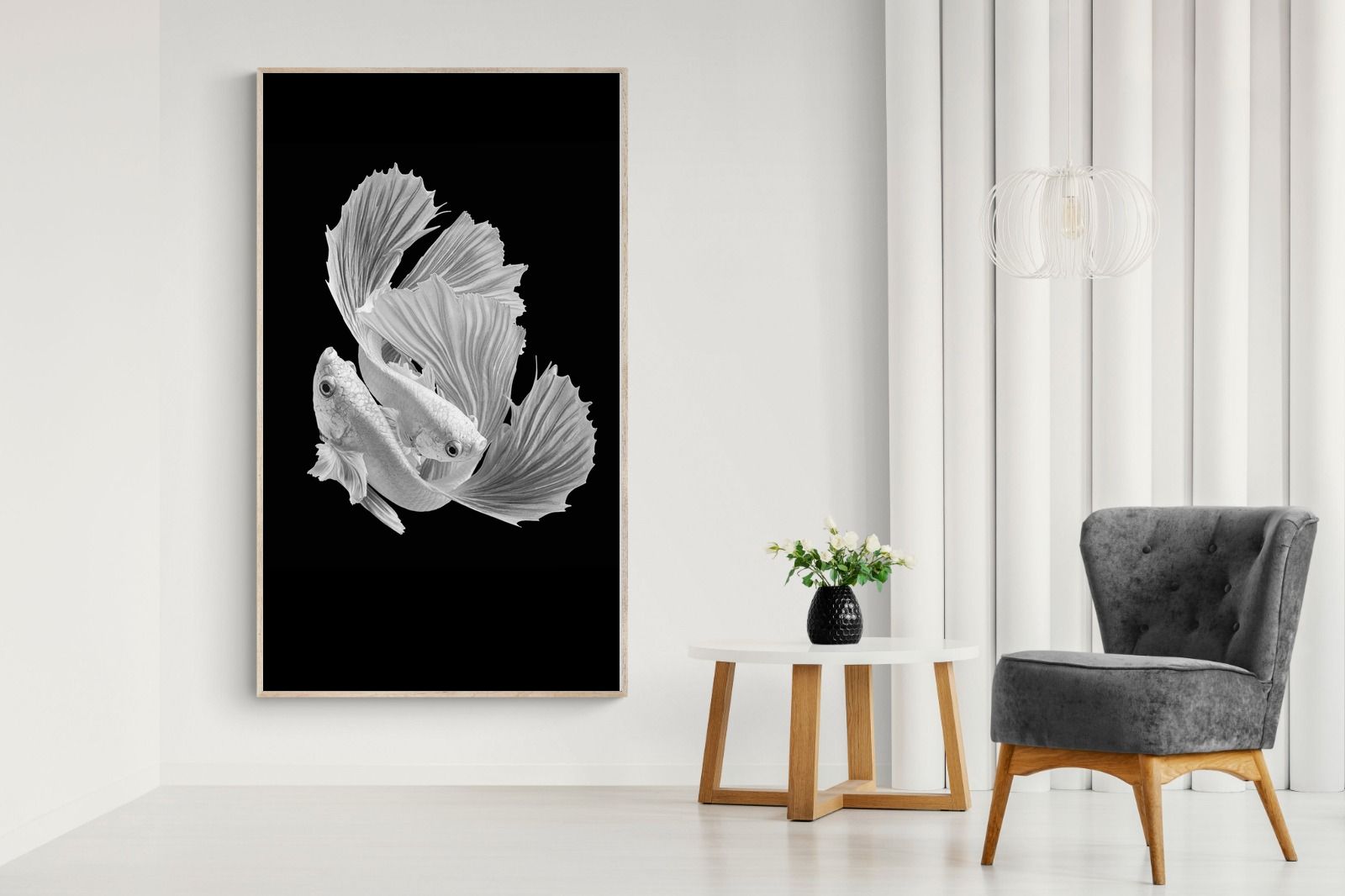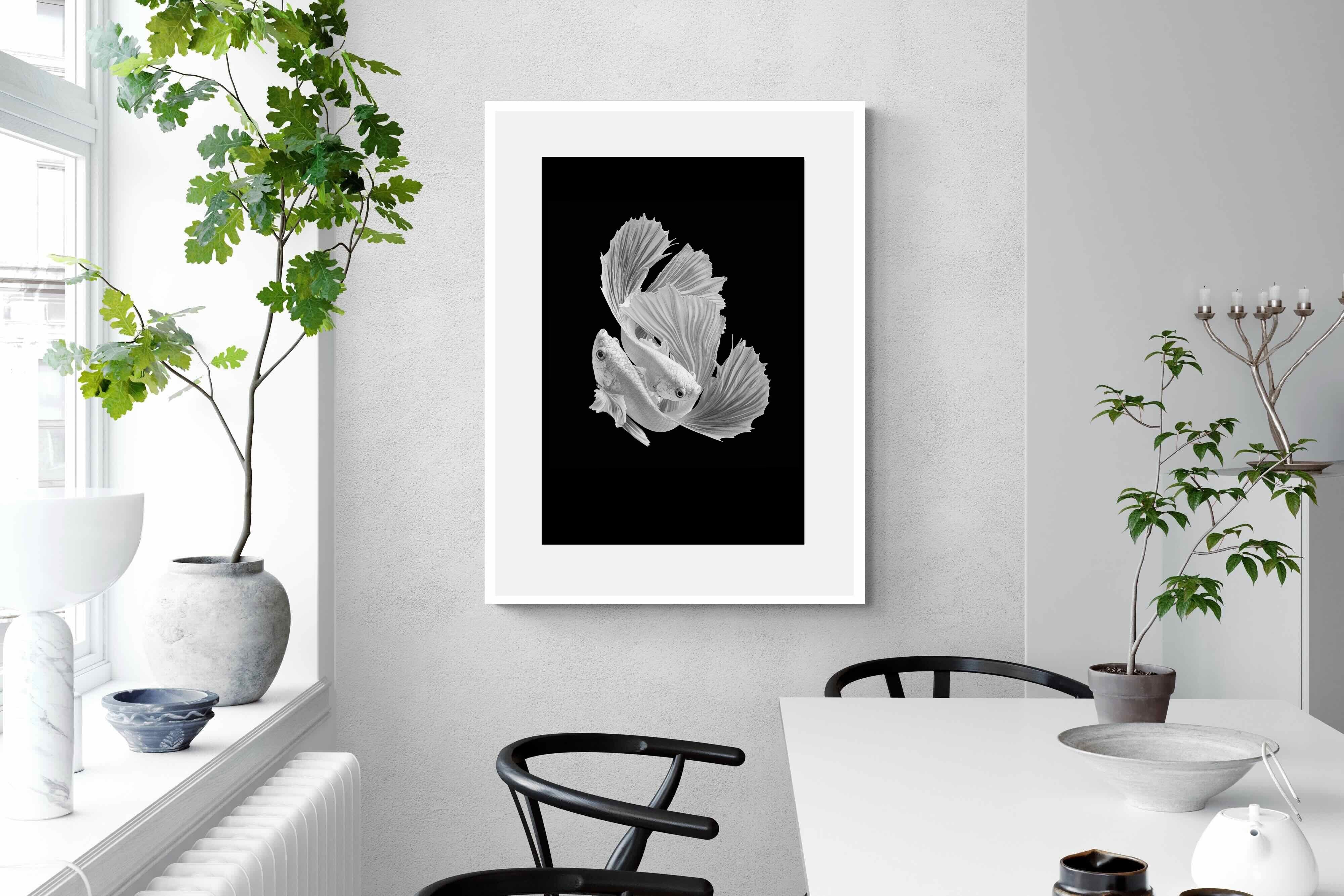 "Monochrome Grace" captures the delicate beauty of a Betta fish, its fins and tail undulating like ethereal fabric. The absence of colour emphasises the textures and movement, bringing a sense of tranquility and the beauty of simplicity to any space. This piece would complement a minimalist decor, drawing the eye with its intricate details and the stark contrast between the fish and the deep black background. It's an ode to nature's artistry in its purest form.