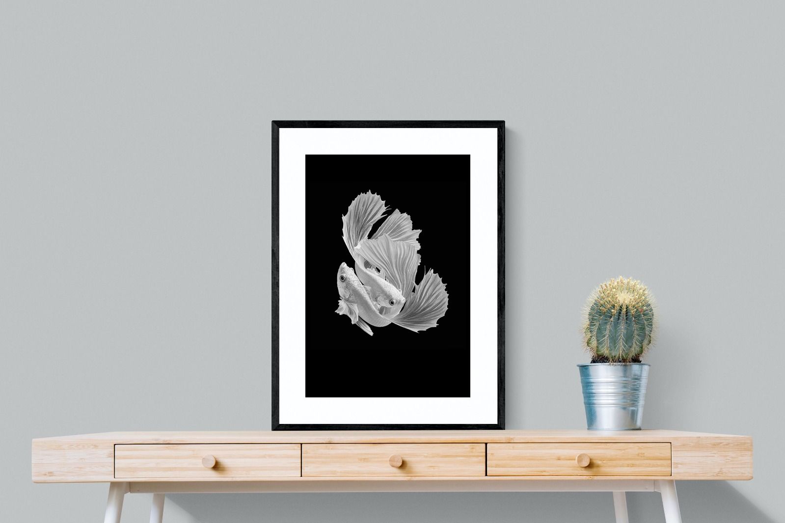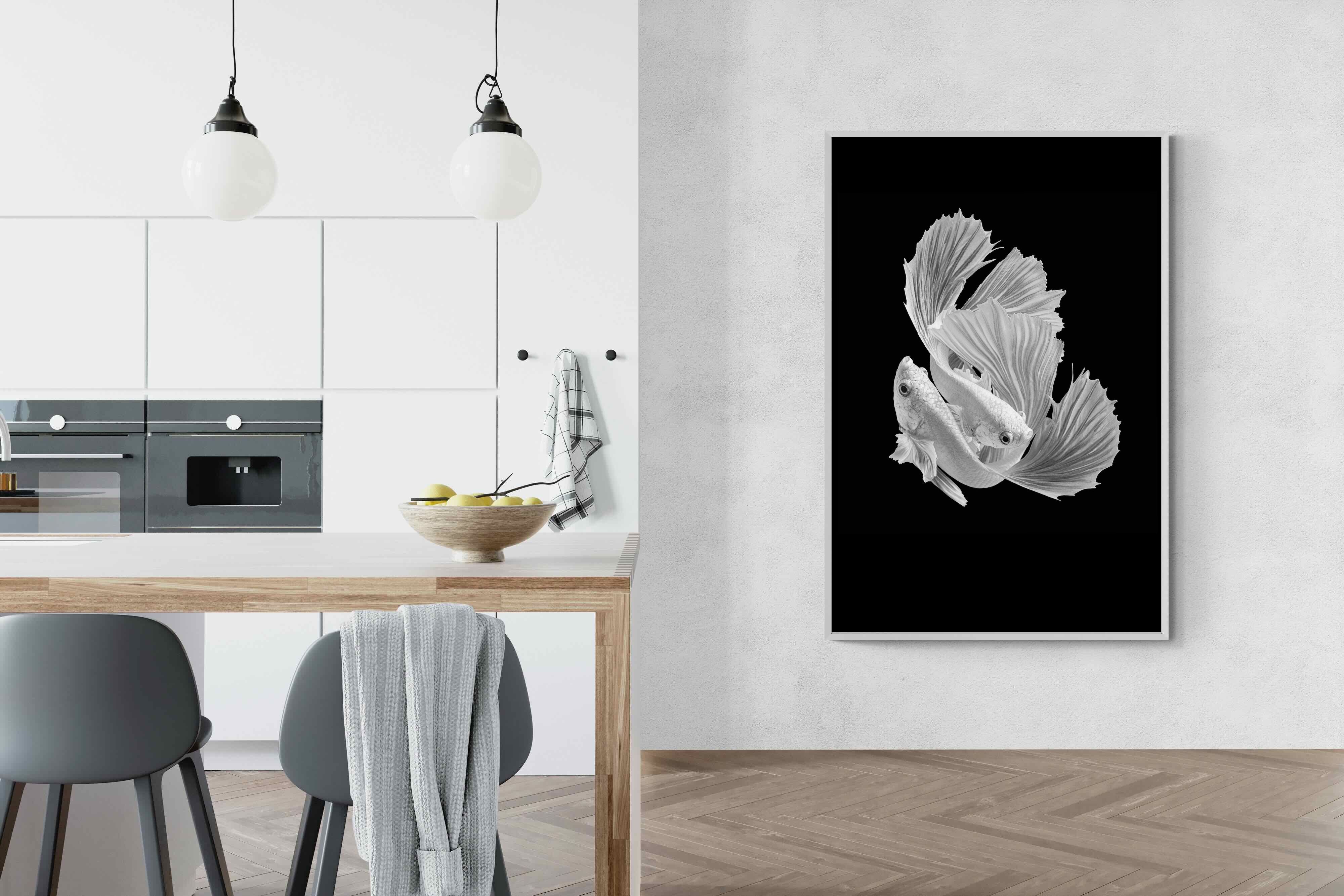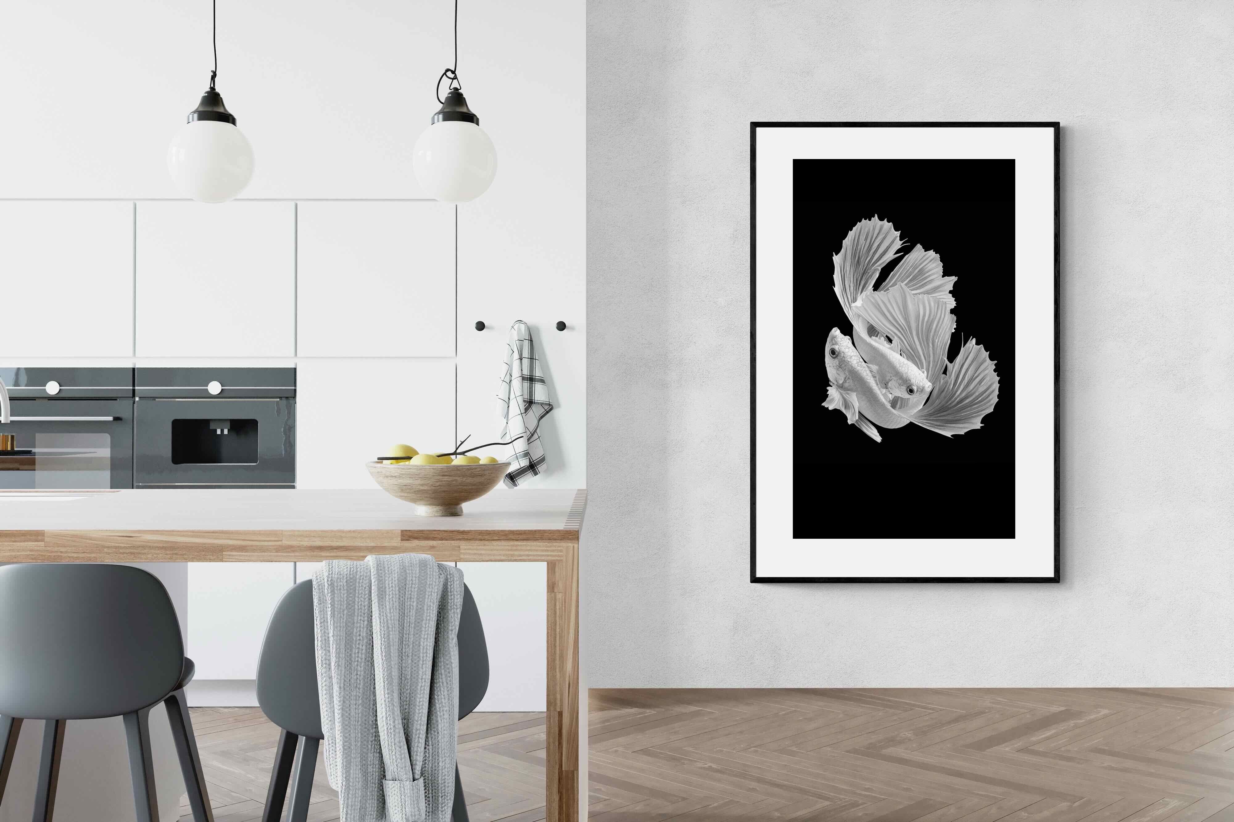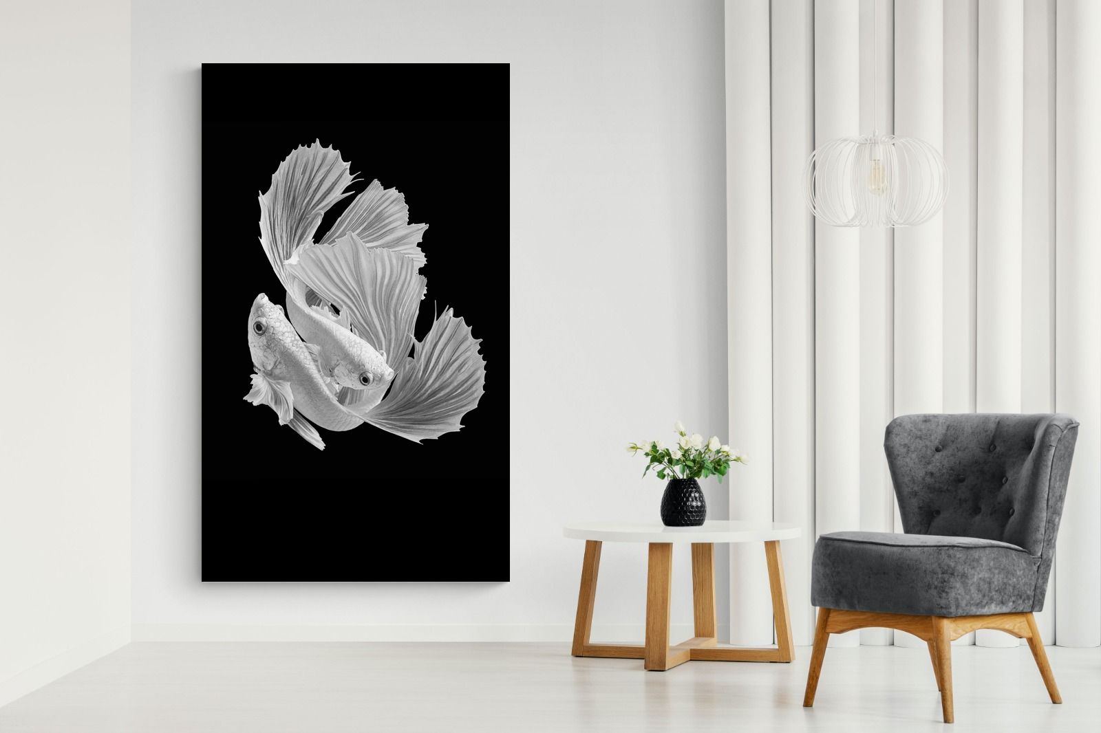 "Monochrome Grace" captures the delicate beauty of a Betta fish, its fins and tail undulating like ethereal fabric. The absence of colour emphasises the textures and movement, bringing a sense of tranquility and the beauty of simplicity to any space. This piece would complement a minimalist decor, drawing the eye with its intricate details and the stark contrast between the fish and the deep black background. It's an ode to nature's artistry in its purest form.