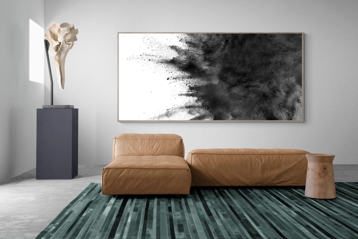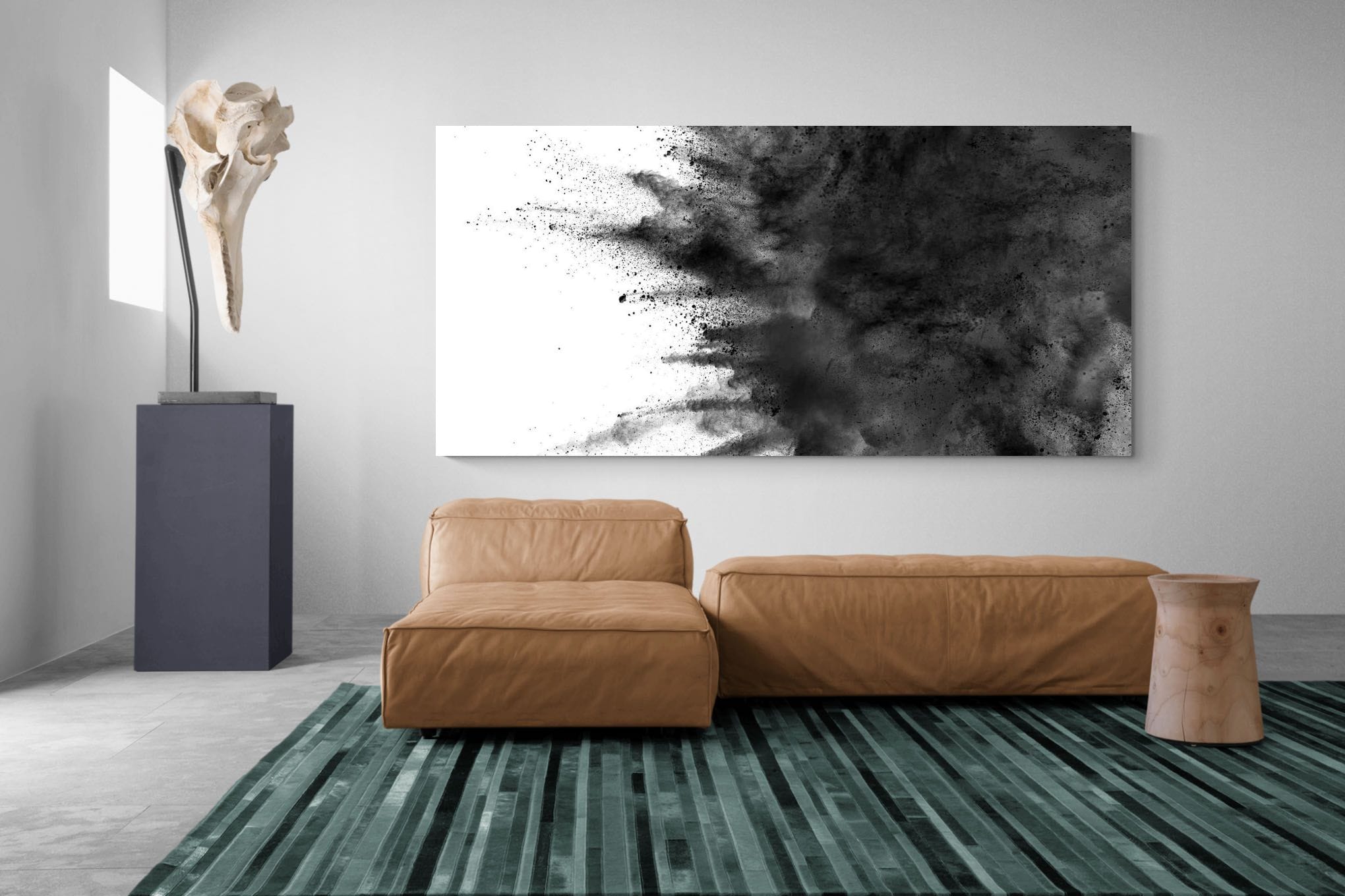 A powerful burst of dark powder erupts across a clean white background, frozen at the exact moment of impact. Fine particles scatter outward in dramatic streaks, creating a striking sense of energy and motion. The high contrast composition gives the artwork a bold, graphic presence. This modern abstract photograph works brilliantly in contemporary interiors, adding intensity and visual drama to living spaces or creative environments.