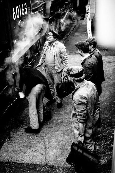 A candid black and white moment captures railway workers gathered beside a steam locomotive, surrounded by billowing vapour and industrial detail. The composition balances human presence with mechanical power, creating a sense of history and atmosphere. Ideal for studies, offices, or characterful interiors, it adds depth without colour. Its strong contrasts and documentary style make it a compelling choice for spaces that appreciate heritage, craftsmanship, and timeless photographic storytelling.