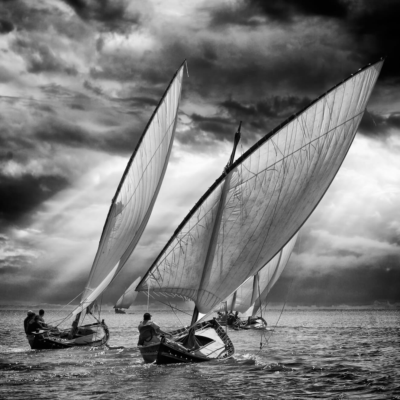 Black and White Dhow Sailboats Under Stormy Skies – Dramatic Nautical Wall Art