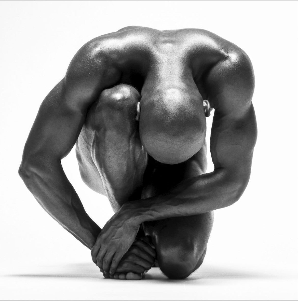 Introducing "Sculpted," a compelling photograph that elevates the male form to the level of art. The image captures a man crouching down, his head bowed, all set against a pure white background.