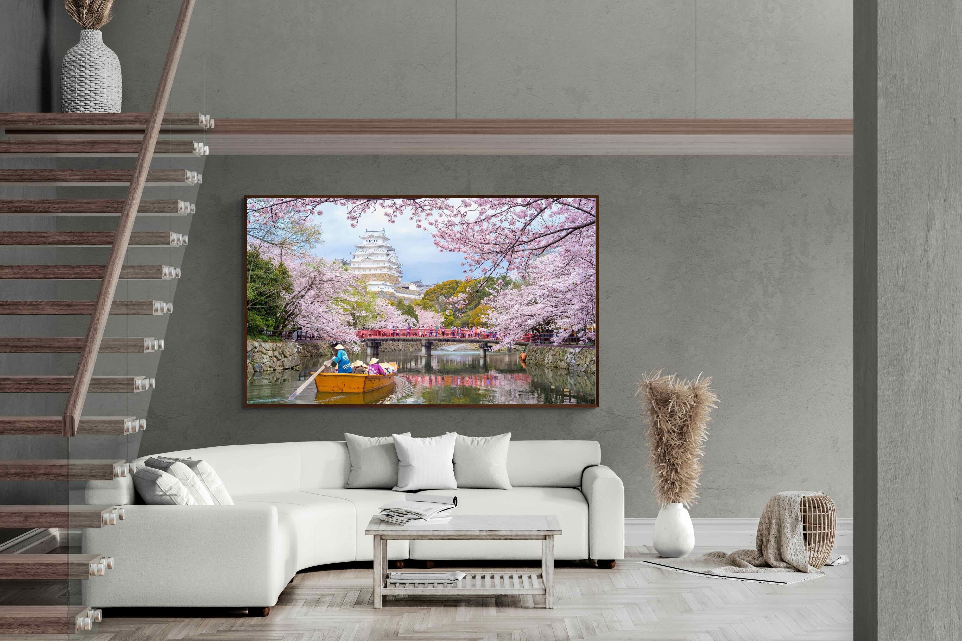 Himeji Castle rises elegantly beyond a river framed by delicate cherry blossoms in full bloom. A vibrant red bridge and gentle reflections add balance and movement to the scene, while soft pink tones contrast with traditional architecture. The composition captures the fleeting beauty of spring in Japan. Ideal for refined interiors, this piece brings colour, cultural richness and a sense of seasonal tranquillity to any space.