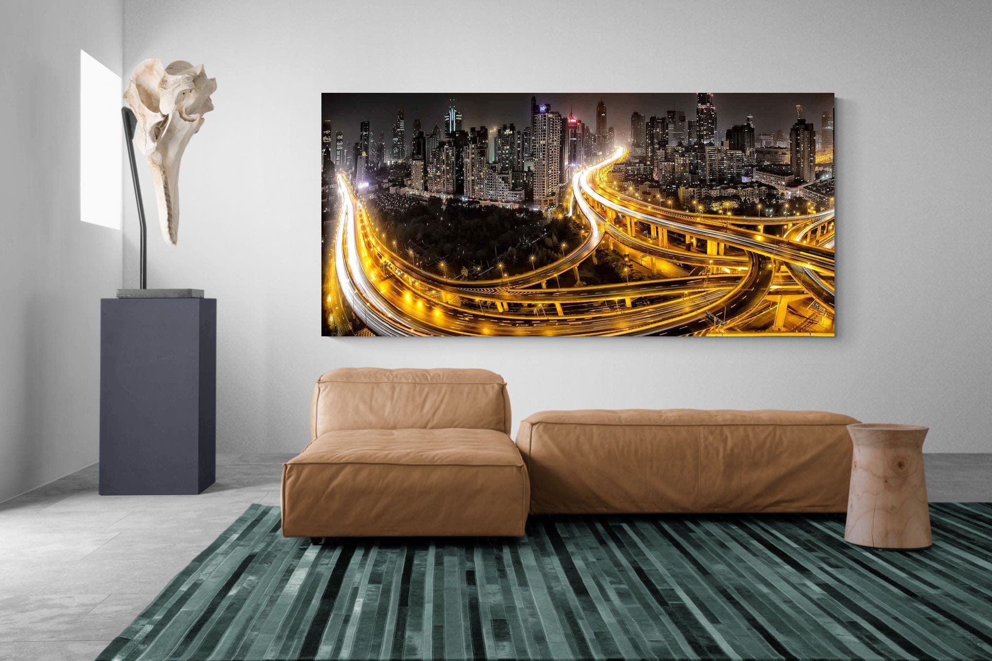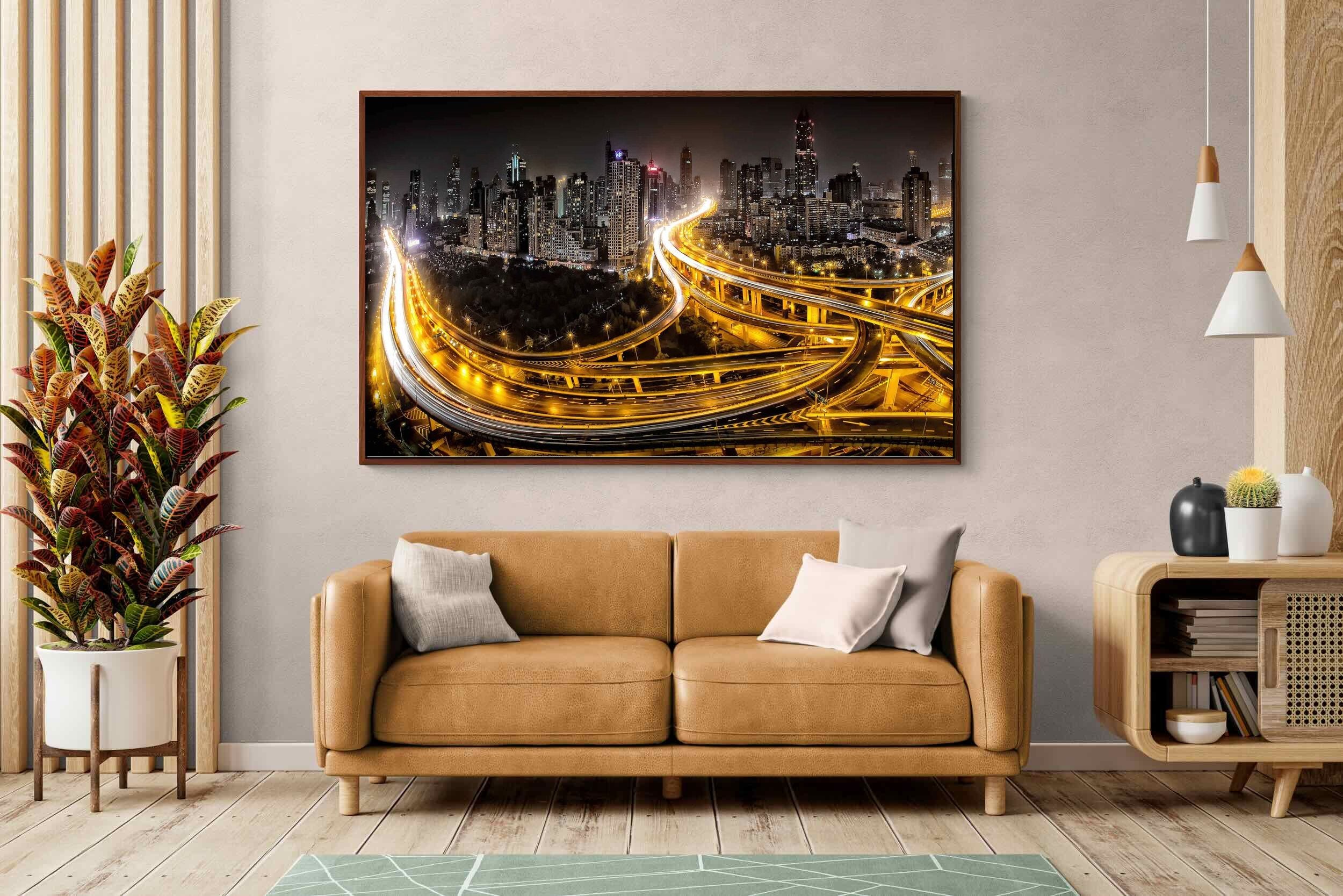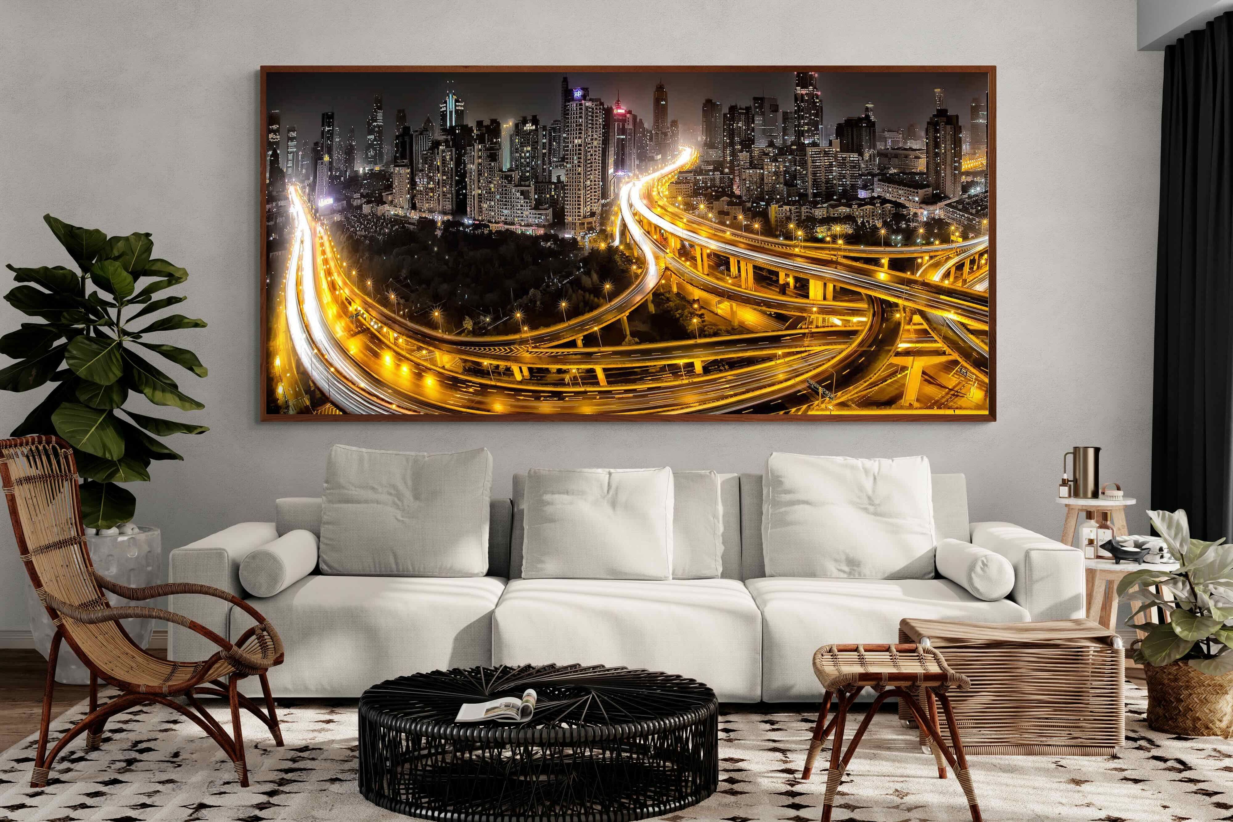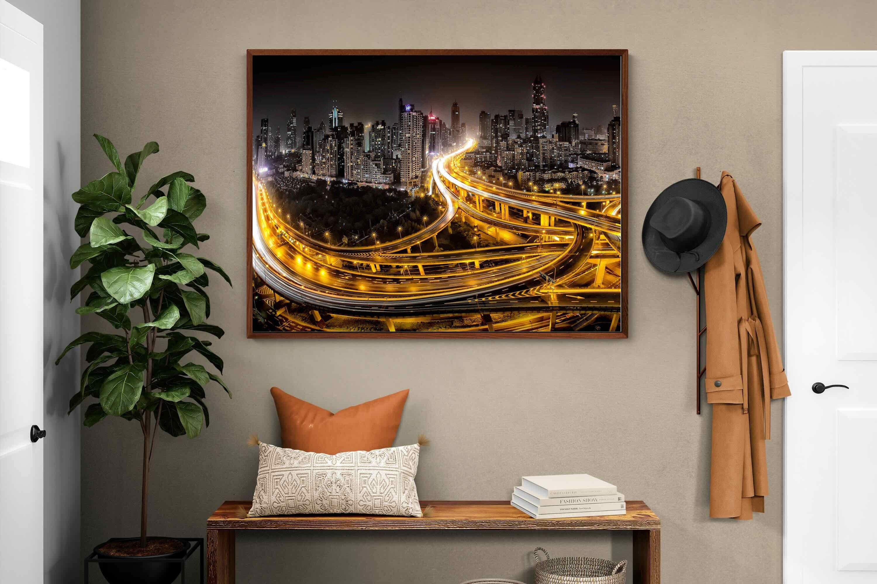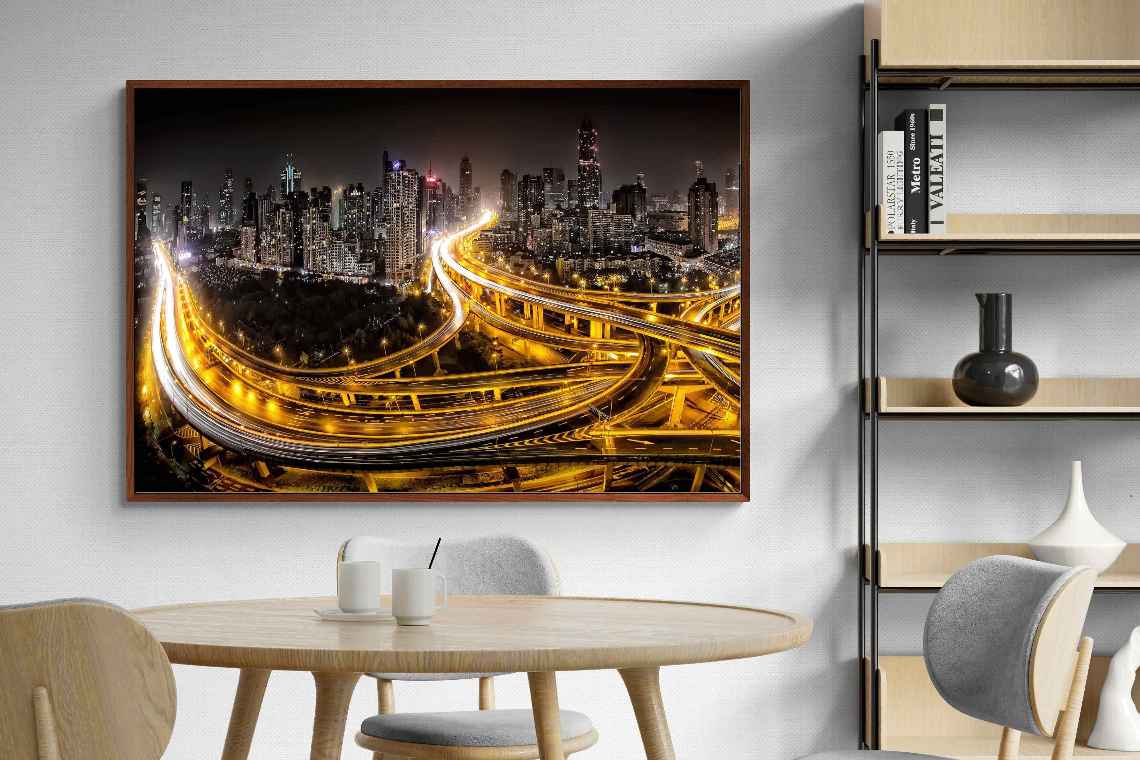 A dynamic night-time cityscape captures sweeping highways illuminated with golden light trails, weaving through a dense skyline of modern towers. The long exposure creates a sense of motion and energy, contrasting with the structured architecture. Ideal for contemporary interiors, this piece adds sophistication and urban intensity, perfect for spaces that embrace modern design and bold visual impact.