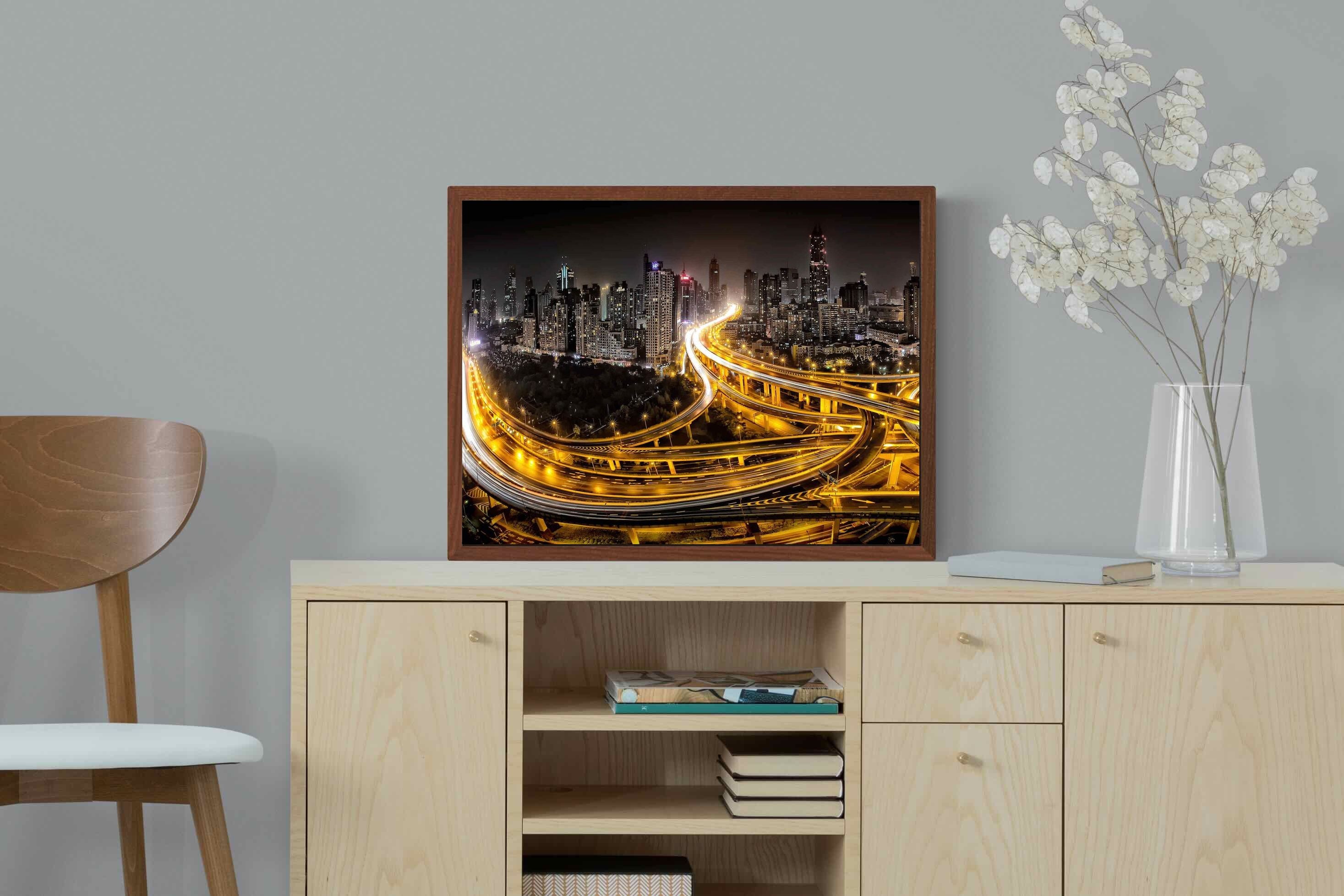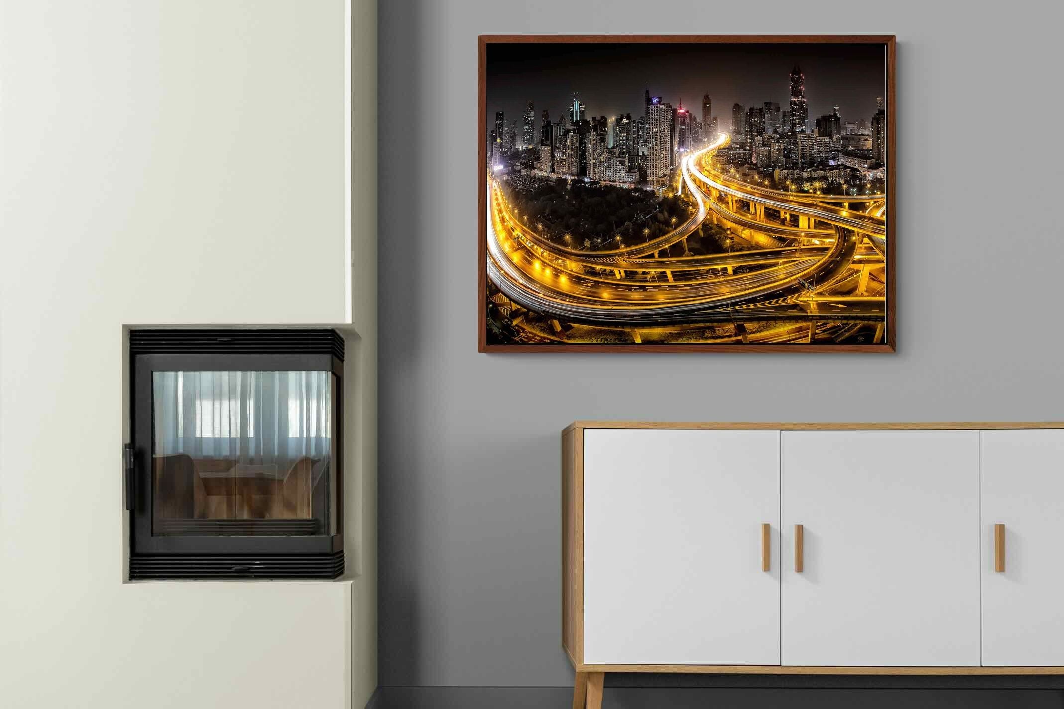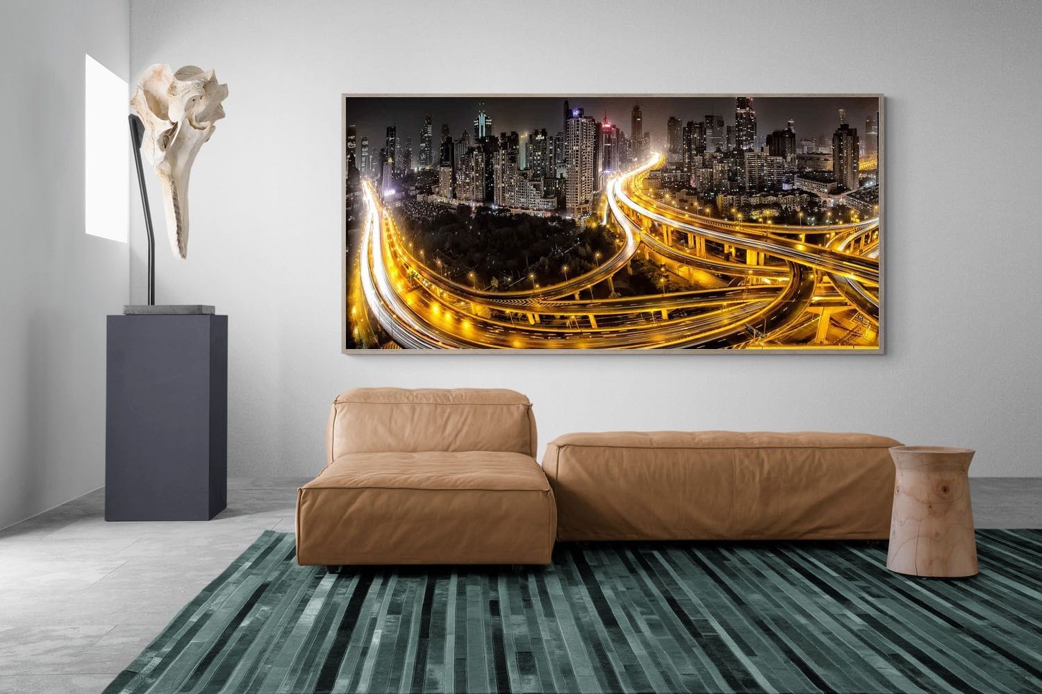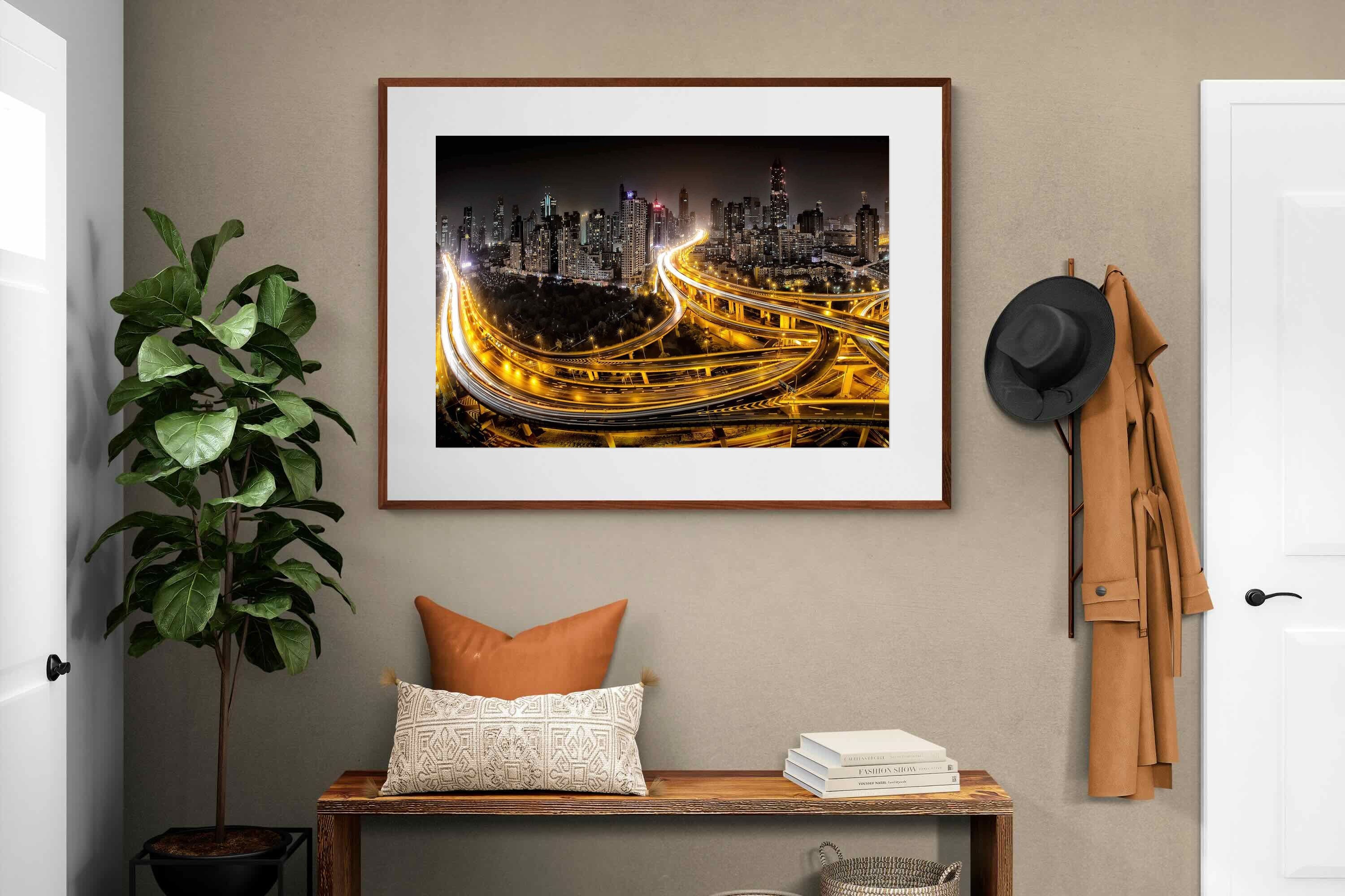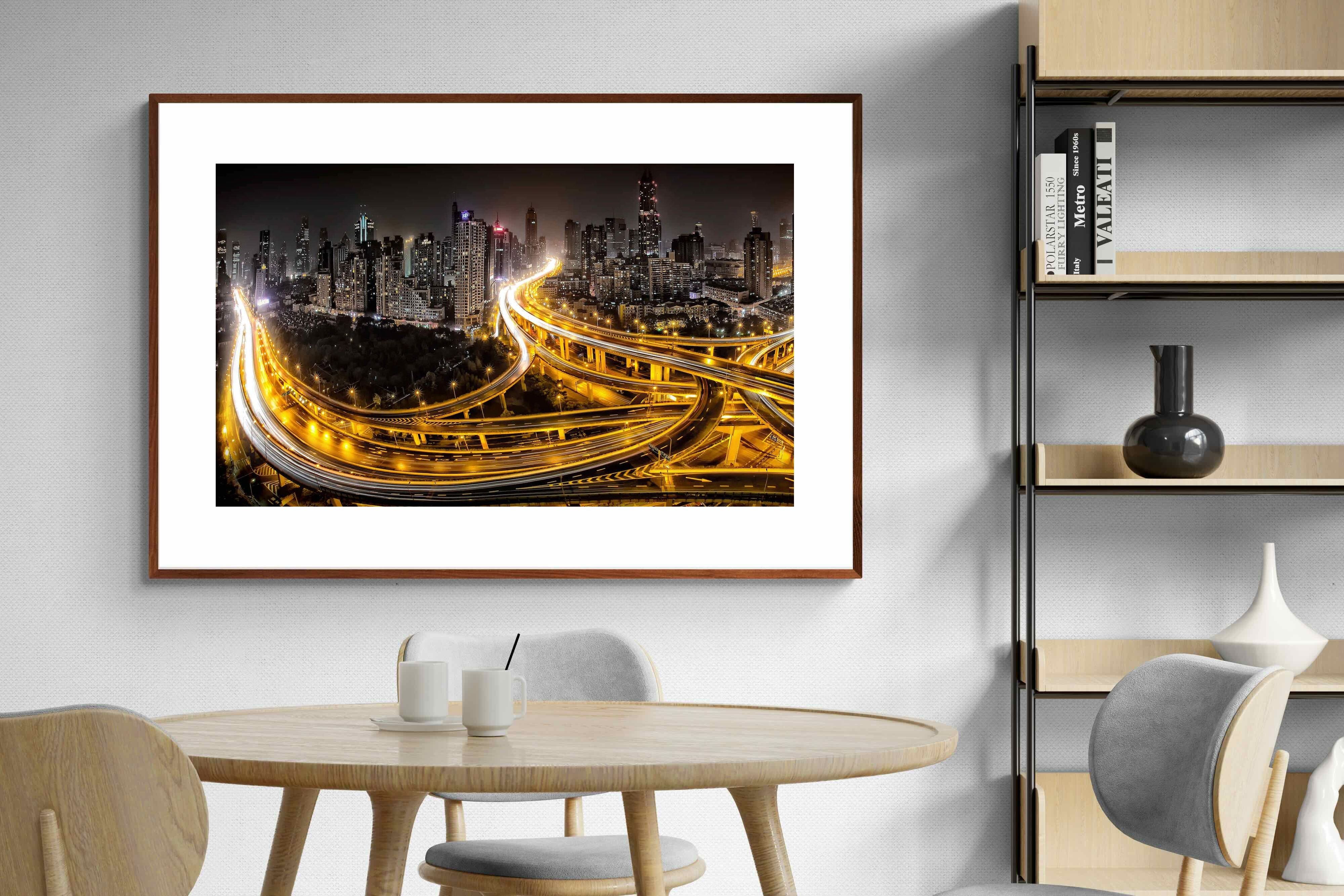 A dynamic night-time cityscape captures sweeping highways illuminated with golden light trails, weaving through a dense skyline of modern towers. The long exposure creates a sense of motion and energy, contrasting with the structured architecture. Ideal for contemporary interiors, this piece adds sophistication and urban intensity, perfect for spaces that embrace modern design and bold visual impact.