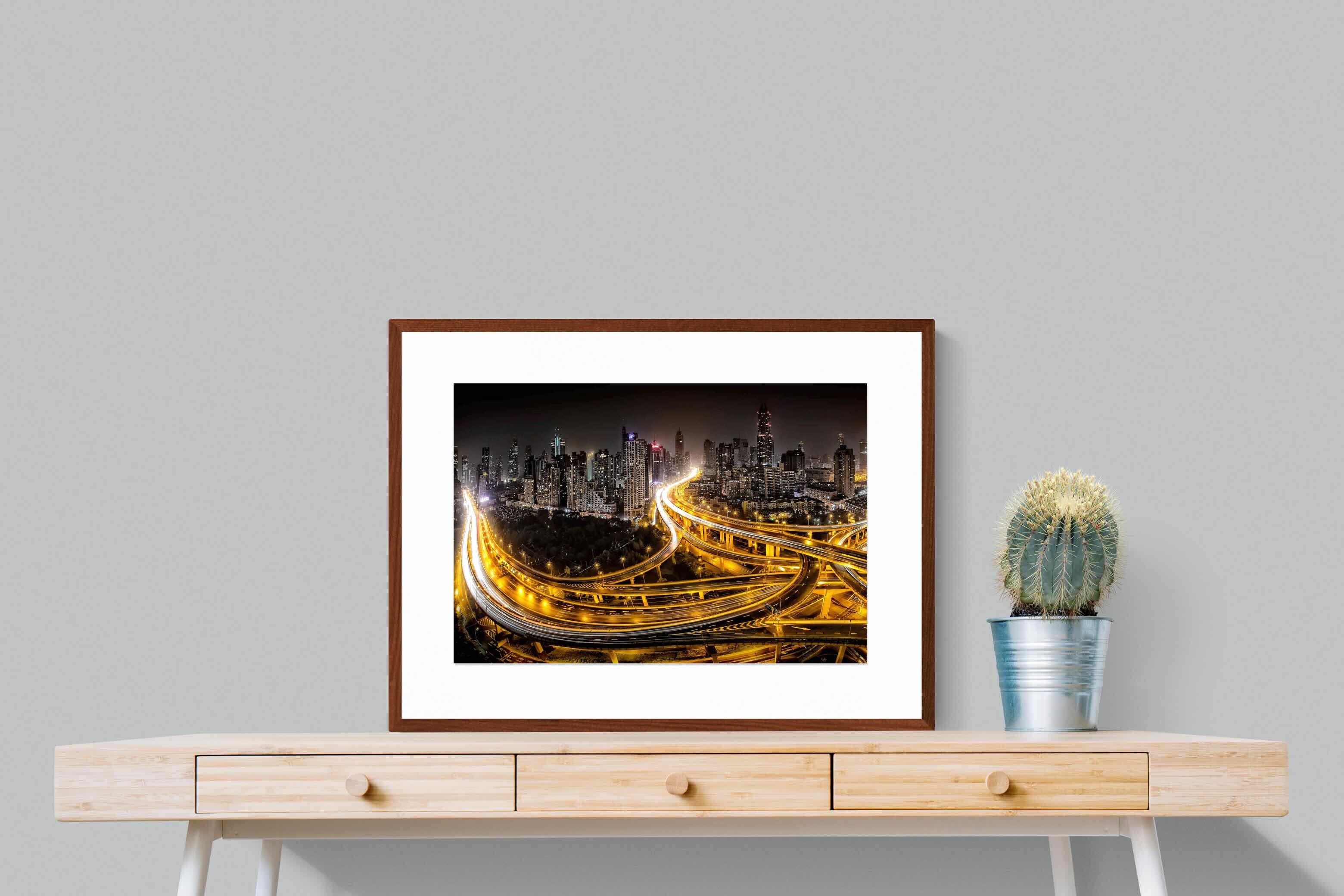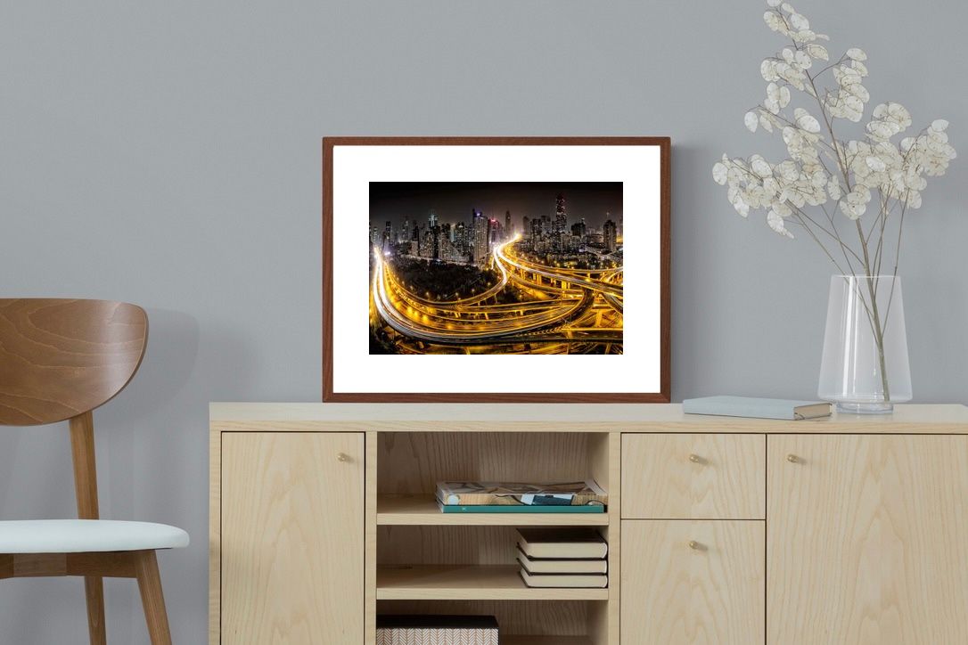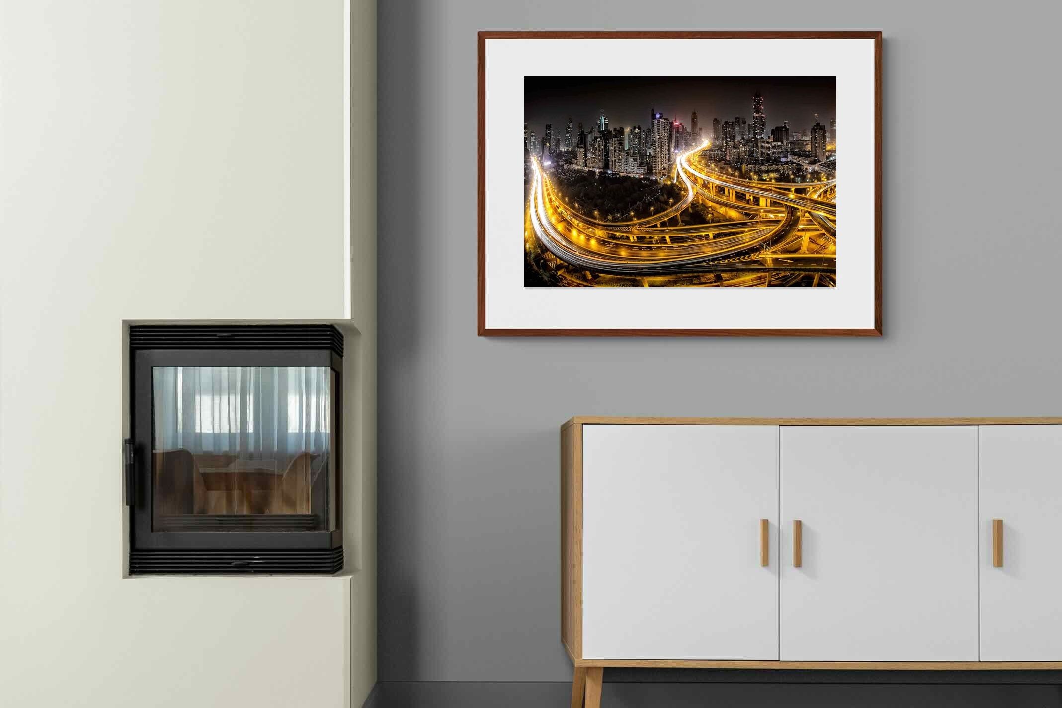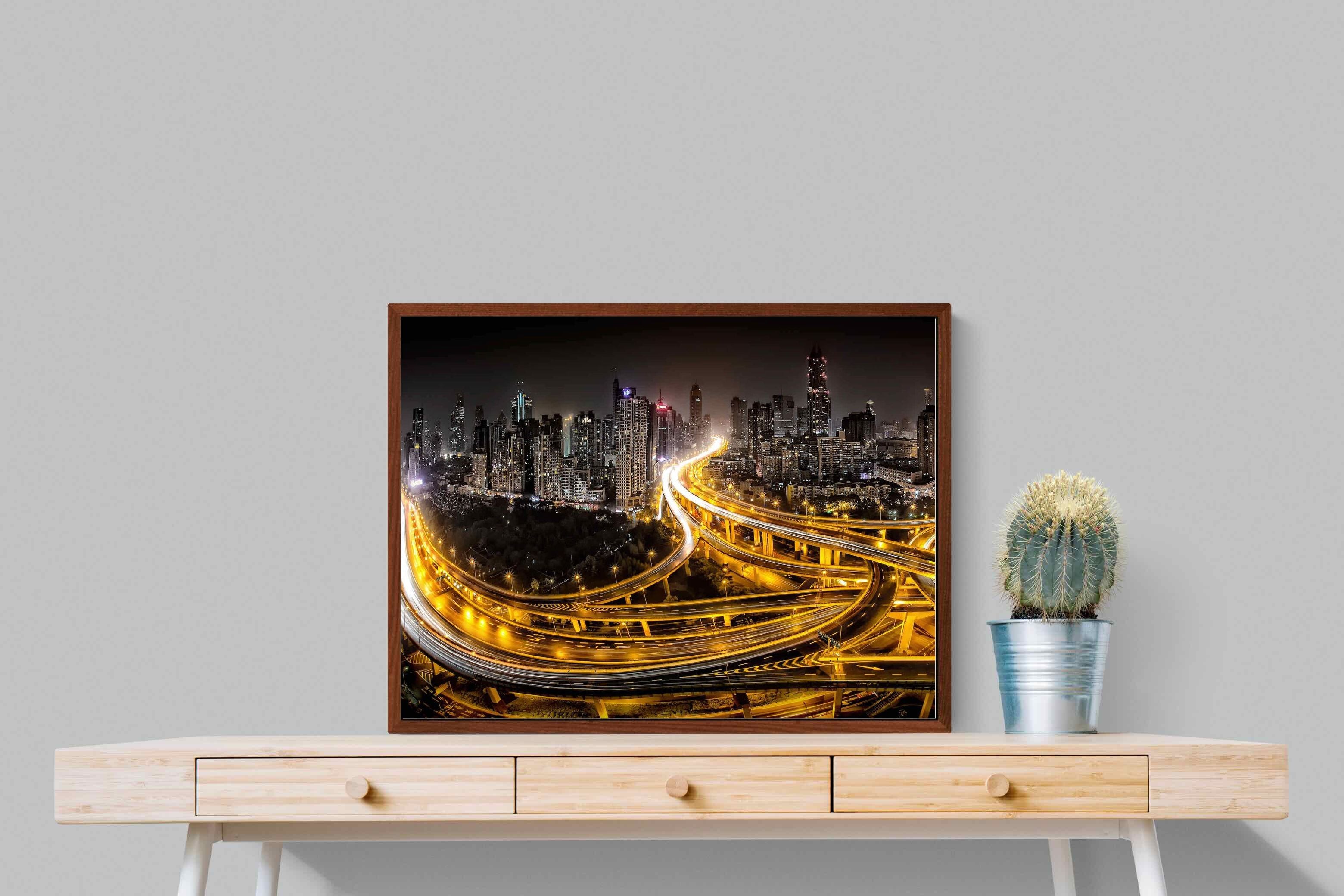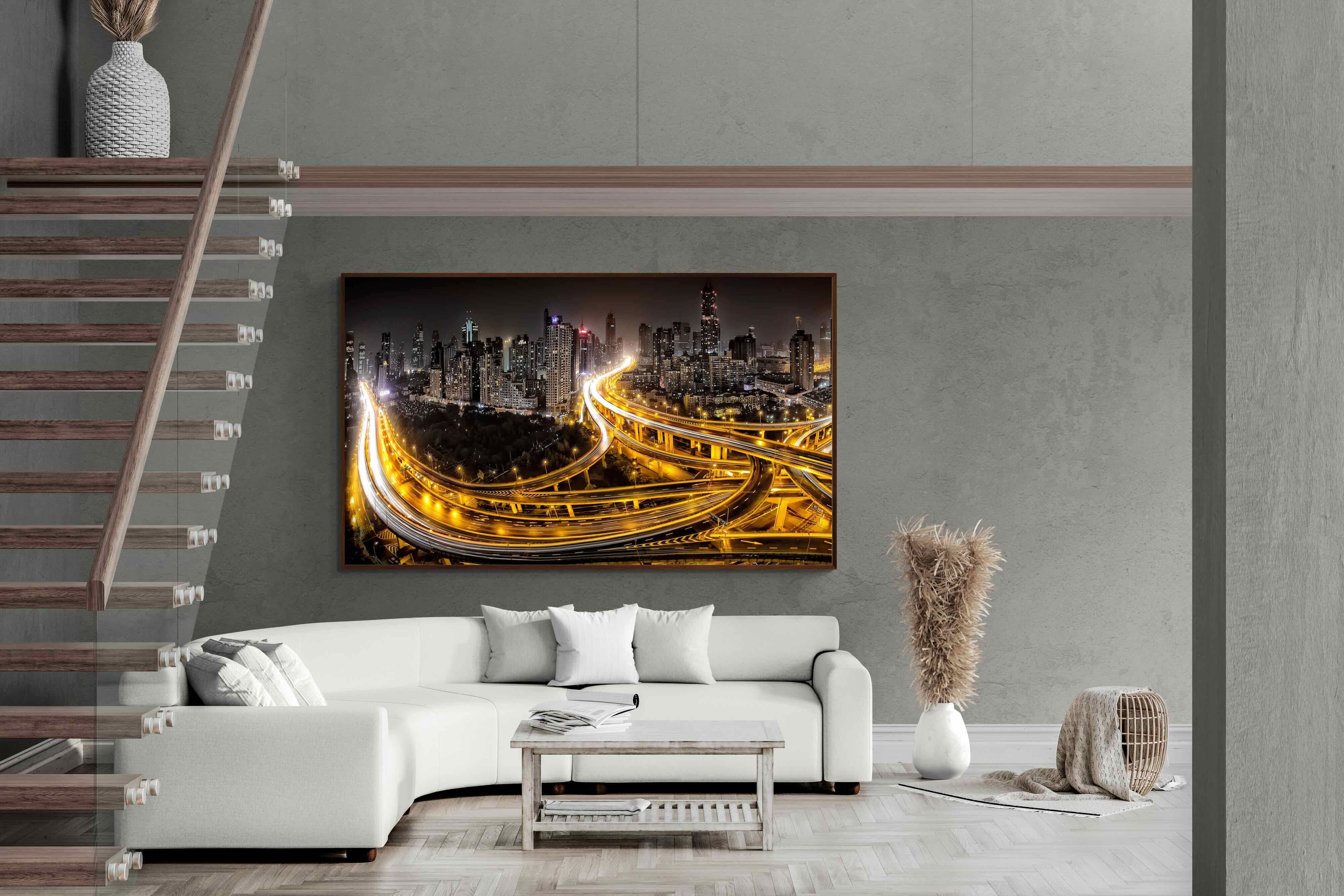 A dynamic night-time cityscape captures sweeping highways illuminated with golden light trails, weaving through a dense skyline of modern towers. The long exposure creates a sense of motion and energy, contrasting with the structured architecture. Ideal for contemporary interiors, this piece adds sophistication and urban intensity, perfect for spaces that embrace modern design and bold visual impact.
