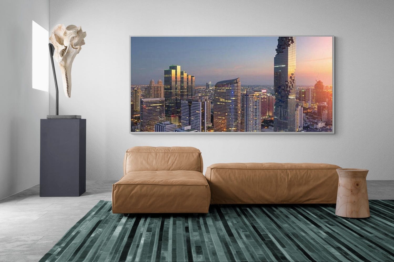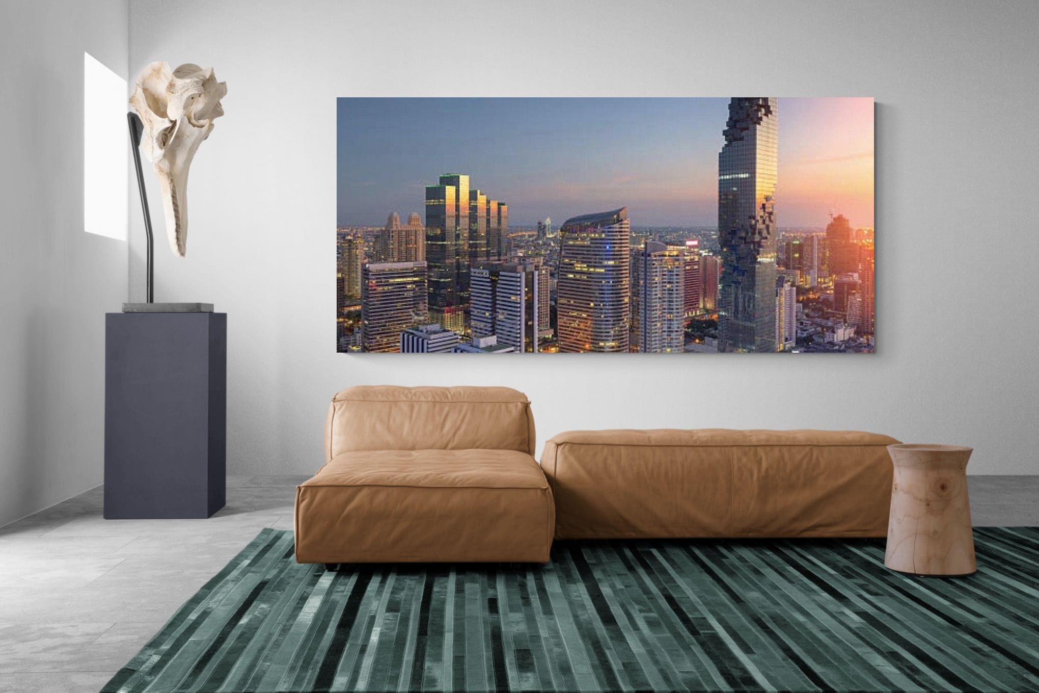 A dynamic cityscape capturing Bangkok’s skyline as warm sunset light reflects across glass towers and modern architecture. The composition balances height, density, and atmosphere, creating a sense of movement and urban energy. Ideal for contemporary interiors or office spaces, this artwork brings sophistication and global perspective, offering a polished visual statement that celebrates modern city living and architectural ambition.