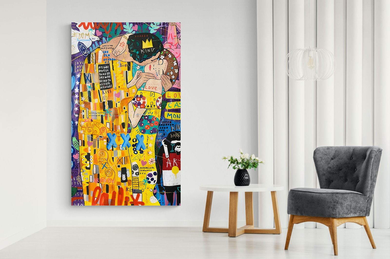 Delve into the magnetic allure of "Graffiti Kiss" – a contemporary masterpiece that seamlessly combines the revolutionary ethos of modern graffiti art with the sensuous romanticism of Gustav Klimt's iconic "The Kiss". This brilliant artwork captures the spirit of modern love through an audacious mesh of graffiti art and classical fin-de-siècle painting, evoking powerful emotions of passion, defiance, and intrigue.