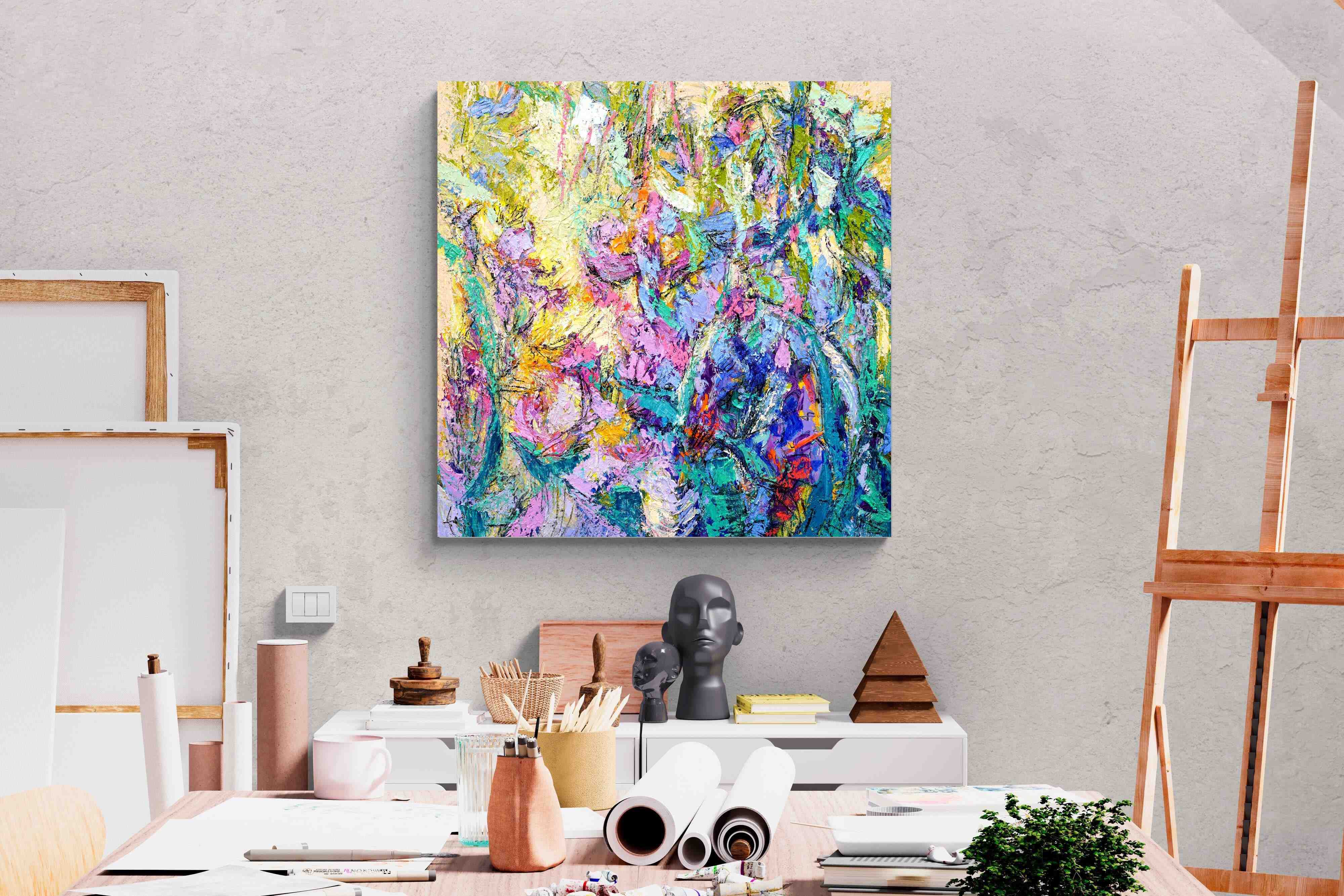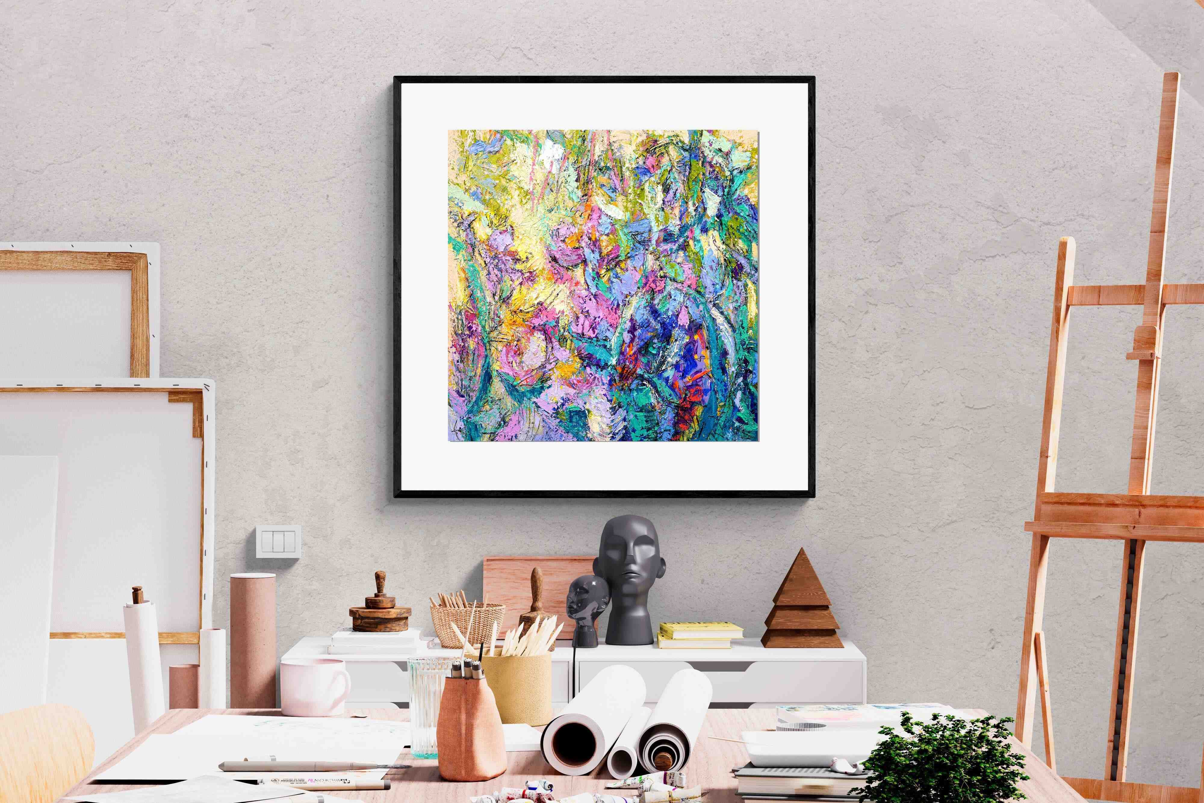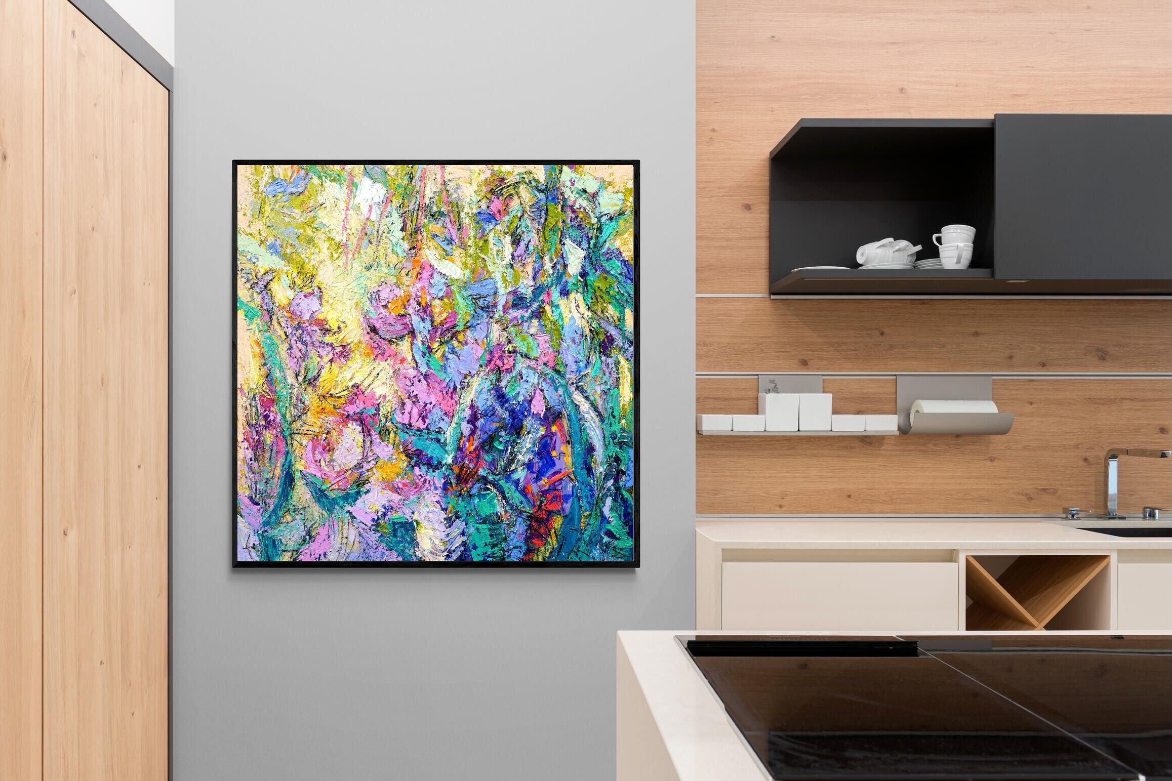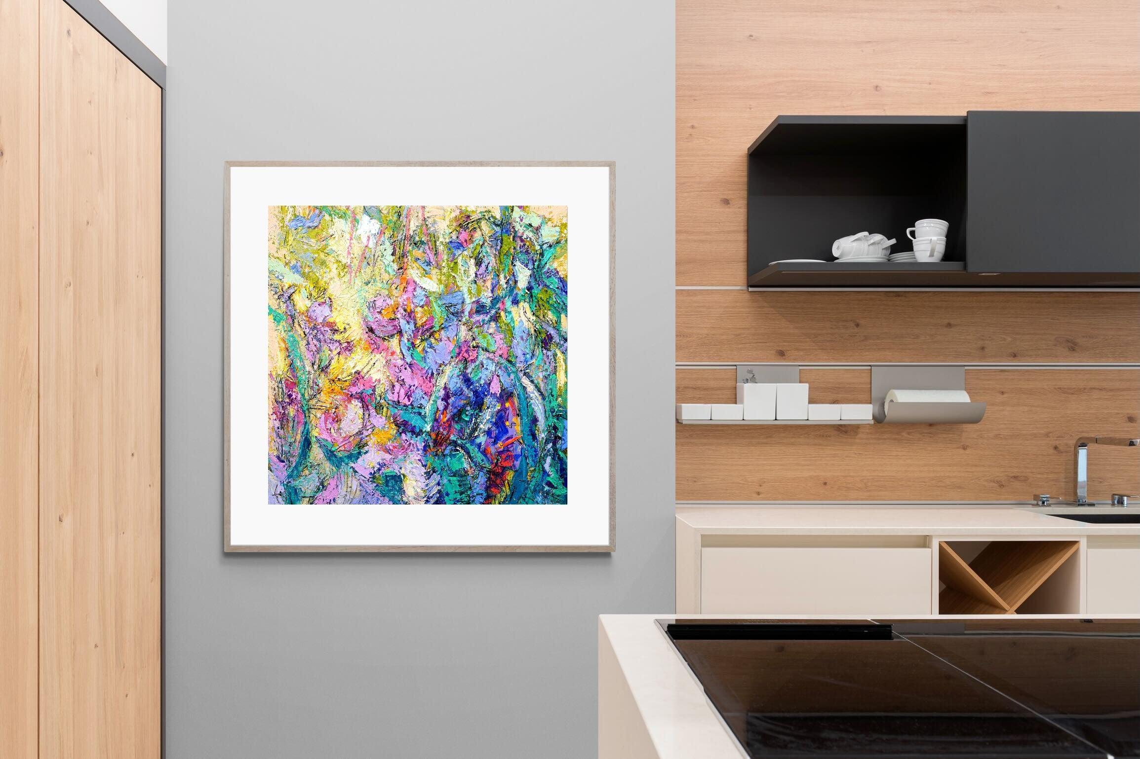 Rich in texture and colour, this expressive abstract piece evokes the layered beauty of blooming irises through bold brushwork and vibrant tones. The interplay of lilac, turquoise and soft yellows creates depth and movement. Ideal for contemporary or eclectic interiors, it works beautifully in living rooms or bedrooms, adding energy, artistic flair and a striking focal point.