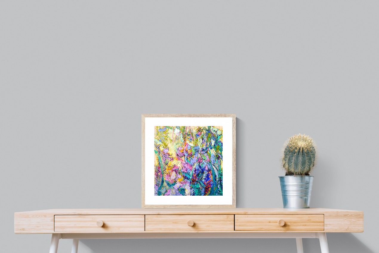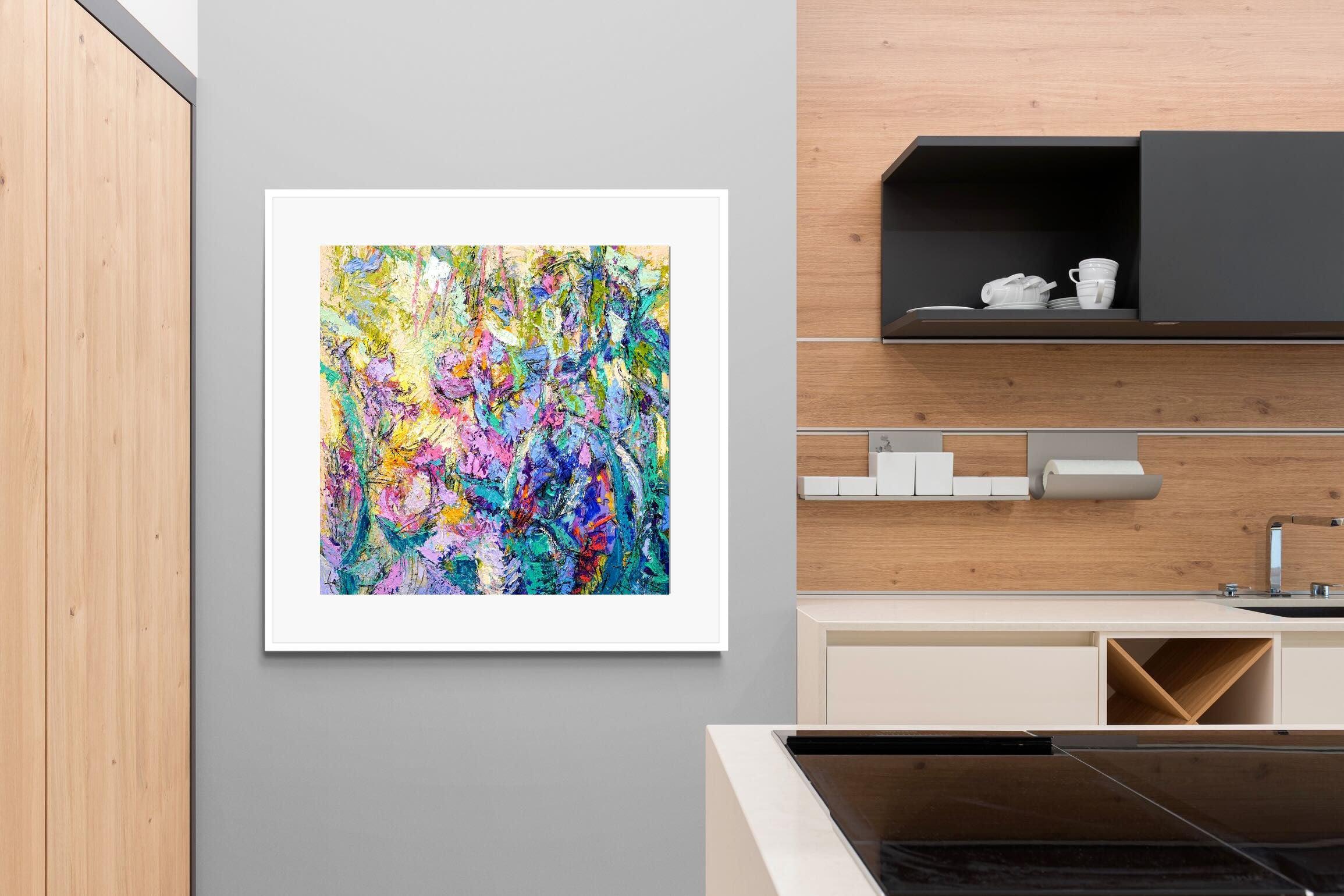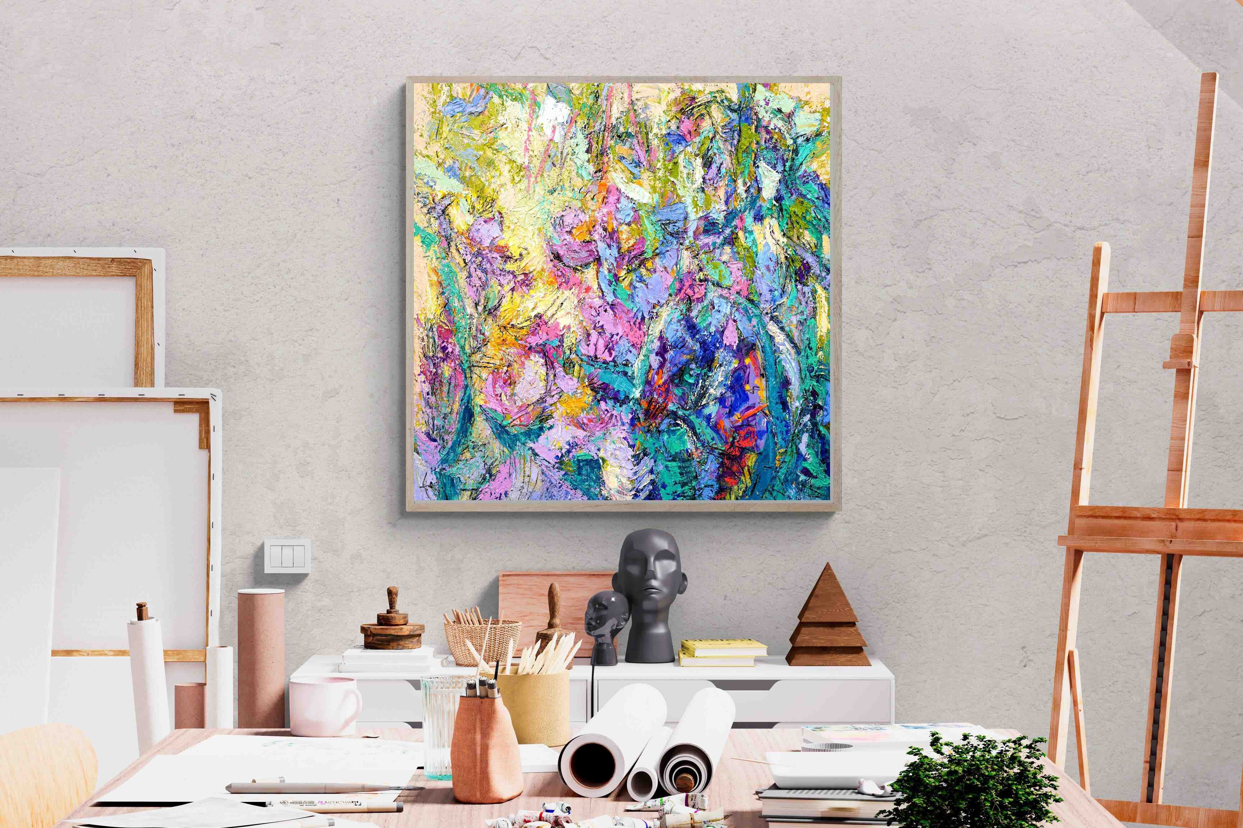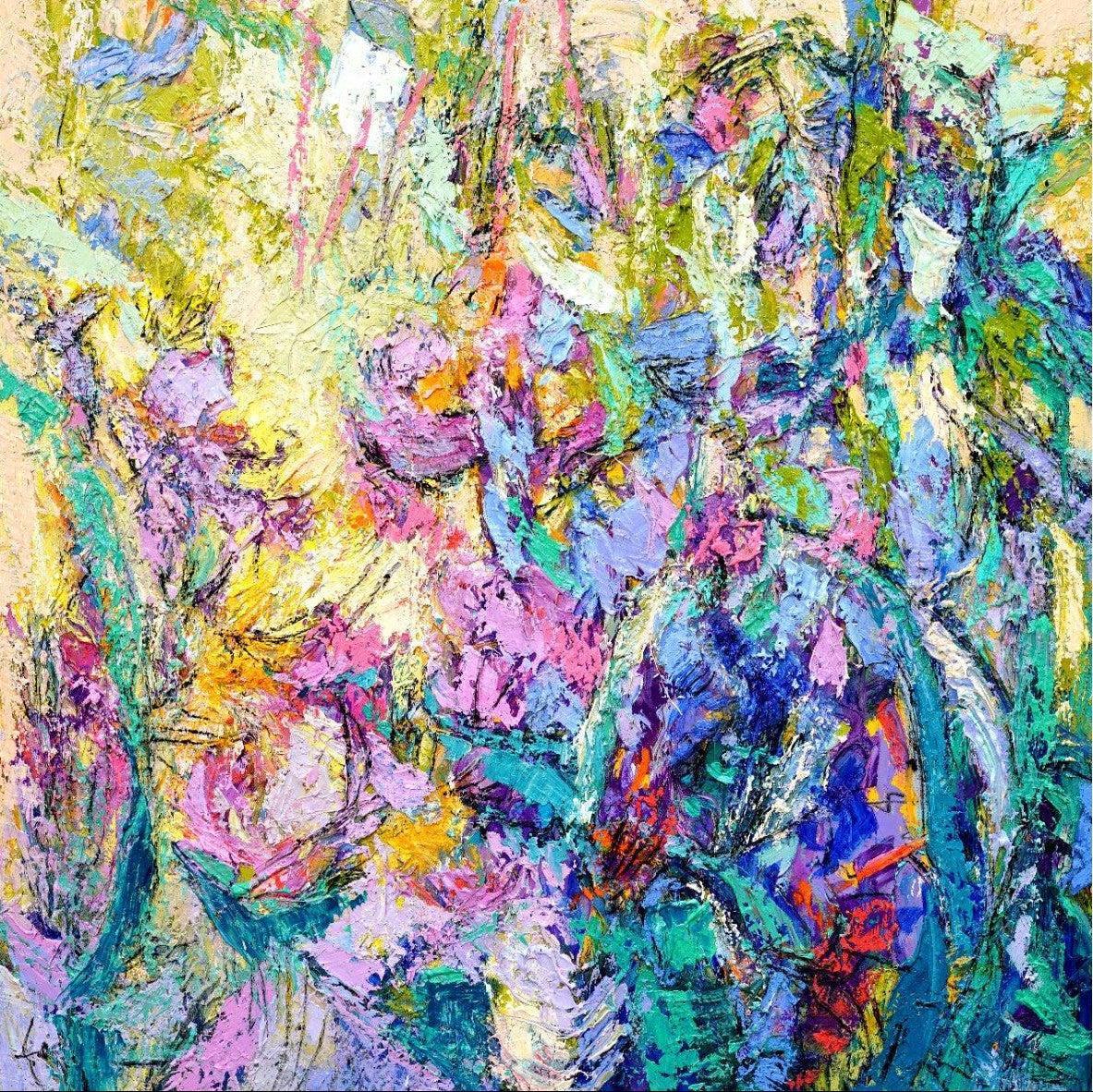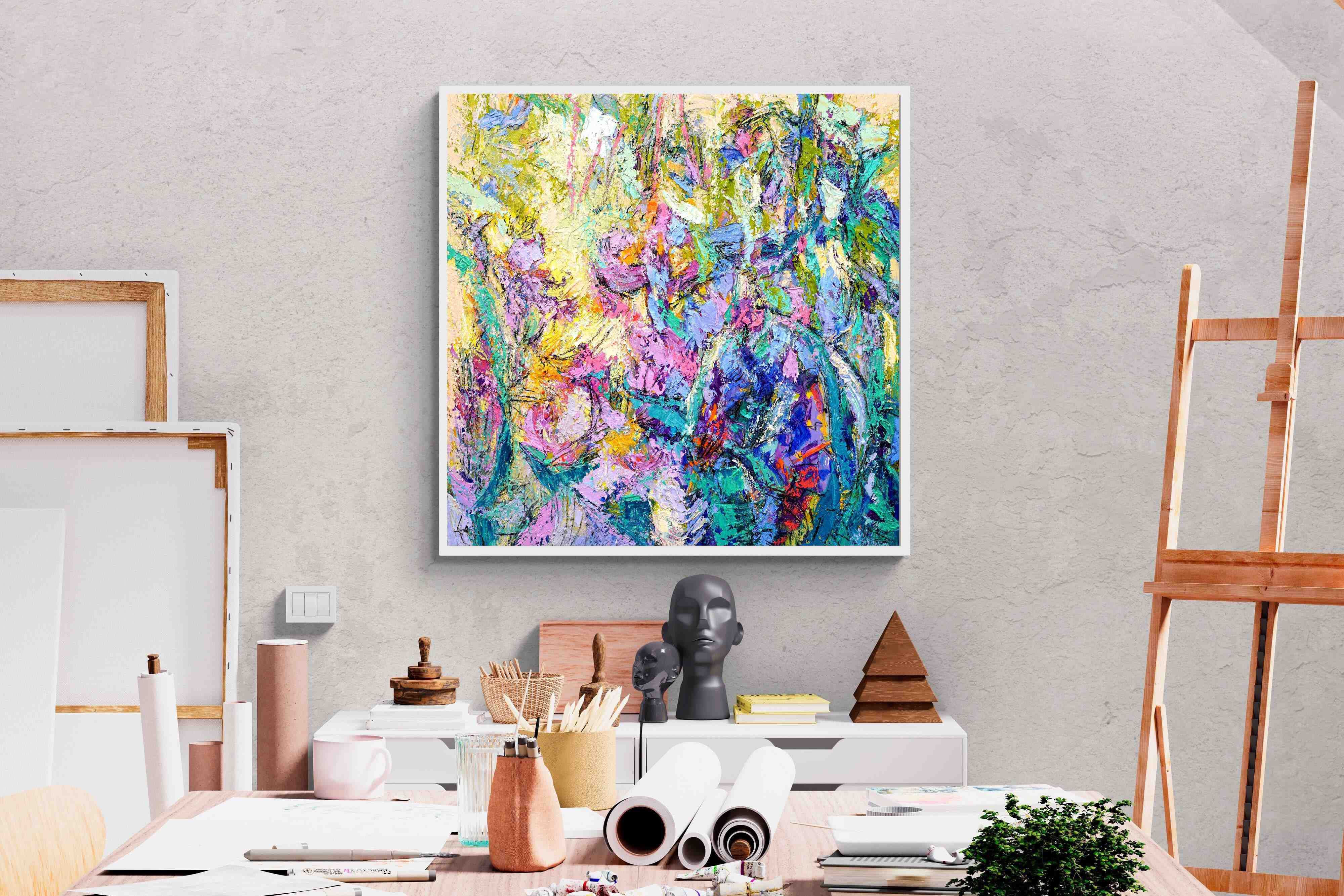 Rich in texture and colour, this expressive abstract piece evokes the layered beauty of blooming irises through bold brushwork and vibrant tones. The interplay of lilac, turquoise and soft yellows creates depth and movement. Ideal for contemporary or eclectic interiors, it works beautifully in living rooms or bedrooms, adding energy, artistic flair and a striking focal point.