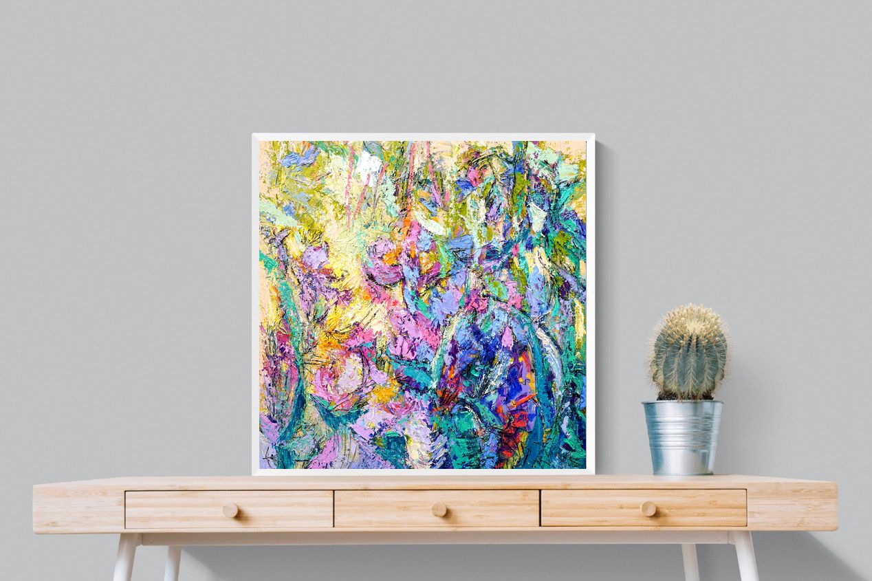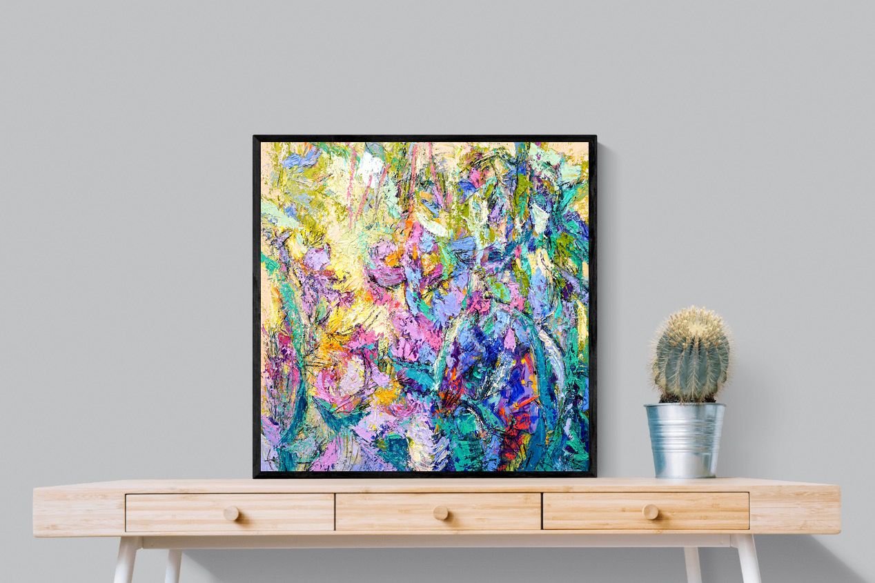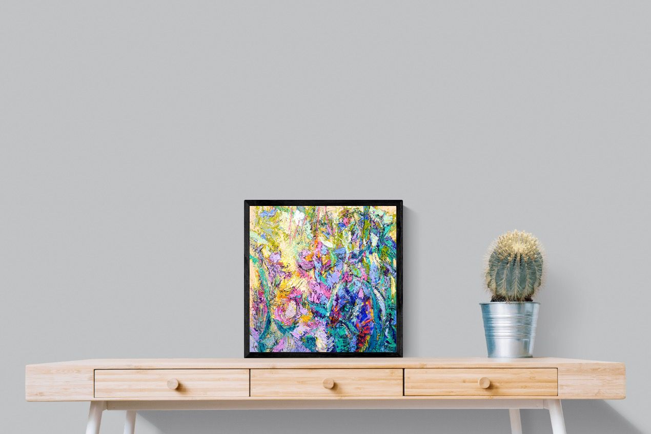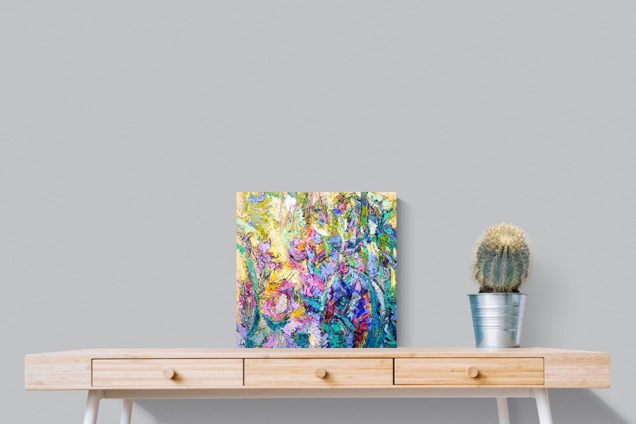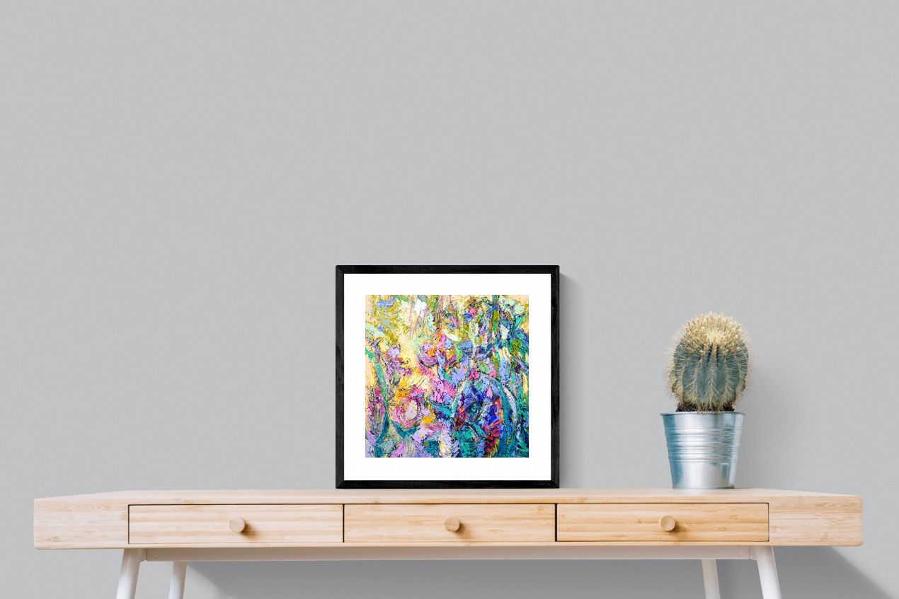 Rich in texture and colour, this expressive abstract piece evokes the layered beauty of blooming irises through bold brushwork and vibrant tones. The interplay of lilac, turquoise and soft yellows creates depth and movement. Ideal for contemporary or eclectic interiors, it works beautifully in living rooms or bedrooms, adding energy, artistic flair and a striking focal point.