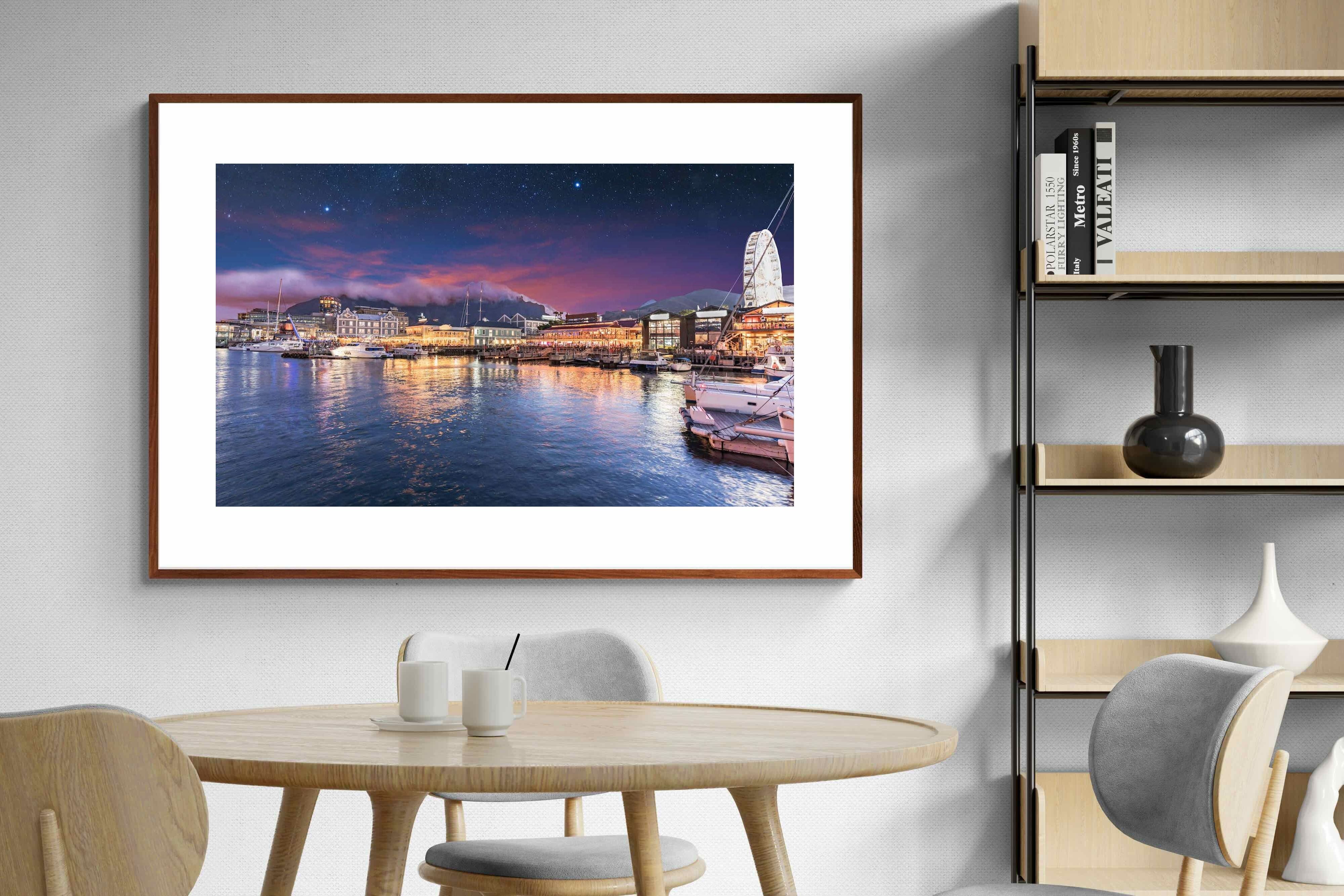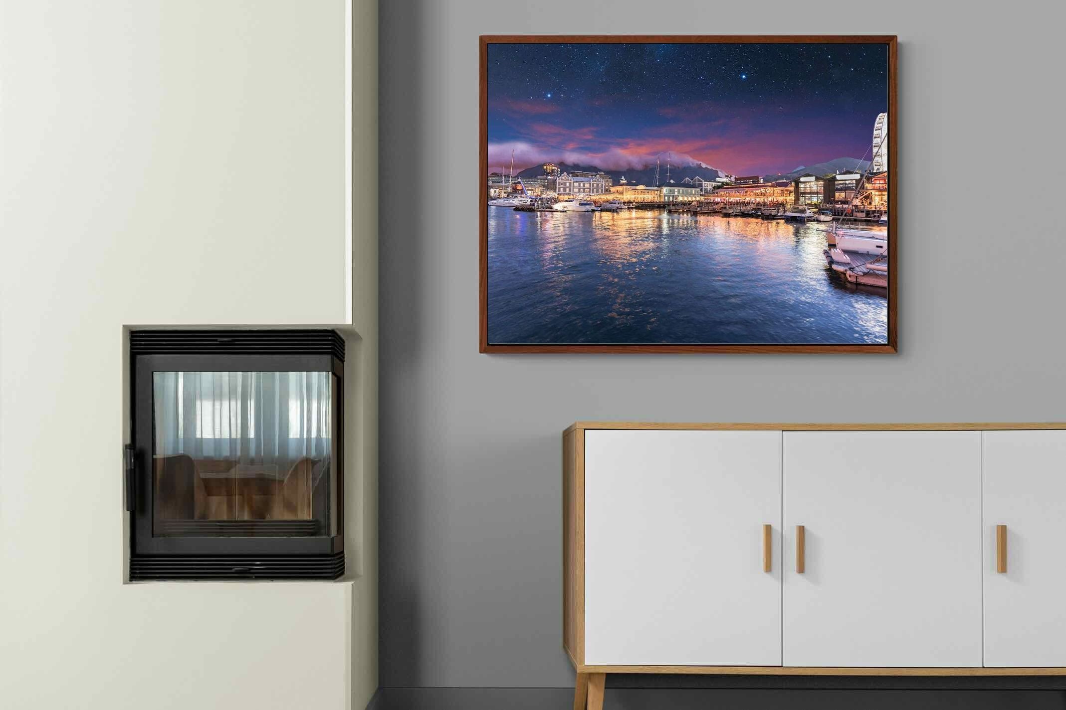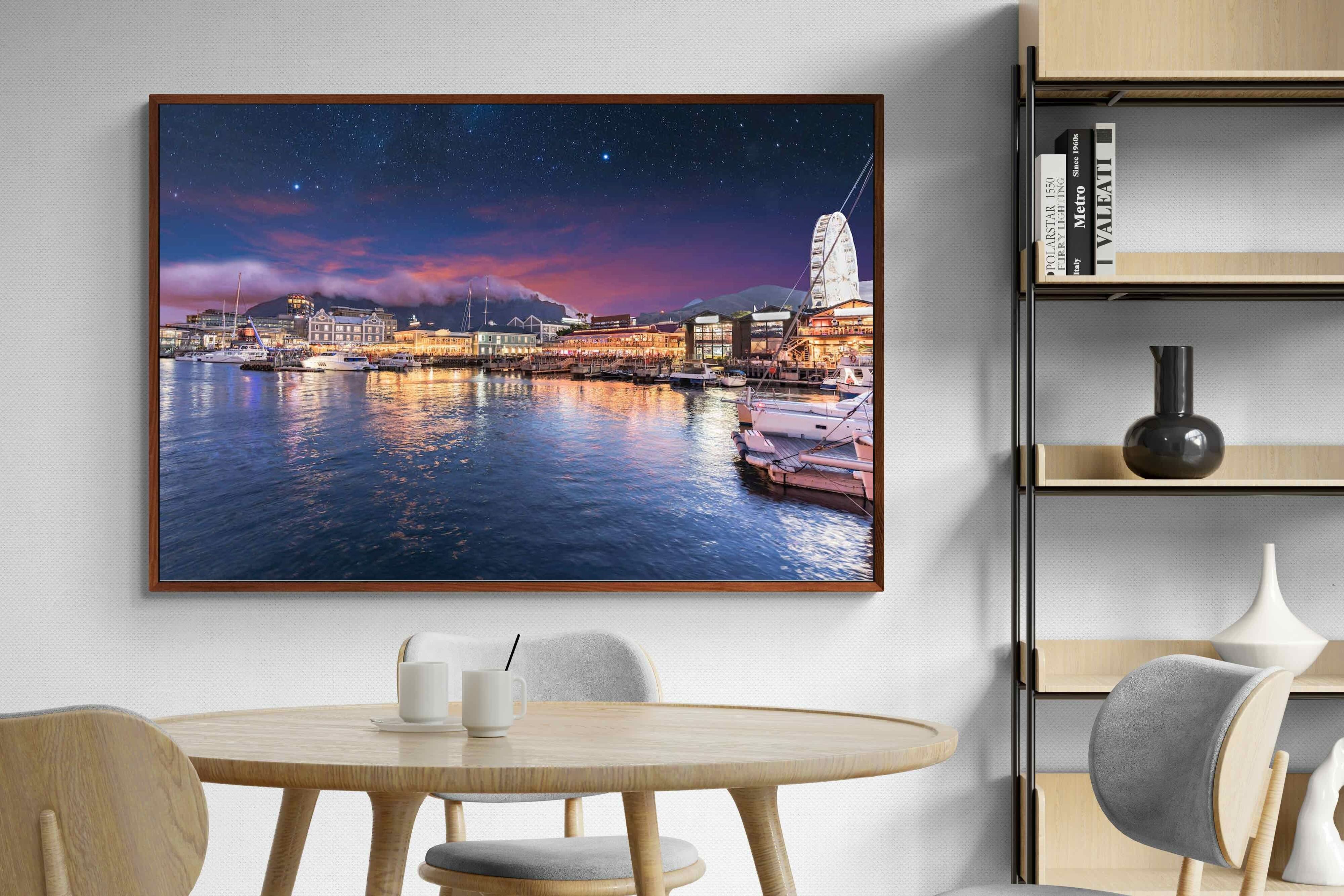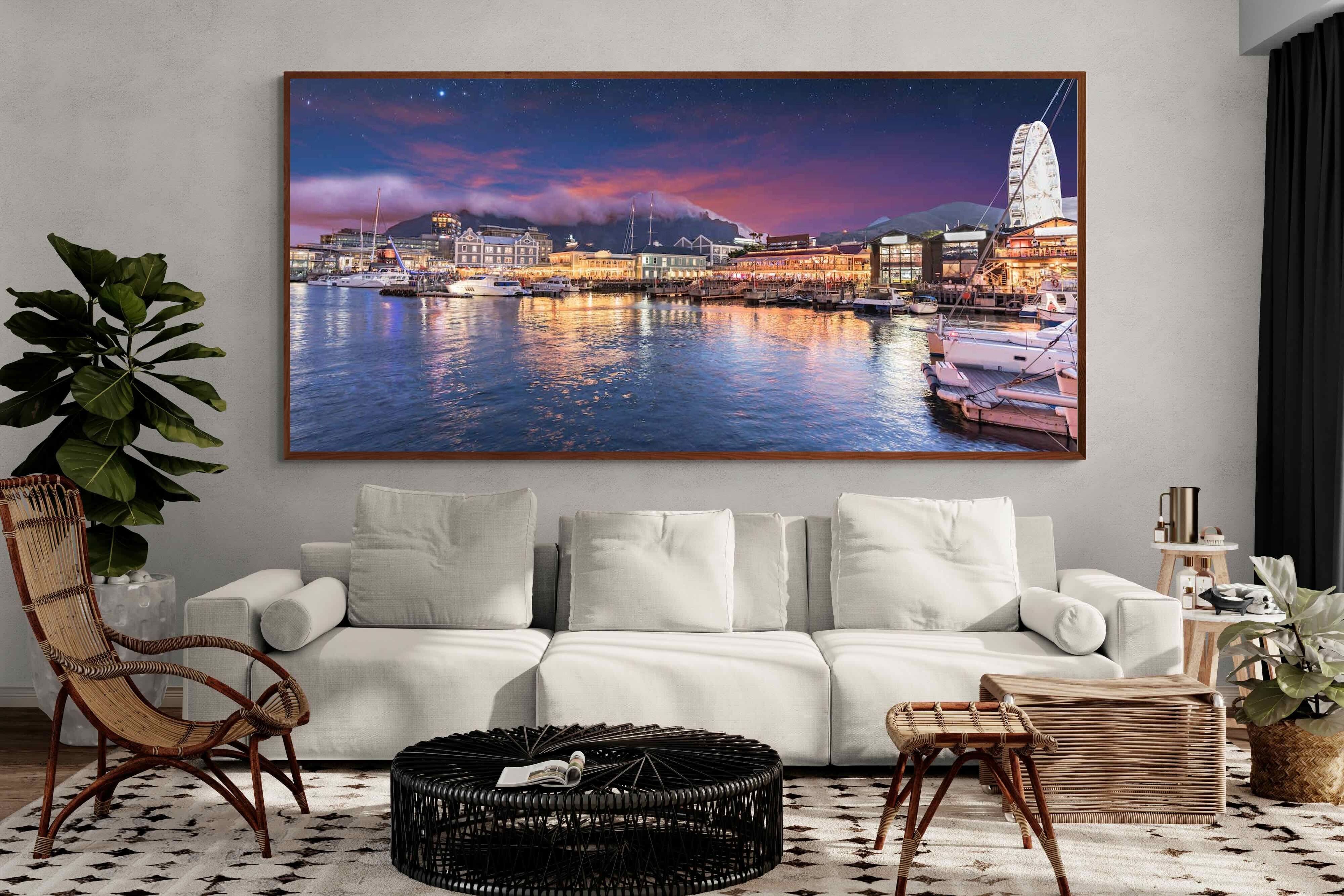Cape Town’s V&A Waterfront glows beneath a star-filled sky, with warm lights reflecting across calm harbour waters. Table Mountain rises softly in the background, partially veiled by drifting cloud, adding depth and atmosphere. The composition blends urban energy with coastal tranquillity, creating a refined and luminous scene. Ideal for modern interiors, this piece brings colour, sophistication and a sense of place to living rooms, offices or contemporary spaces.