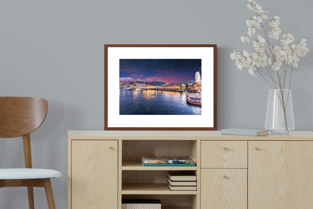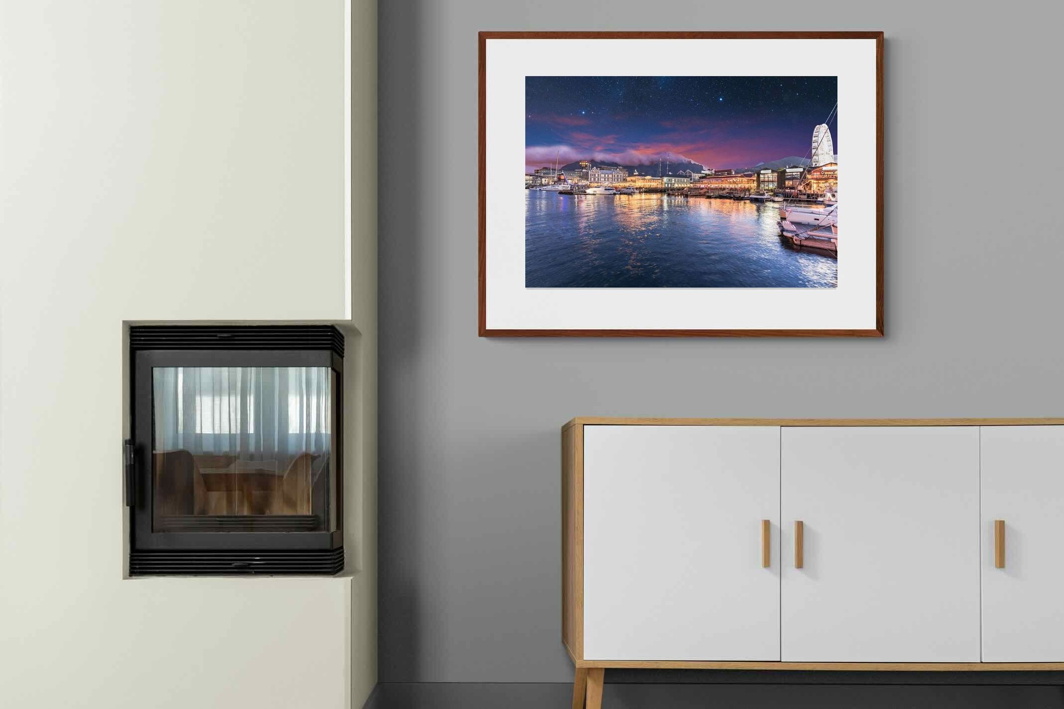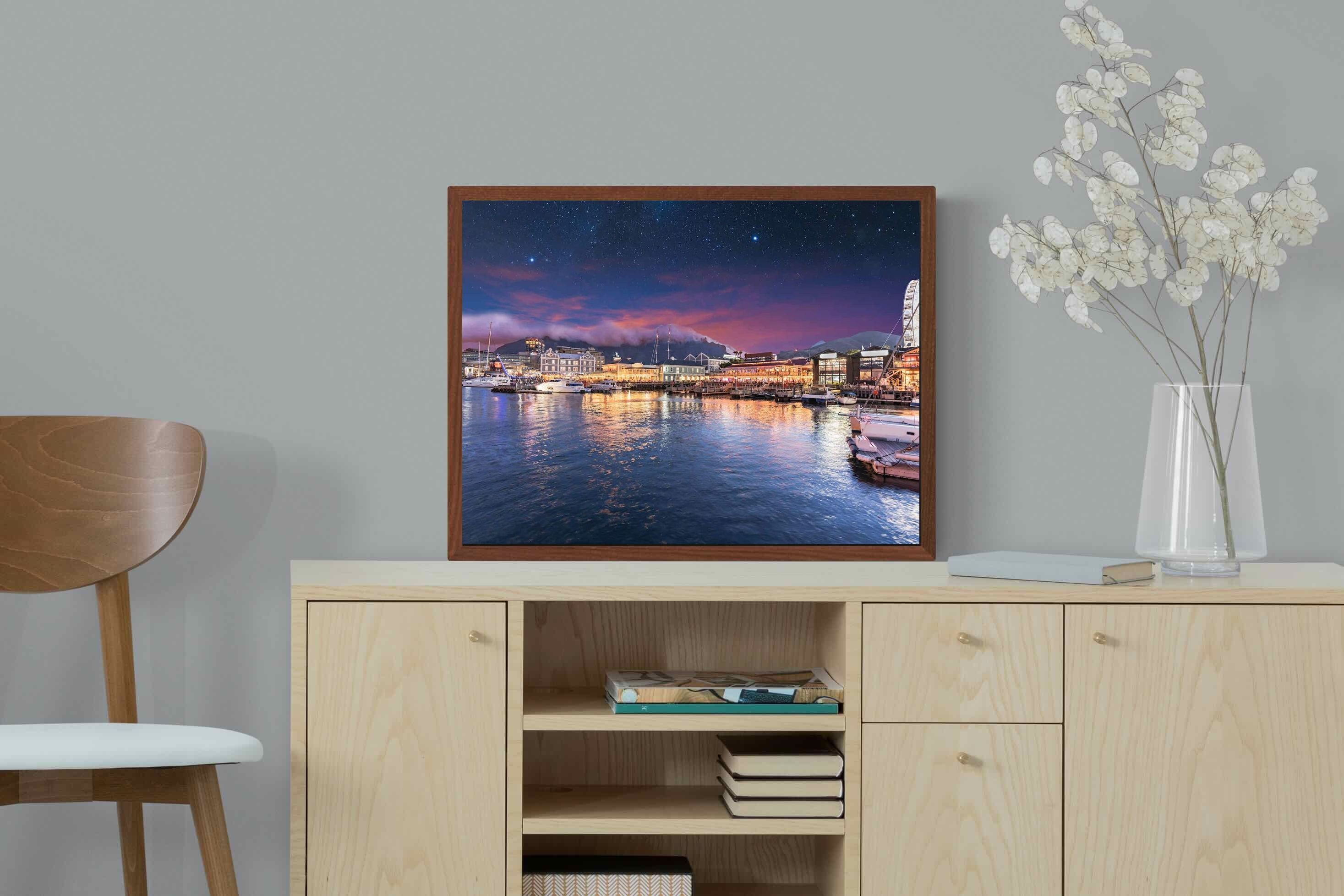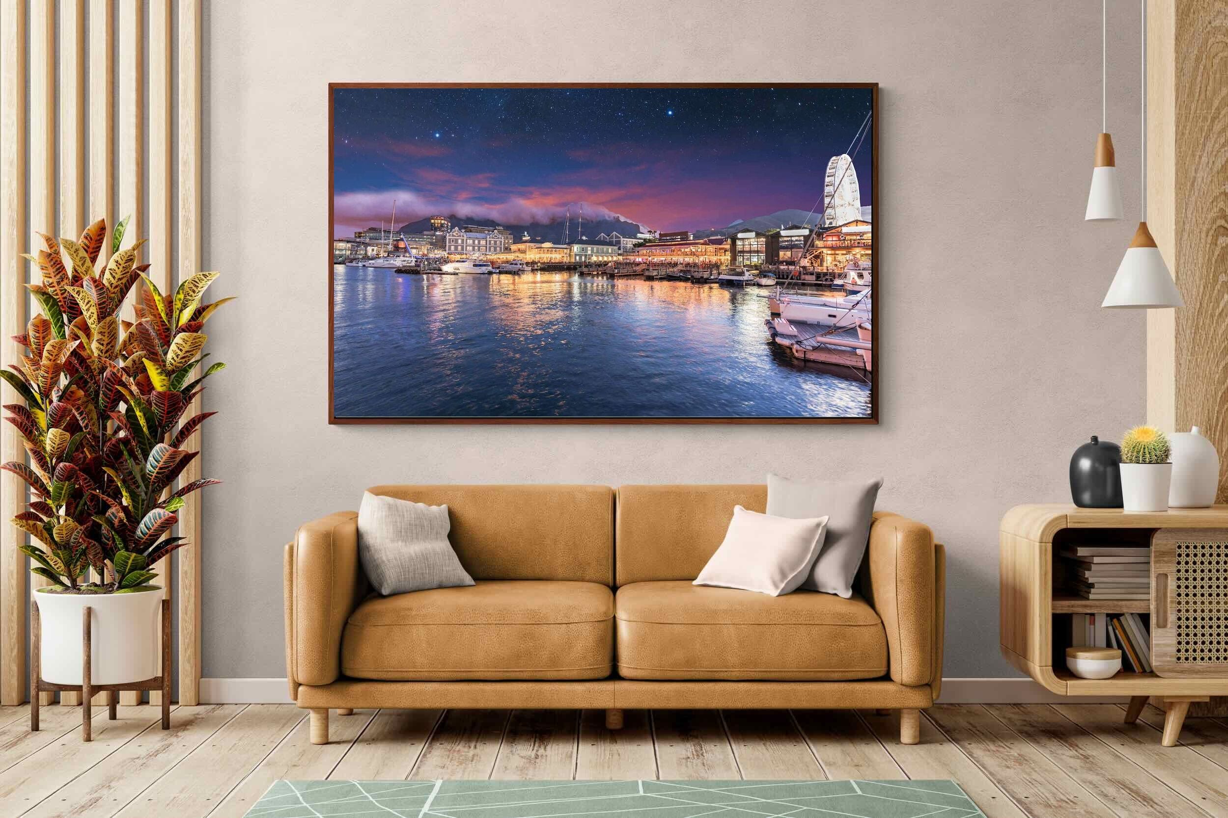 Cape Town’s V&A Waterfront glows beneath a star-filled sky, with warm lights reflecting across calm harbour waters. Table Mountain rises softly in the background, partially veiled by drifting cloud, adding depth and atmosphere. The composition blends urban energy with coastal tranquillity, creating a refined and luminous scene. Ideal for modern interiors, this piece brings colour, sophistication and a sense of place to living rooms, offices or contemporary spaces.