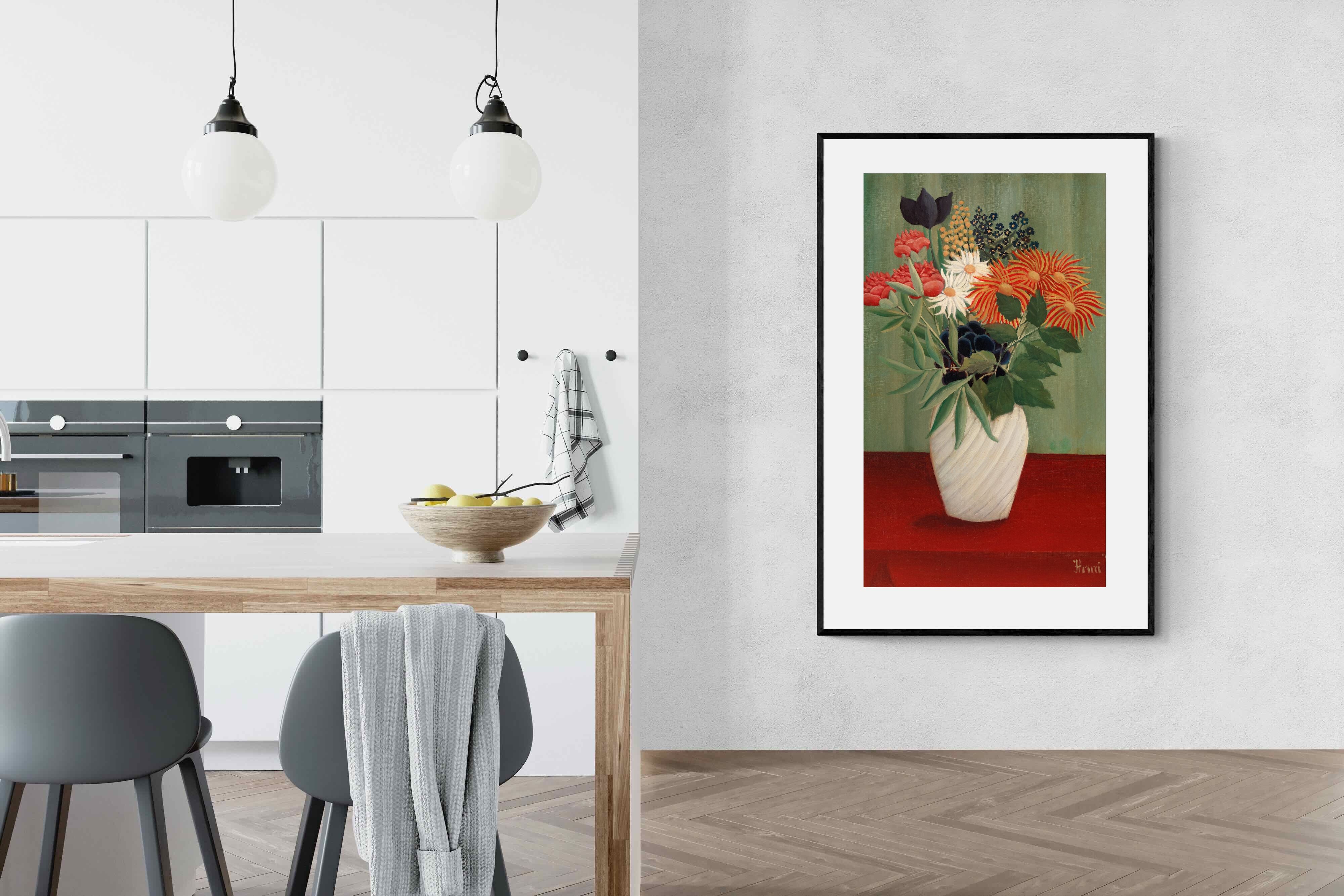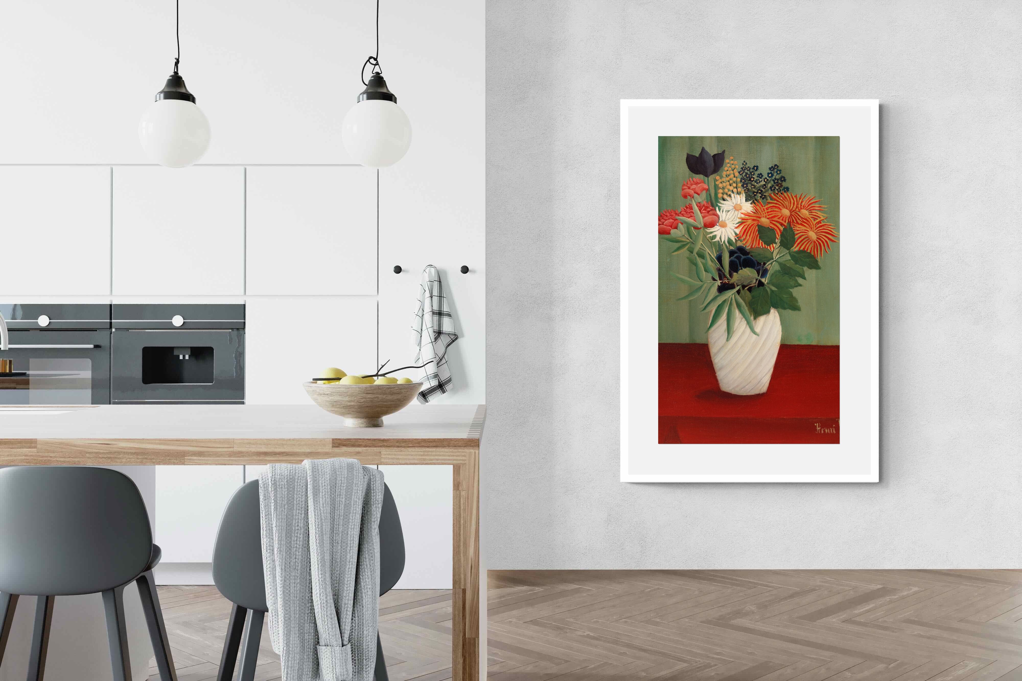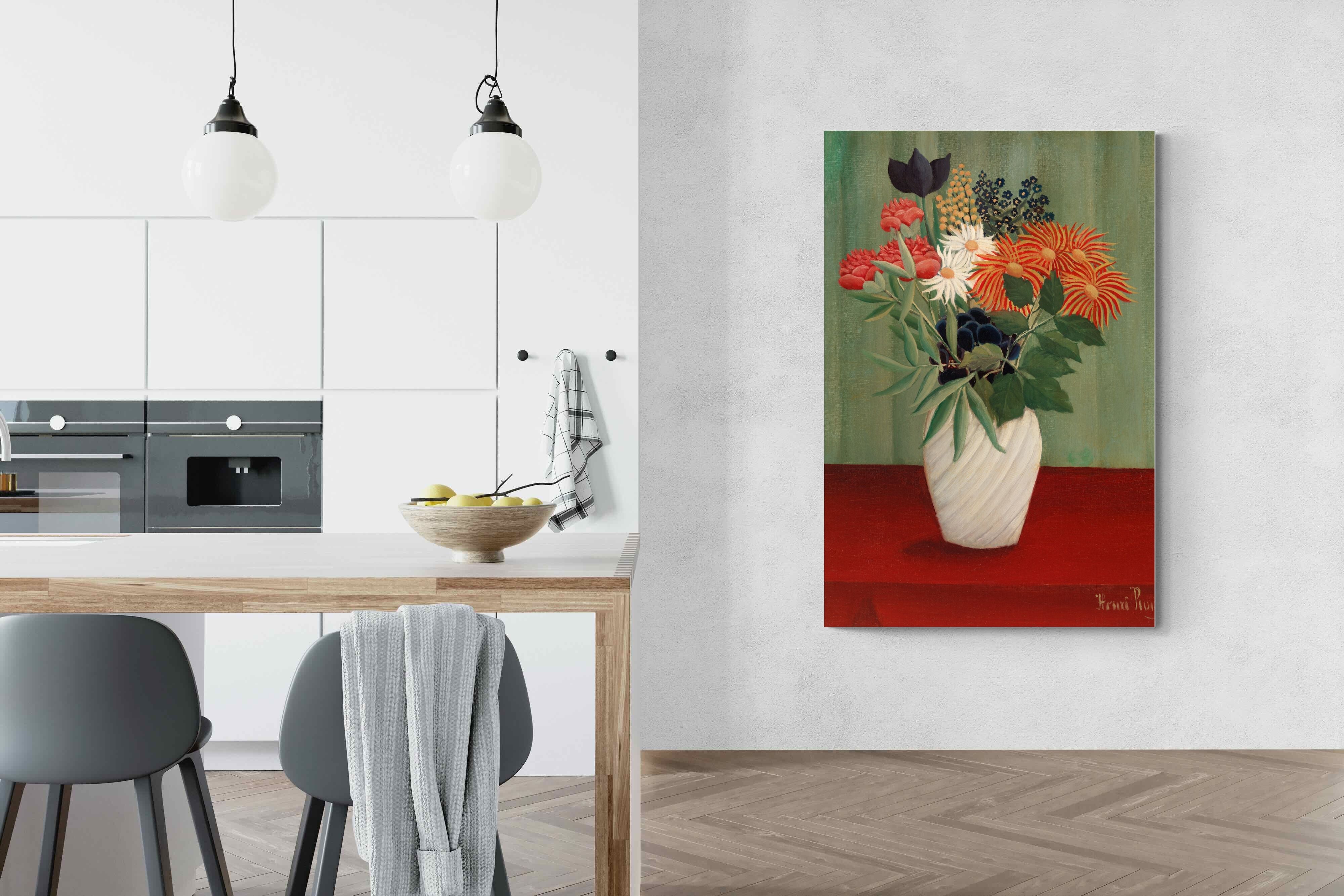 A vibrant still life of flowers arranged in a white vase, set against a bold red table and a green background. Rousseau's arrangement features various colourful blooms, including white daisies and red chrysanthemums. The vivid, simplistic style and bright colours make this still life pop, while reflecting Rousseau’s attention to form and decorative beauty.