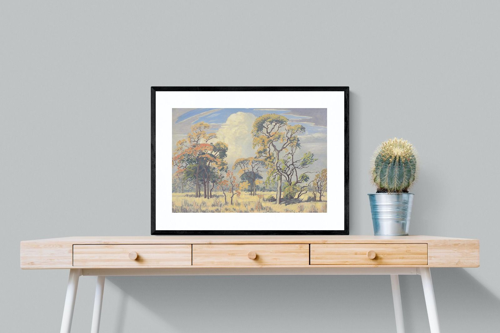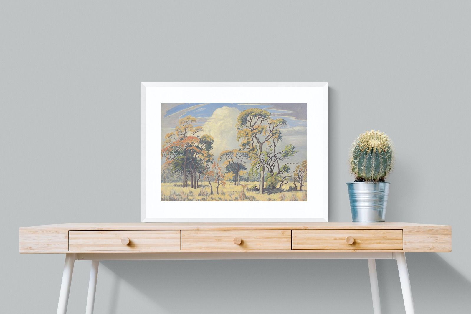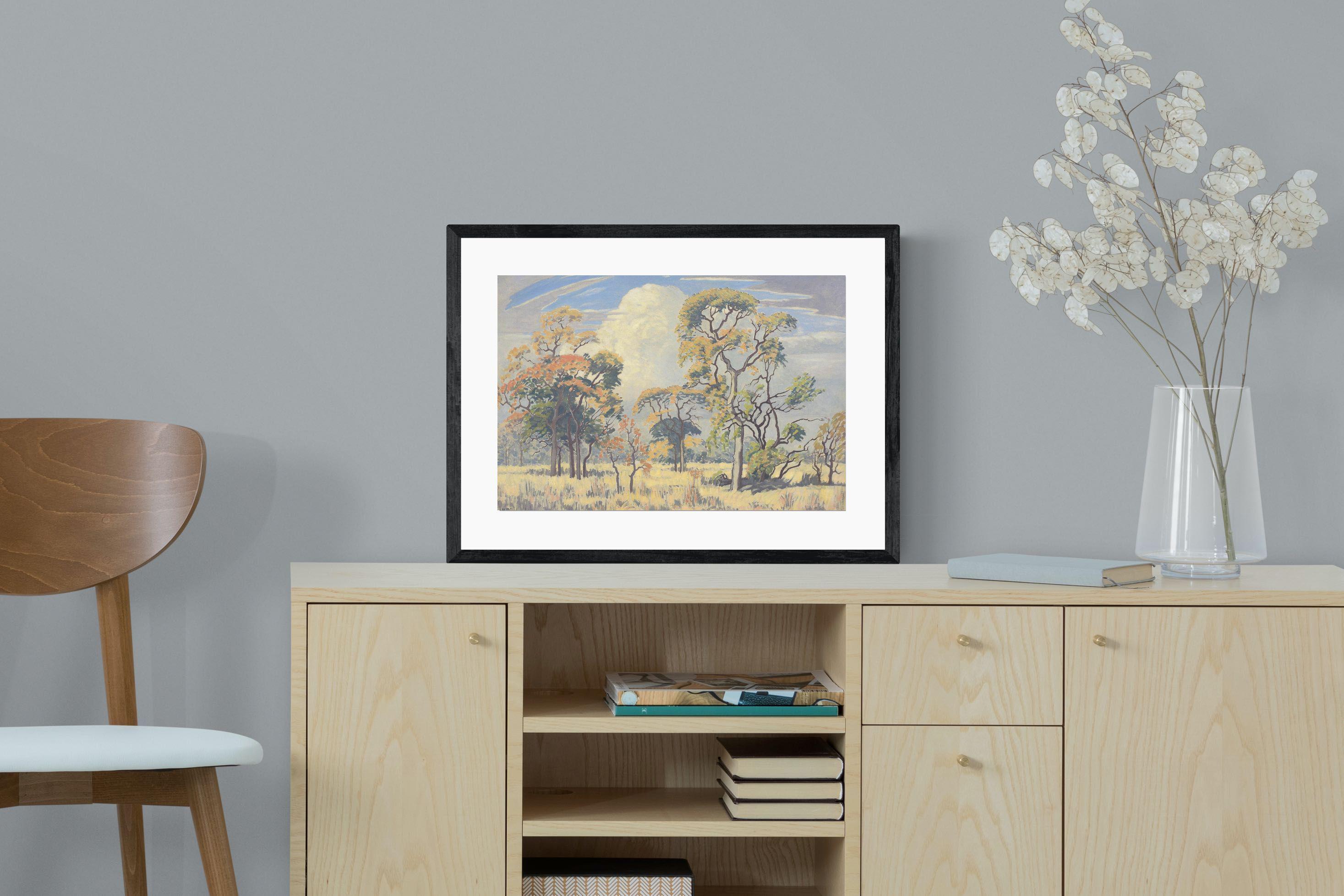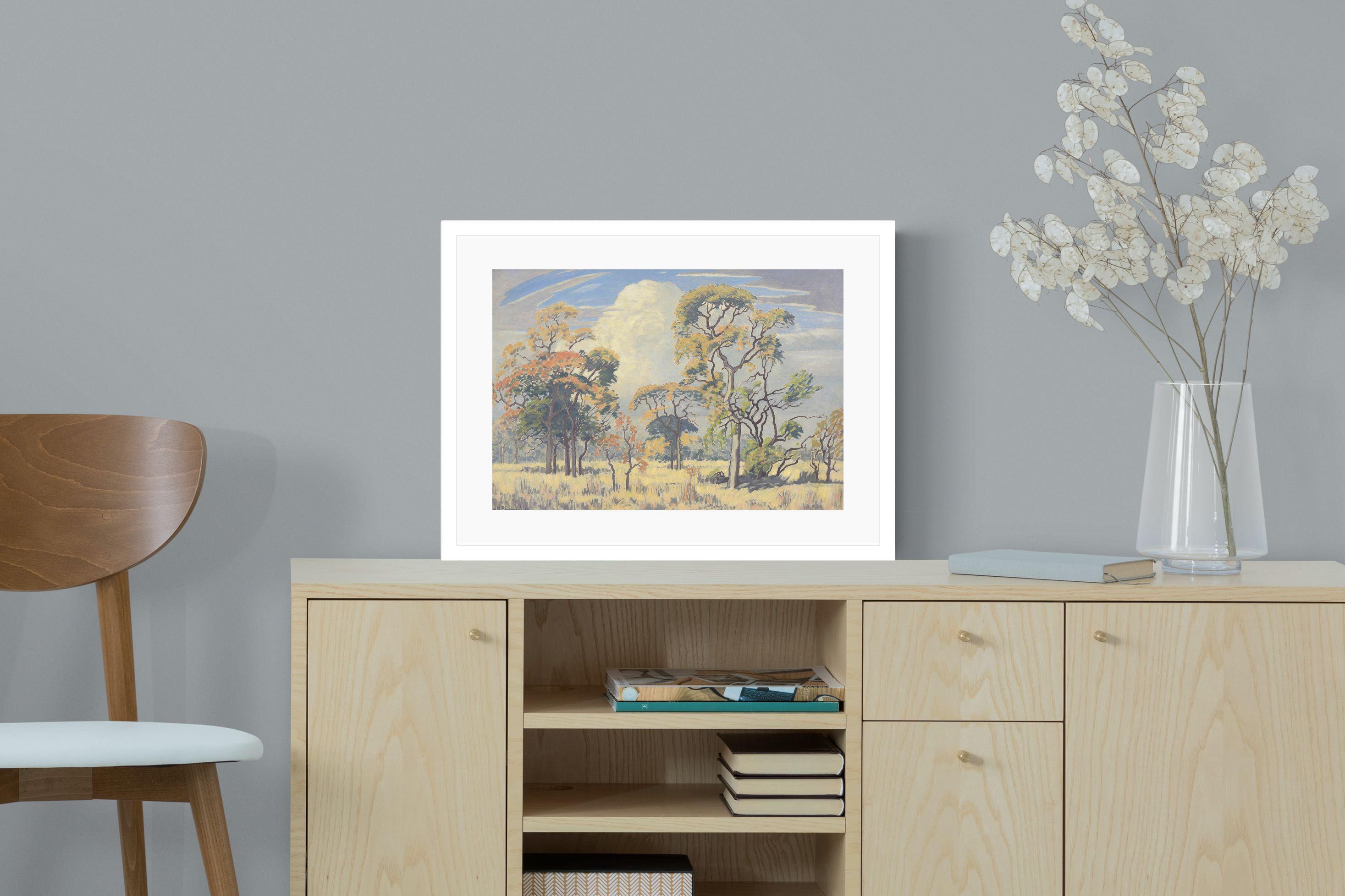 Painted in 1950, this landscape, titled Bushveld Game Reserve, is part of a theme and body of work which occupied the artist throughout his life. These bushveld landscapes from the 1940s and 1950s have certain formal compositional similarities but retain their unique distinctions, some with marked variations on that theme. This work, rendered in a lively palette of green, ochre, yellow, orange and red against a blue and grey sky, alludes to the time of year it was painted. Springtime also heralds the arrival of summer rains illustrated by the rising cumulonimbus cloud in the background.