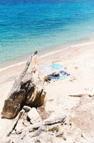 A secluded beach scene pairs crystal-clear turquoise water with pale sand and rugged rock formations, creating a relaxed and intimate composition. Subtle details like umbrellas and towels add a lived-in, summer feel without distracting from the natural setting. Ideal for bathrooms, bedrooms, or coastal interiors, it brings a sense of warmth and escape. Its soft palette and gentle contrast make it a versatile piece for spaces that favour light, openness, and understated holiday styling.