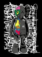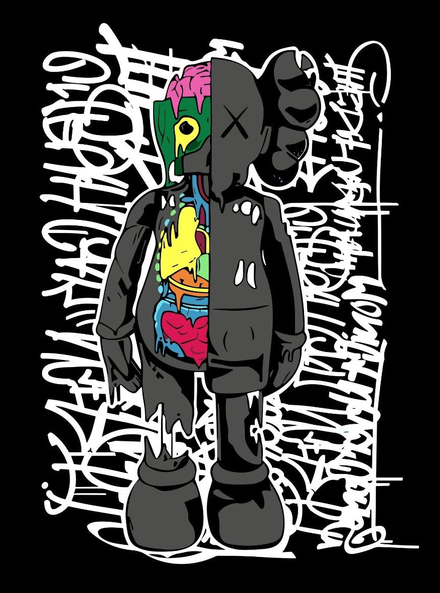 Experience a dynamic fusion of iconic design and urban essence with "KAWS by Half". This artwork illuminates the canvas with its blend of stark contrasts, marrying the edginess of street art with the recognizable motifs of contemporary design. Engulfed in a sea of white graffiti-like scripts, the central figure stands out, captivating and intriguing to the onlooker.