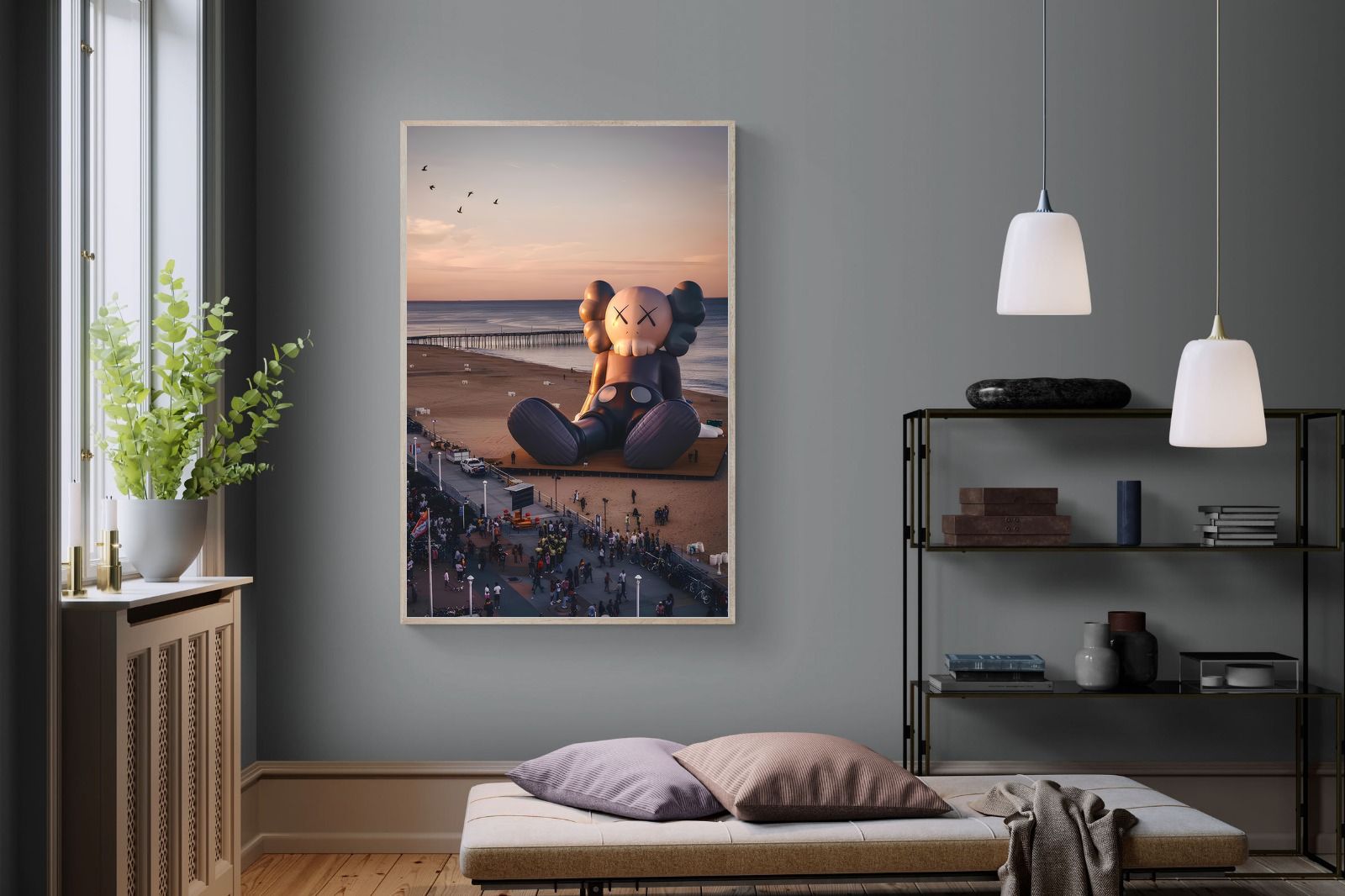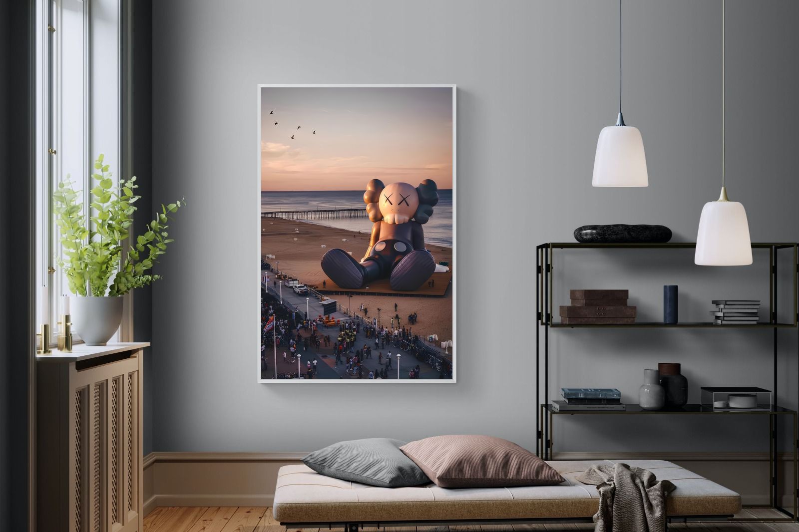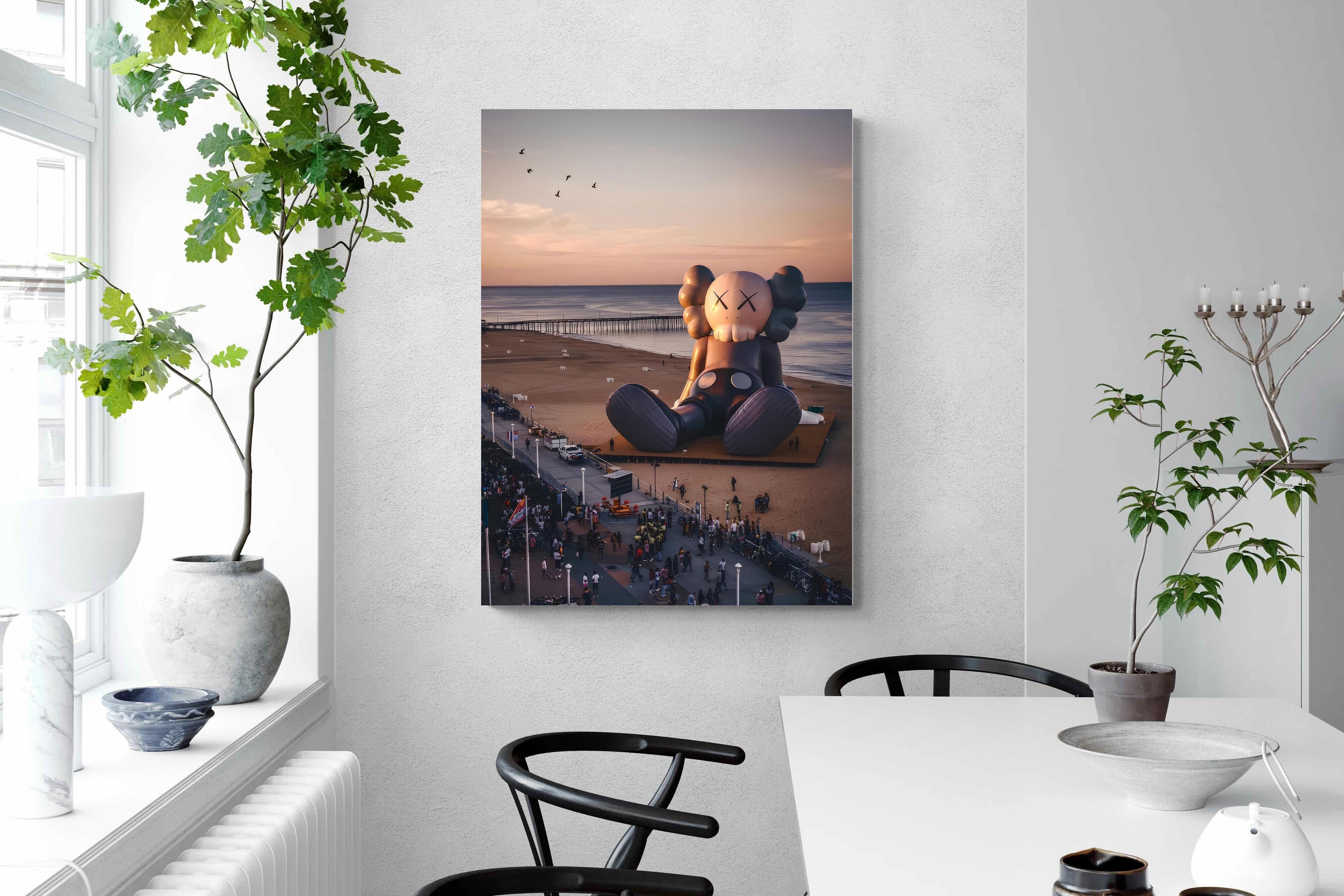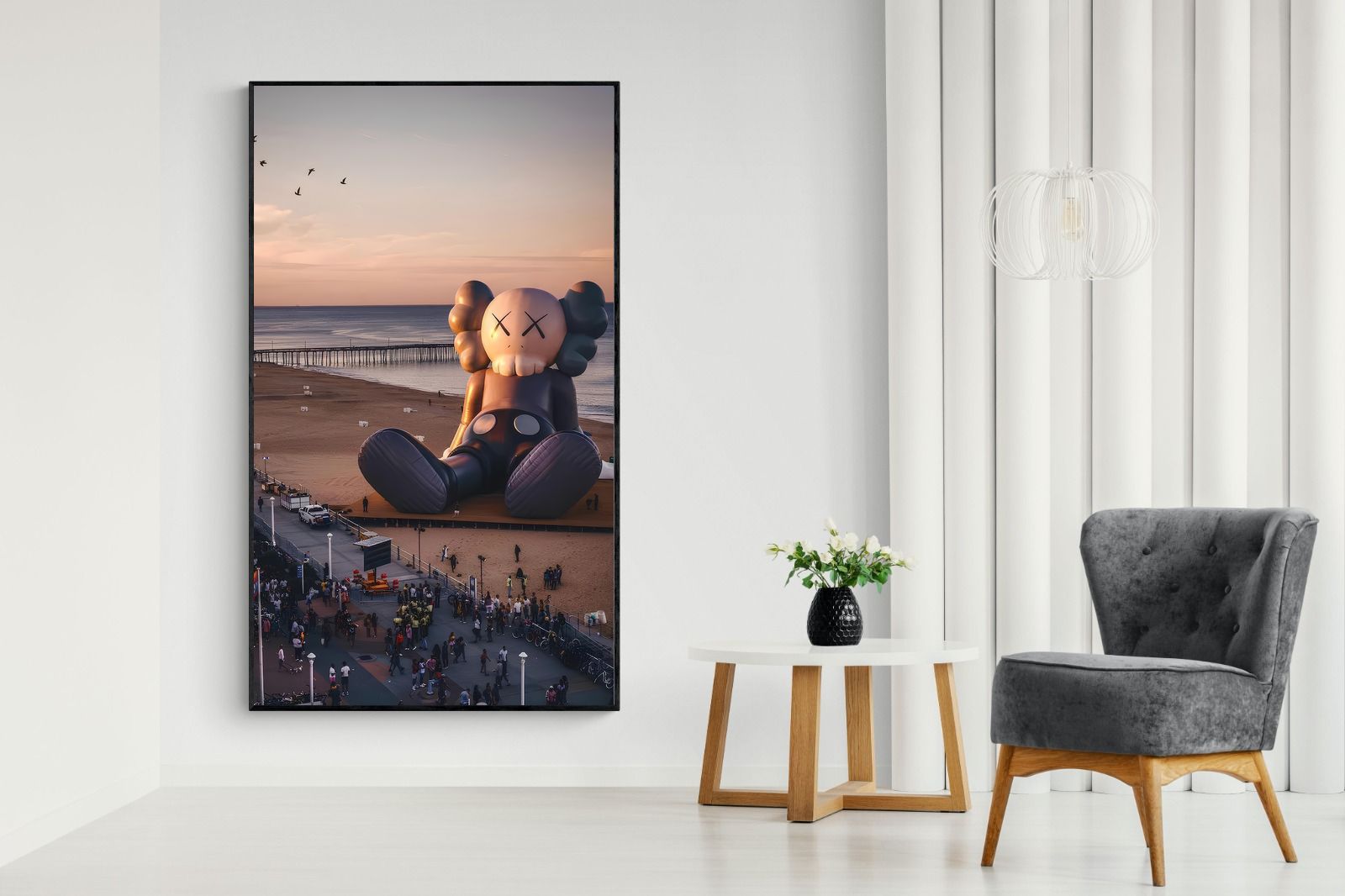This KAWS wall art features a massive "Companion" figure resting on a beach, overlooking the sea at sunset. The warm tones of the sky and the figure's relaxed pose create a tranquil yet playful atmosphere. In a contemporary home, this piece would be a striking conversation starter, blending urban art with serene coastal vibes. Its modern aesthetic adds a bold, iconic touch to any space.