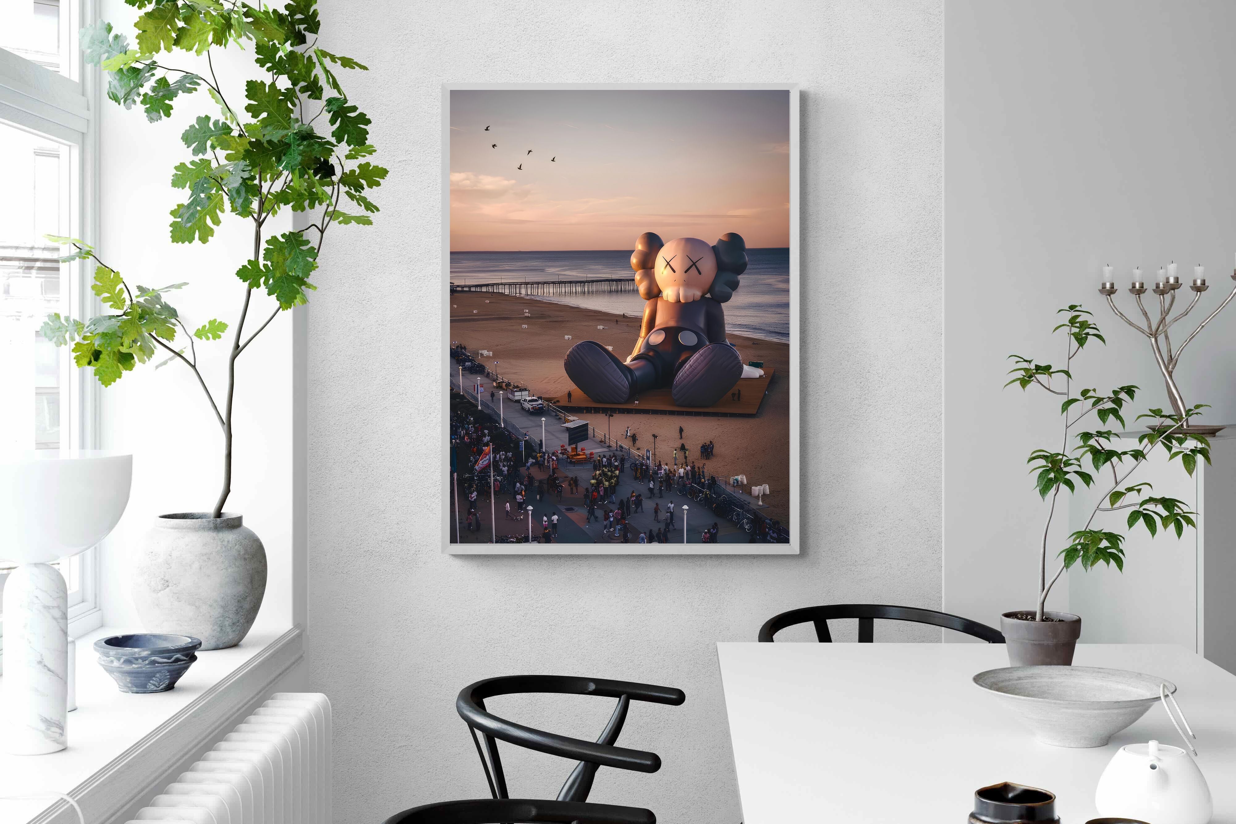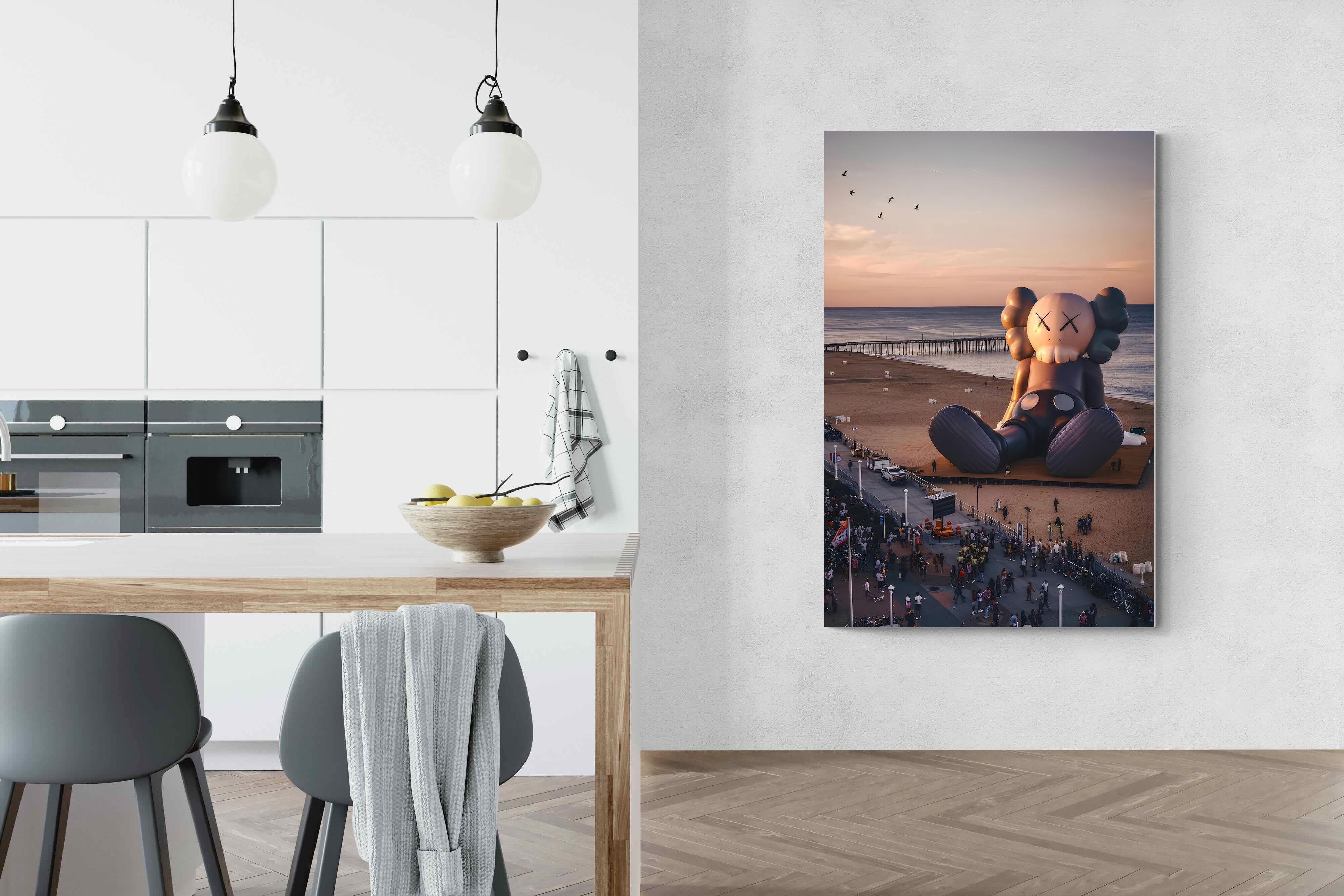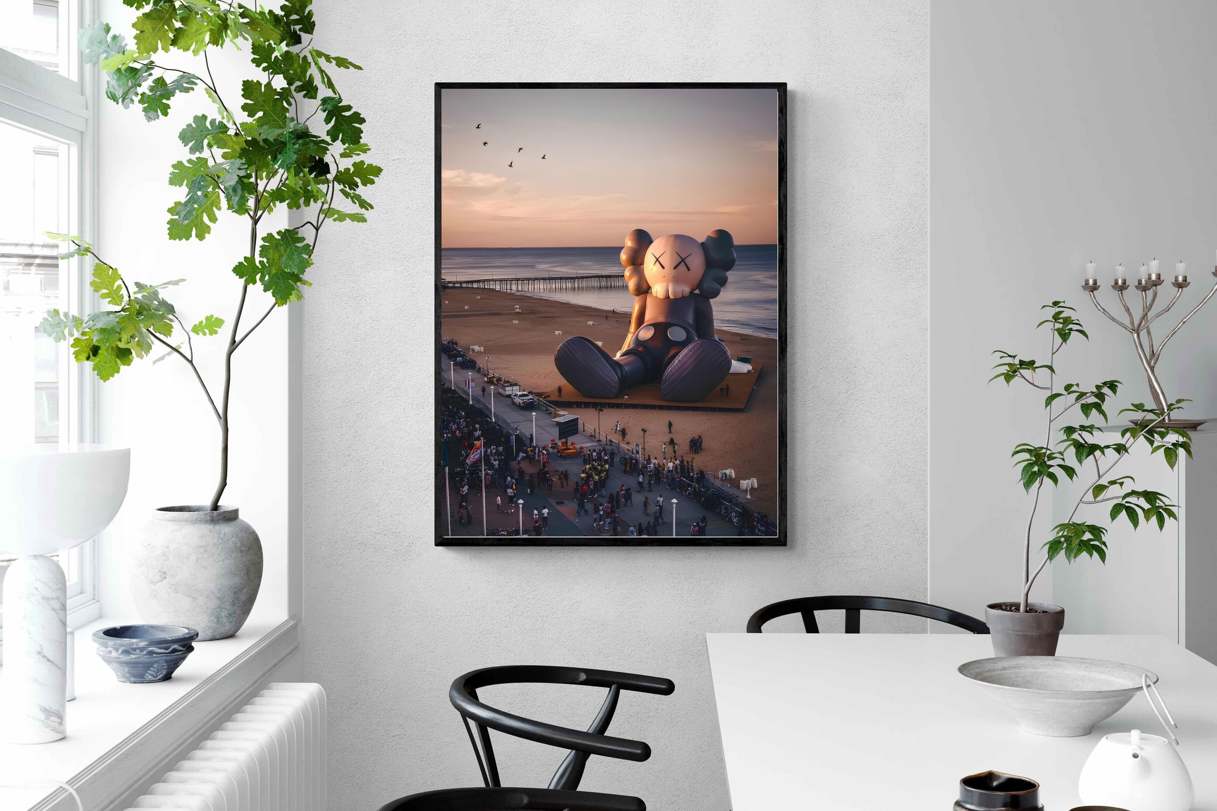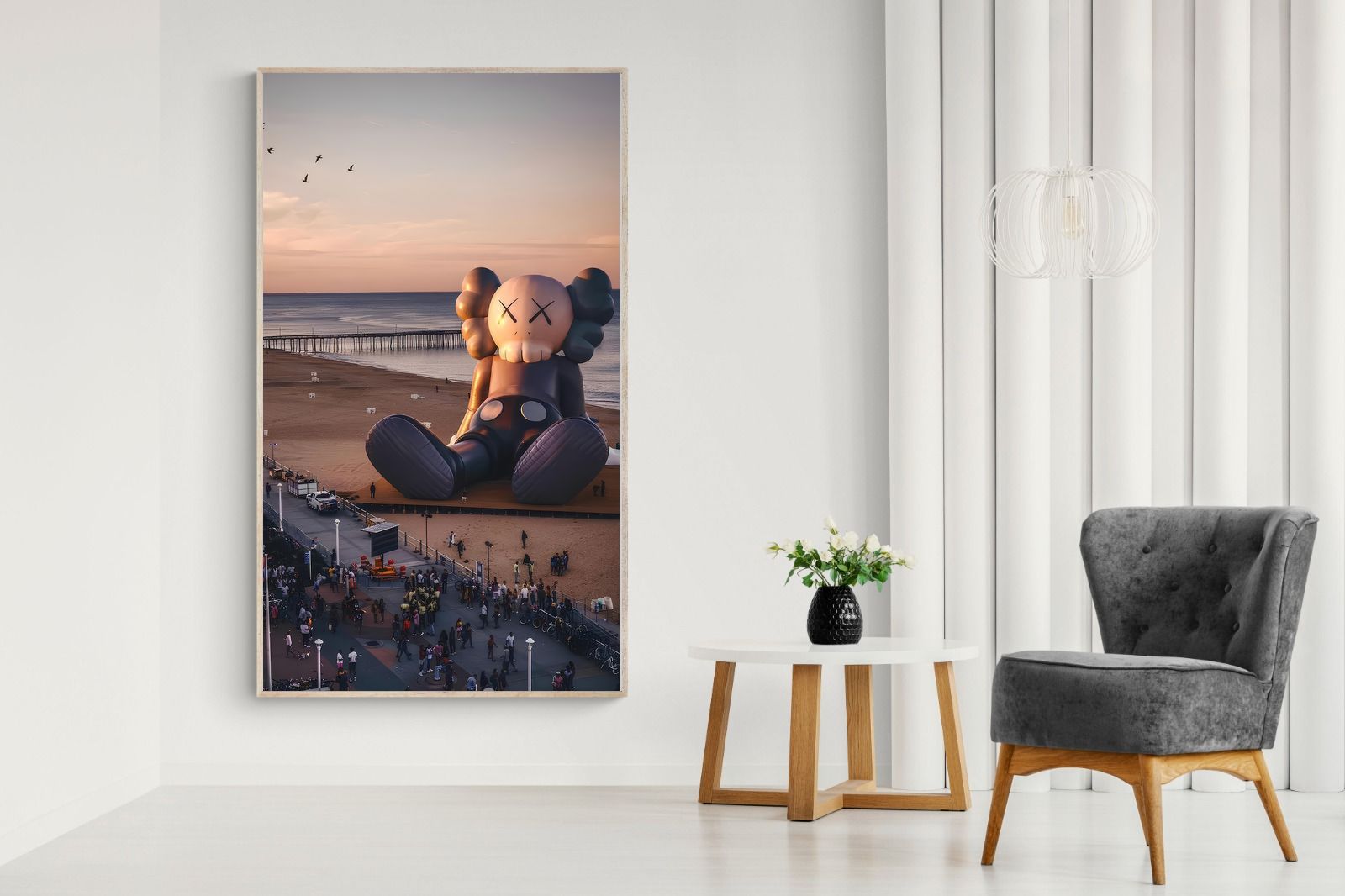 This KAWS wall art features a massive "Companion" figure resting on a beach, overlooking the sea at sunset. The warm tones of the sky and the figure's relaxed pose create a tranquil yet playful atmosphere. In a contemporary home, this piece would be a striking conversation starter, blending urban art with serene coastal vibes. Its modern aesthetic adds a bold, iconic touch to any space.