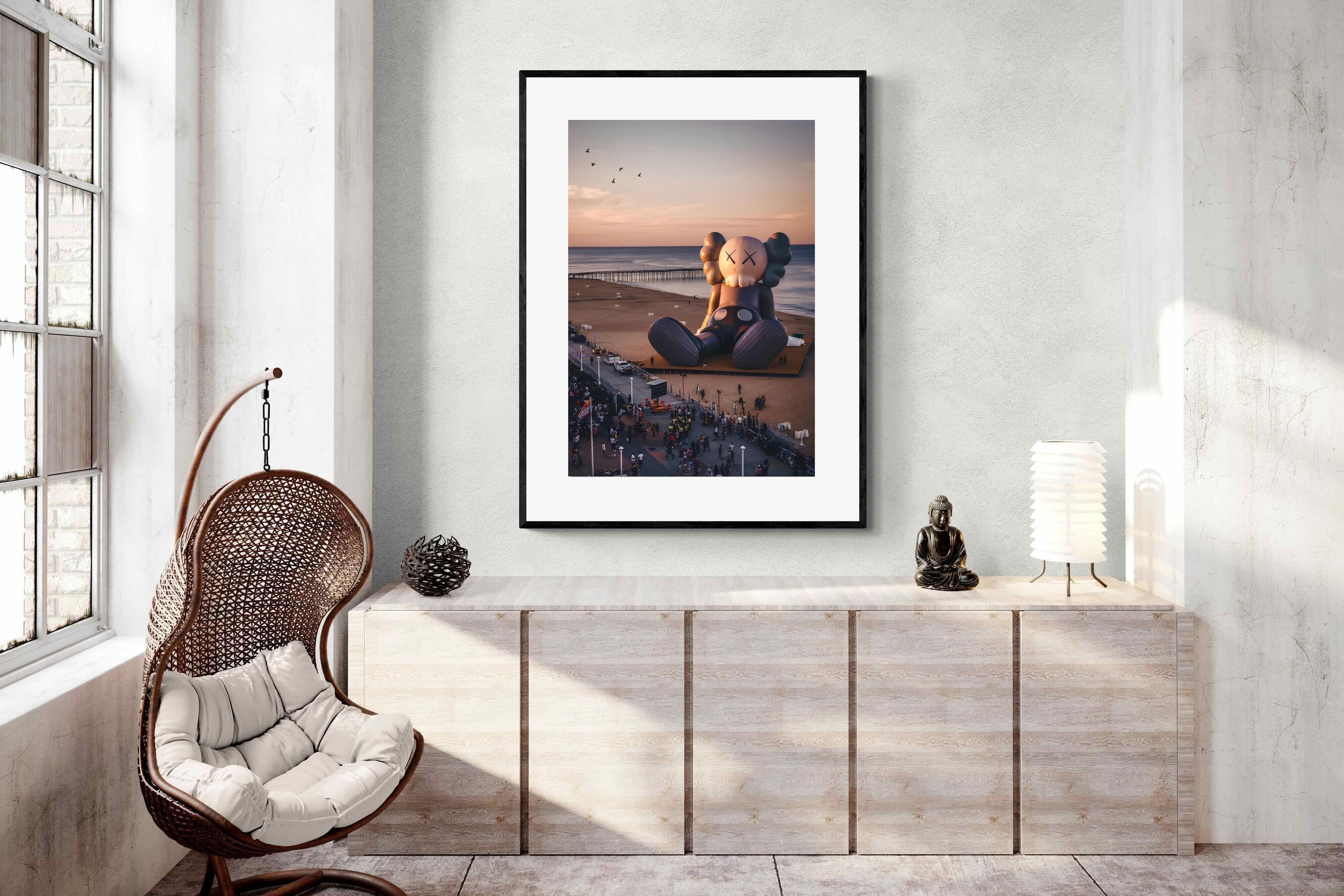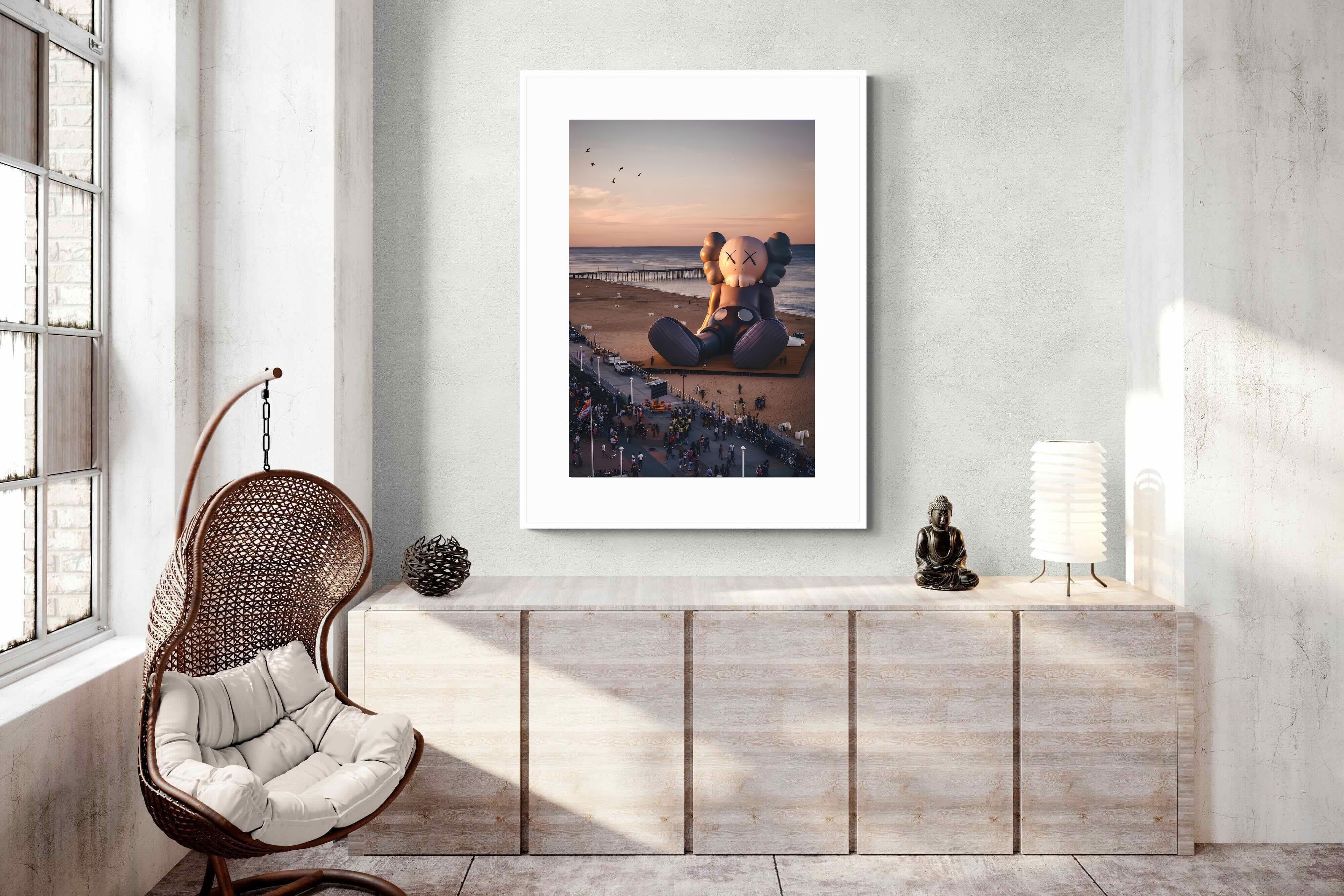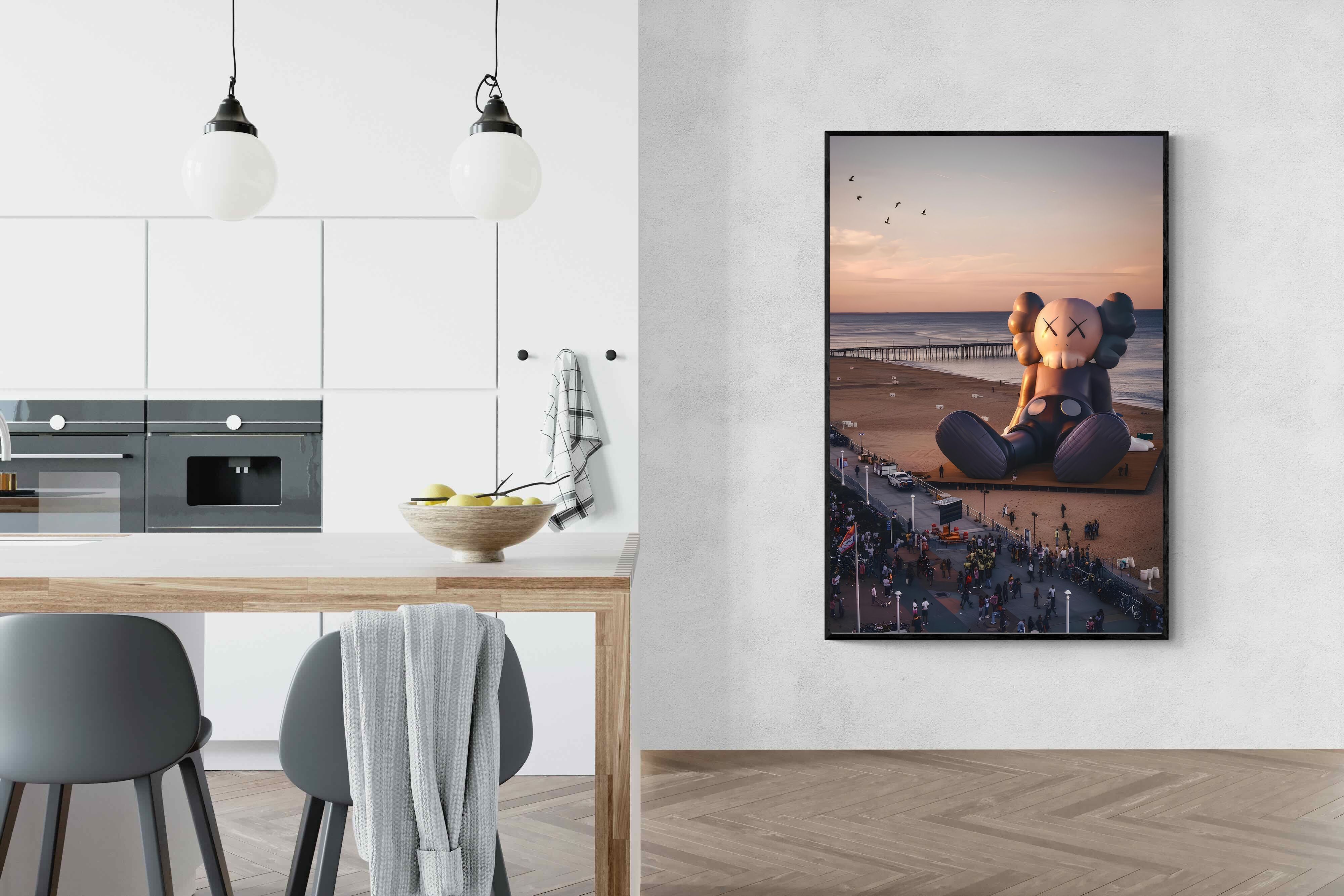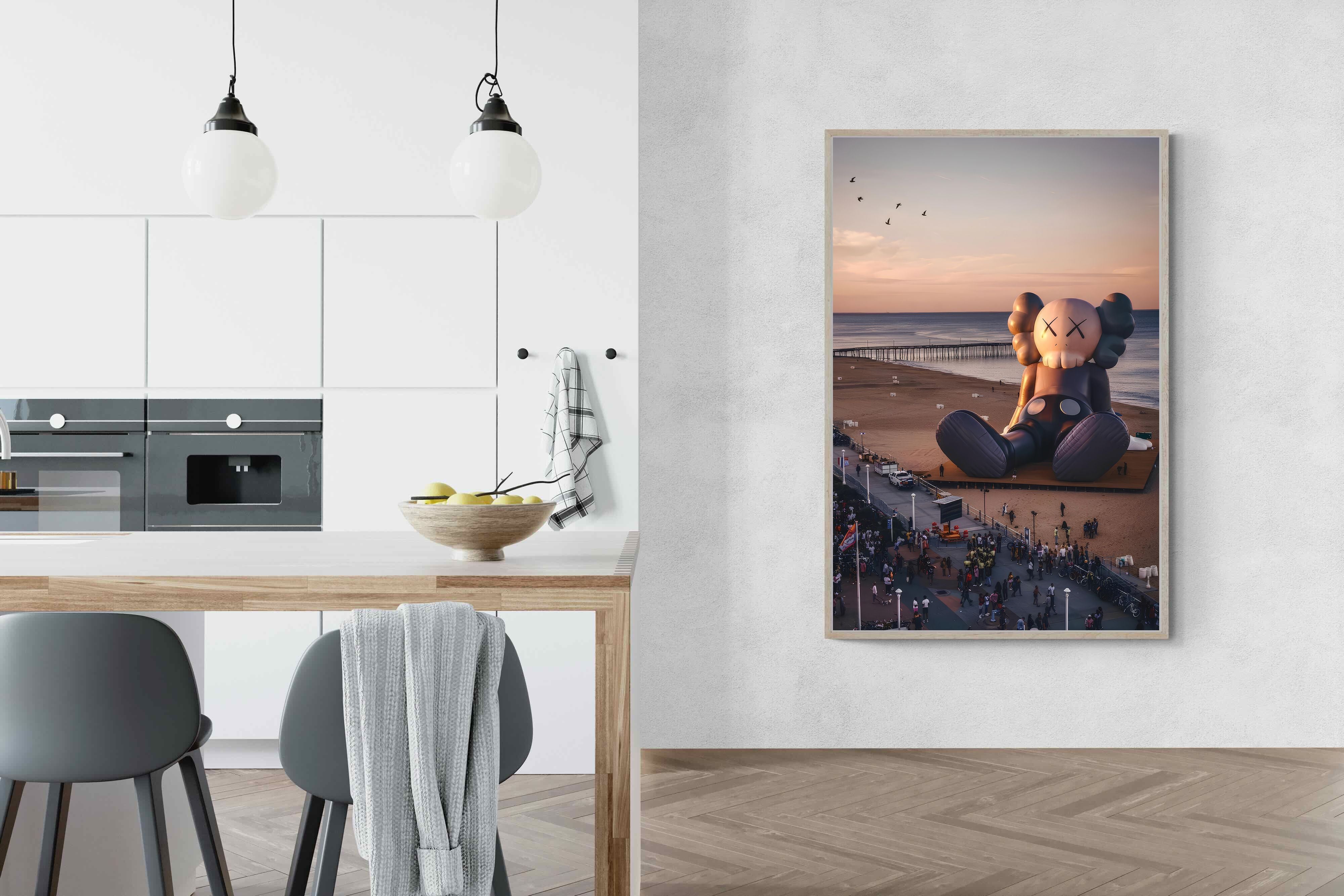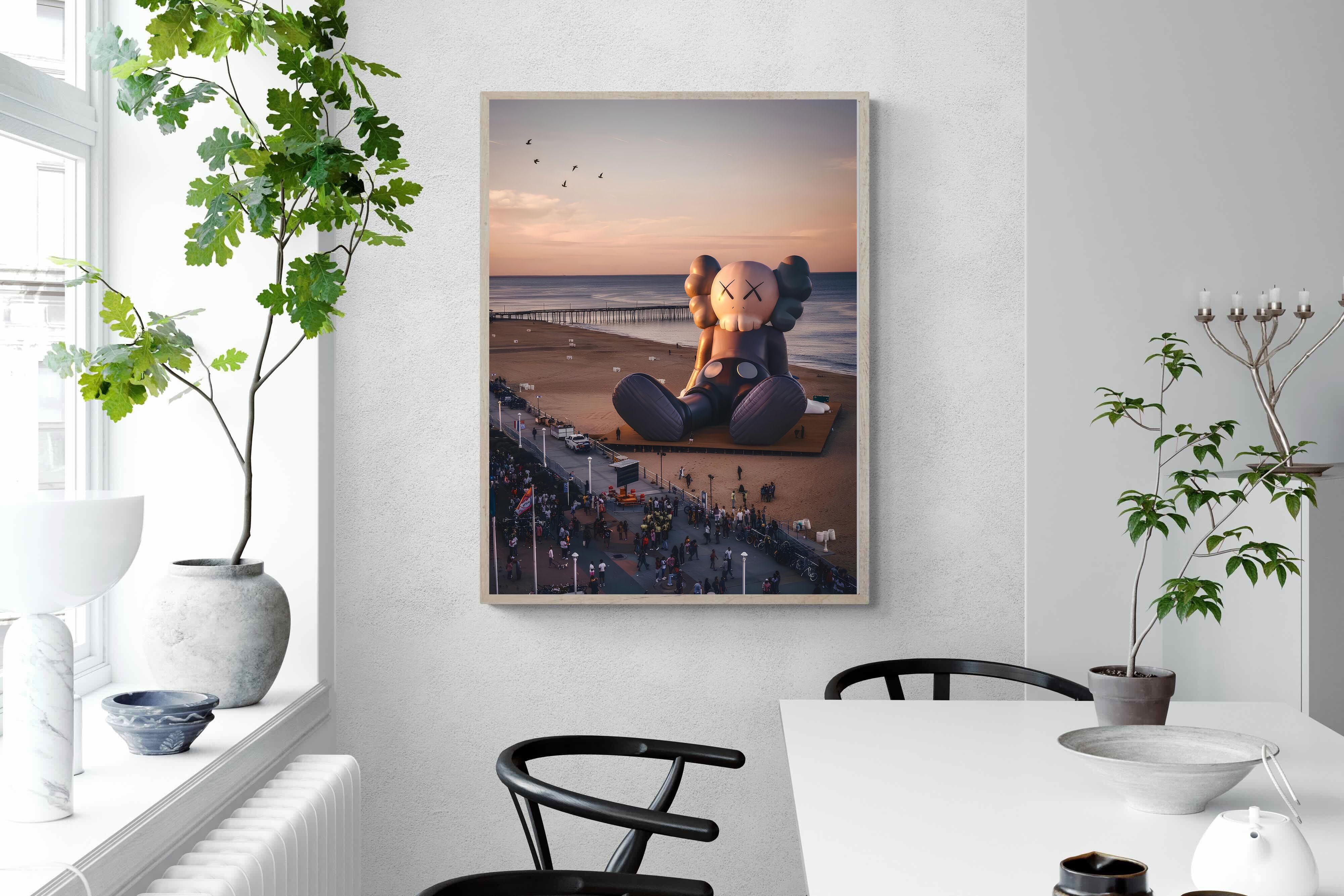 This KAWS wall art features a massive "Companion" figure resting on a beach, overlooking the sea at sunset. The warm tones of the sky and the figure's relaxed pose create a tranquil yet playful atmosphere. In a contemporary home, this piece would be a striking conversation starter, blending urban art with serene coastal vibes. Its modern aesthetic adds a bold, iconic touch to any space.
