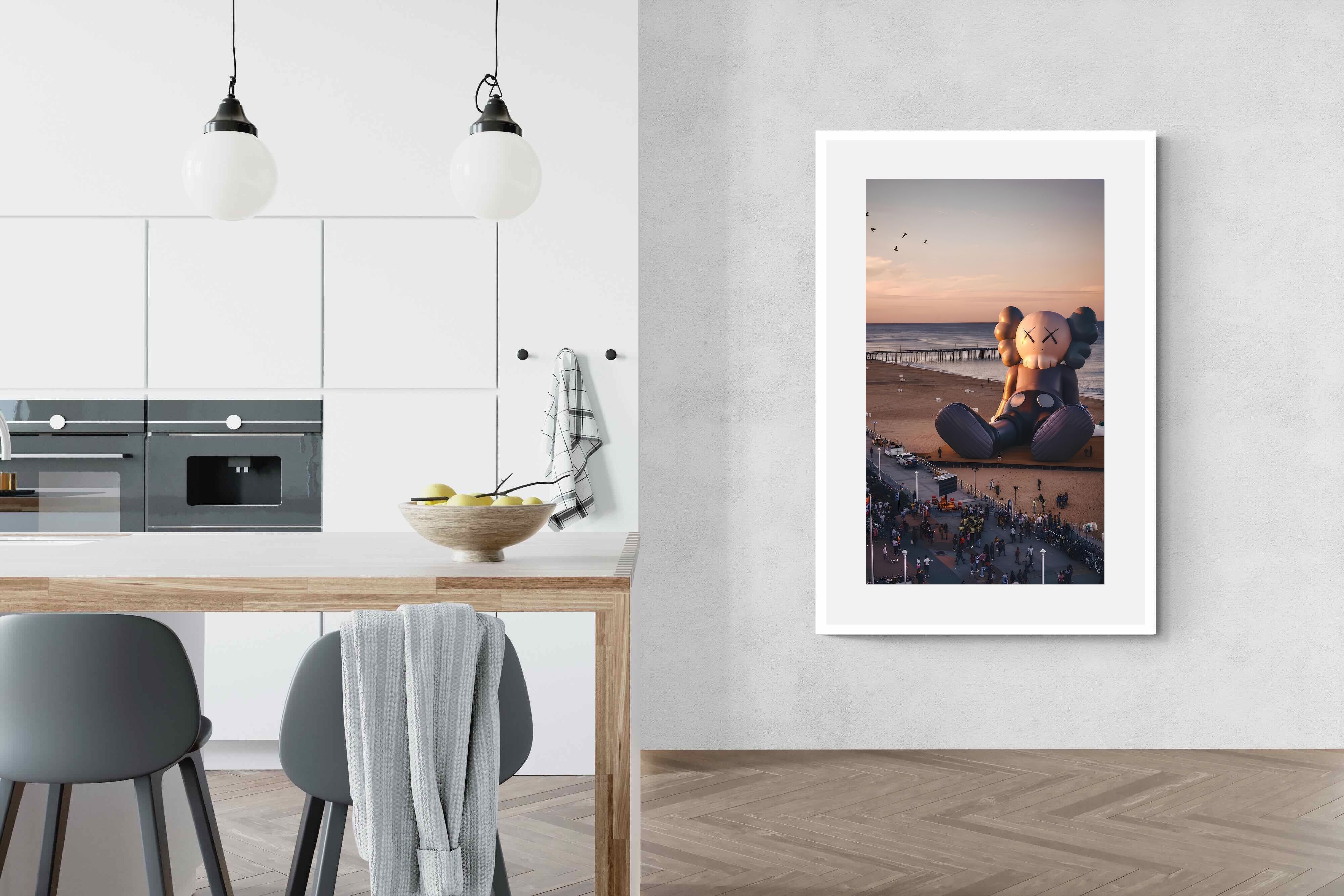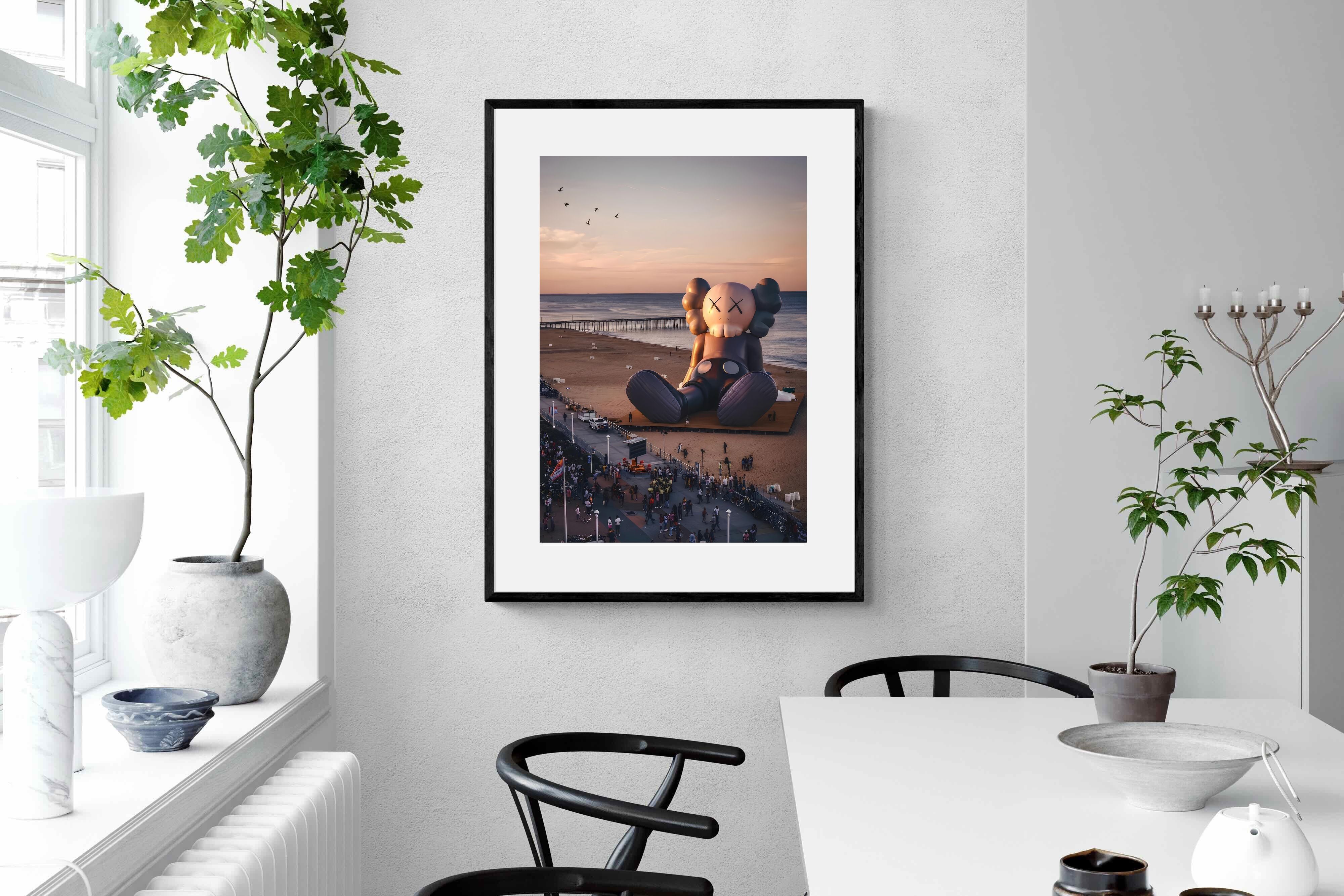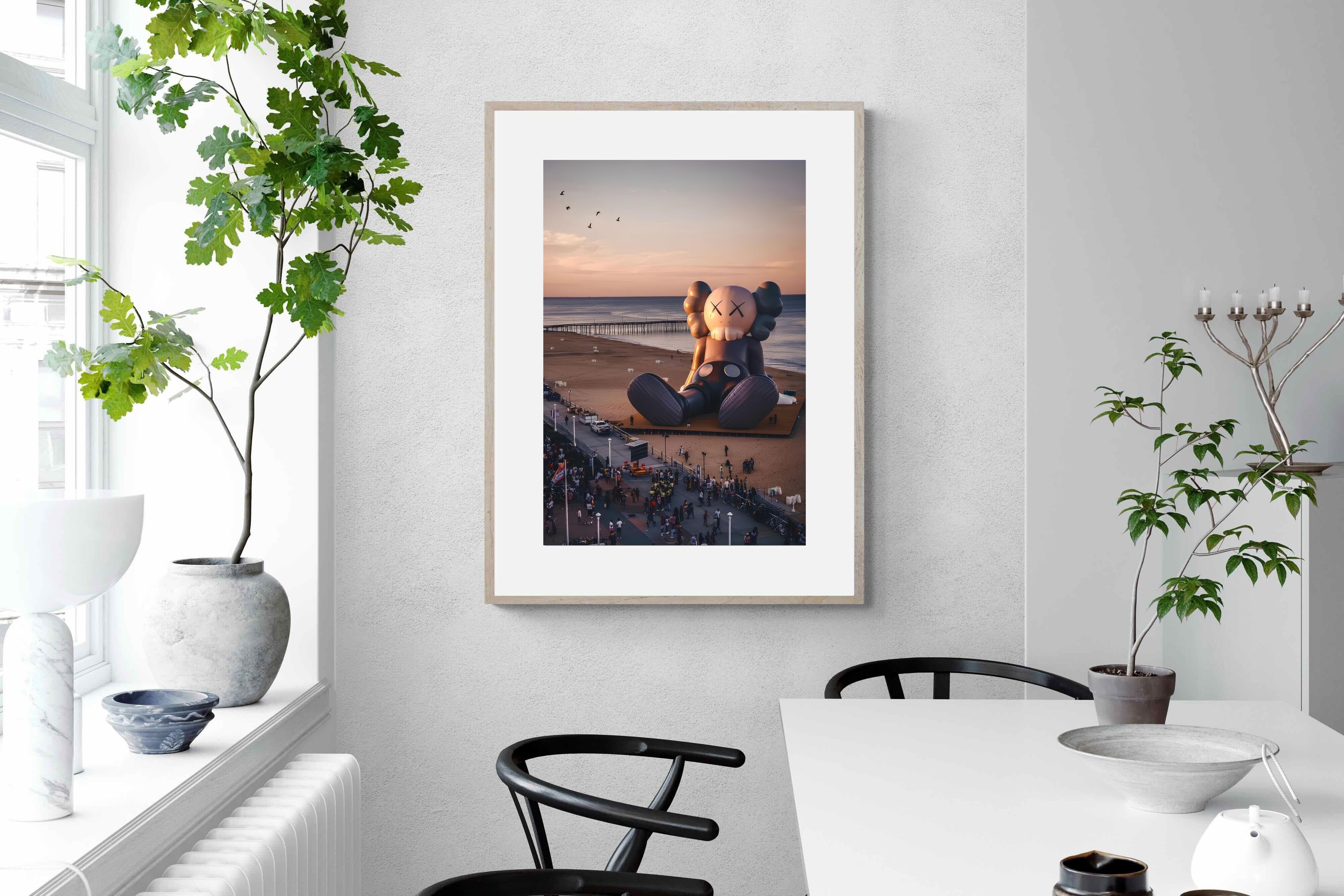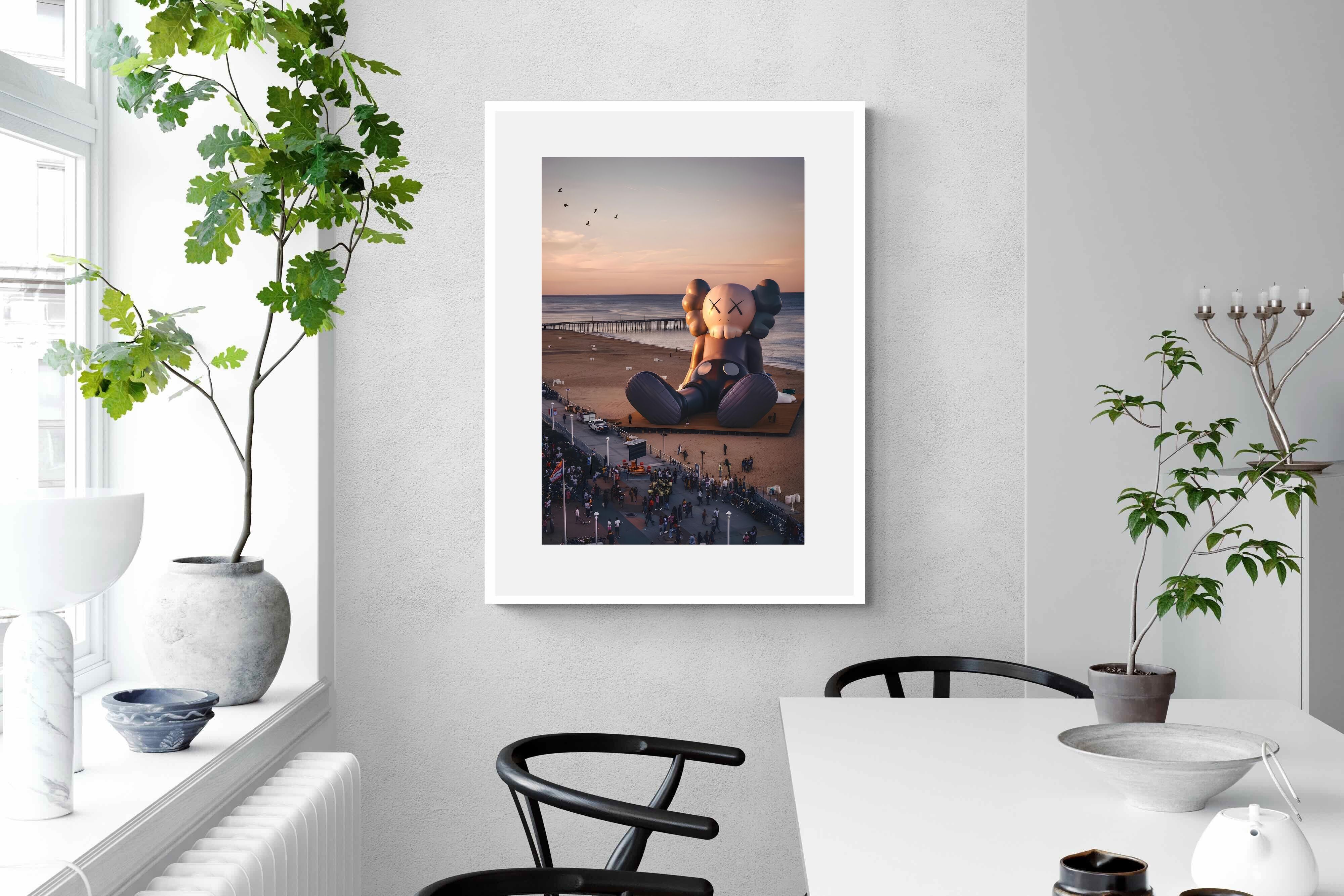 This KAWS wall art features a massive "Companion" figure resting on a beach, overlooking the sea at sunset. The warm tones of the sky and the figure's relaxed pose create a tranquil yet playful atmosphere. In a contemporary home, this piece would be a striking conversation starter, blending urban art with serene coastal vibes. Its modern aesthetic adds a bold, iconic touch to any space.
