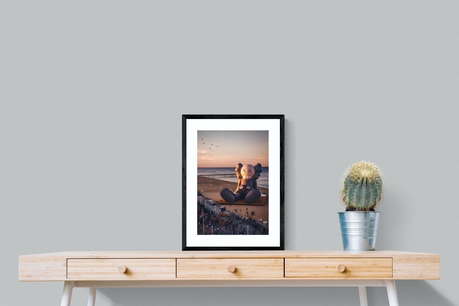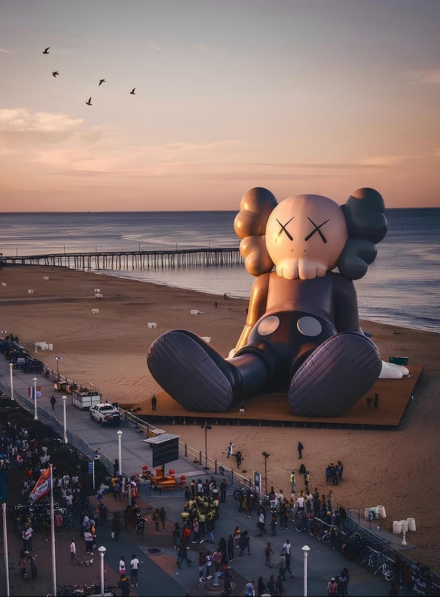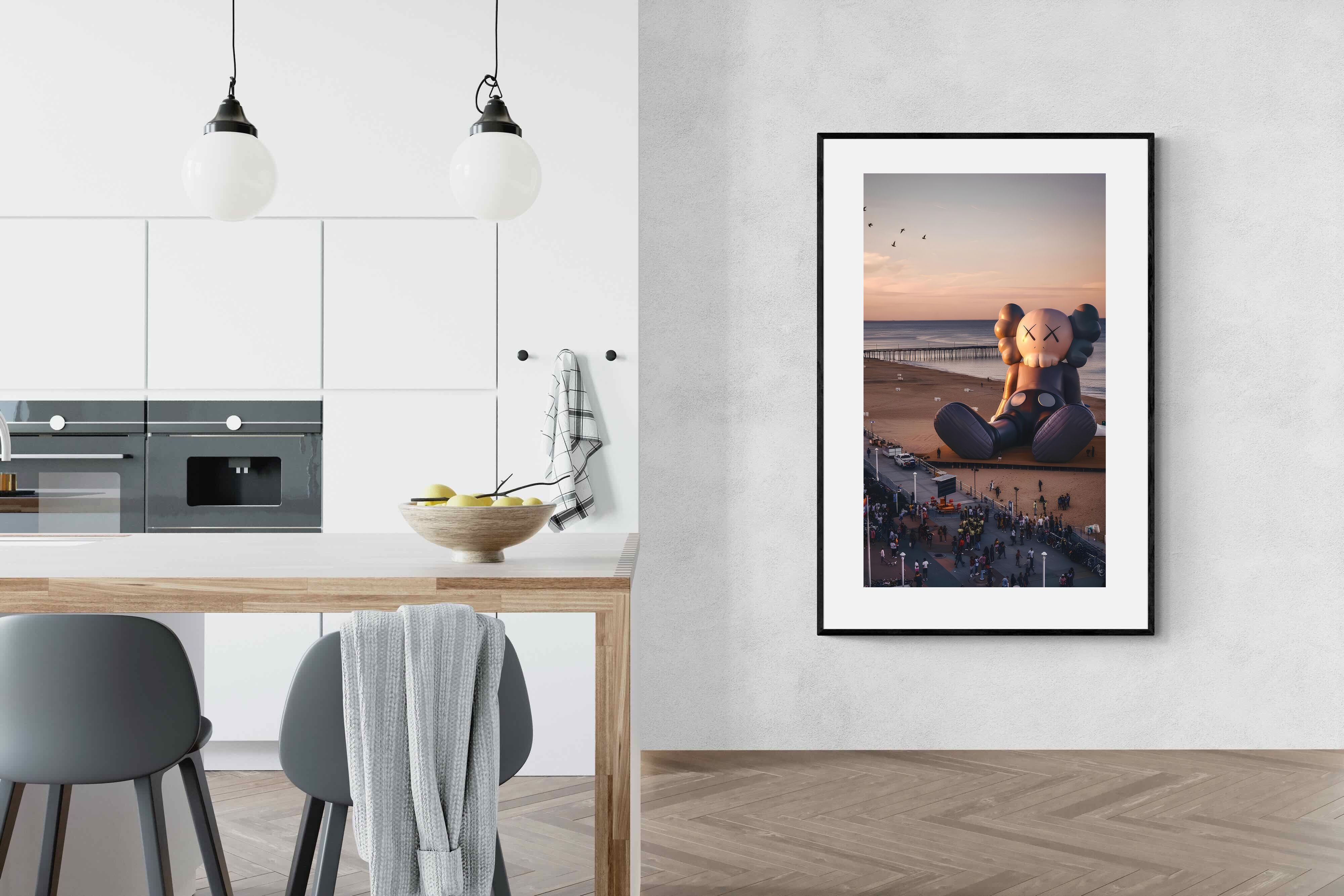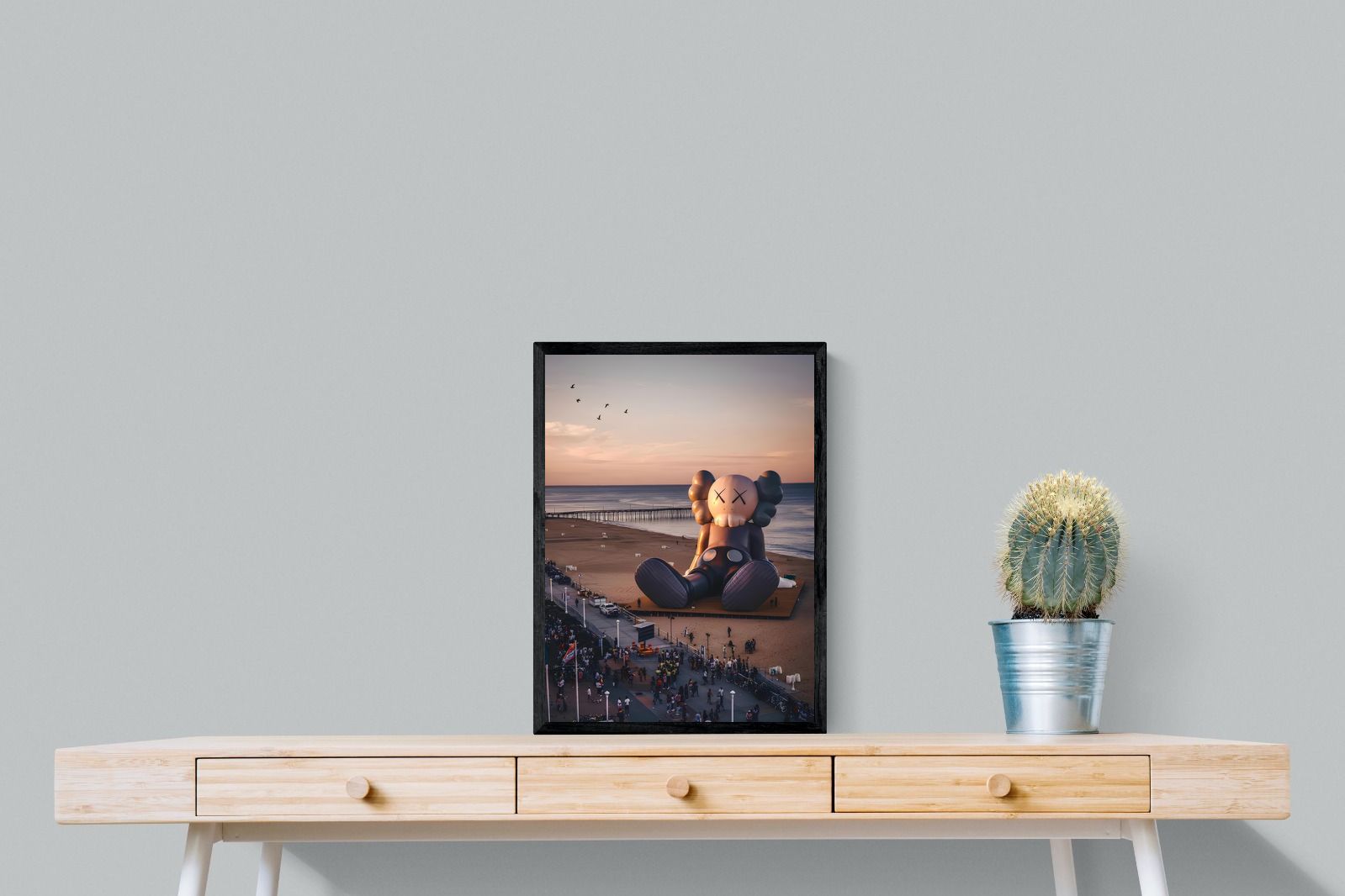This KAWS wall art features a massive "Companion" figure resting on a beach, overlooking the sea at sunset. The warm tones of the sky and the figure's relaxed pose create a tranquil yet playful atmosphere. In a contemporary home, this piece would be a striking conversation starter, blending urban art with serene coastal vibes. Its modern aesthetic adds a bold, iconic touch to any space.