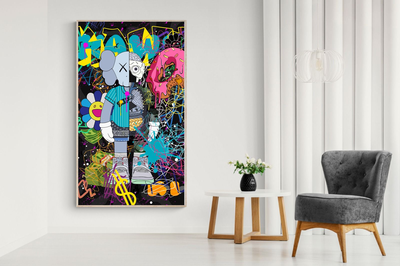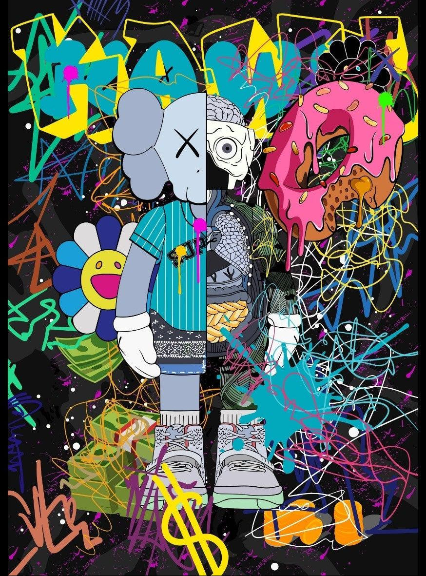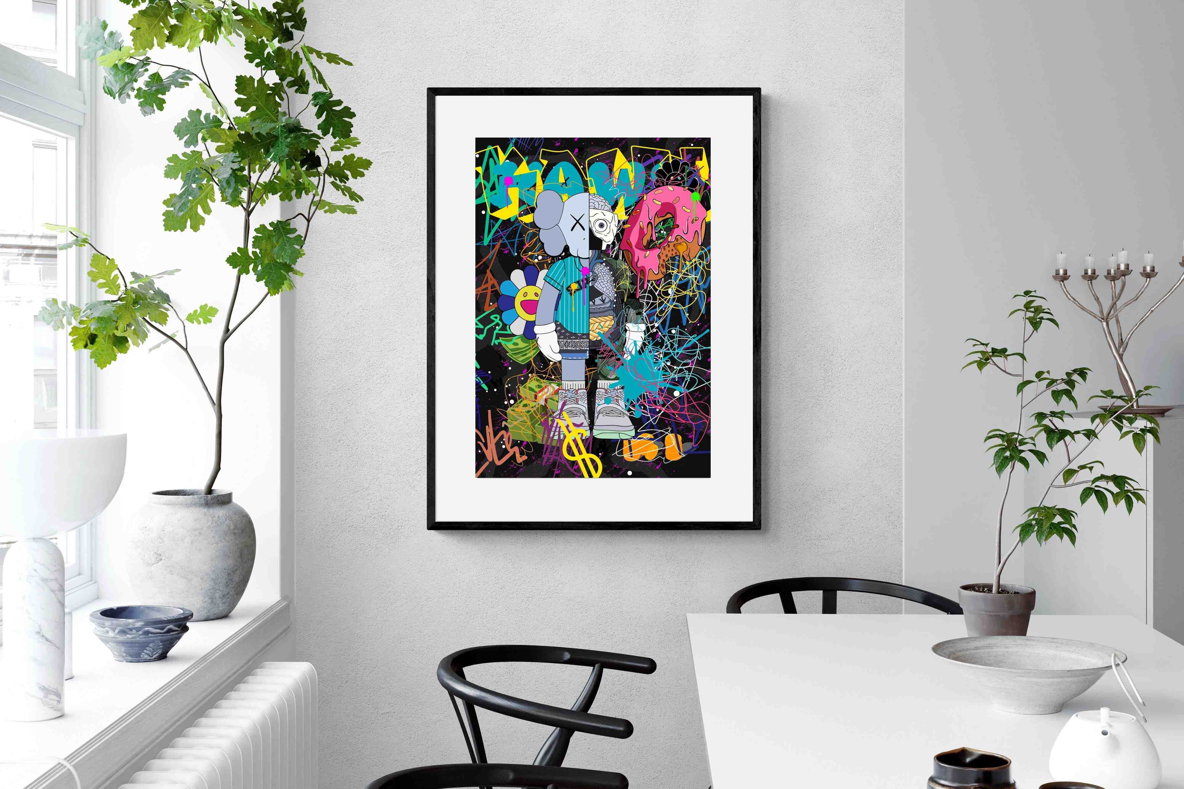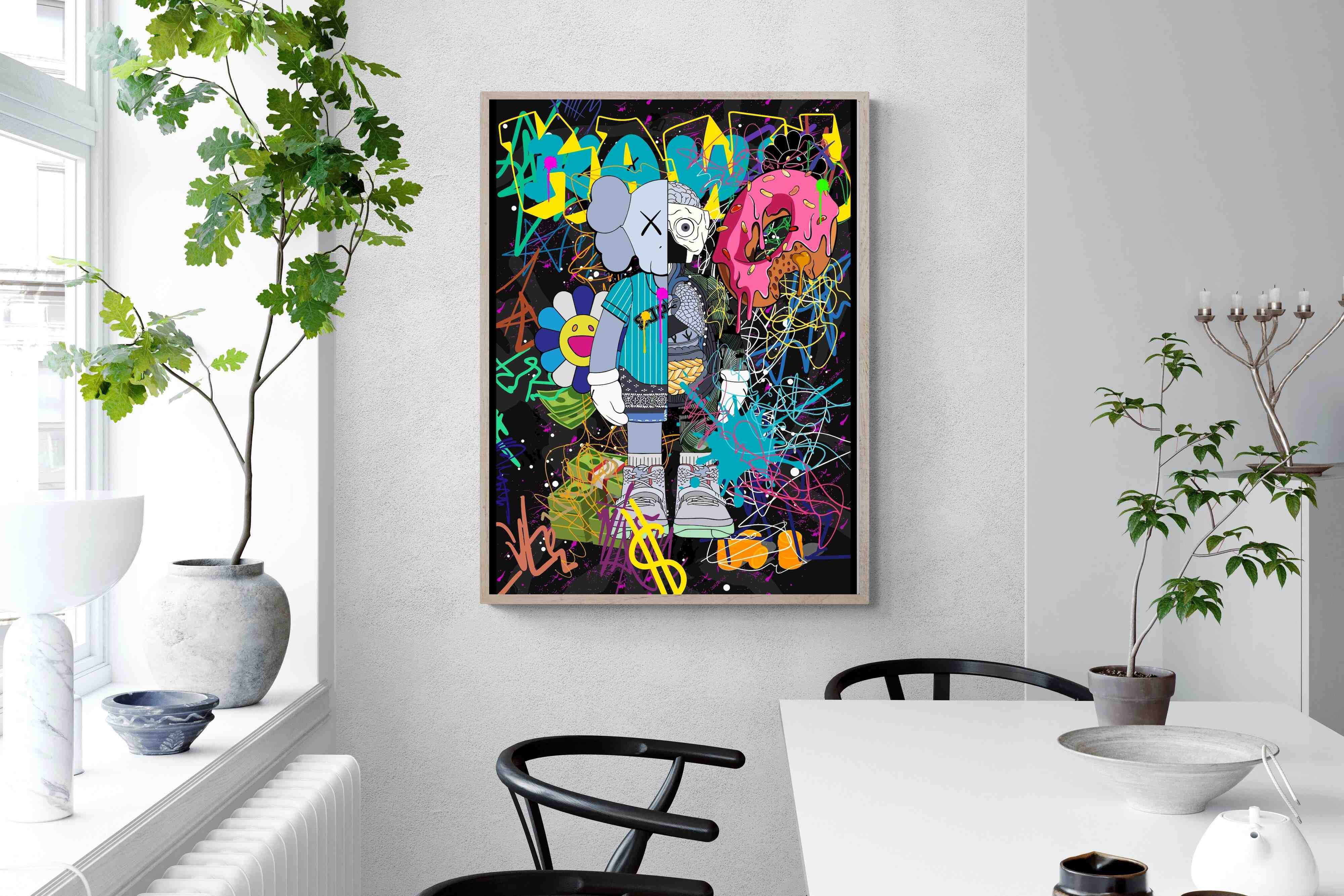 Delve into a whirlwind of colour and creativity with "Street Art KAWS". This piece exudes an electric energy that captures the essence of contemporary street art. Dominated by wild brush strokes, graffiti elements, and vibrant splatters, this artwork makes a bold statement in any space it adorns.