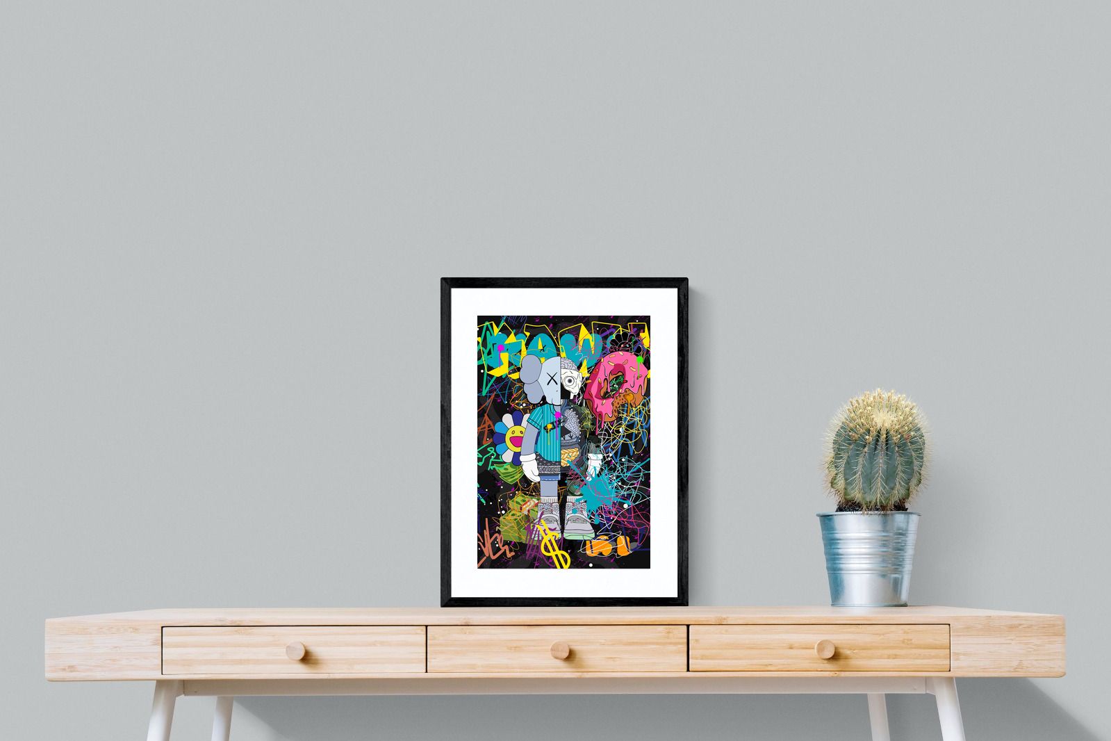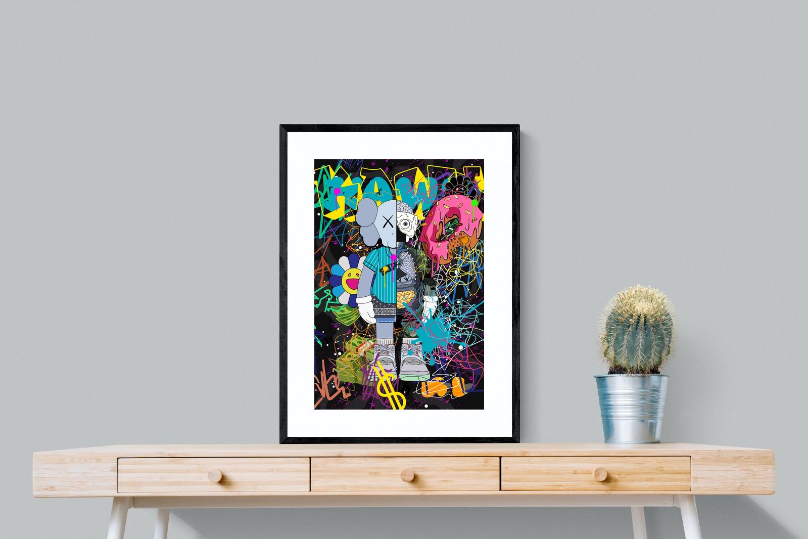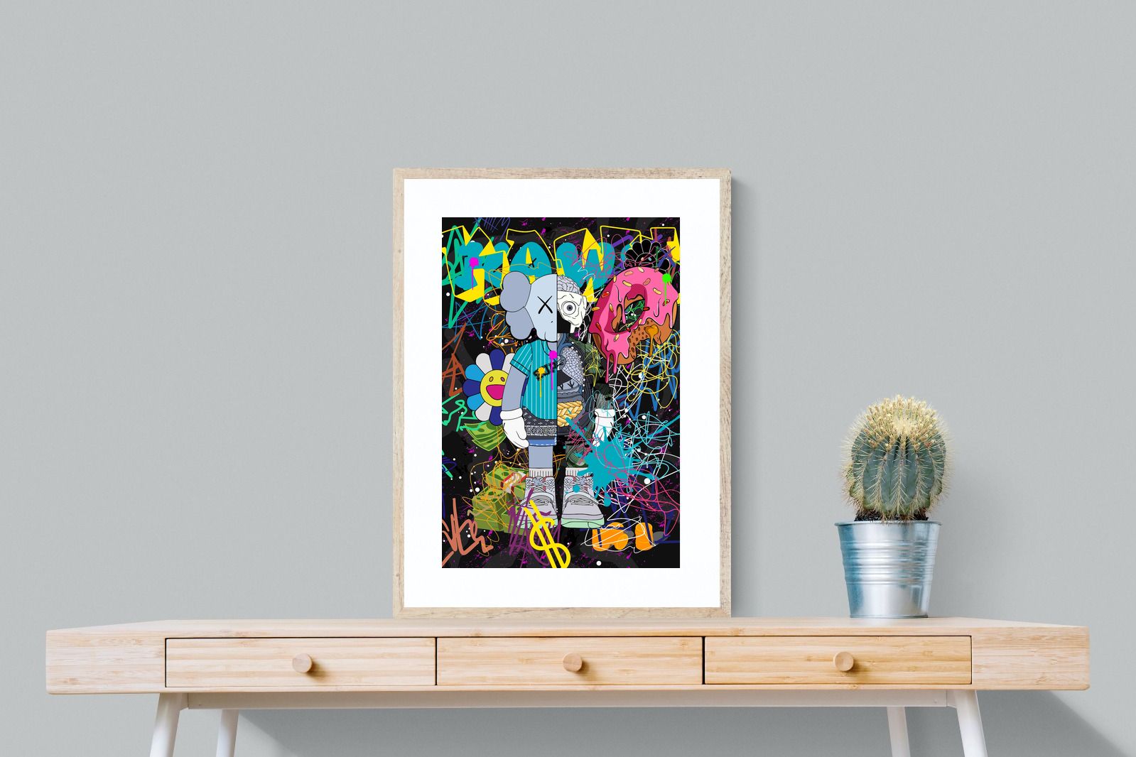 Delve into a whirlwind of colour and creativity with "Street Art KAWS". This piece exudes an electric energy that captures the essence of contemporary street art. Dominated by wild brush strokes, graffiti elements, and vibrant splatters, this artwork makes a bold statement in any space it adorns.