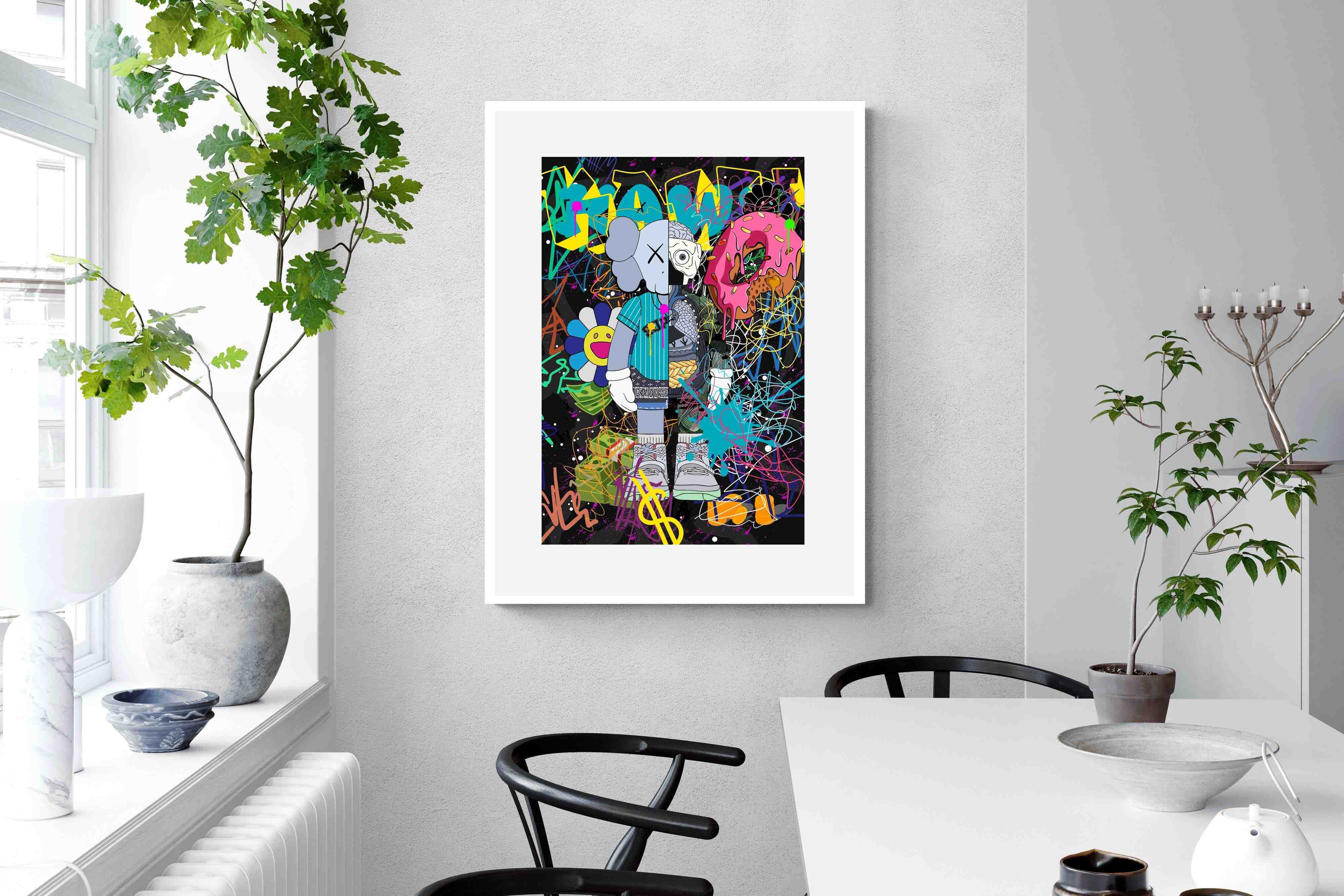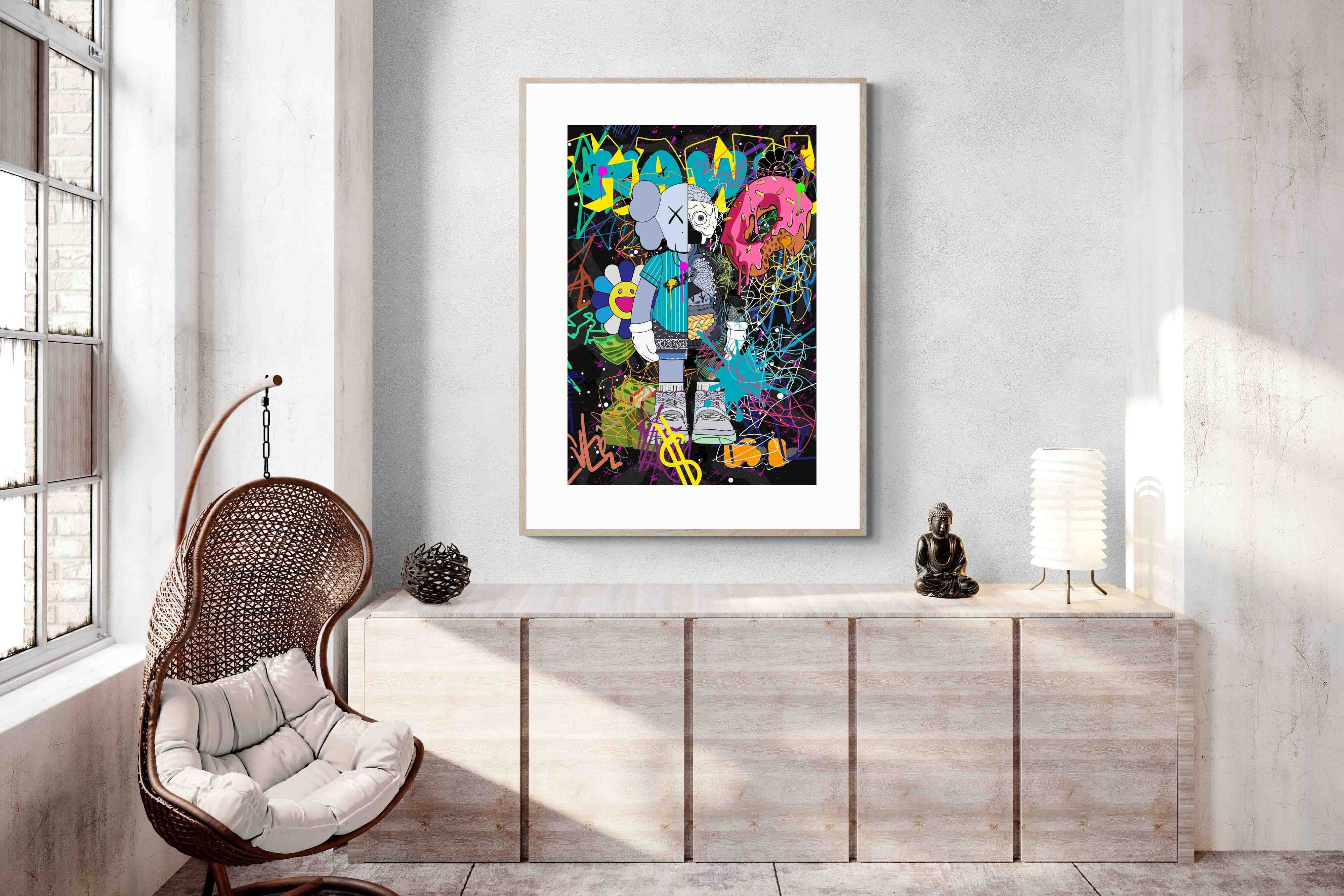 Representative of the vibrancy and unpredictability of urban life, this artwork encapsulates the spirit of modern-day expression. Every element, from the dripping donut to the energetic scribbles, tells a story of rebellion, freedom, and individuality. The colourful backdrop juxtaposed against the central figure's calm demeanor invites viewers to reflect on the balance between external chaos and inner peace.