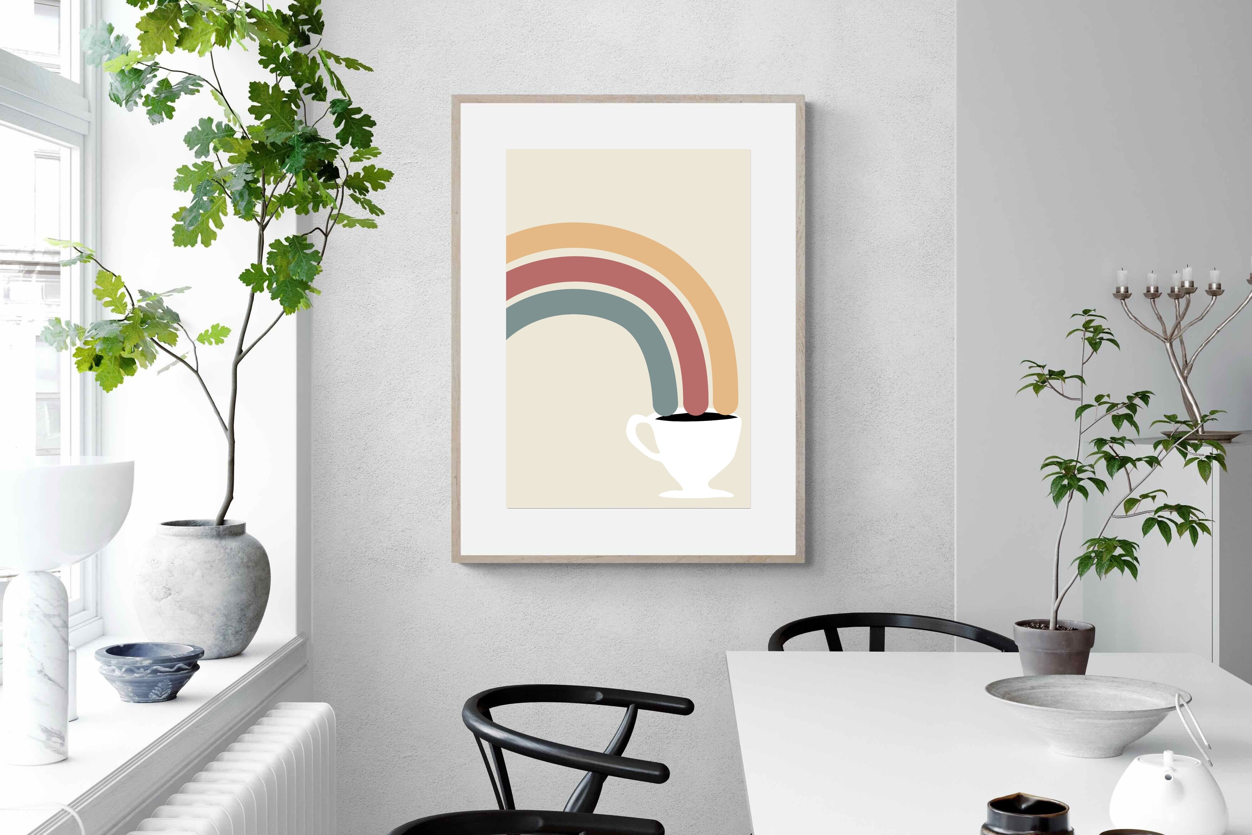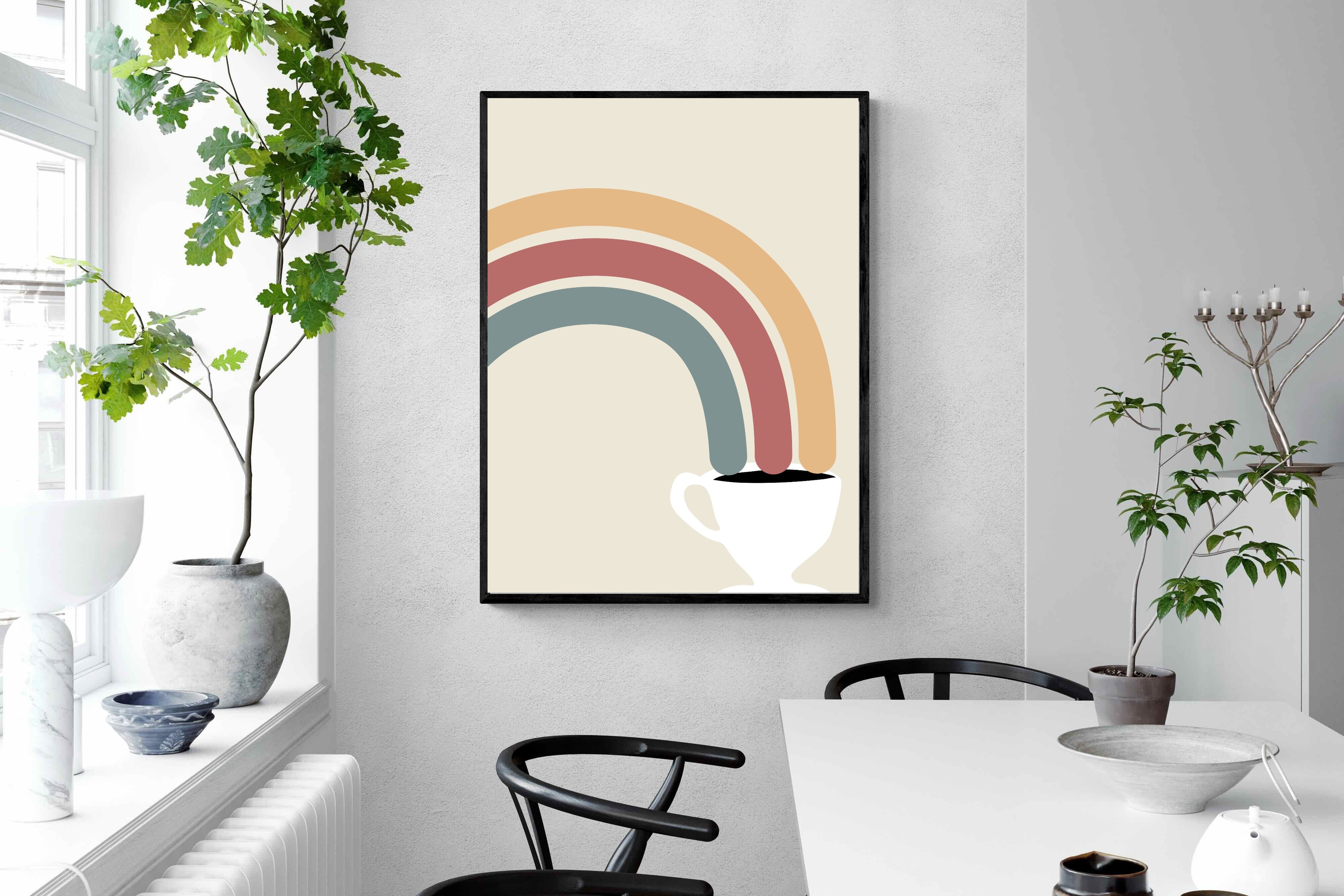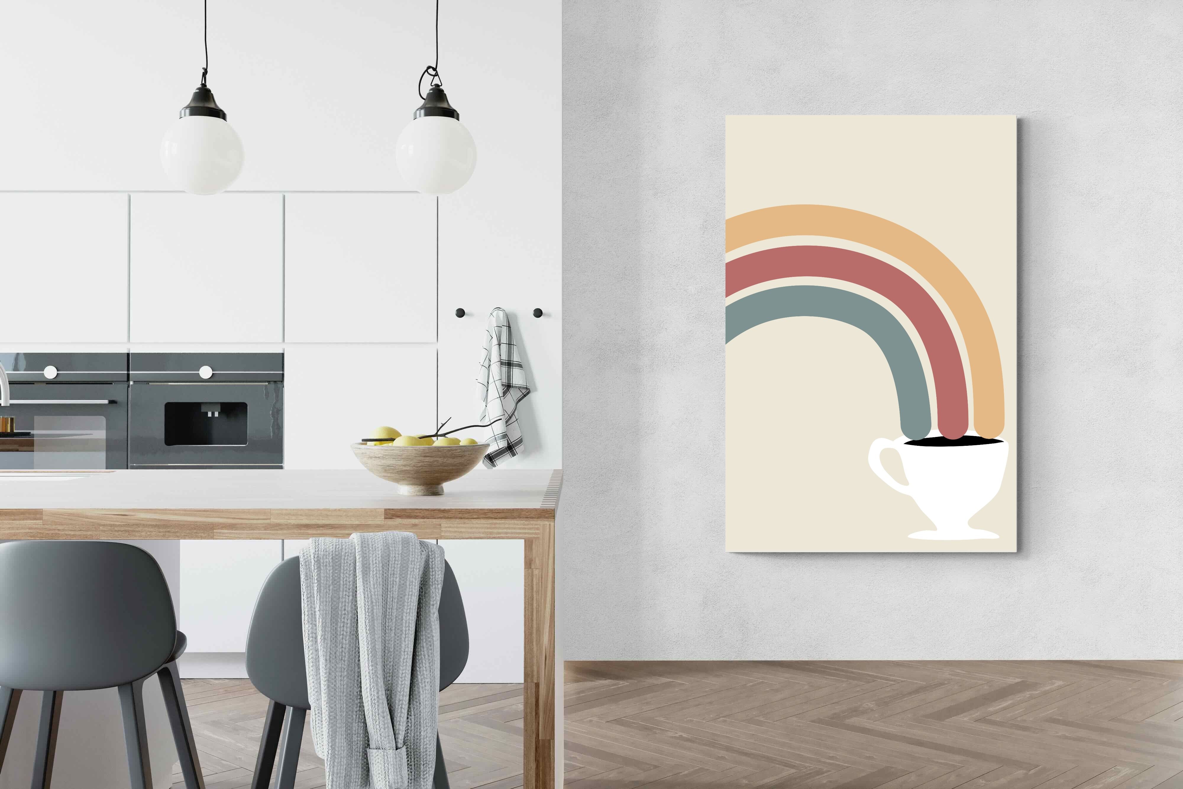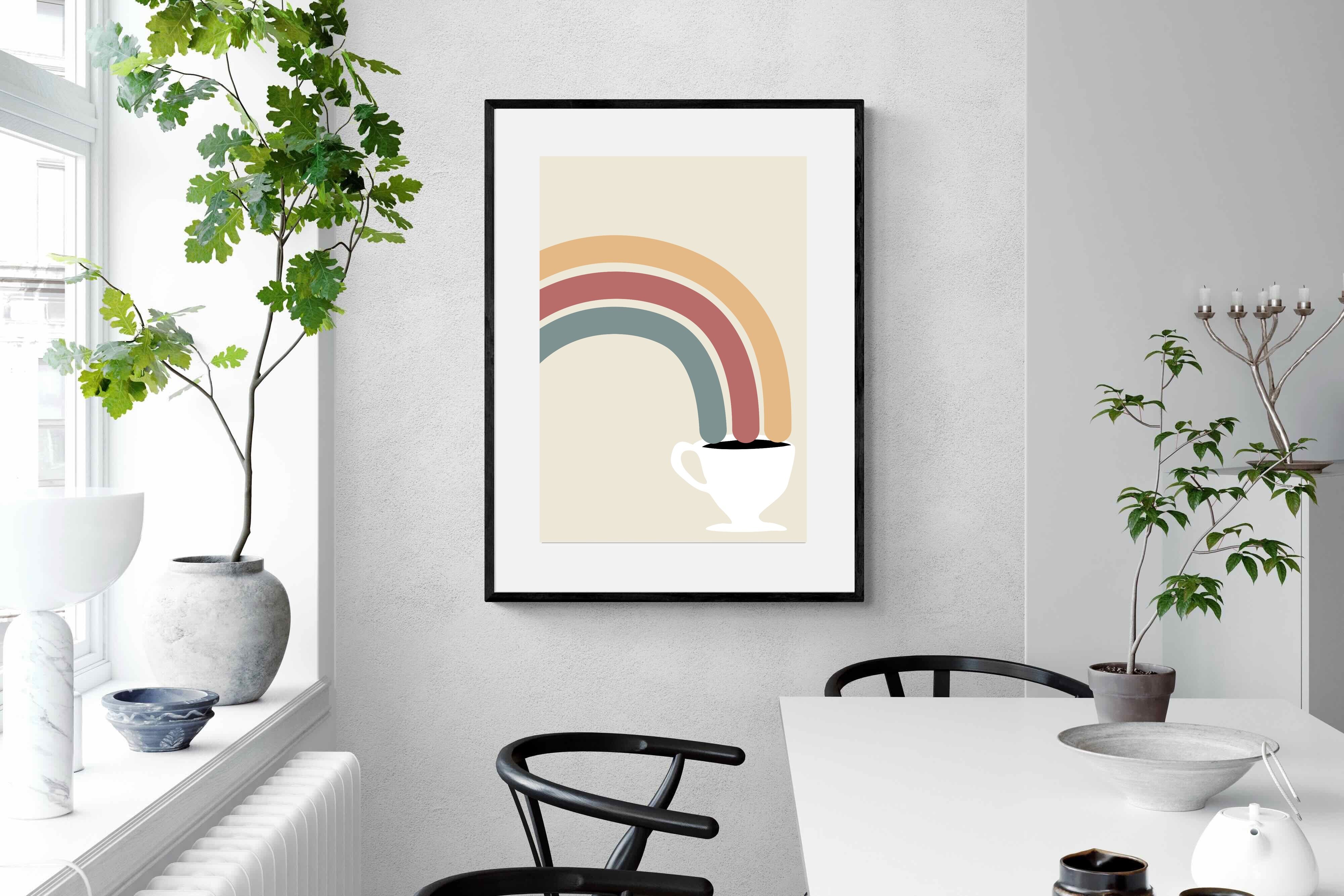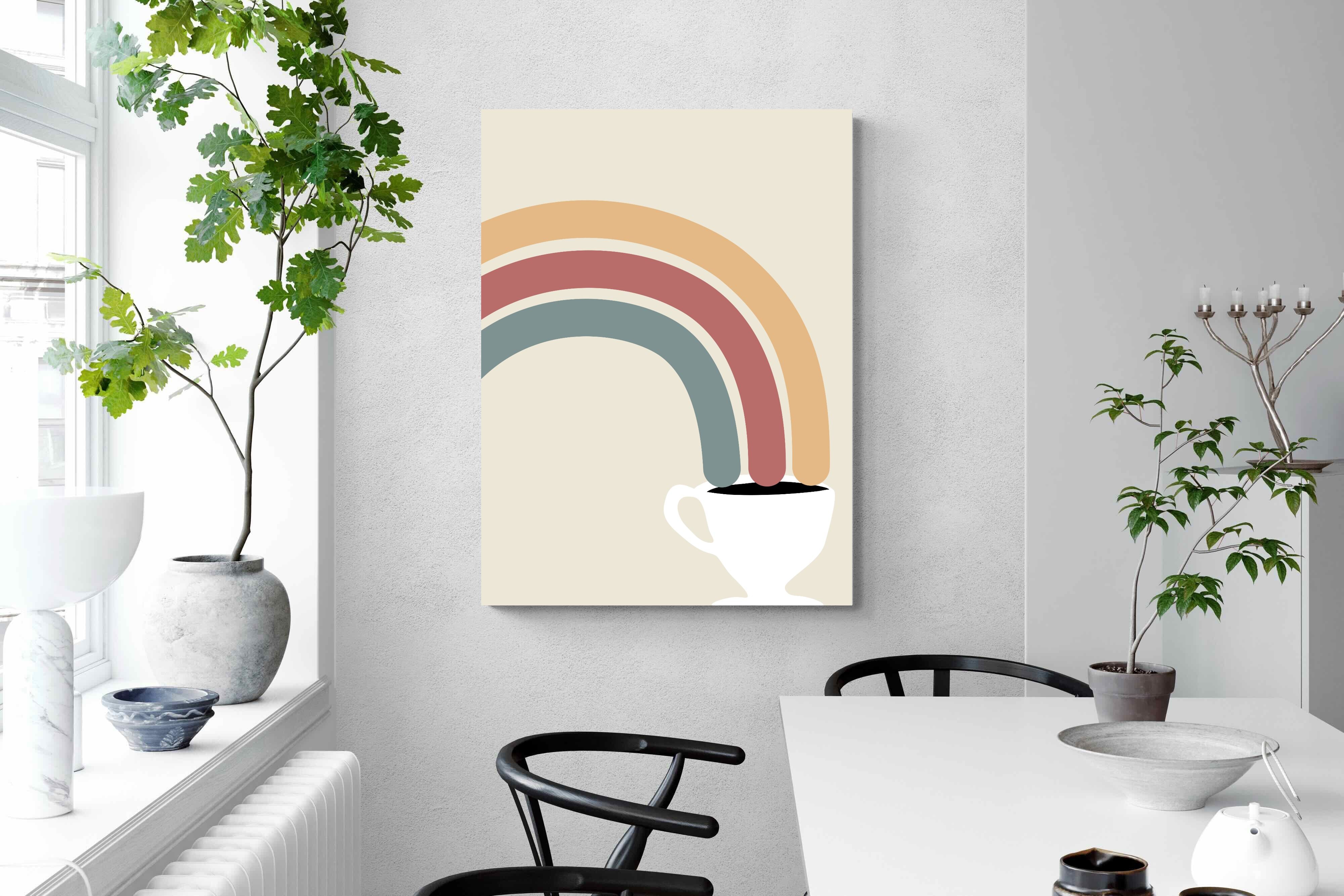 This playful and modern artwork blends the simplicity of a steaming cup of coffee with the vibrant arcs of a rainbow, merging two sources of morning joy. The muted pastel tones add a soft, calming effect while maintaining a lively spirit. Ideal for kitchens or dining areas, this piece brings a touch of whimsy and a burst of colour to any contemporary home. Its minimalist design and cheerful theme make it a delightful addition to spaces that appreciate both style and fun.