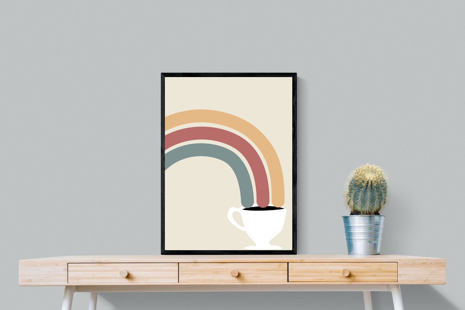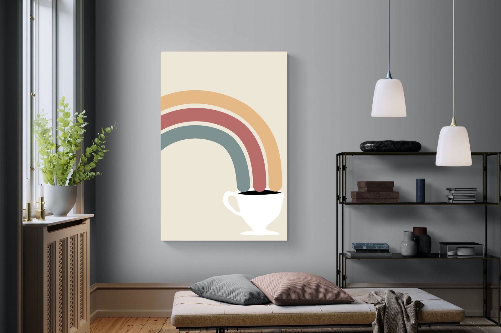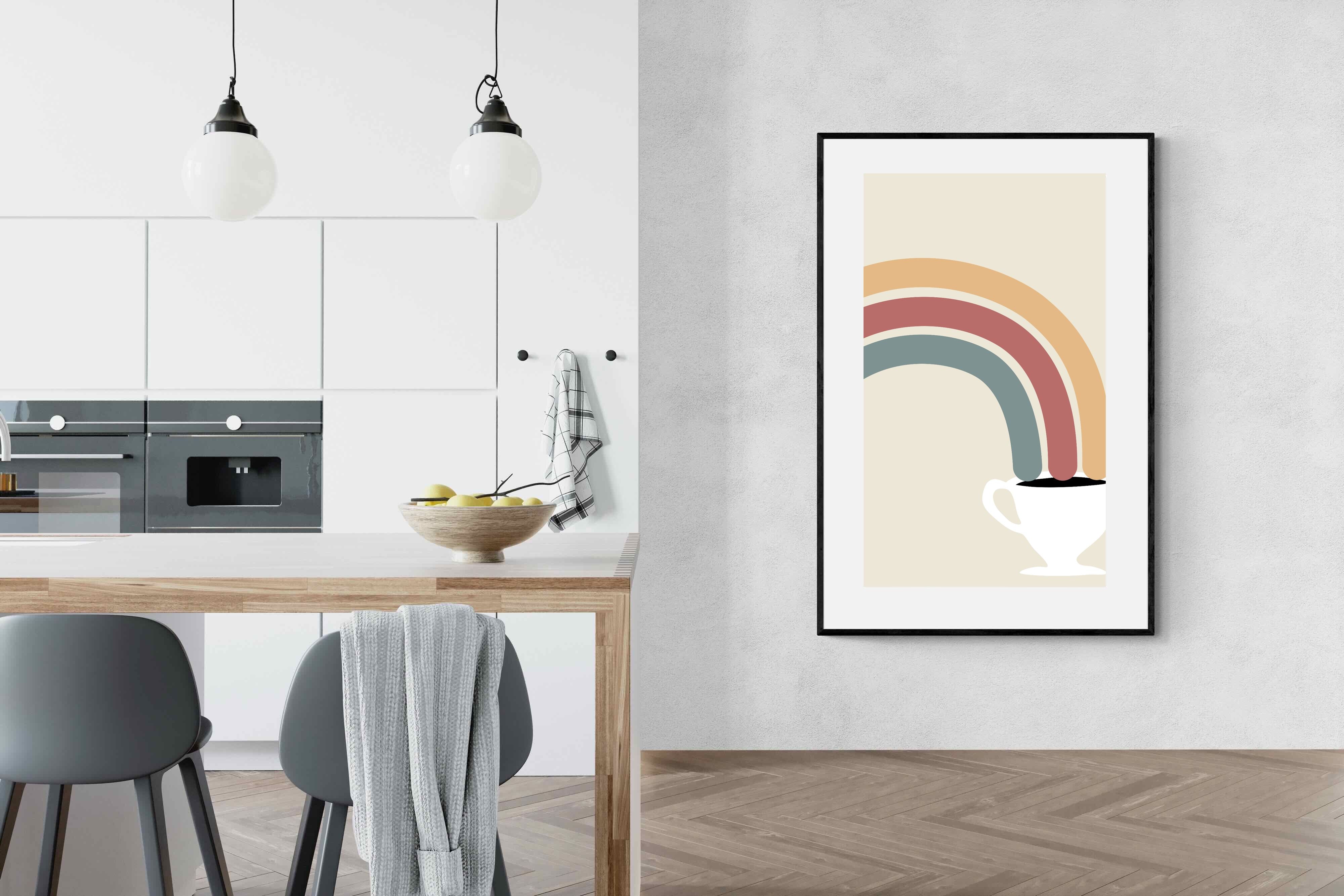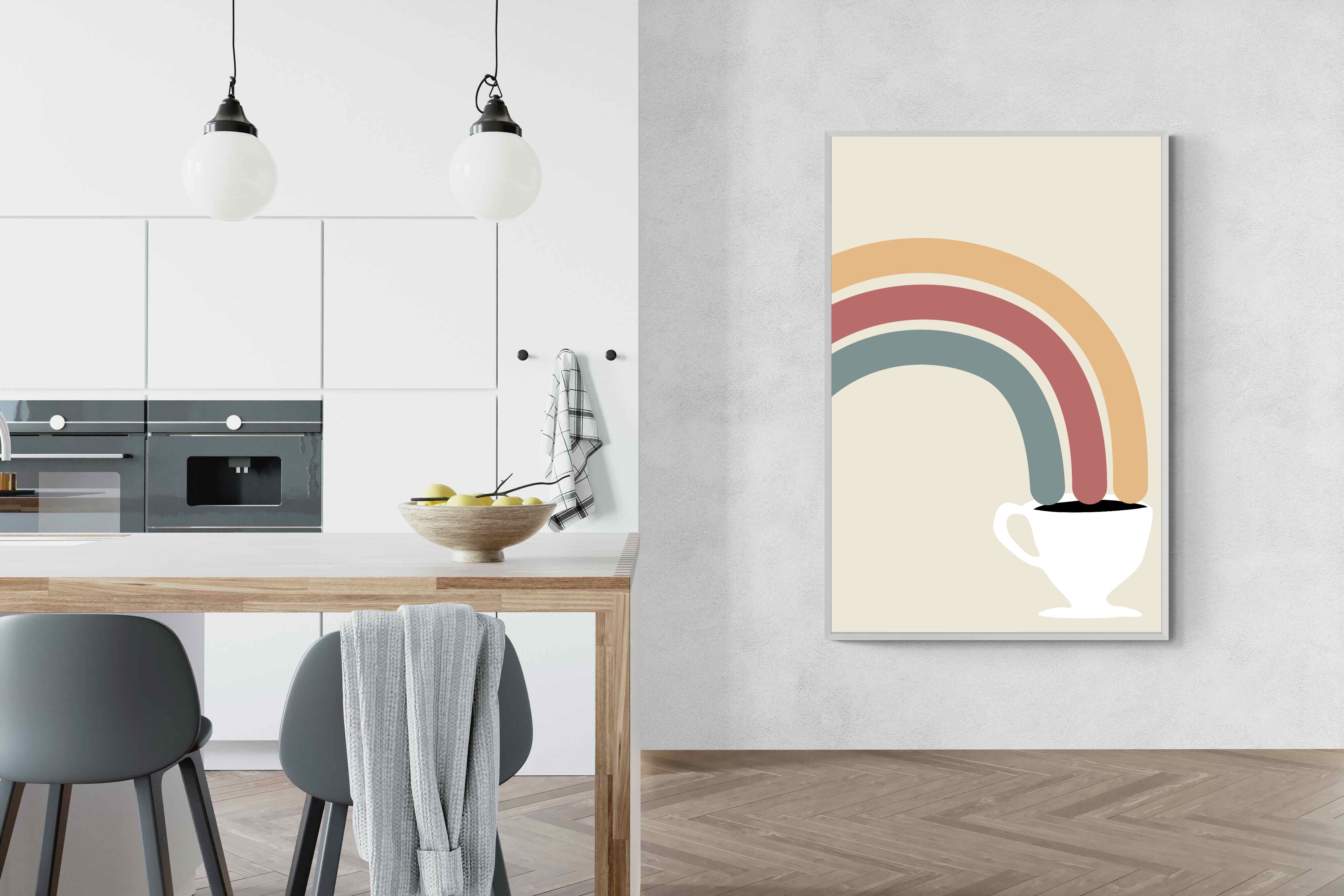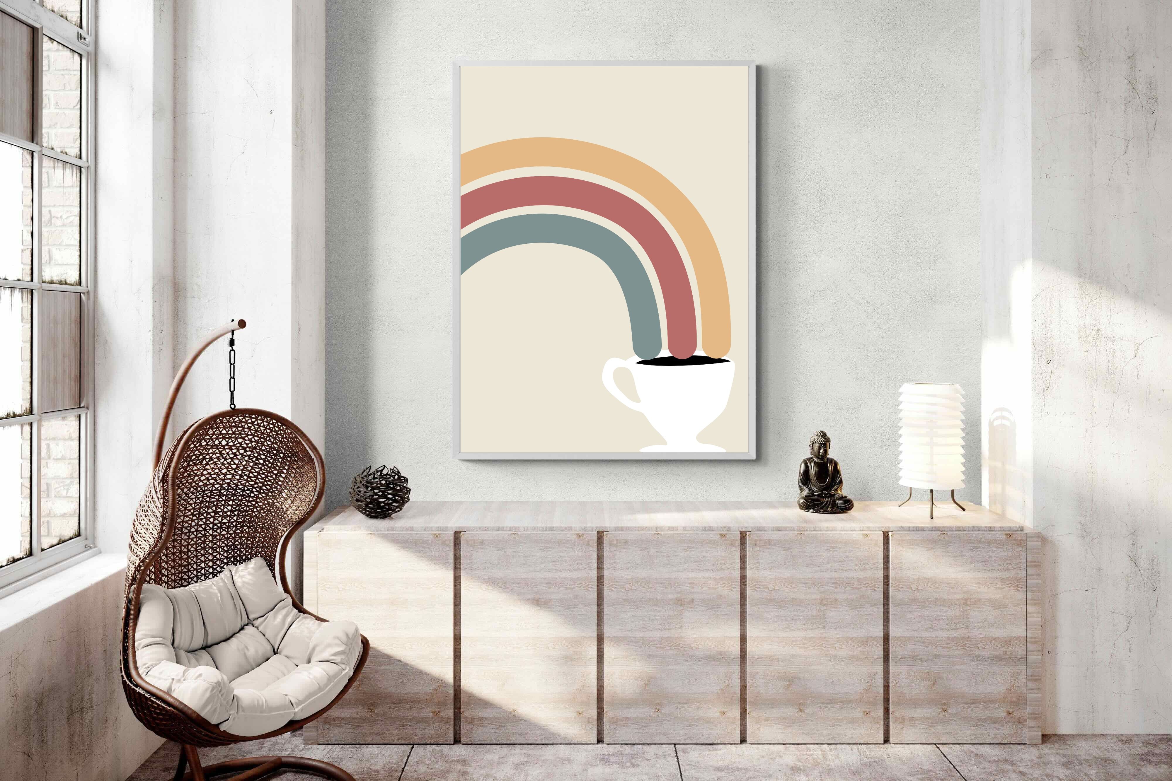 This playful and modern artwork blends the simplicity of a steaming cup of coffee with the vibrant arcs of a rainbow, merging two sources of morning joy. The muted pastel tones add a soft, calming effect while maintaining a lively spirit. Ideal for kitchens or dining areas, this piece brings a touch of whimsy and a burst of colour to any contemporary home. Its minimalist design and cheerful theme make it a delightful addition to spaces that appreciate both style and fun.
