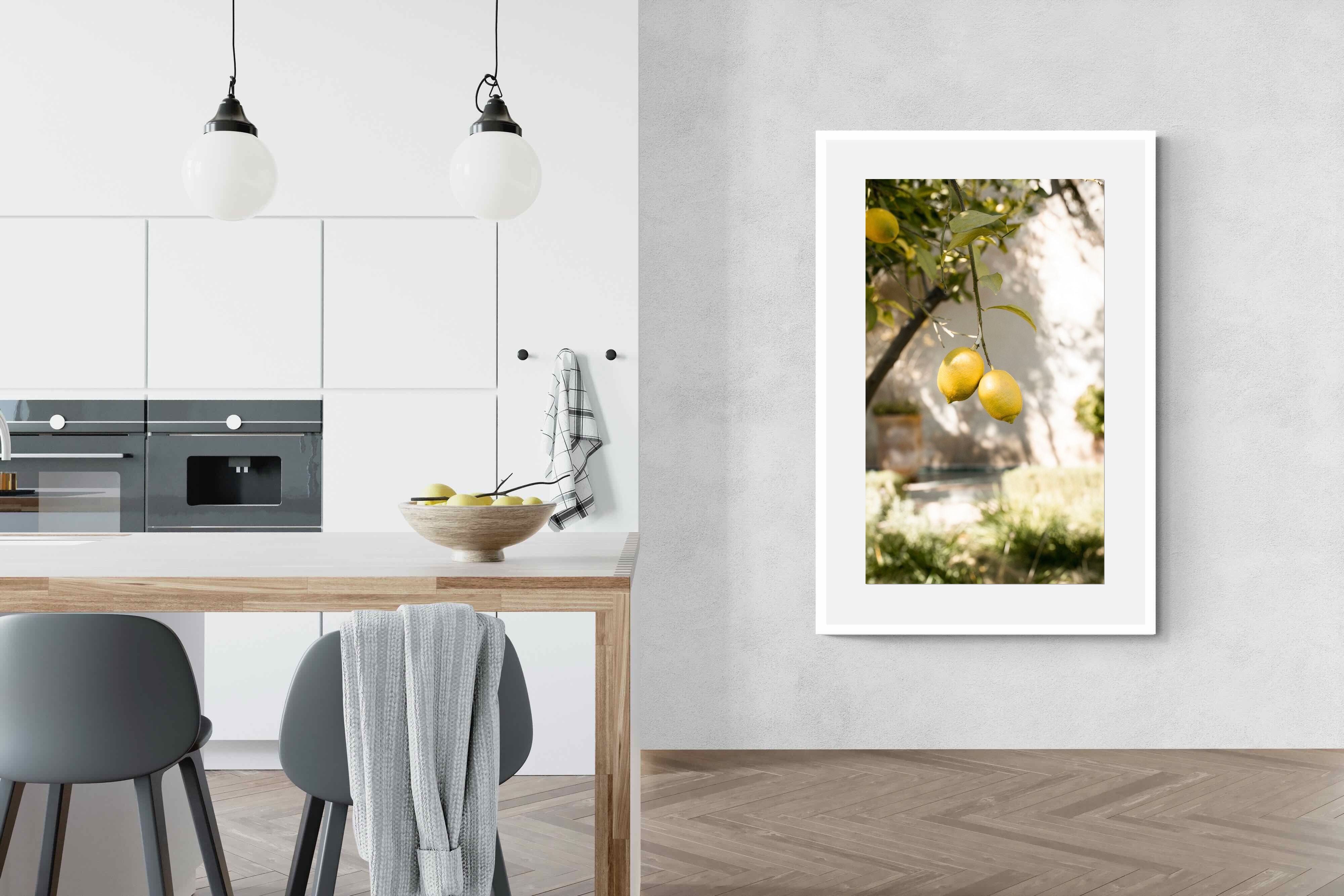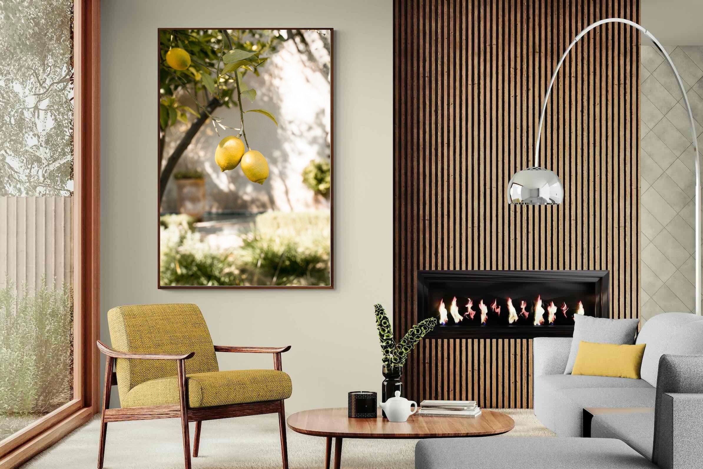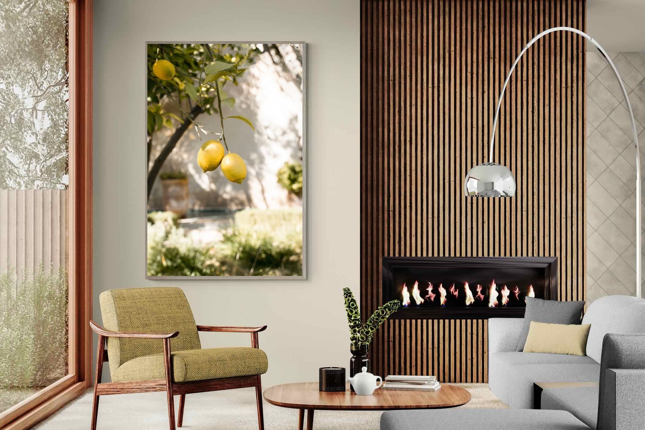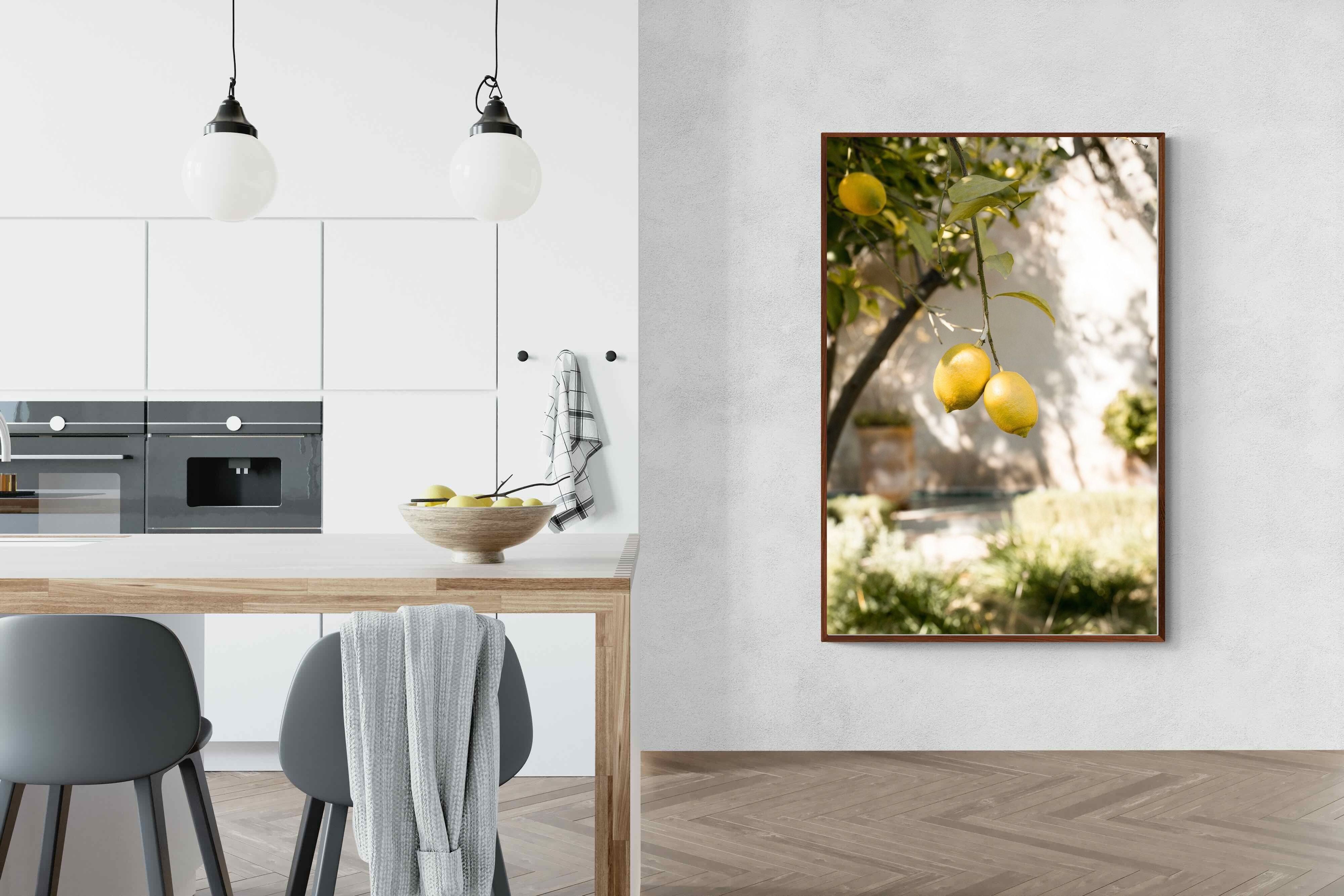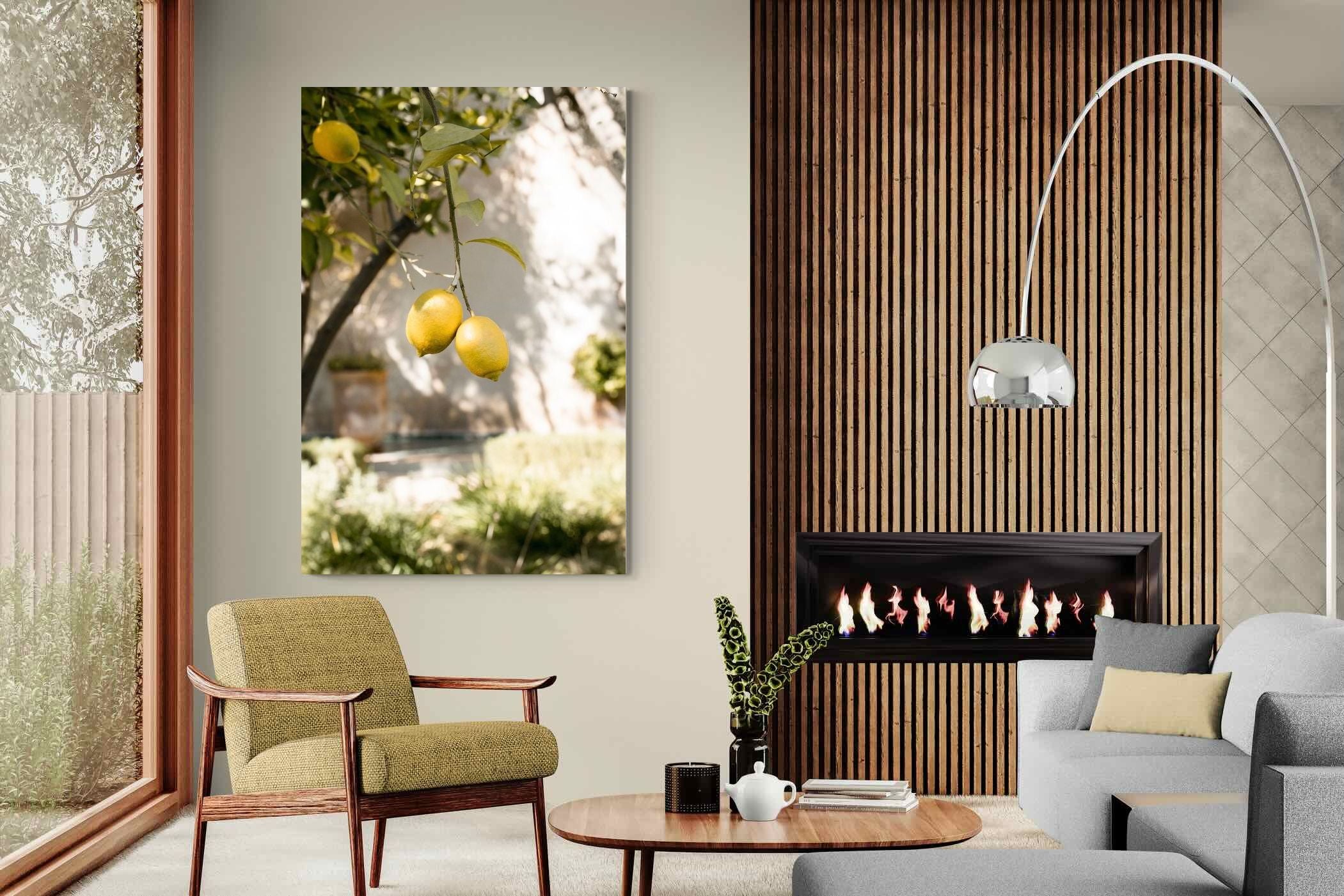 Golden lemons hang from slender branches against a softly blurred Mediterranean garden backdrop. Warm sunlight enhances the vibrant citrus tones while muted plaster walls add balance and depth. The composition feels fresh yet refined, capturing the essence of southern European living. Ideal for kitchens, dining areas or coastal-inspired interiors, this artwork introduces colour, warmth and timeless Mediterranean character.