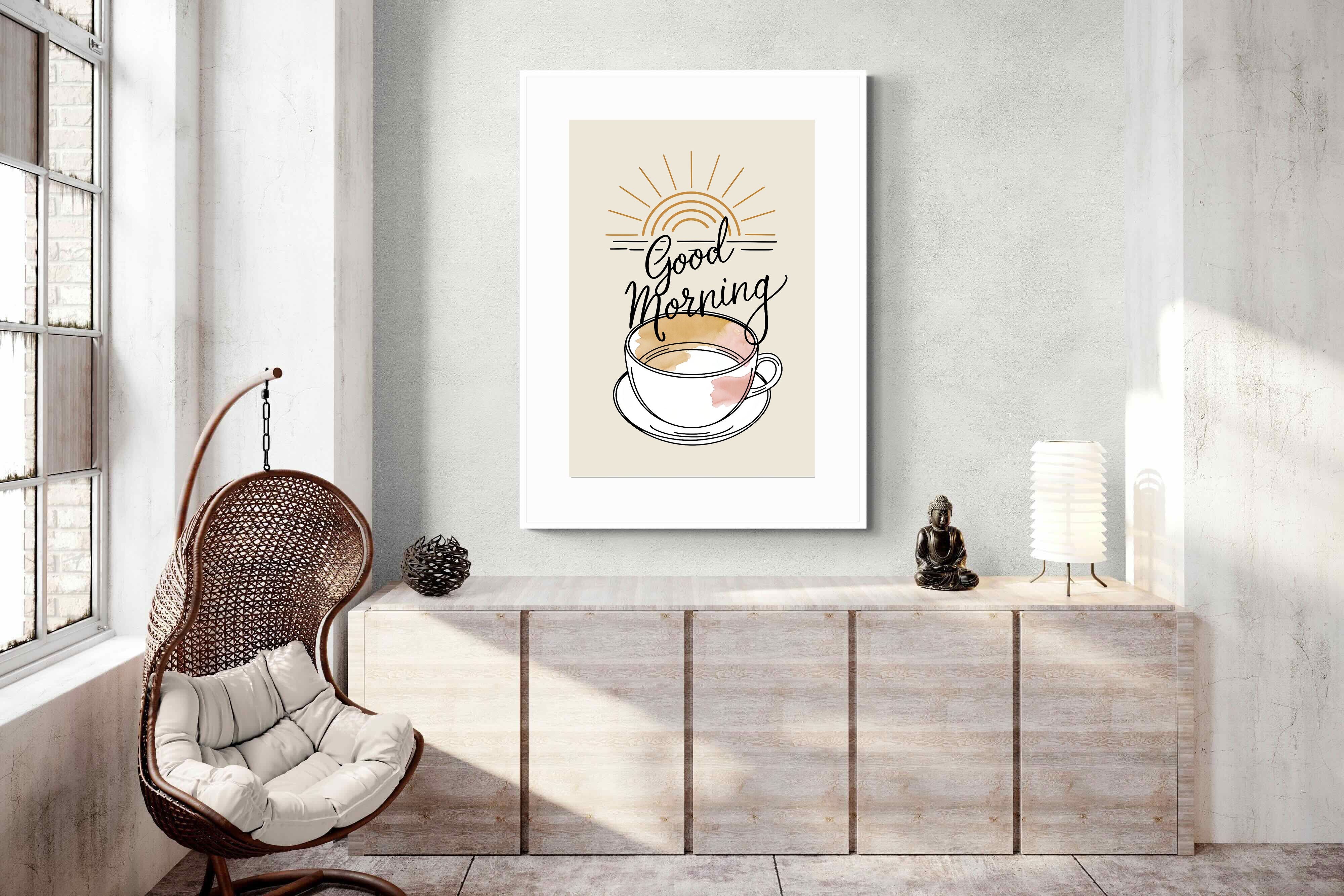 This cheerful artwork radiates the warmth and positivity of a perfect morning. The illustration of a steaming cup of coffee, complemented by a rising sun and a welcoming message, captures the serene start of a new day. The blend of watercolour textures and delicate line work adds a touch of elegance, making it a perfect fit for kitchens or breakfast nooks. This piece brings a touch of joy and calm to any contemporary space, enhancing your morning ritual.