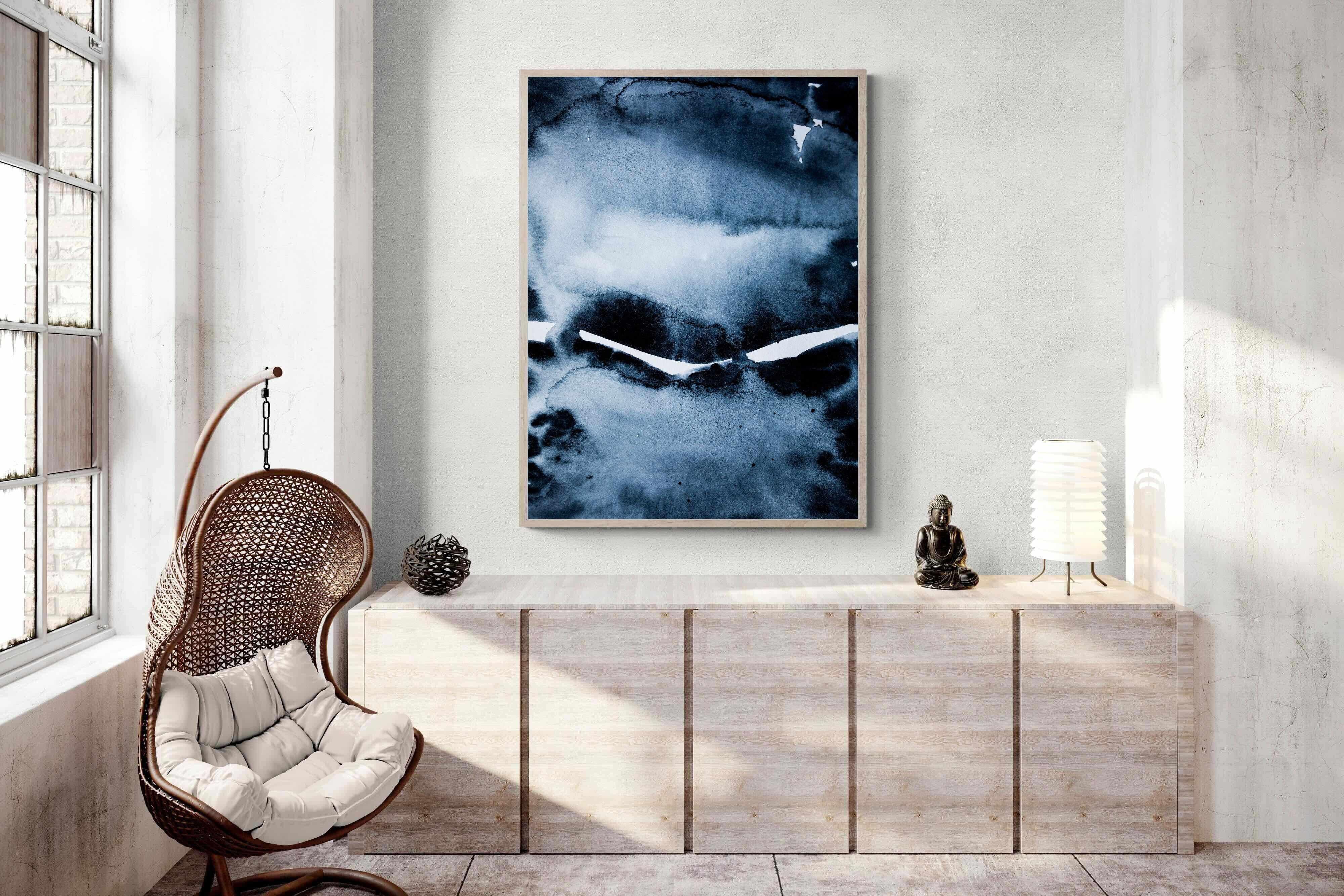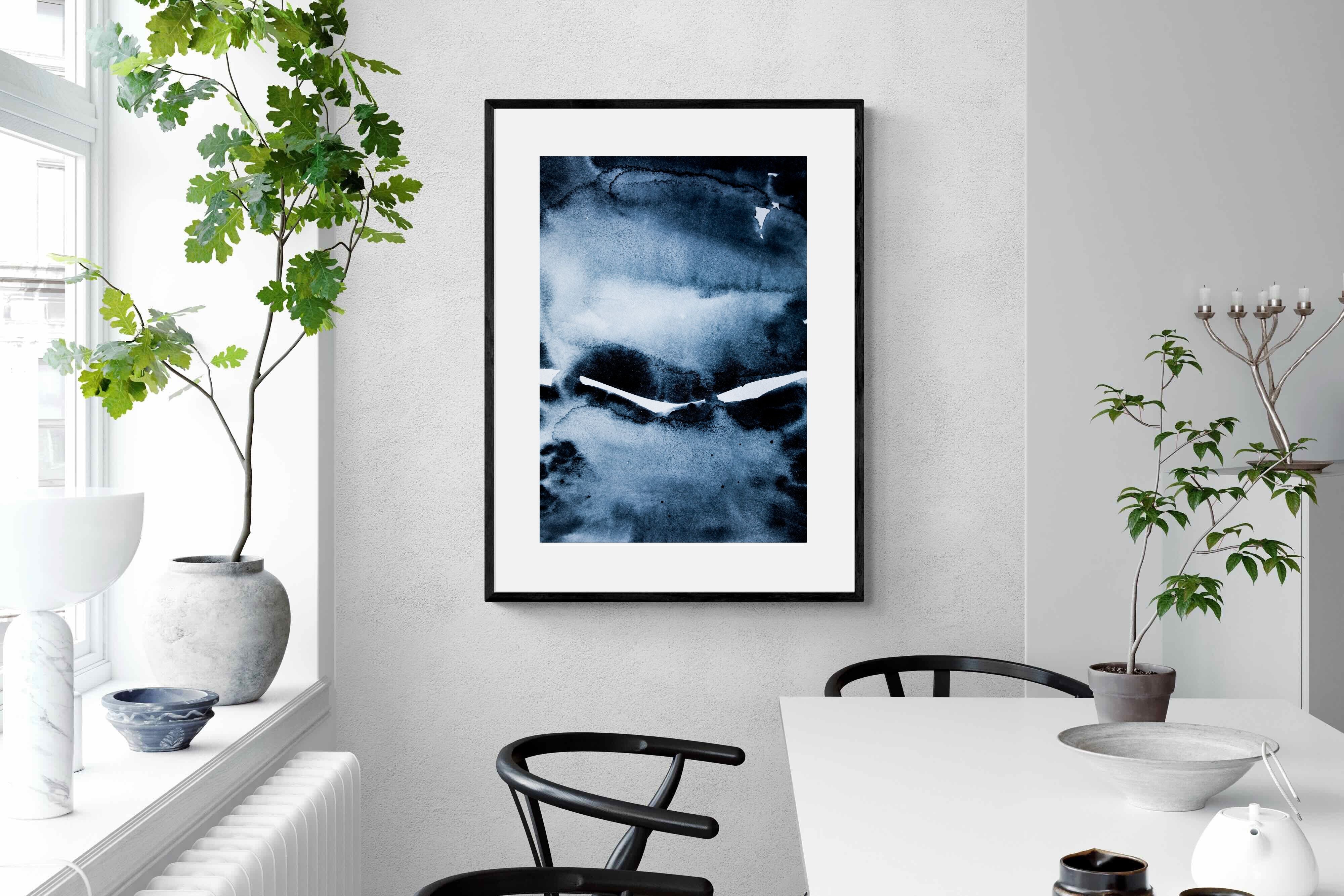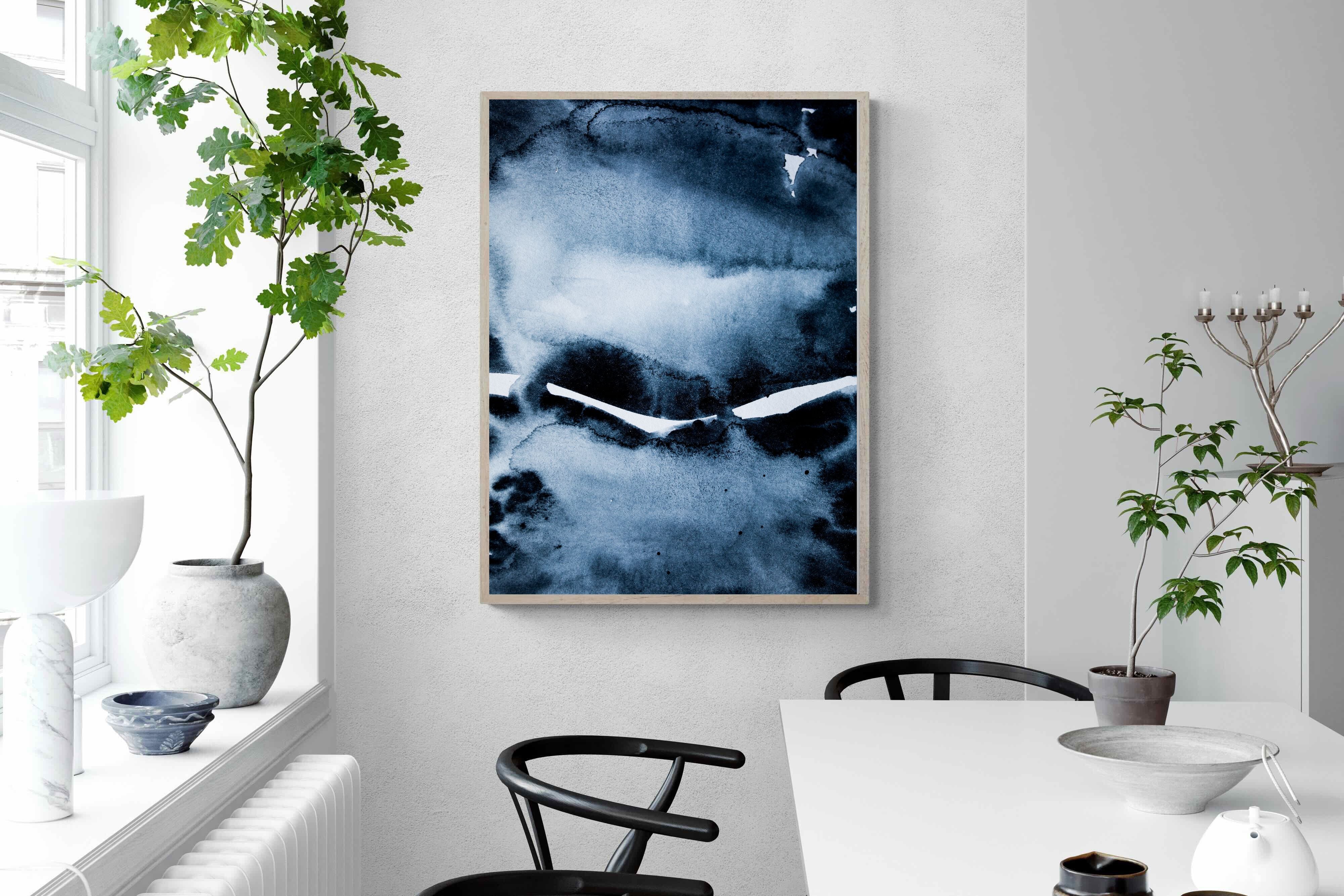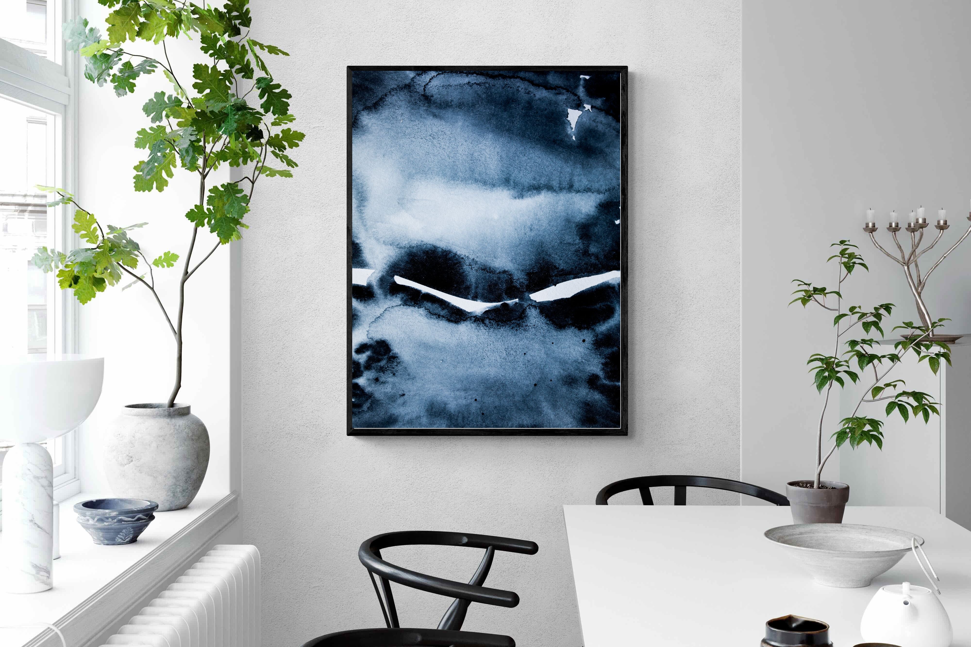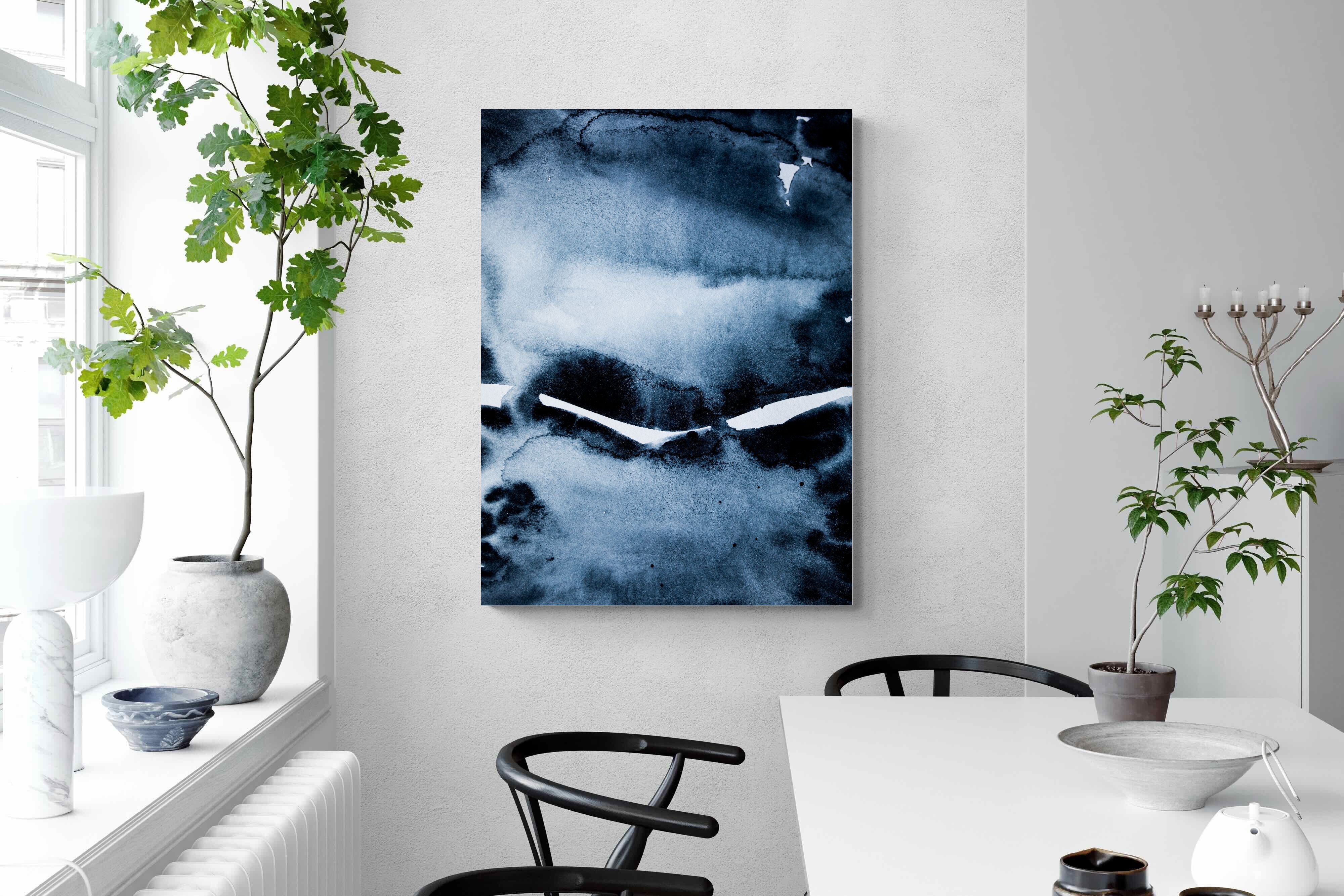 "Eclipse" features deep, inky blues with abstract shapes and gradients, evoking the mystery and beauty of a celestial event. It symbolises the interplay between light and darkness, change, and the unknown. This artwork would be an excellent choice for a contemporary home, adding a touch of intrigue and sophistication. Its rich, moody palette and abstract form create a striking visual impact, enhancing the modern aesthetic of any room.