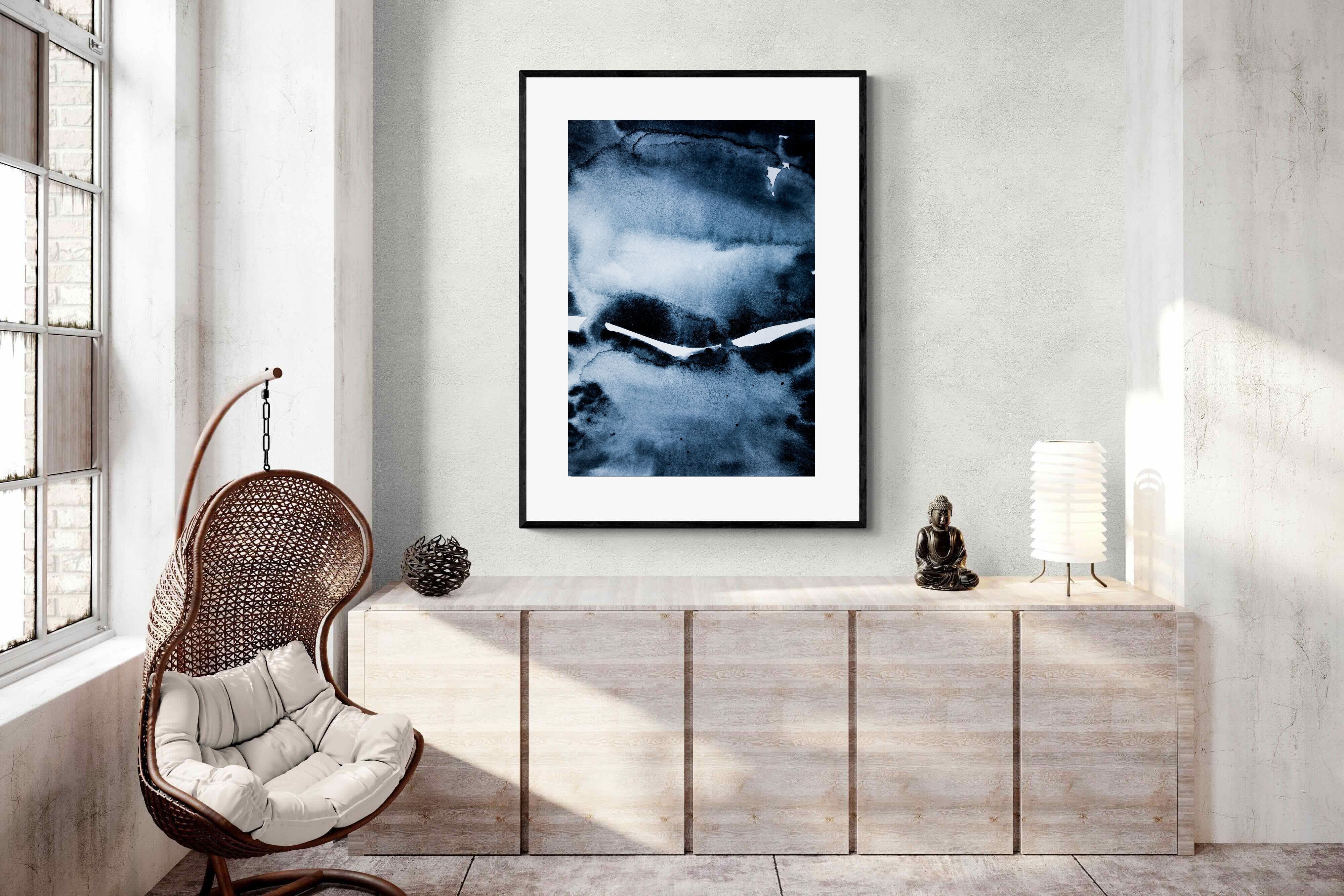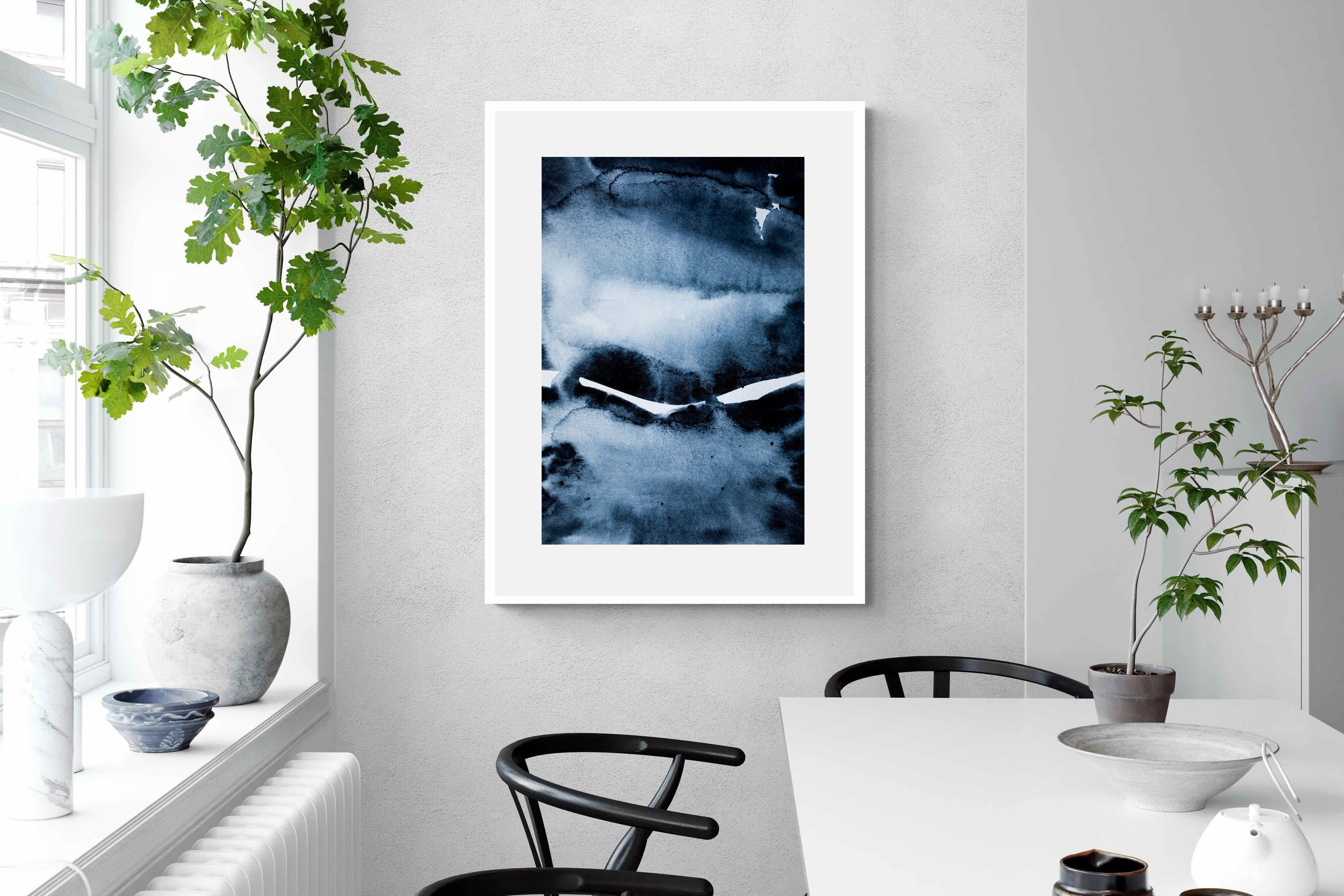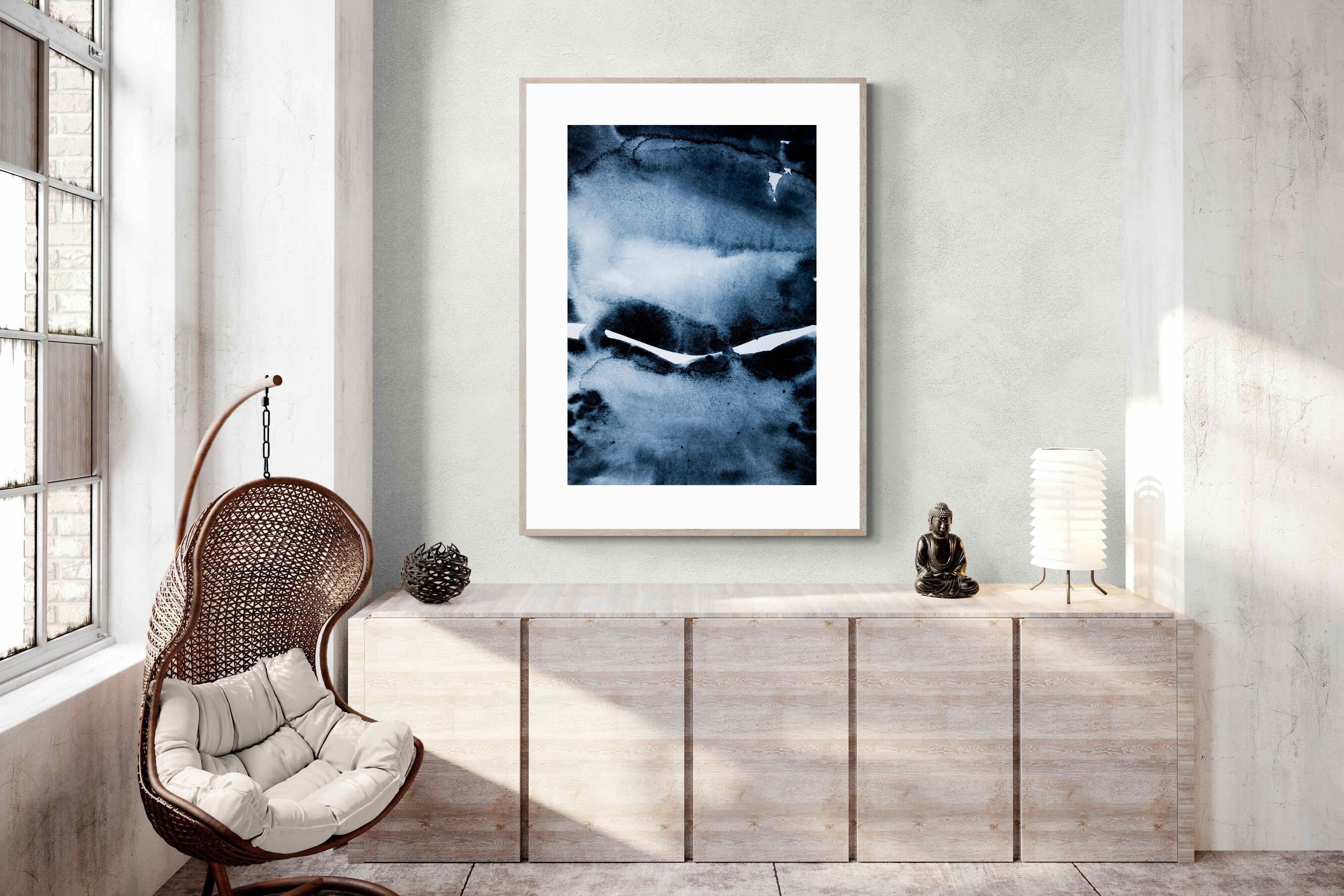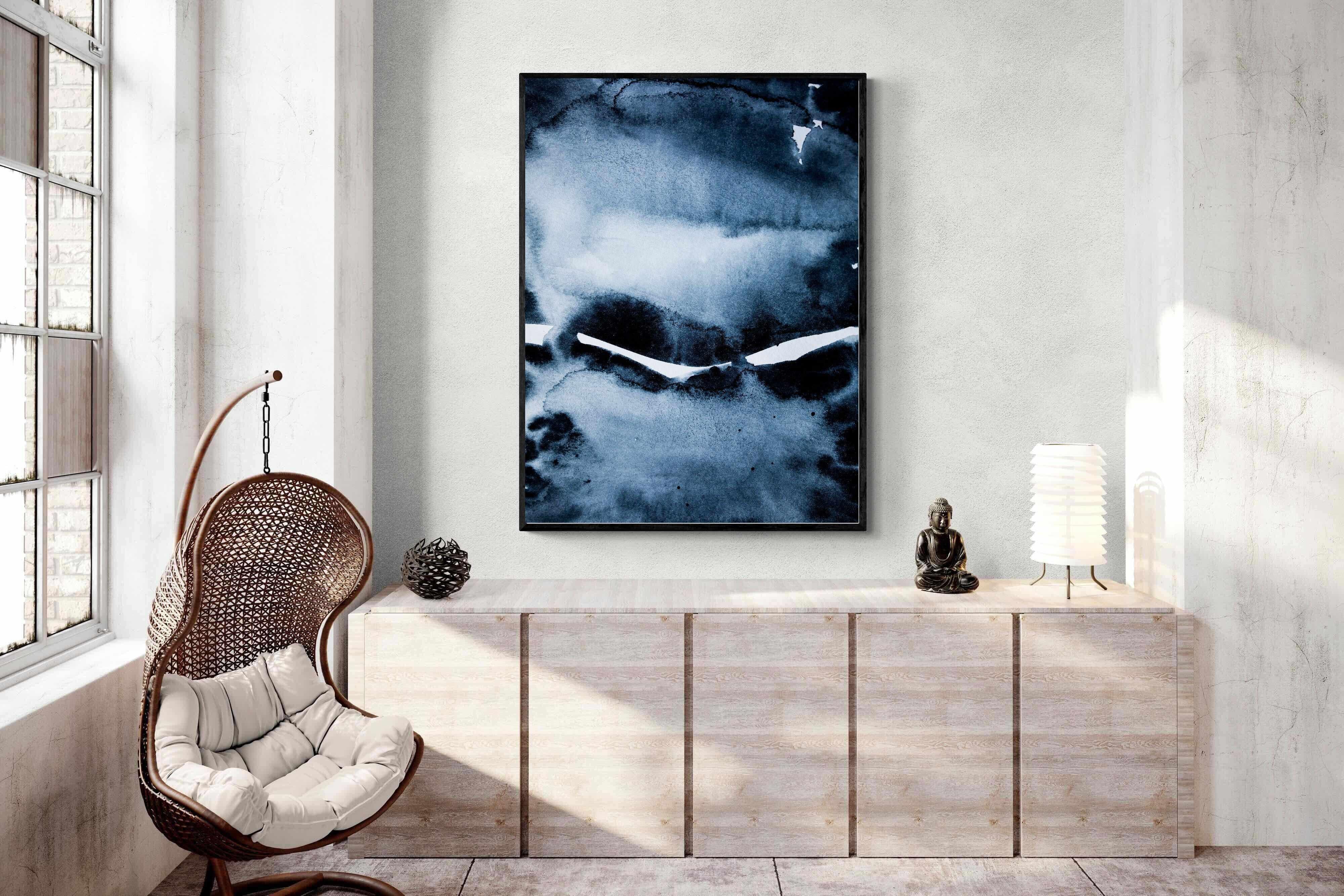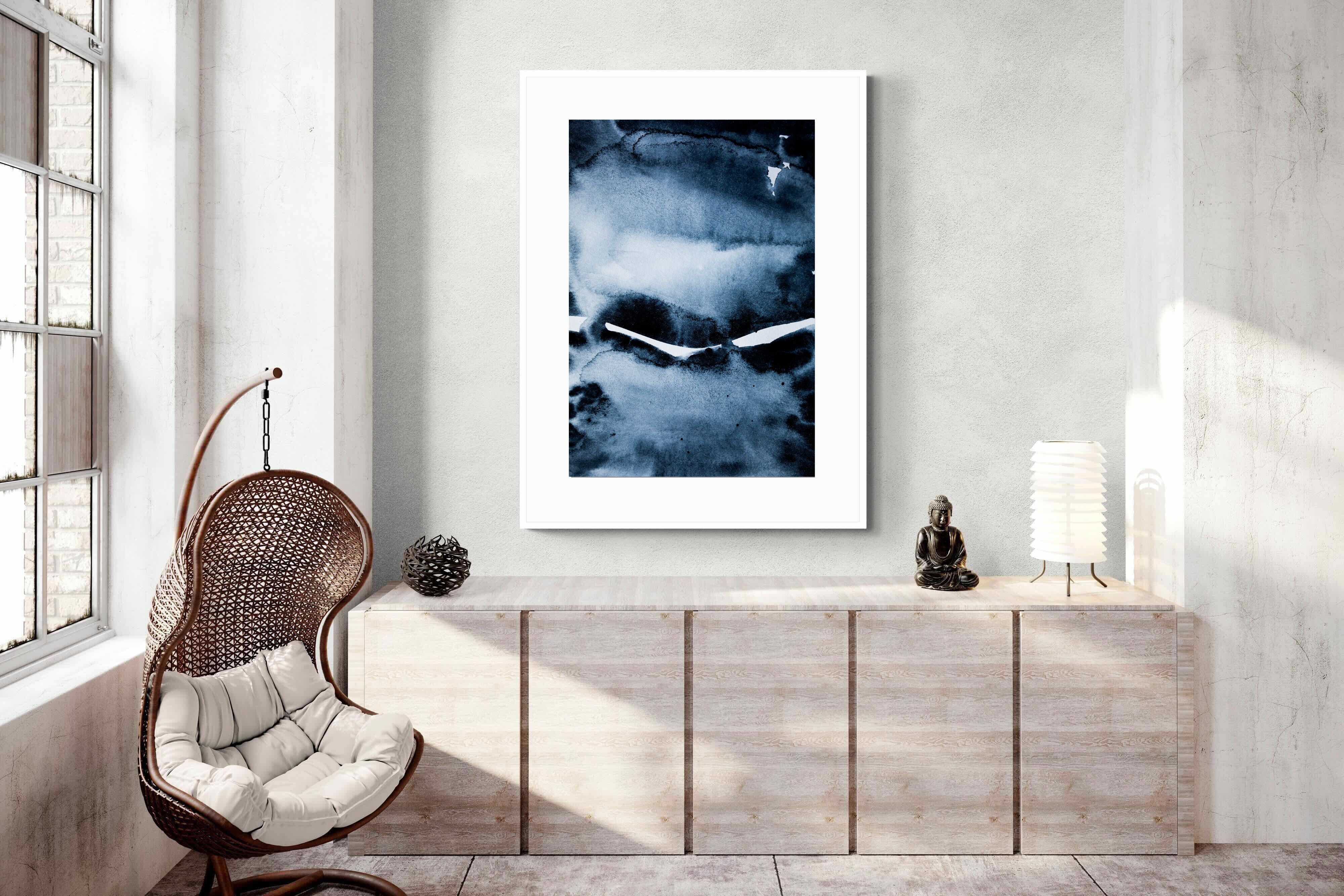 "Eclipse" features deep, inky blues with abstract shapes and gradients, evoking the mystery and beauty of a celestial event. It symbolises the interplay between light and darkness, change, and the unknown. This artwork would be an excellent choice for a contemporary home, adding a touch of intrigue and sophistication. Its rich, moody palette and abstract form create a striking visual impact, enhancing the modern aesthetic of any room.