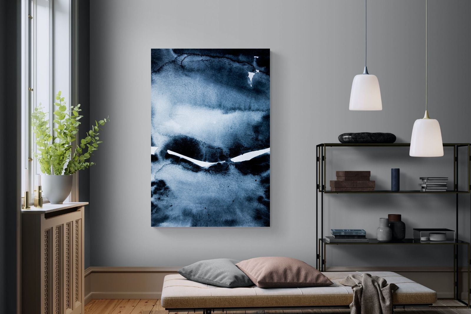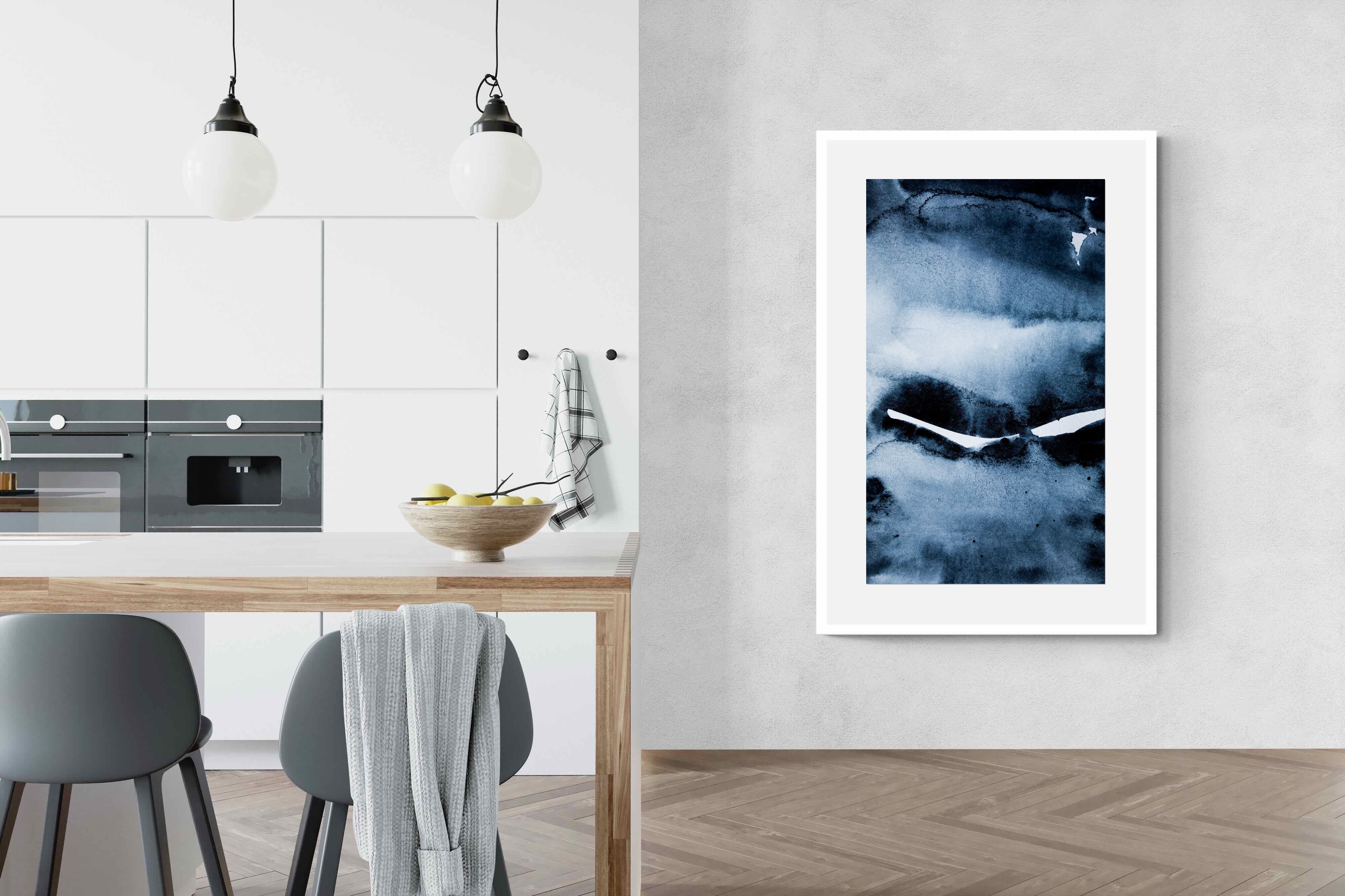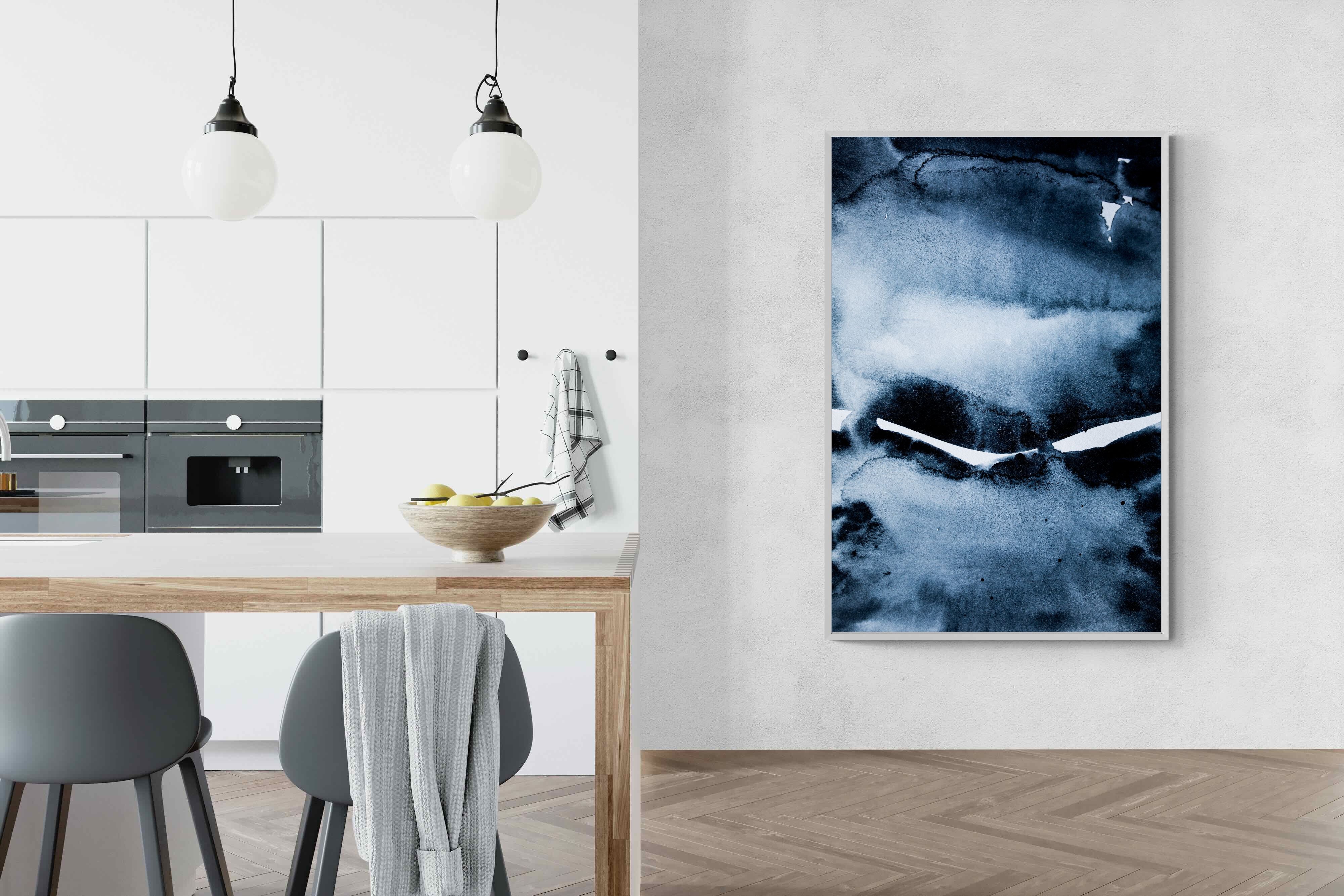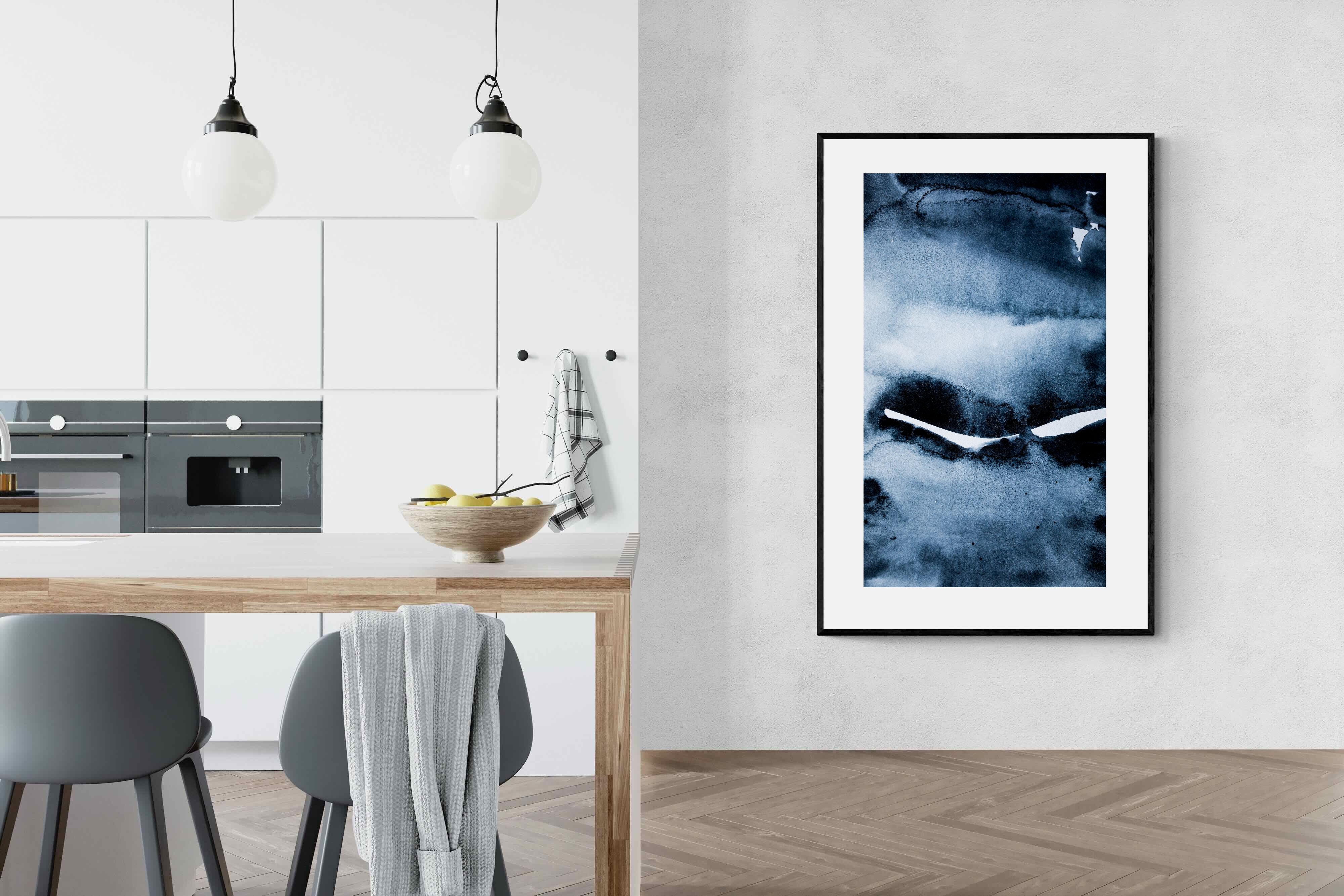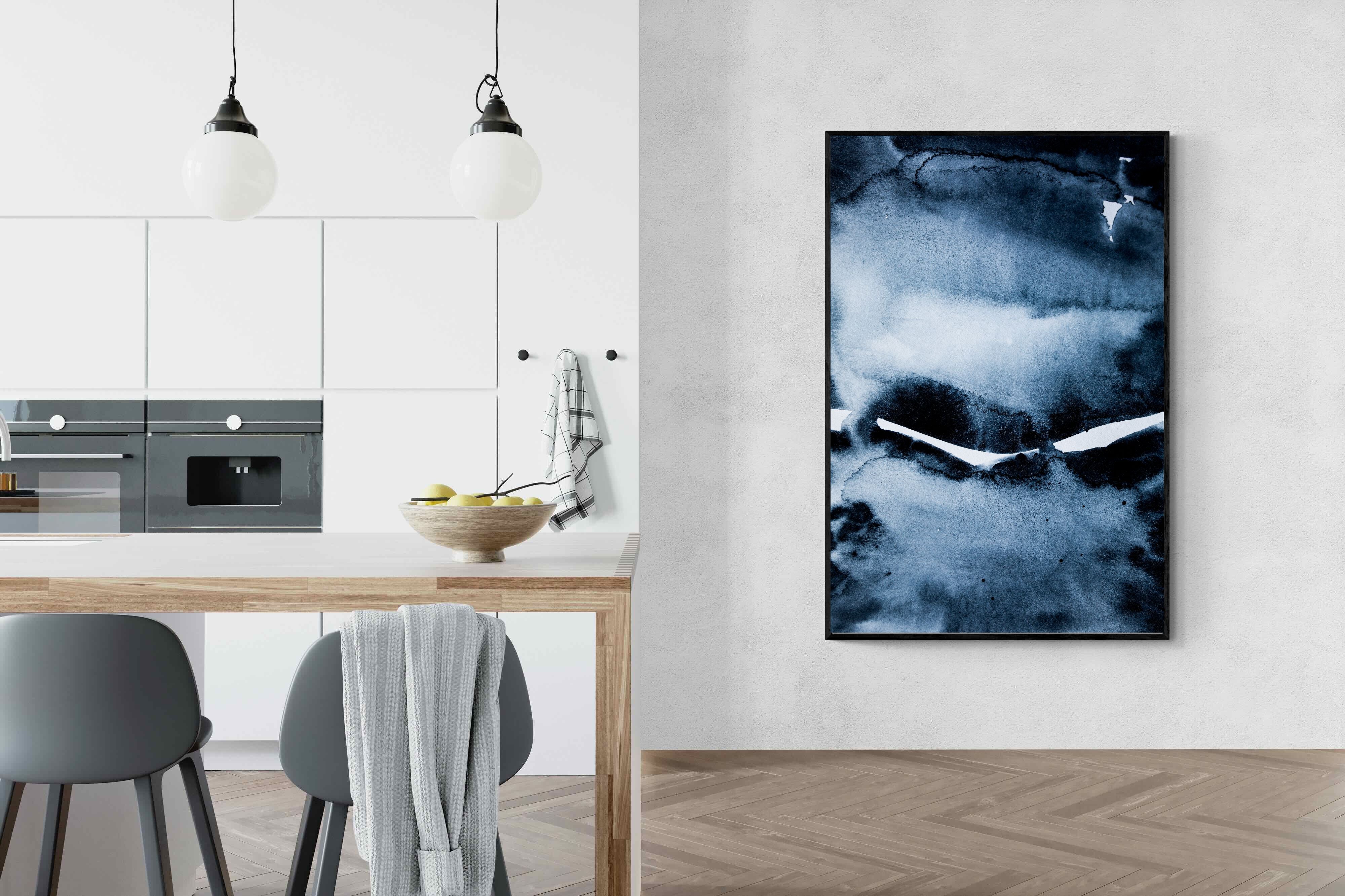 "Eclipse" features deep, inky blues with abstract shapes and gradients, evoking the mystery and beauty of a celestial event. It symbolises the interplay between light and darkness, change, and the unknown. This artwork would be an excellent choice for a contemporary home, adding a touch of intrigue and sophistication. Its rich, moody palette and abstract form create a striking visual impact, enhancing the modern aesthetic of any room.