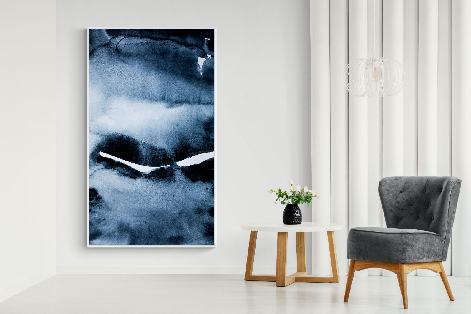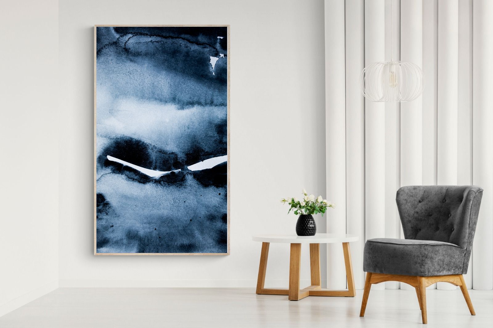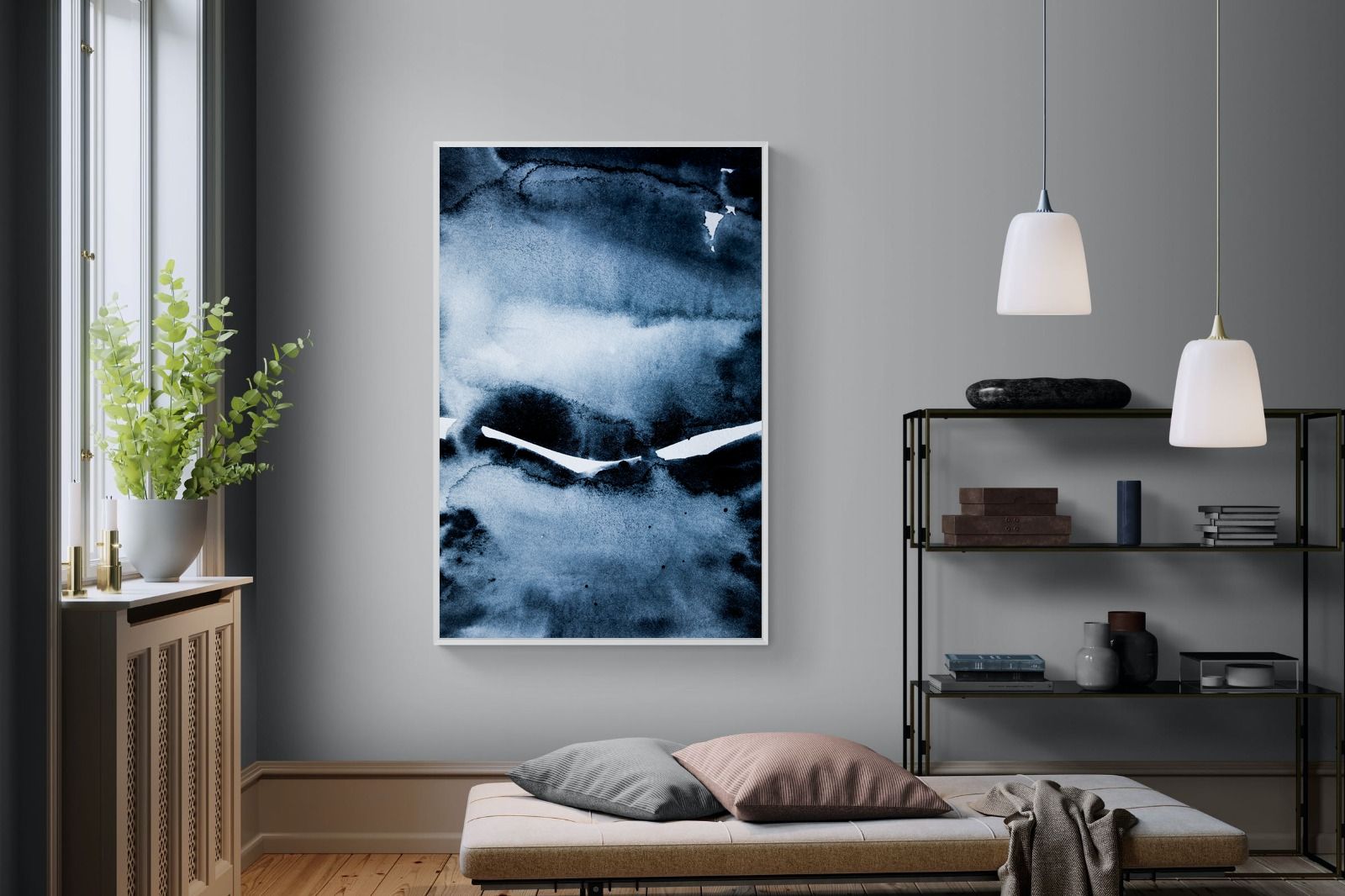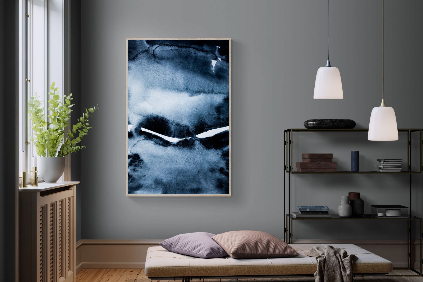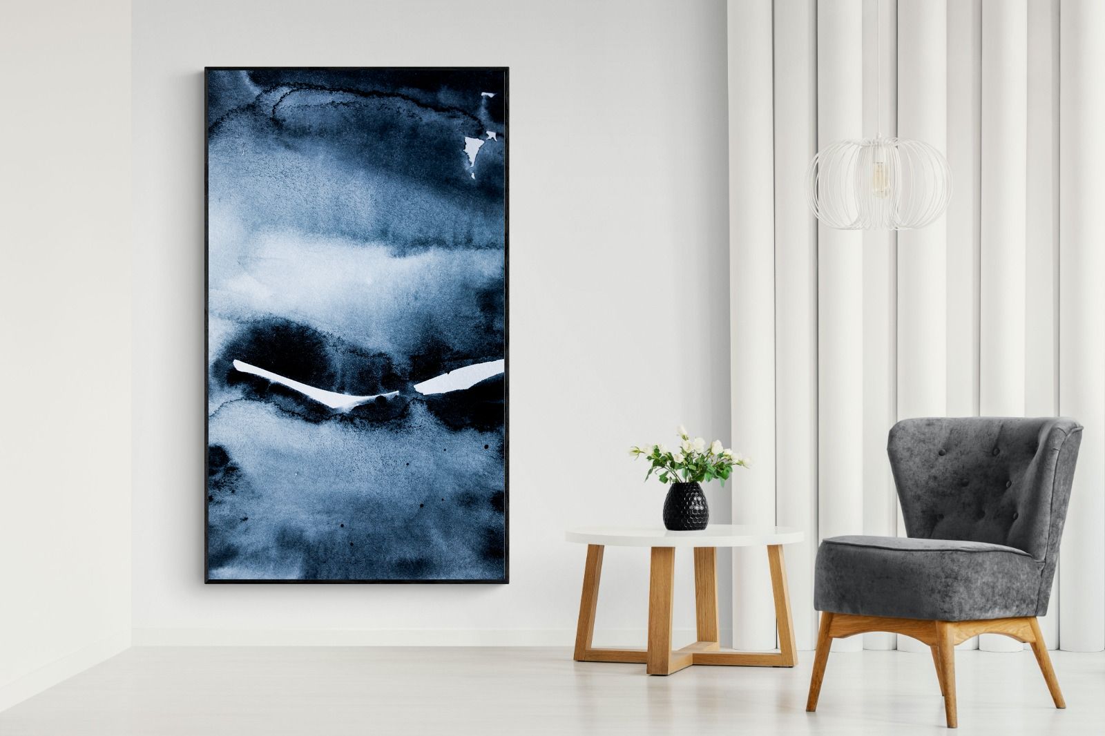 "Eclipse" features deep, inky blues with abstract shapes and gradients, evoking the mystery and beauty of a celestial event. It symbolises the interplay between light and darkness, change, and the unknown. This artwork would be an excellent choice for a contemporary home, adding a touch of intrigue and sophistication. Its rich, moody palette and abstract form create a striking visual impact, enhancing the modern aesthetic of any room.
