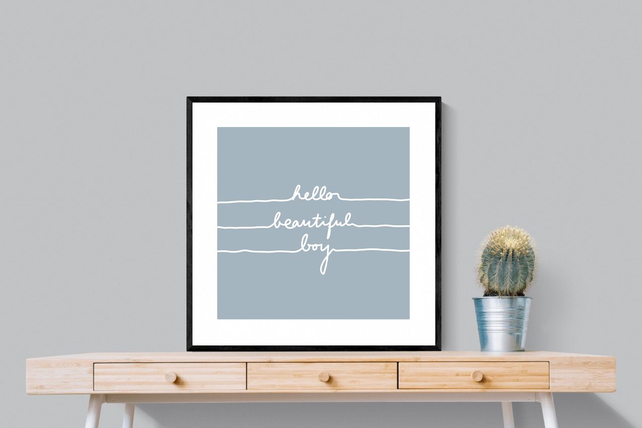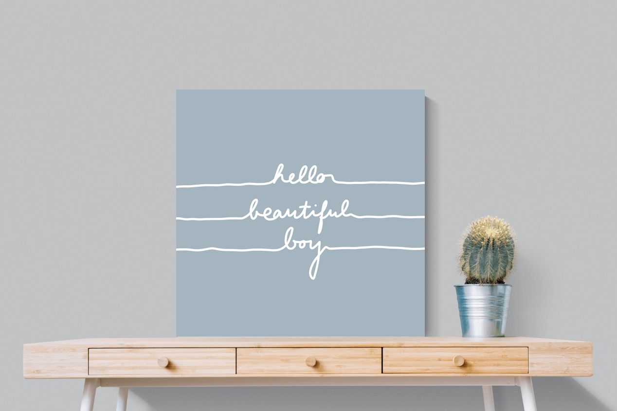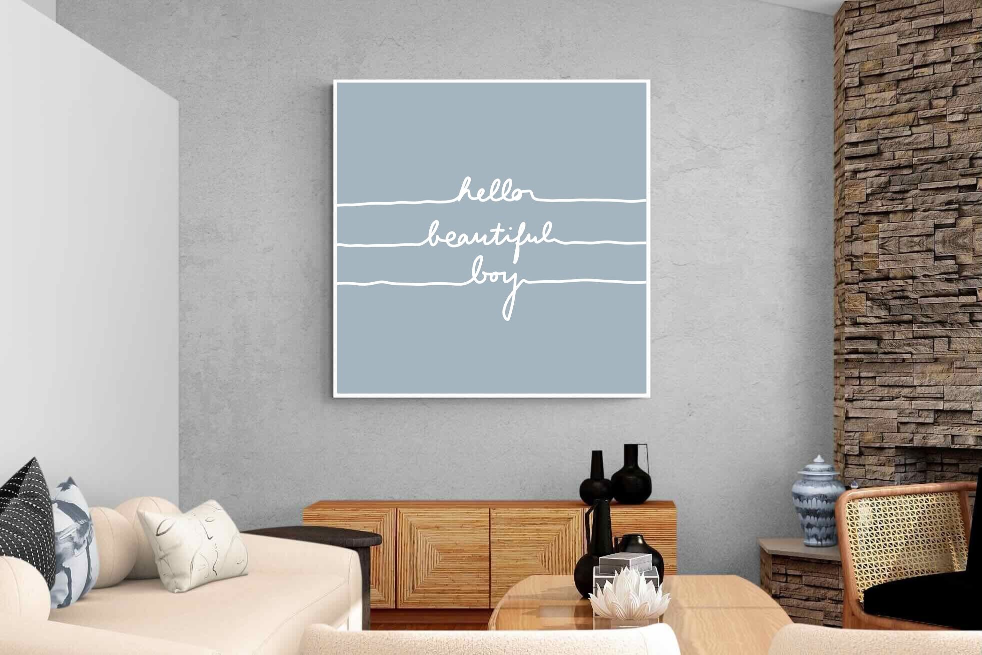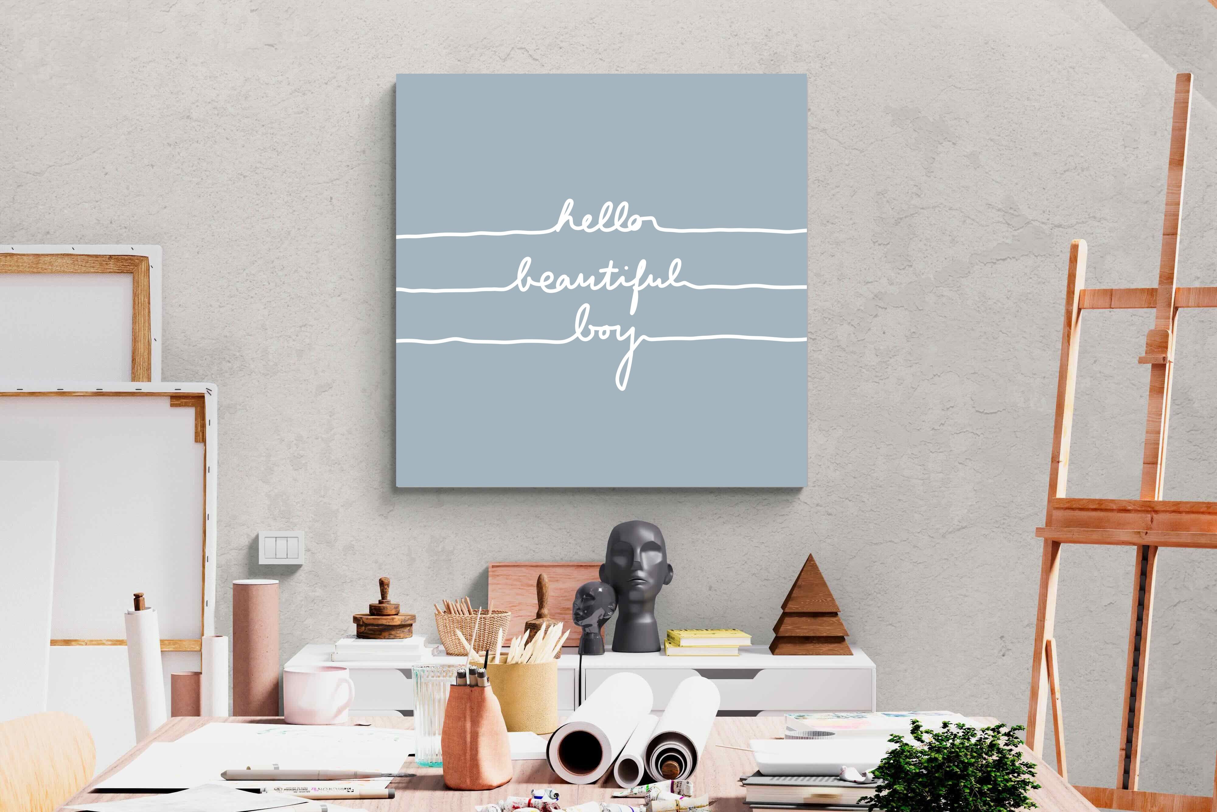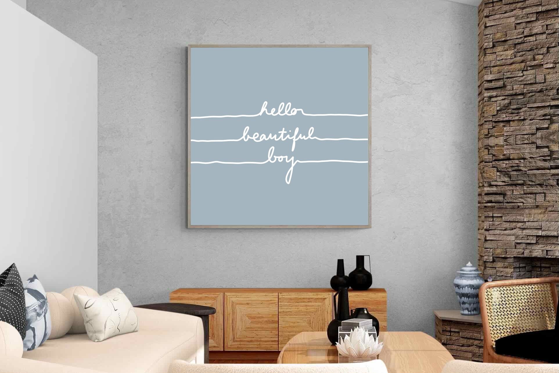 This charming artwork features a soft pink background with a handwritten-style message: "hello beautiful boy." Its simplicity and warmth make it a lovely addition to a child's room. The delicate script and gentle tone create an inviting, positive atmosphere. This piece adds a touch of kindness and affirmation to modern interiors, perfectly blending minimalism with a meaningful, uplifting message.