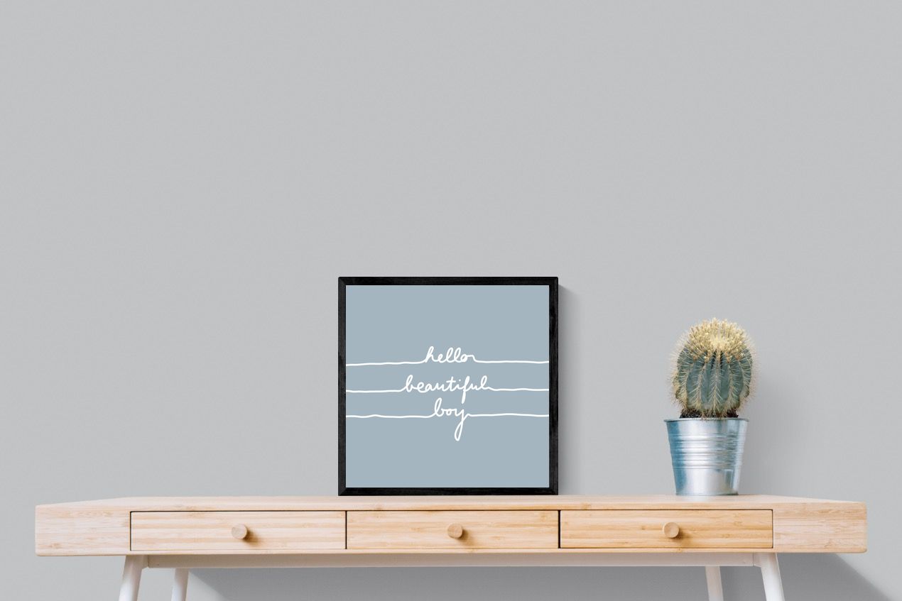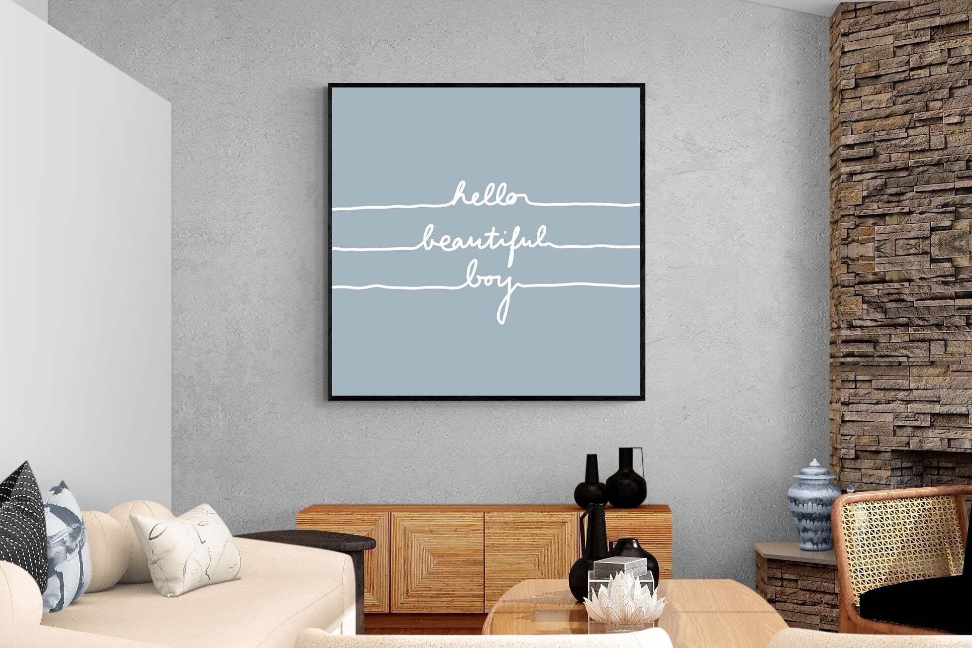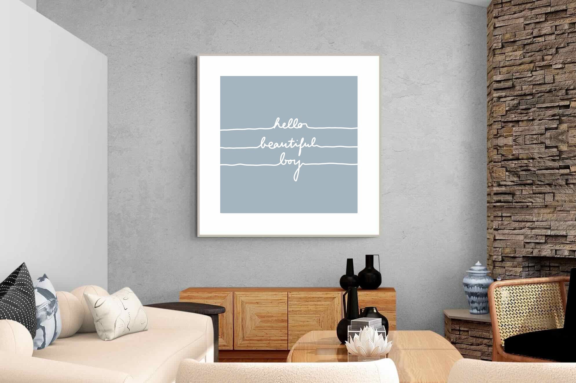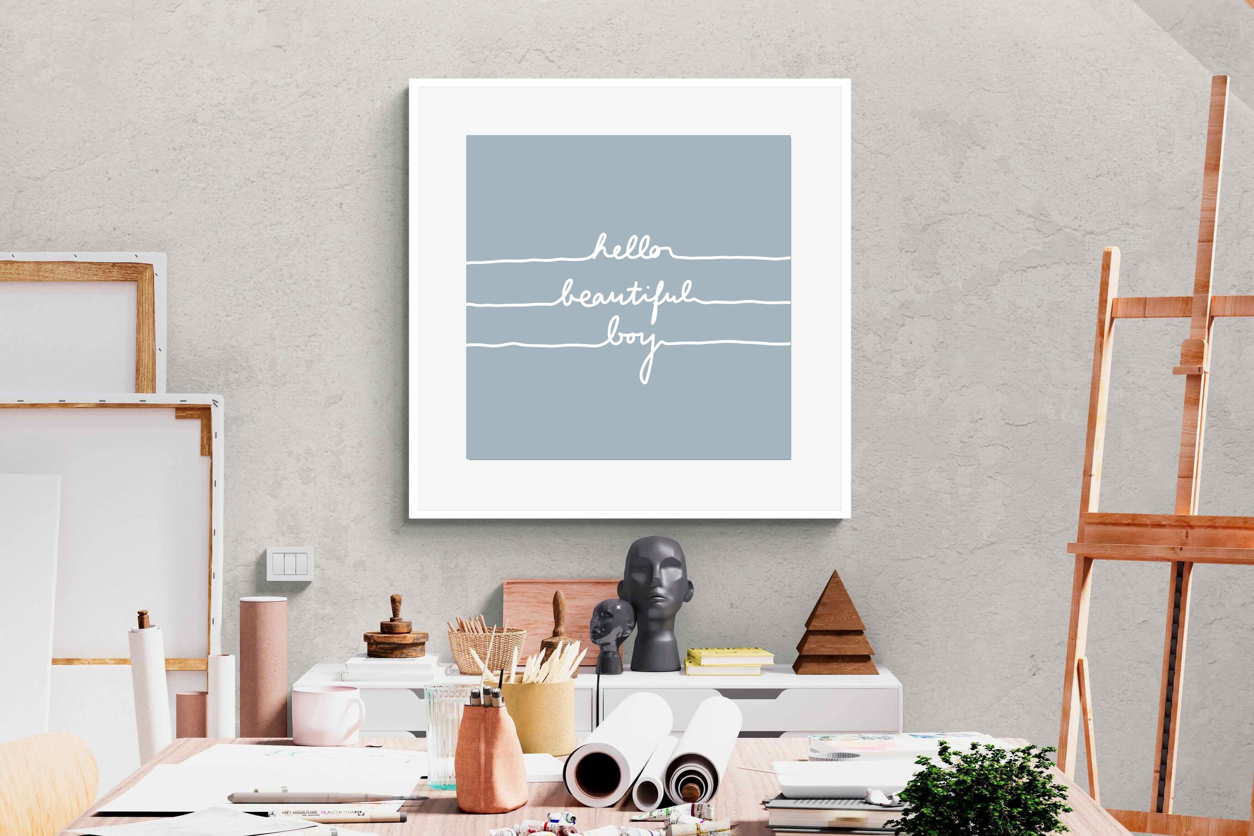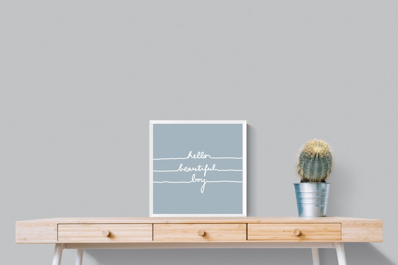This charming artwork features a soft pink background with a handwritten-style message: "hello beautiful boy." Its simplicity and warmth make it a lovely addition to a child's room. The delicate script and gentle tone create an inviting, positive atmosphere. This piece adds a touch of kindness and affirmation to modern interiors, perfectly blending minimalism with a meaningful, uplifting message.