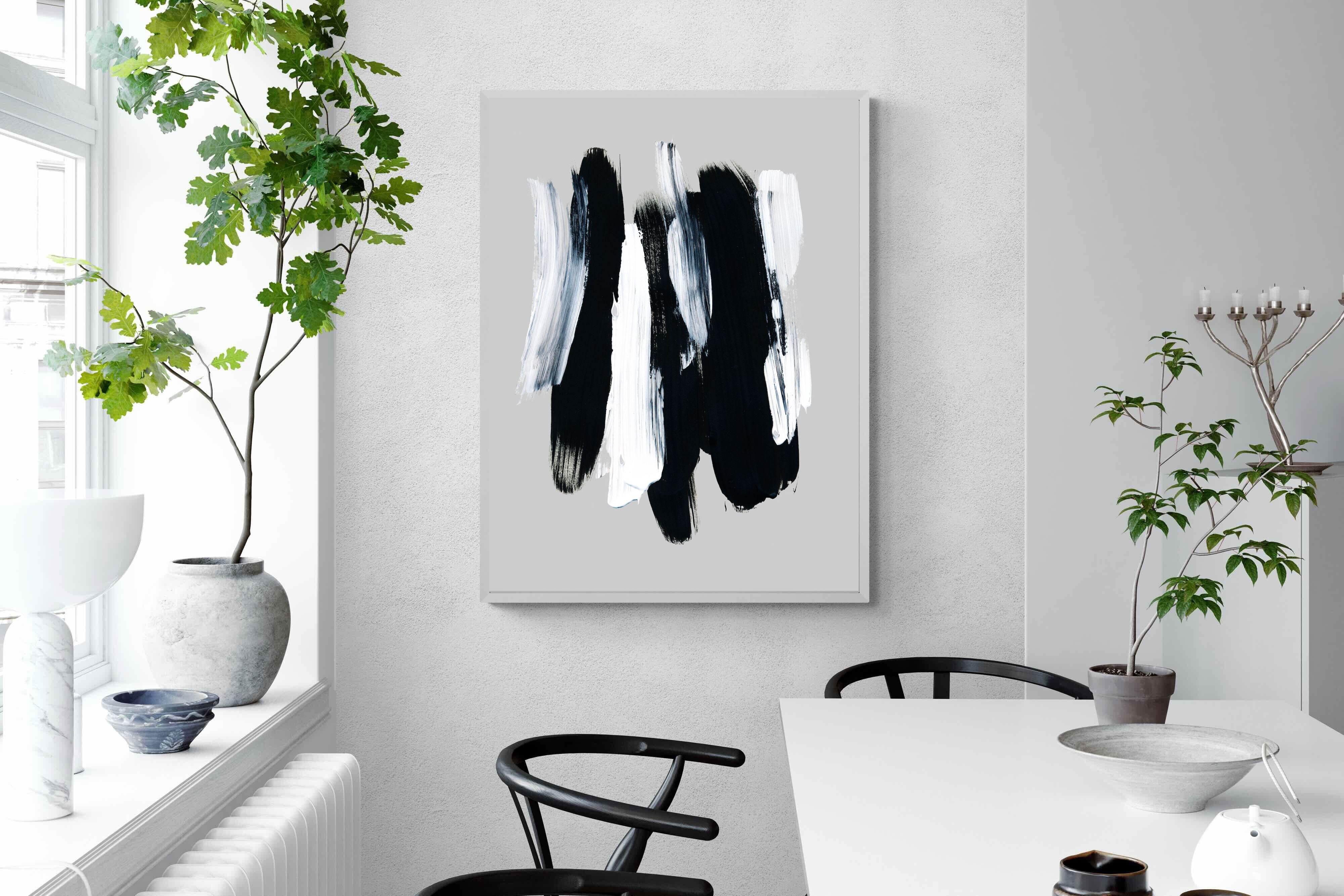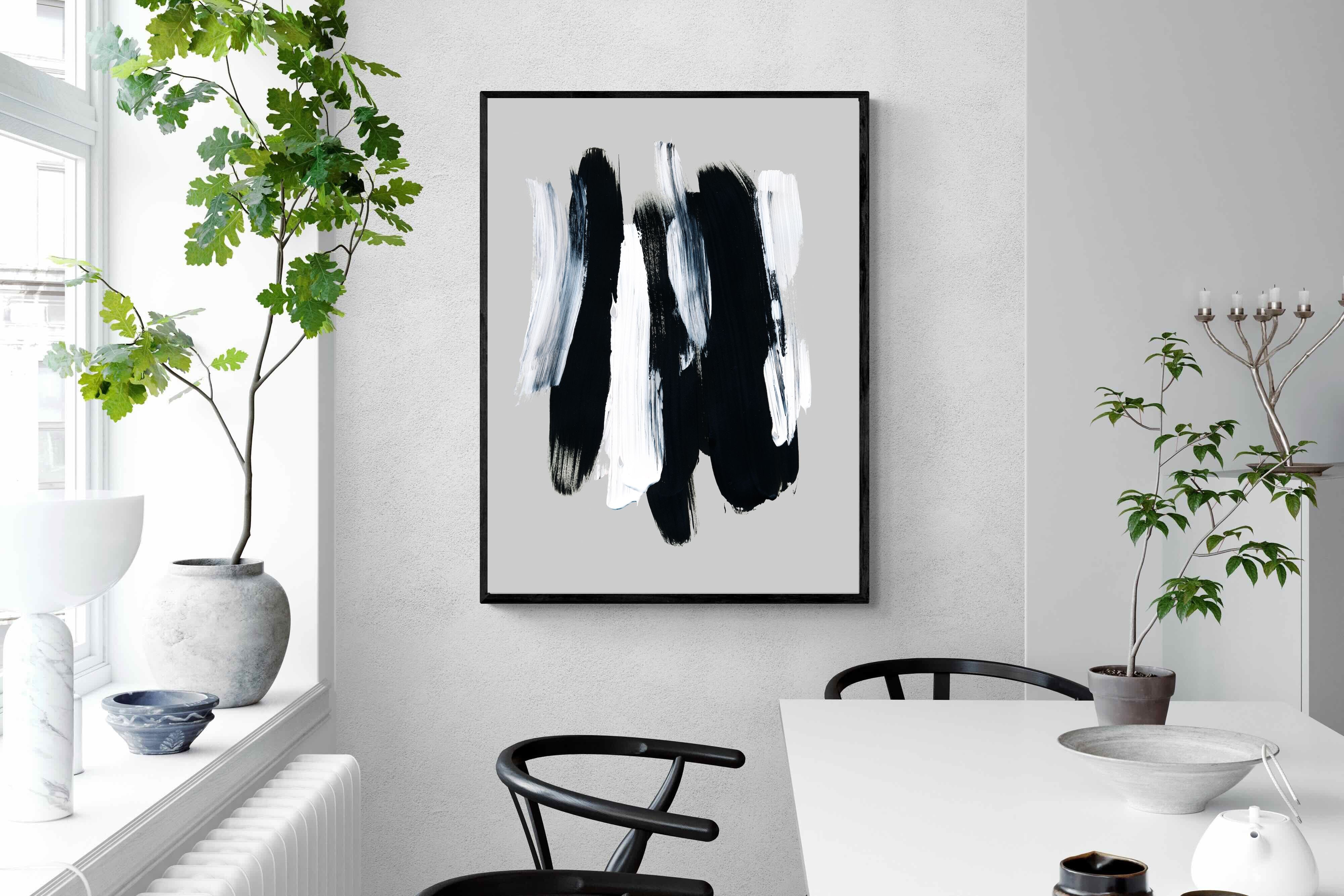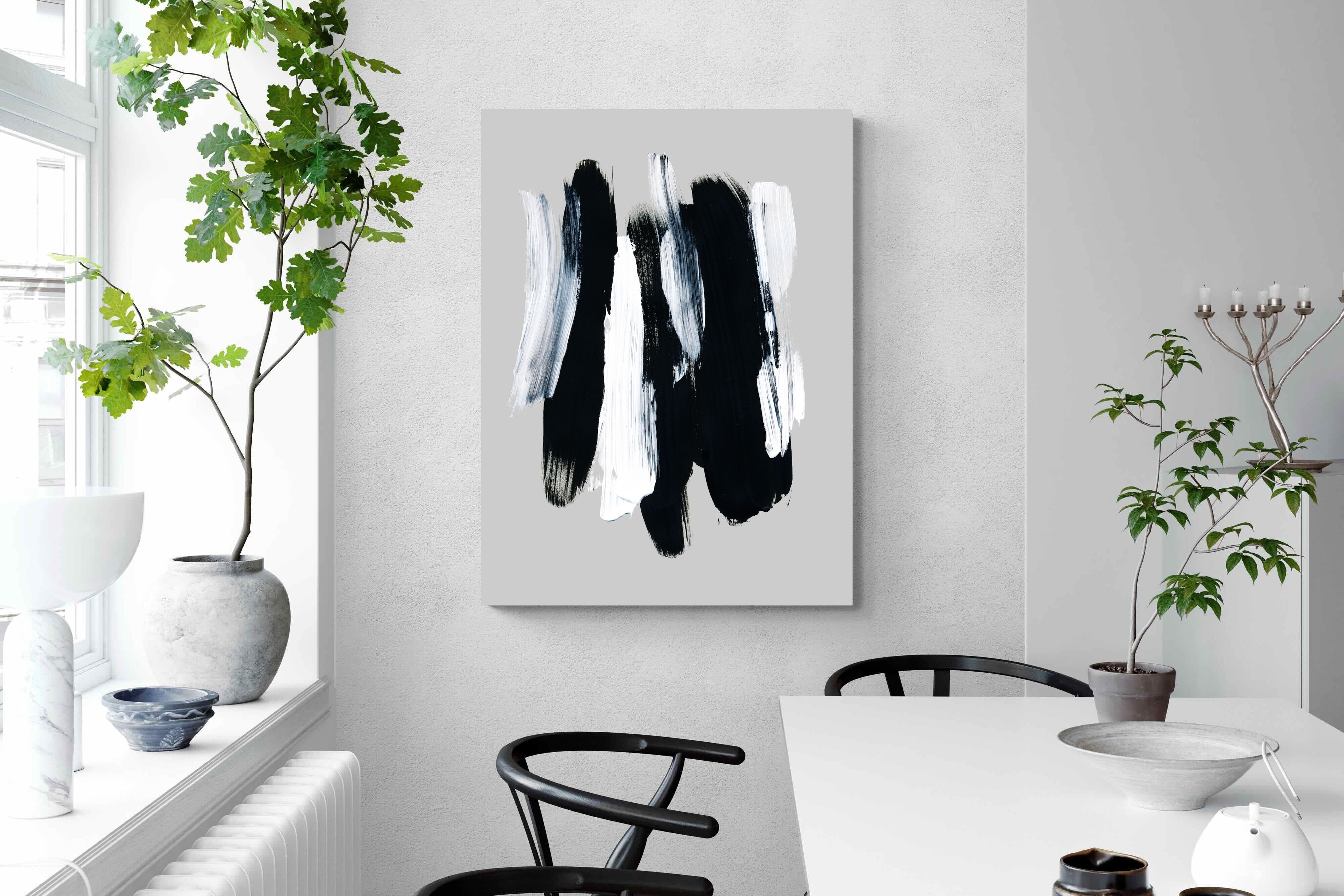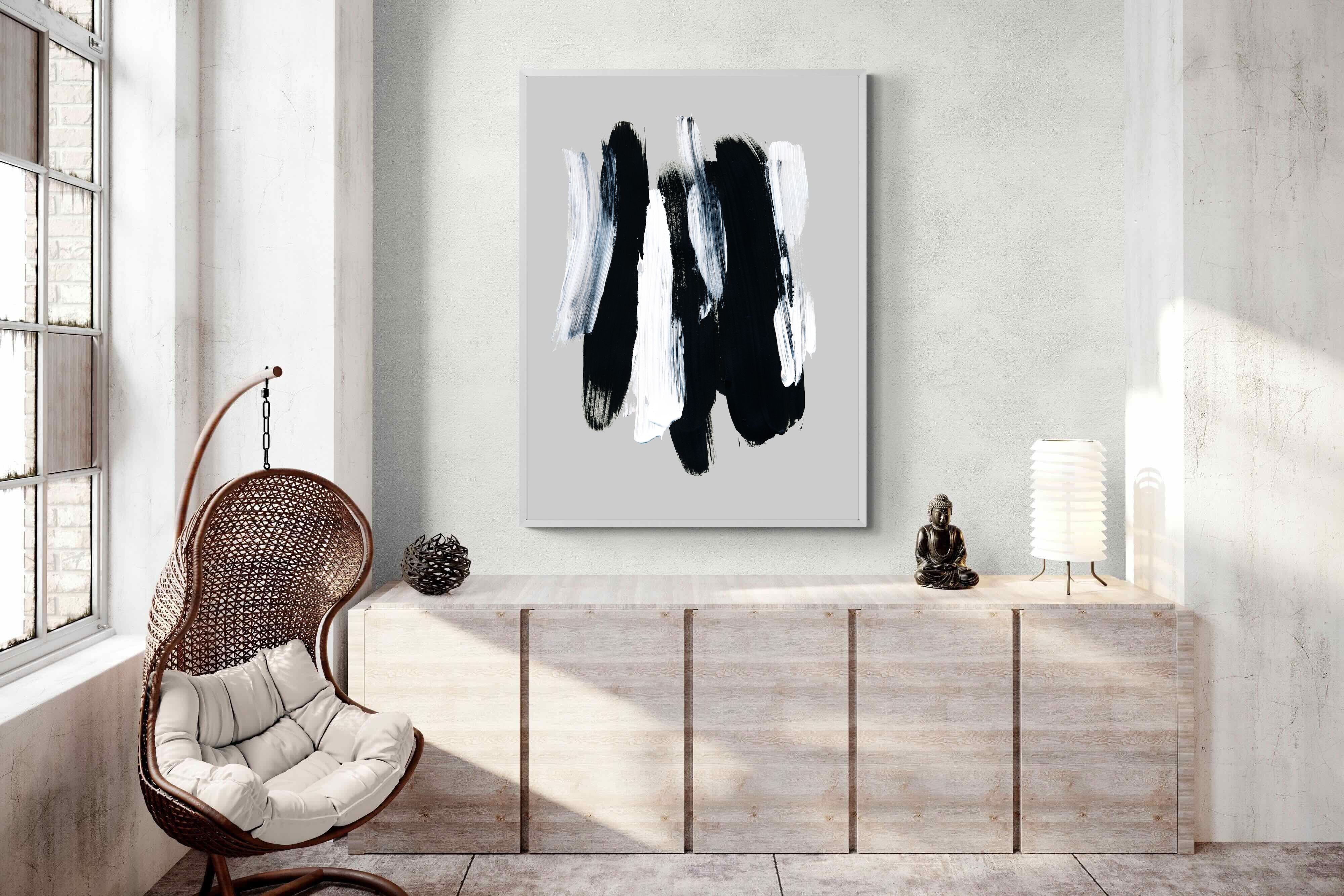 "Monochrome Whispers" captures the interplay of shadow and light, where bold black brushstrokes dance with delicate white sweeps against a serene grey backdrop. This piece portrays the dynamic yet harmonious contrast between strength and subtlety, evoking a sense of calm and contemplation. Its simplicity and elegance make it an ideal choice for modern decor, adding a touch of sophisticated minimalism and artistic depth to a contemporary living space or an office wall.