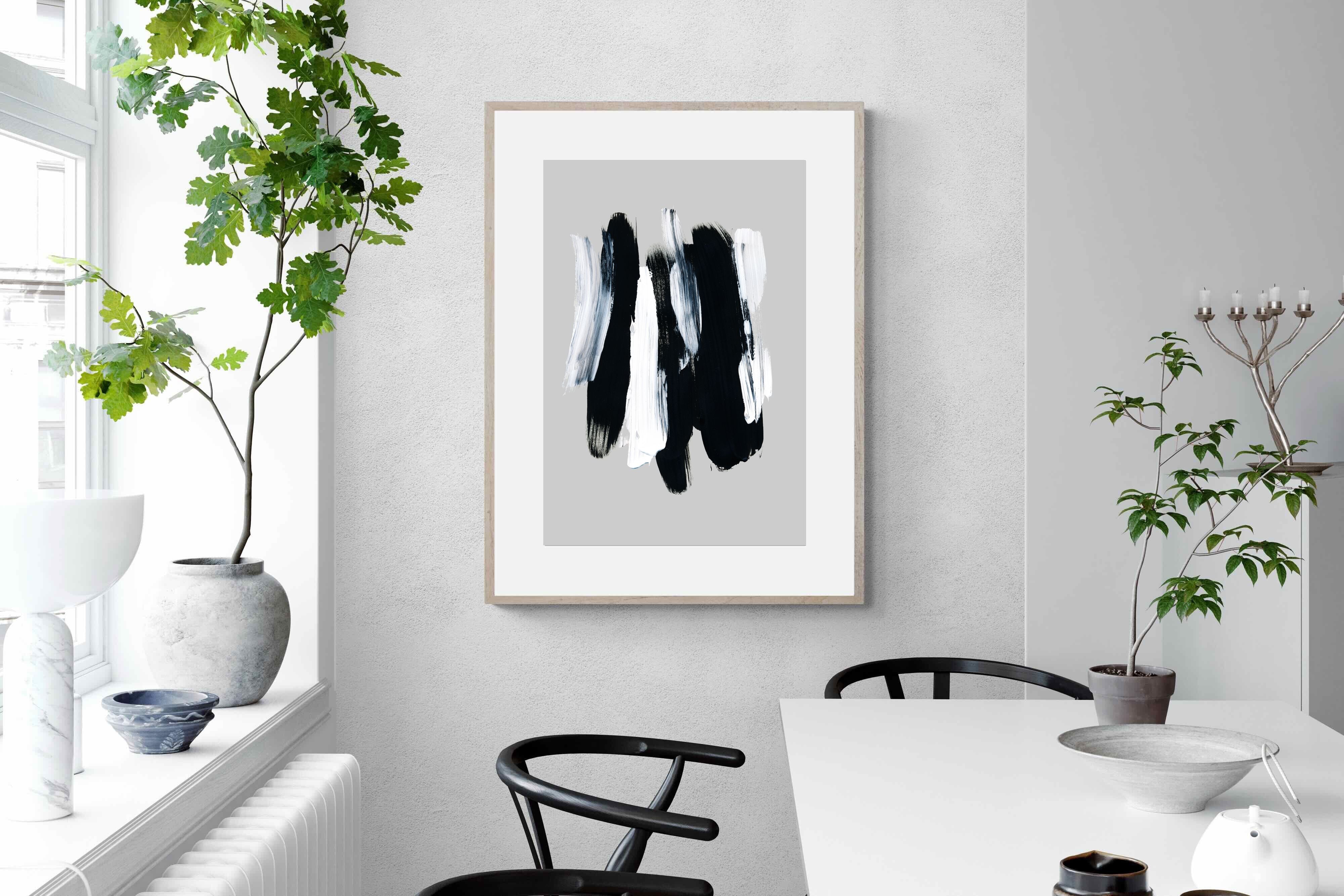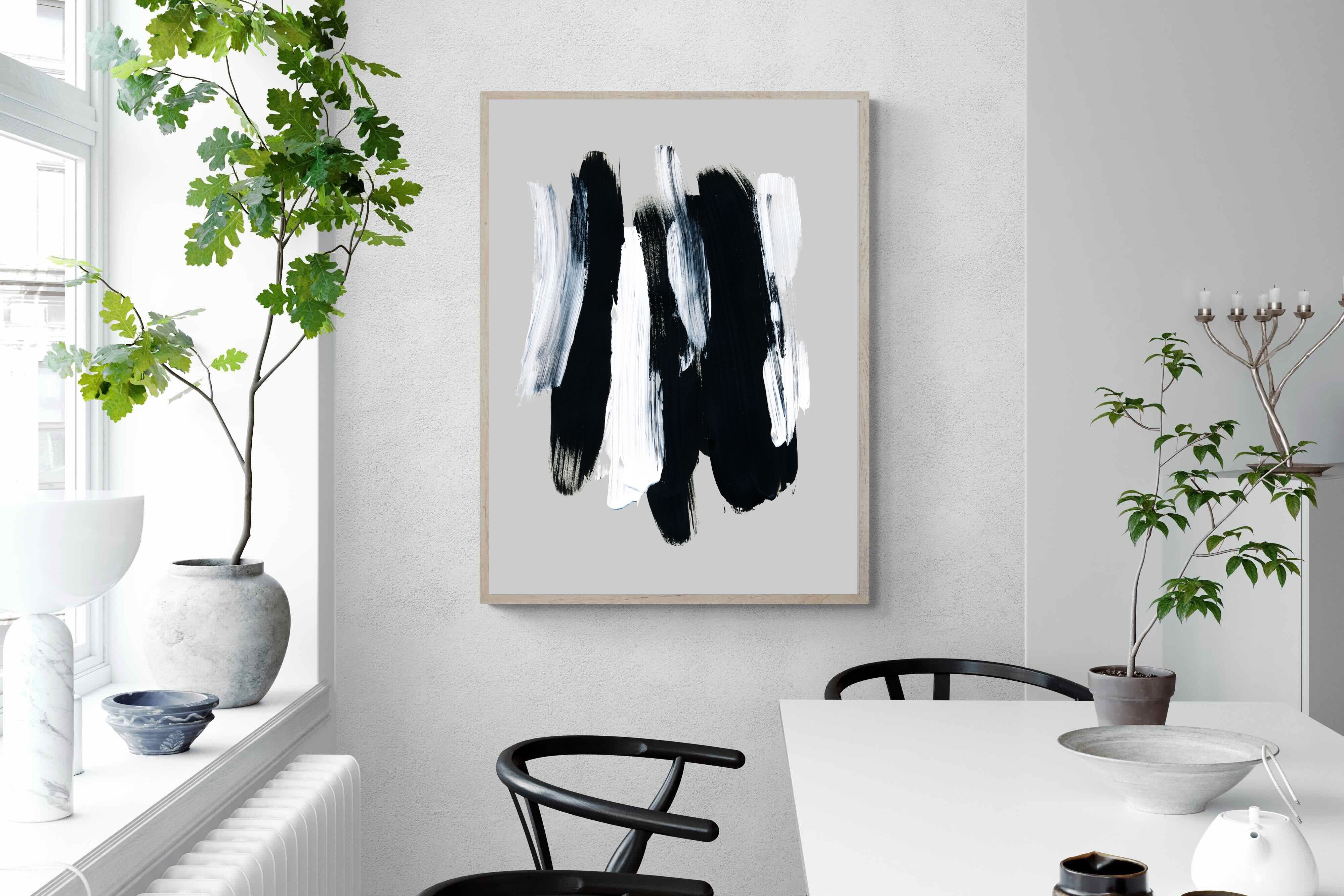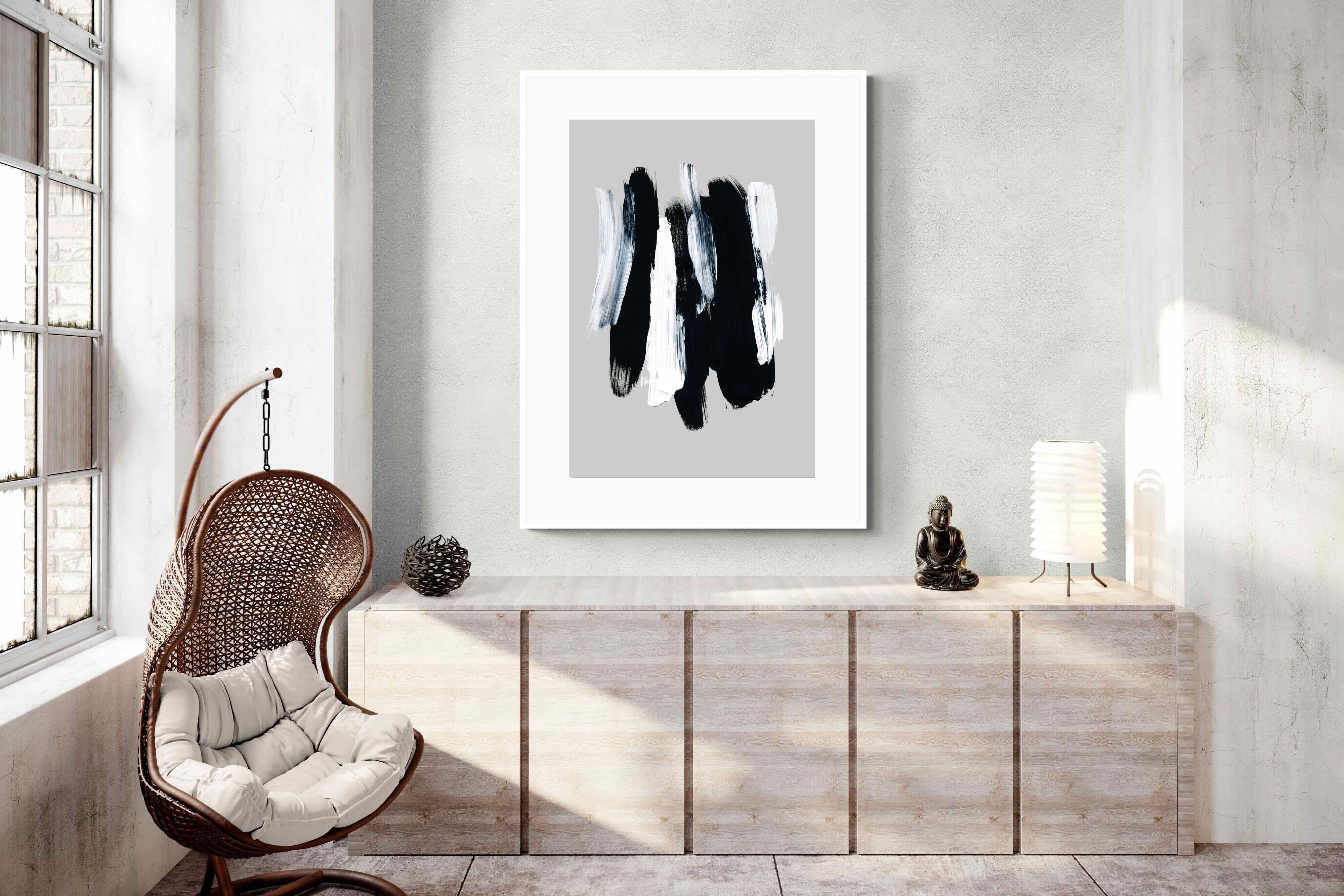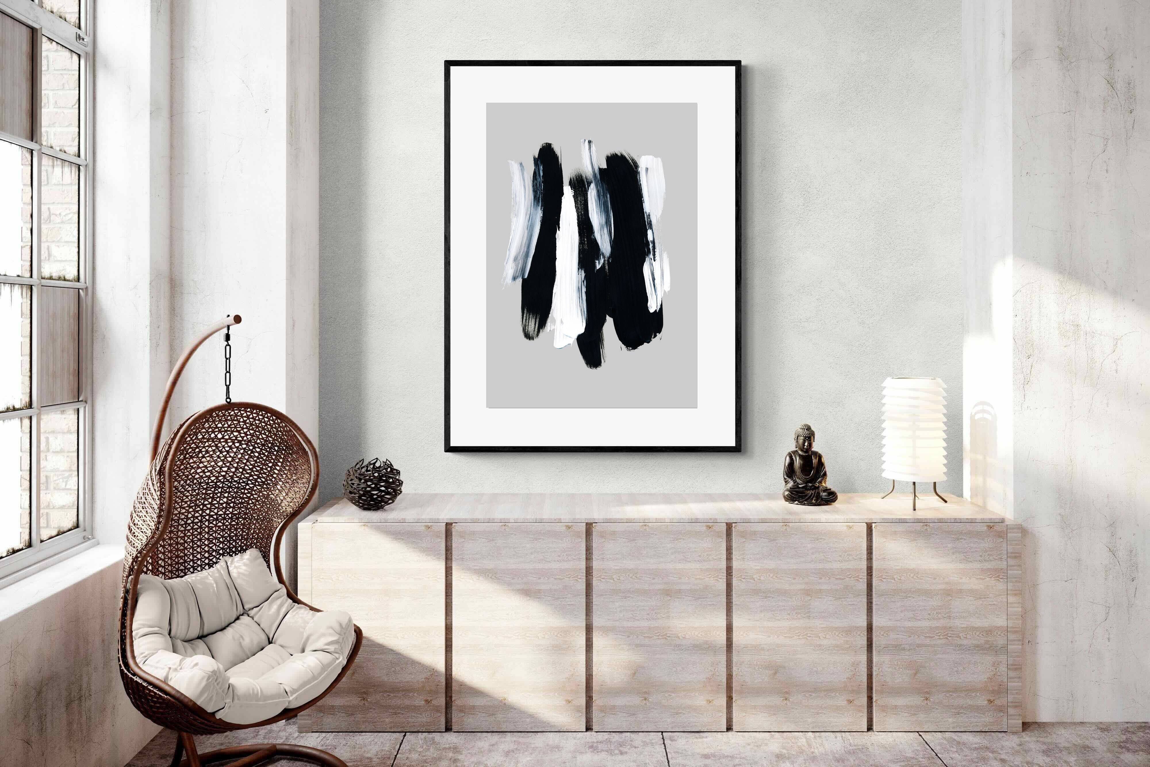 "Monochrome Whispers" captures the interplay of shadow and light, where bold black brushstrokes dance with delicate white sweeps against a serene grey backdrop. This piece portrays the dynamic yet harmonious contrast between strength and subtlety, evoking a sense of calm and contemplation. Its simplicity and elegance make it an ideal choice for modern decor, adding a touch of sophisticated minimalism and artistic depth to a contemporary living space or an office wall.