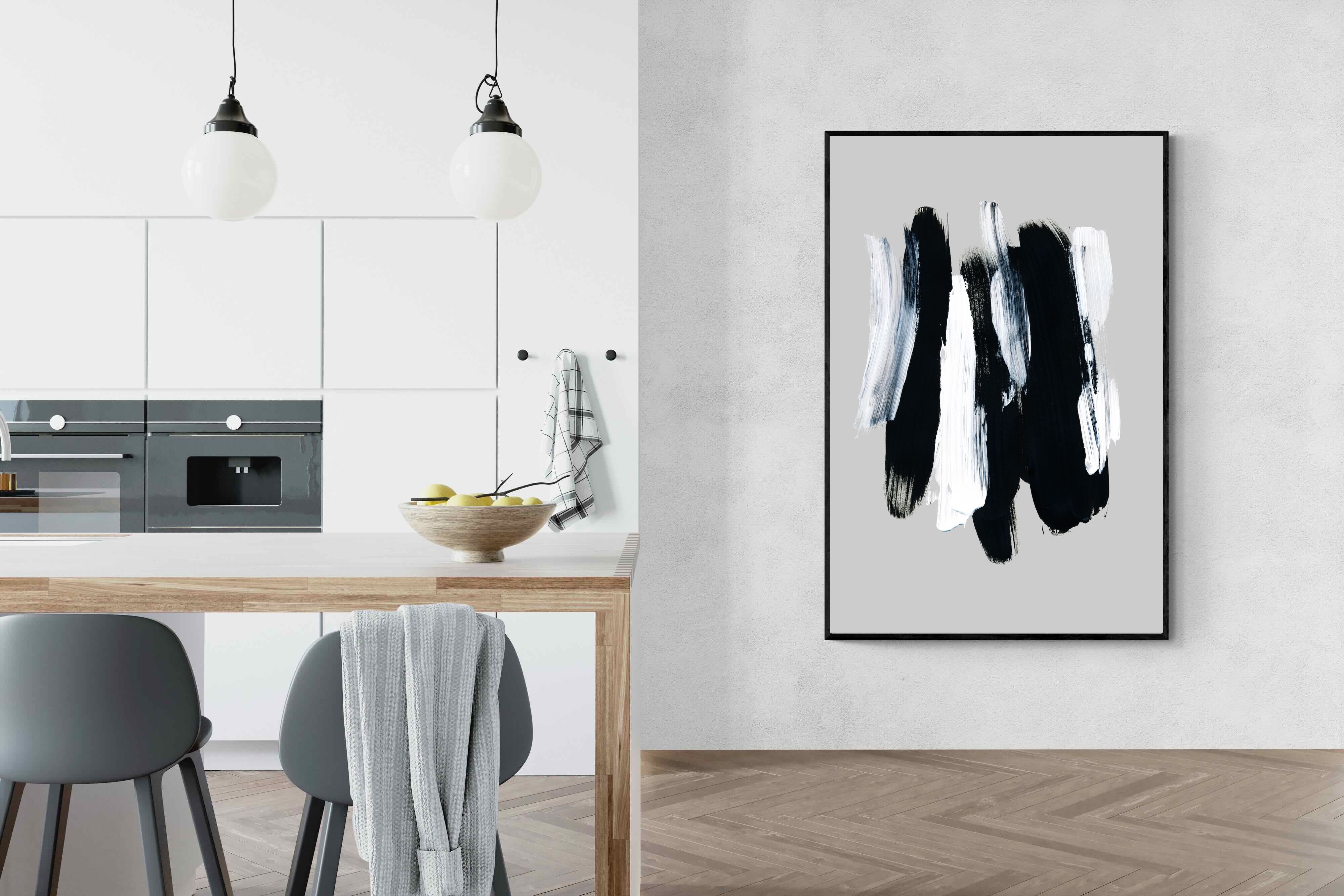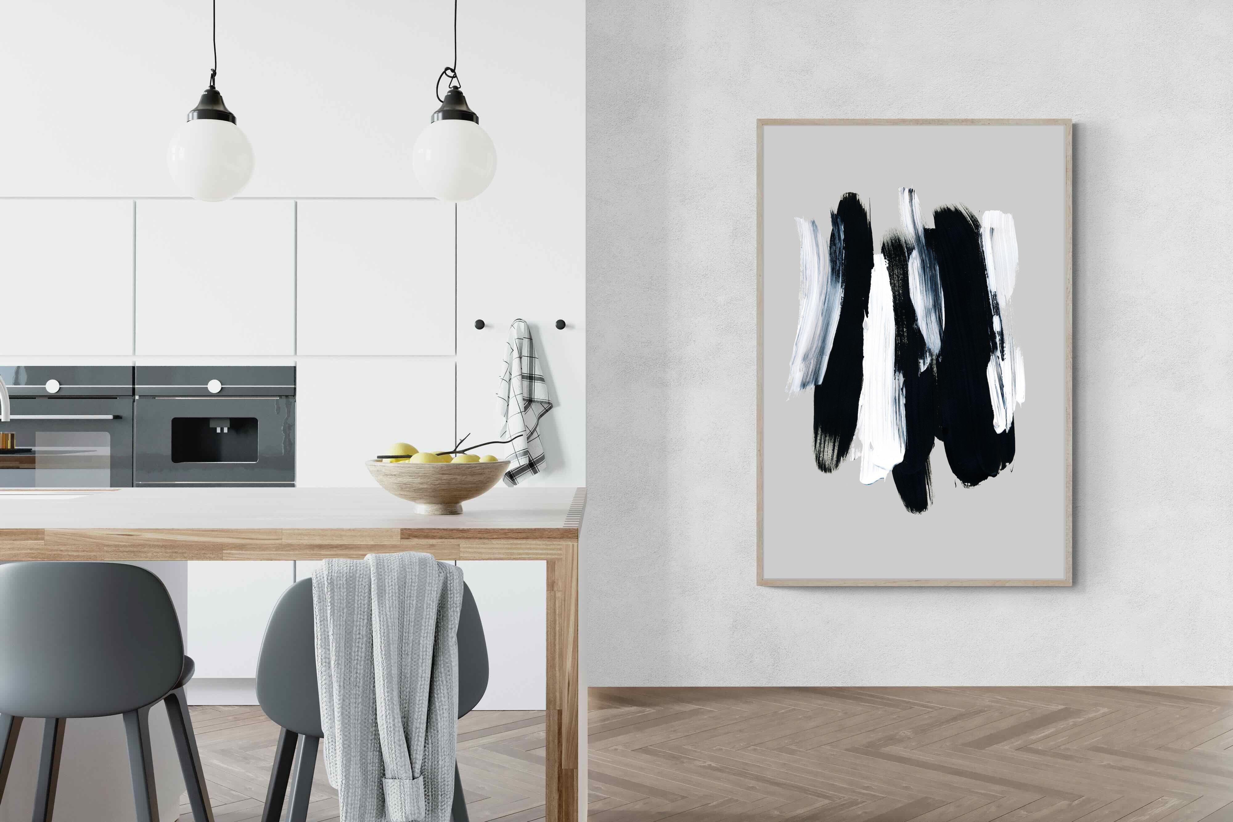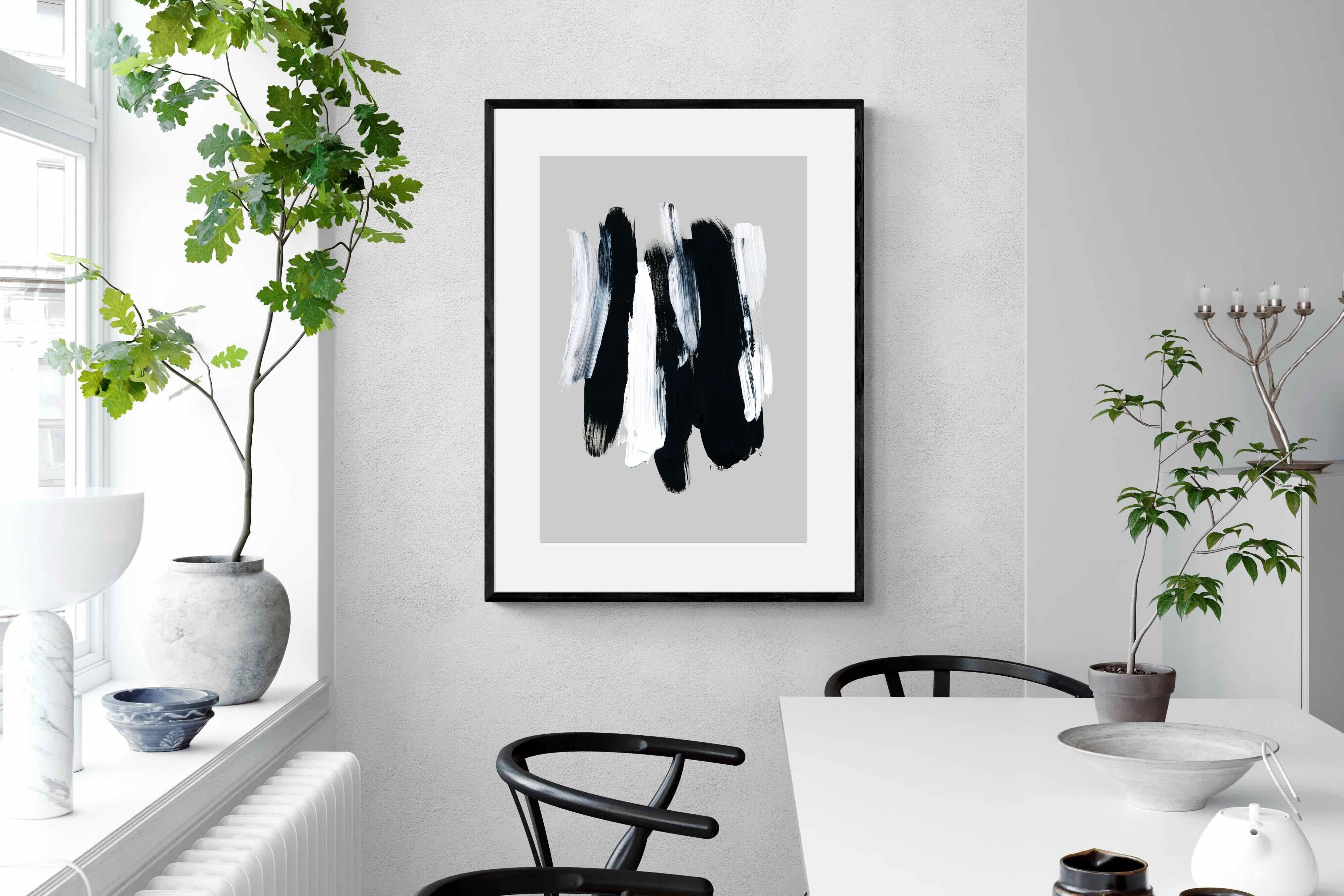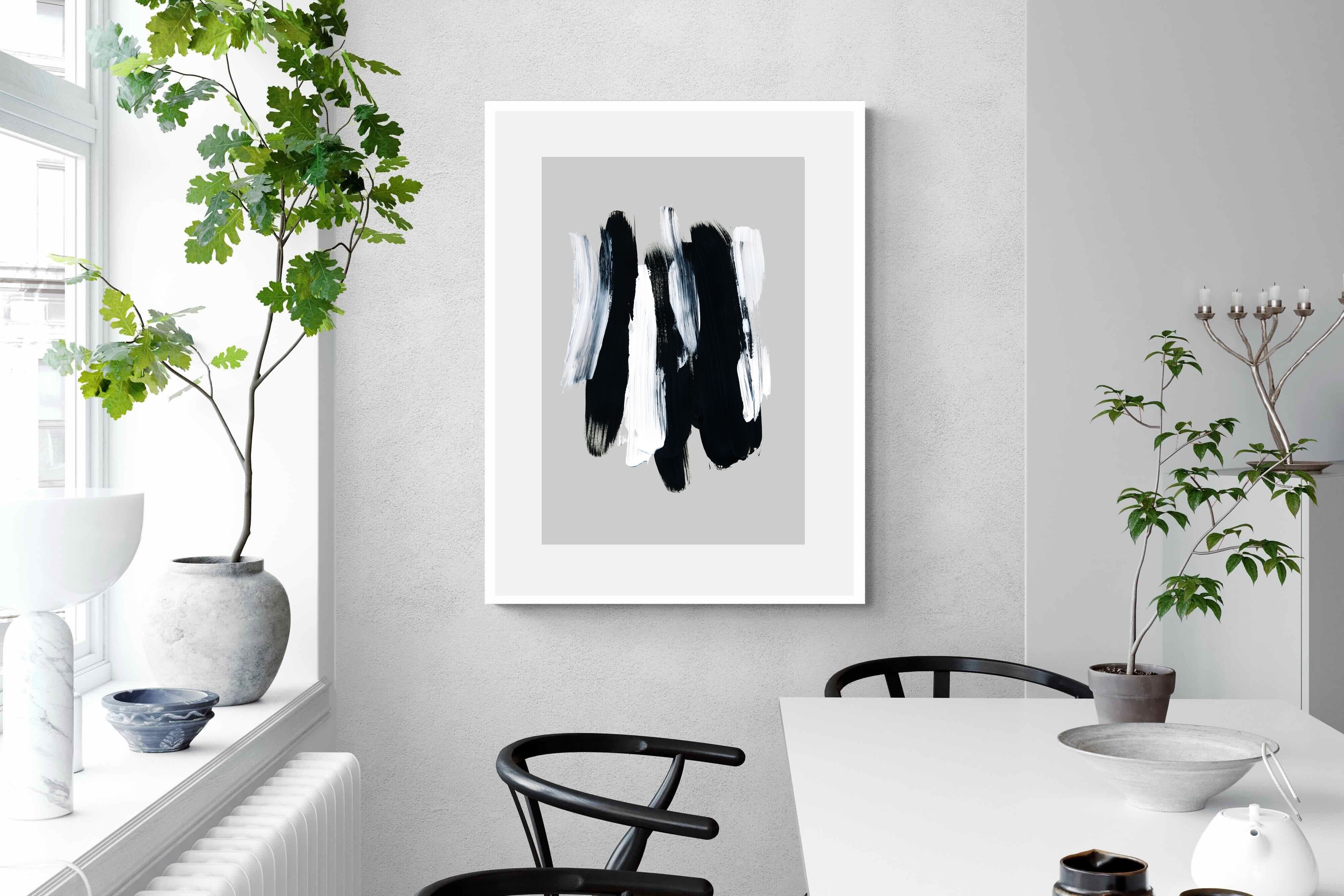"Monochrome Whispers" captures the interplay of shadow and light, where bold black brushstrokes dance with delicate white sweeps against a serene grey backdrop. This piece portrays the dynamic yet harmonious contrast between strength and subtlety, evoking a sense of calm and contemplation. Its simplicity and elegance make it an ideal choice for modern decor, adding a touch of sophisticated minimalism and artistic depth to a contemporary living space or an office wall.