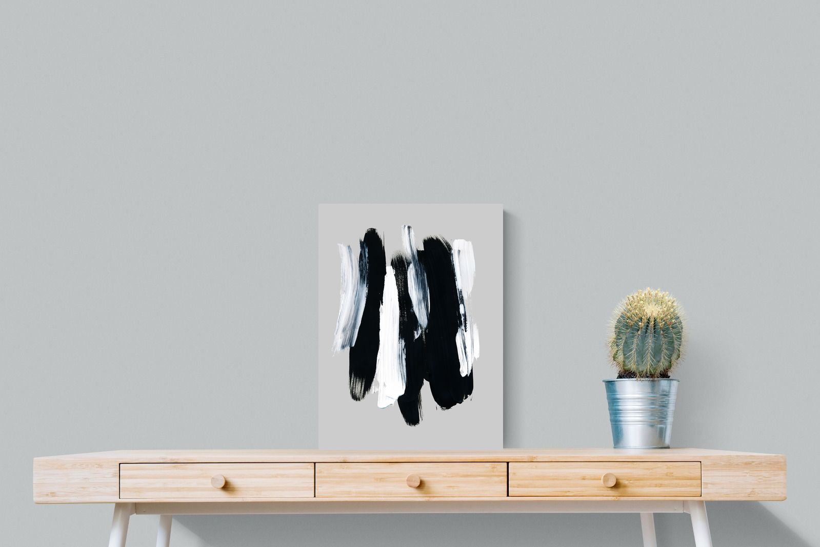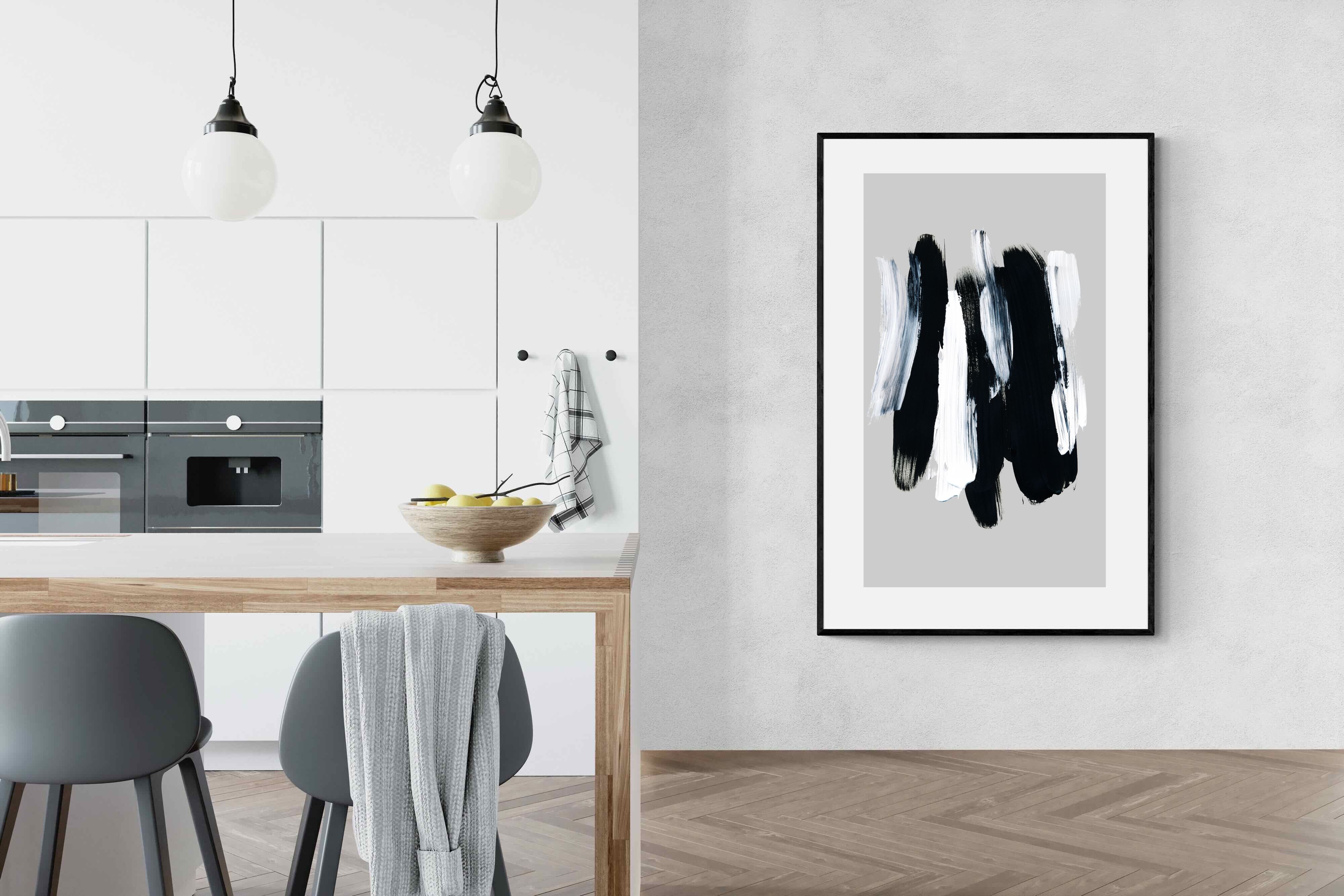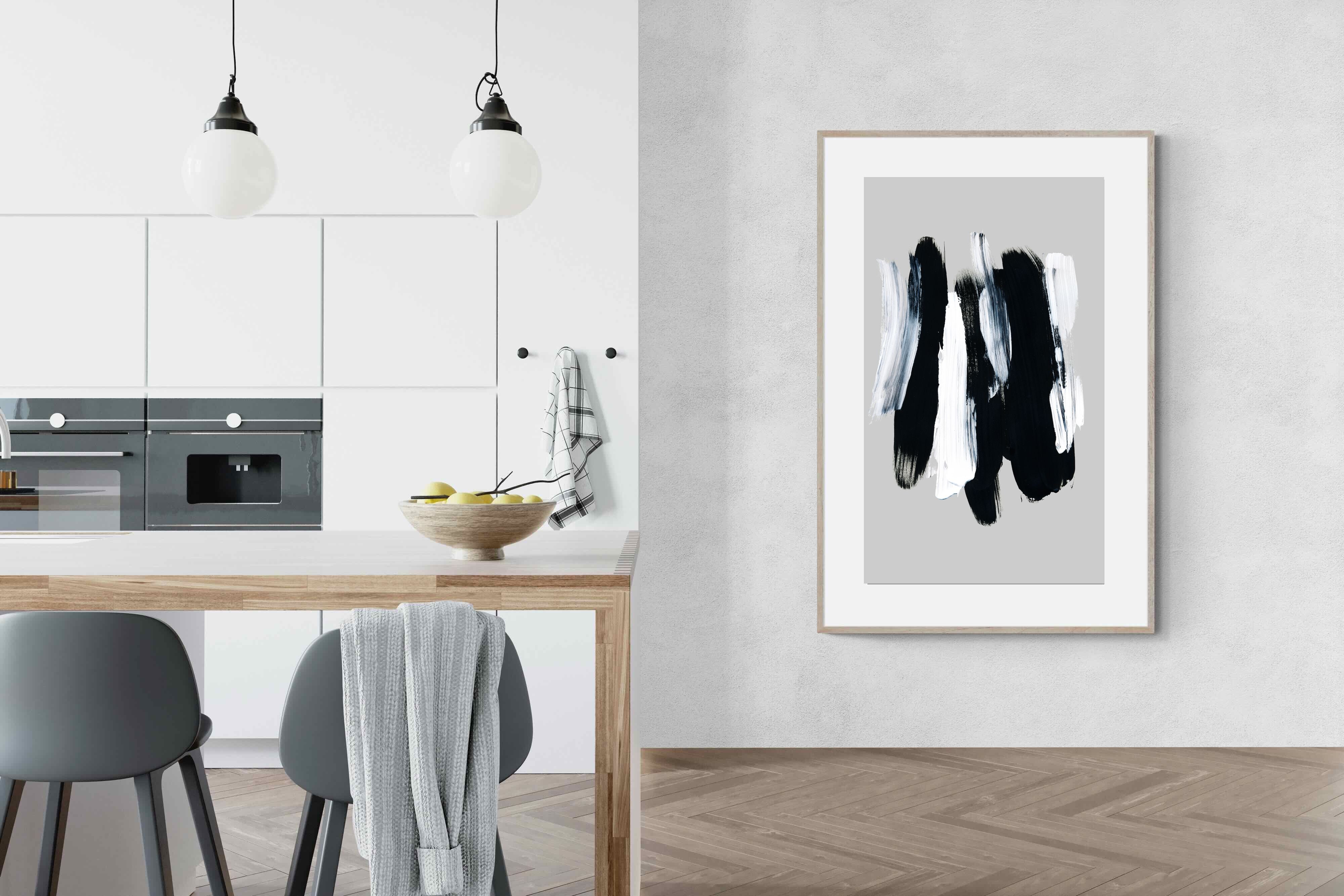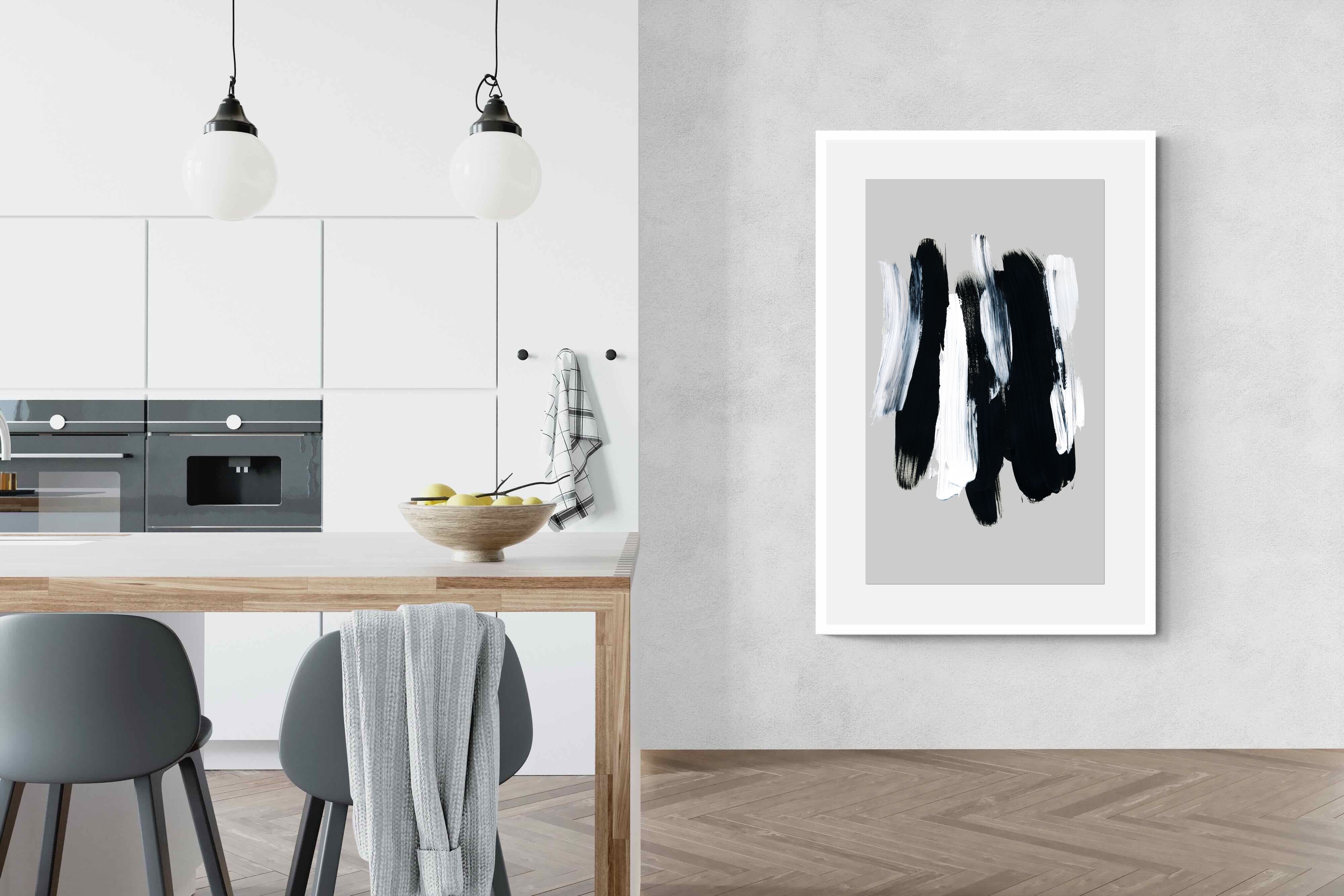 "Monochrome Whispers" captures the interplay of shadow and light, where bold black brushstrokes dance with delicate white sweeps against a serene grey backdrop. This piece portrays the dynamic yet harmonious contrast between strength and subtlety, evoking a sense of calm and contemplation. Its simplicity and elegance make it an ideal choice for modern decor, adding a touch of sophisticated minimalism and artistic depth to a contemporary living space or an office wall.
