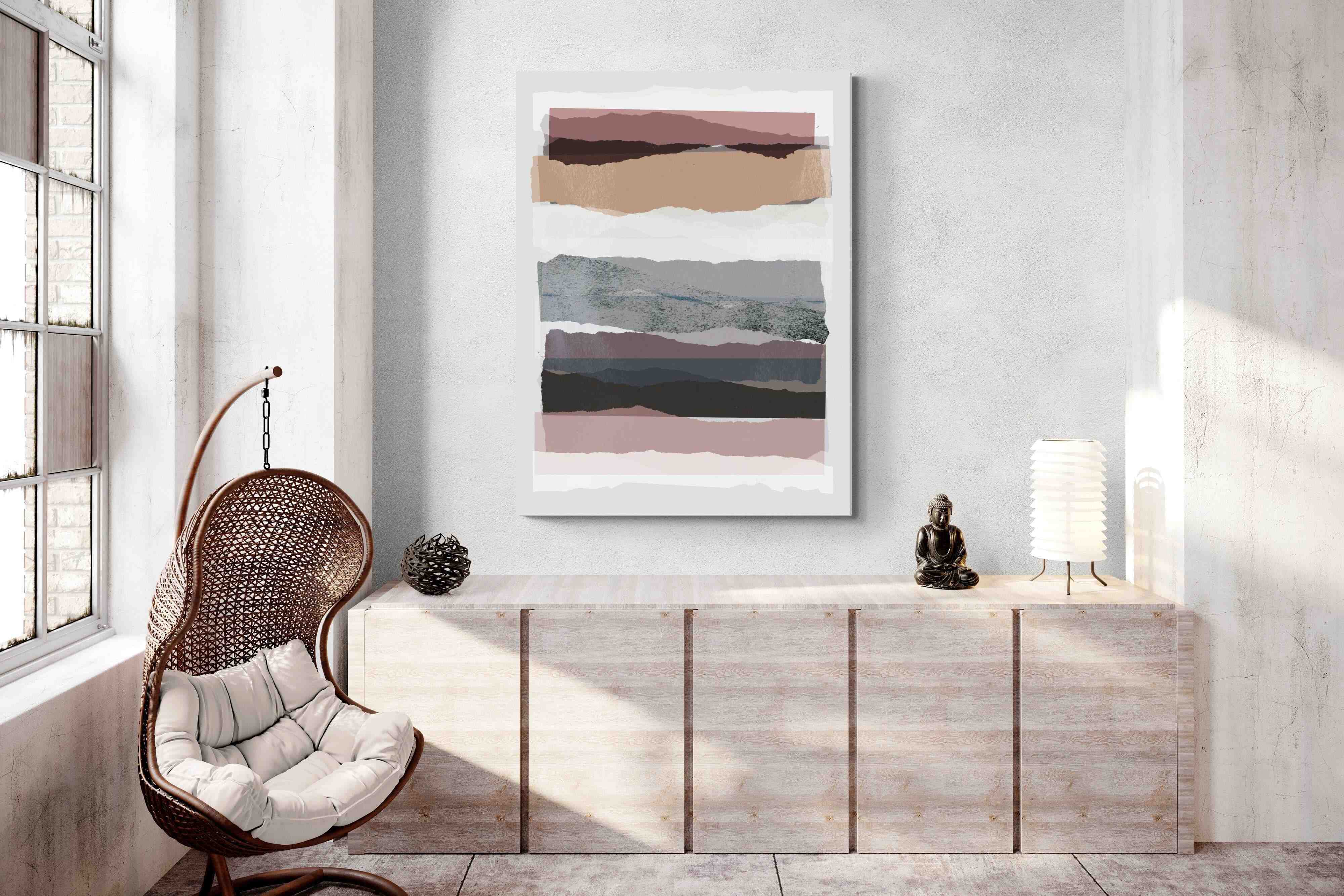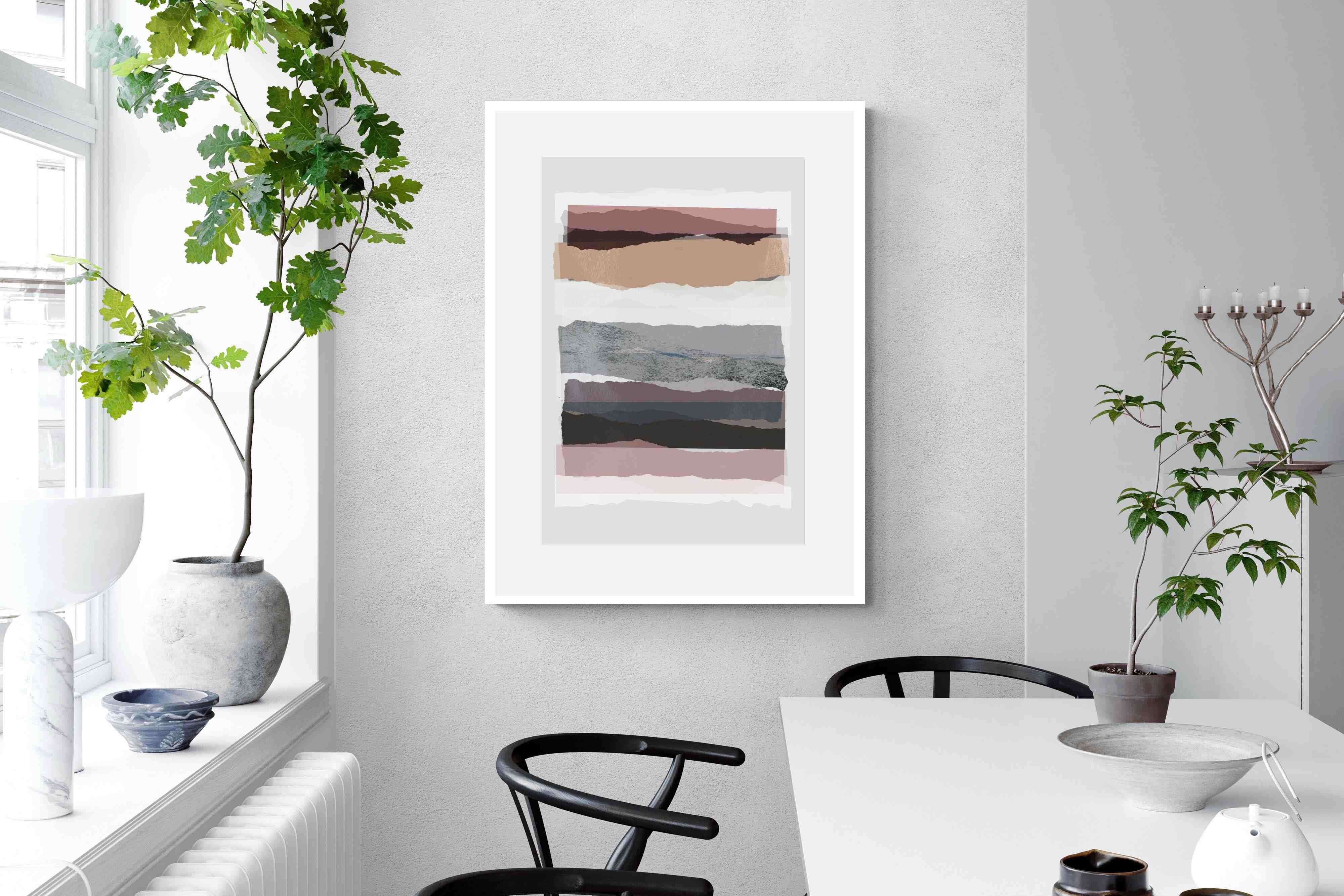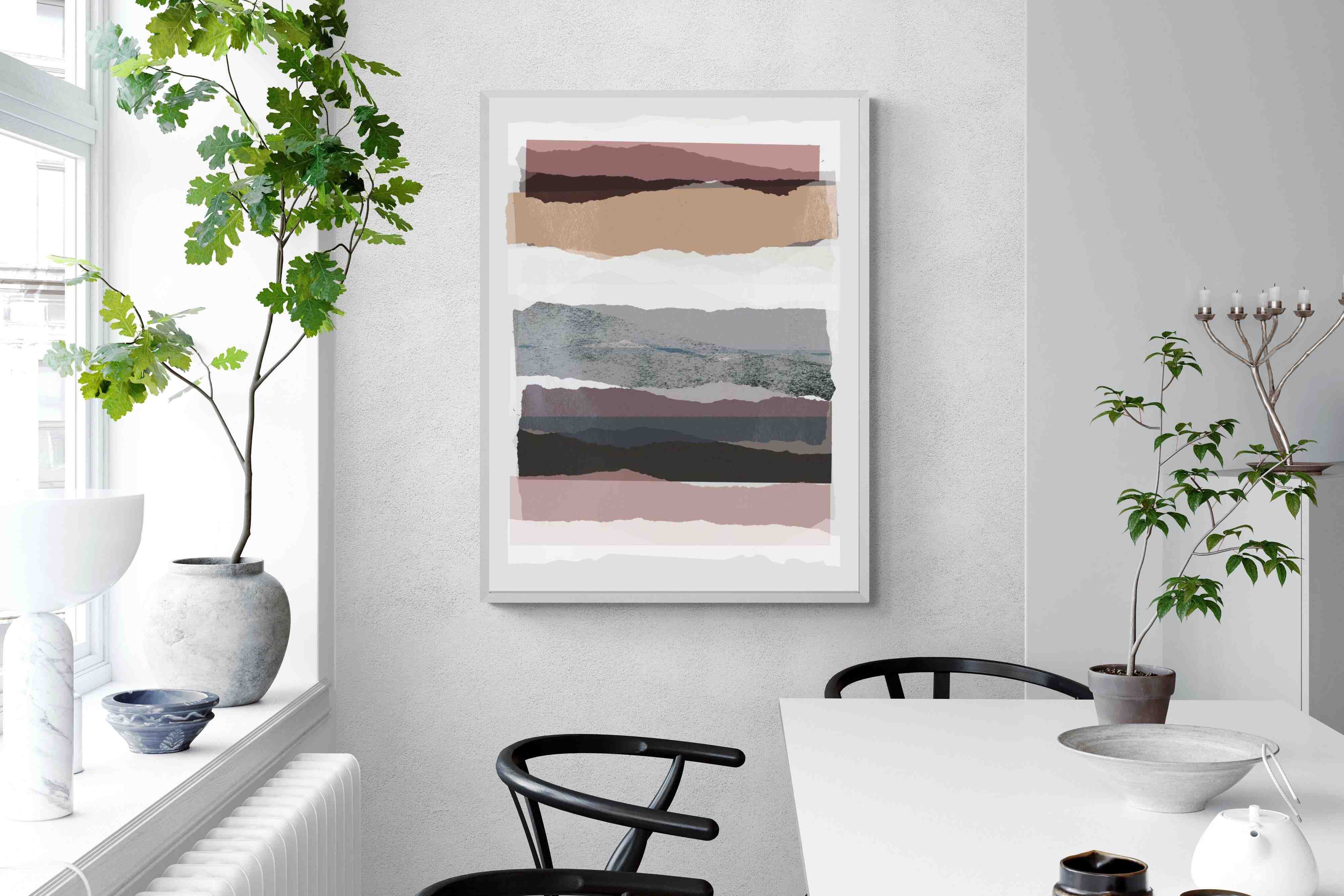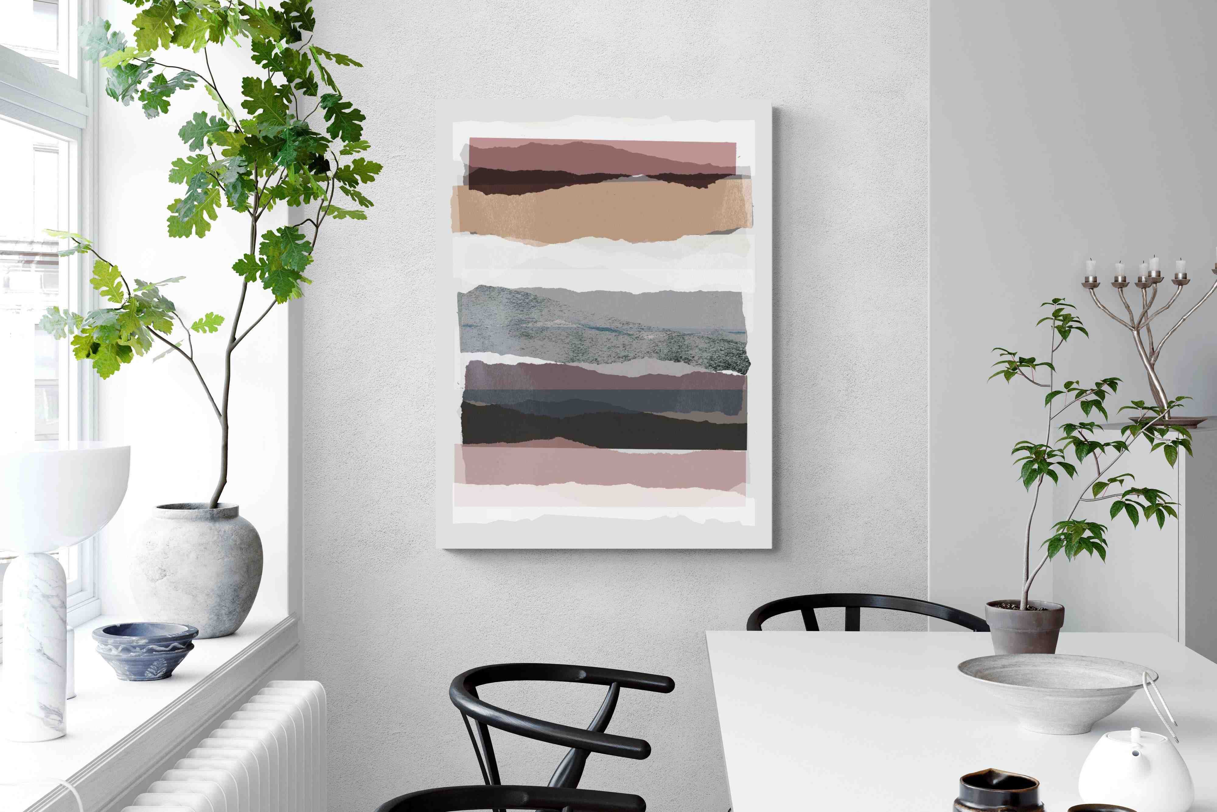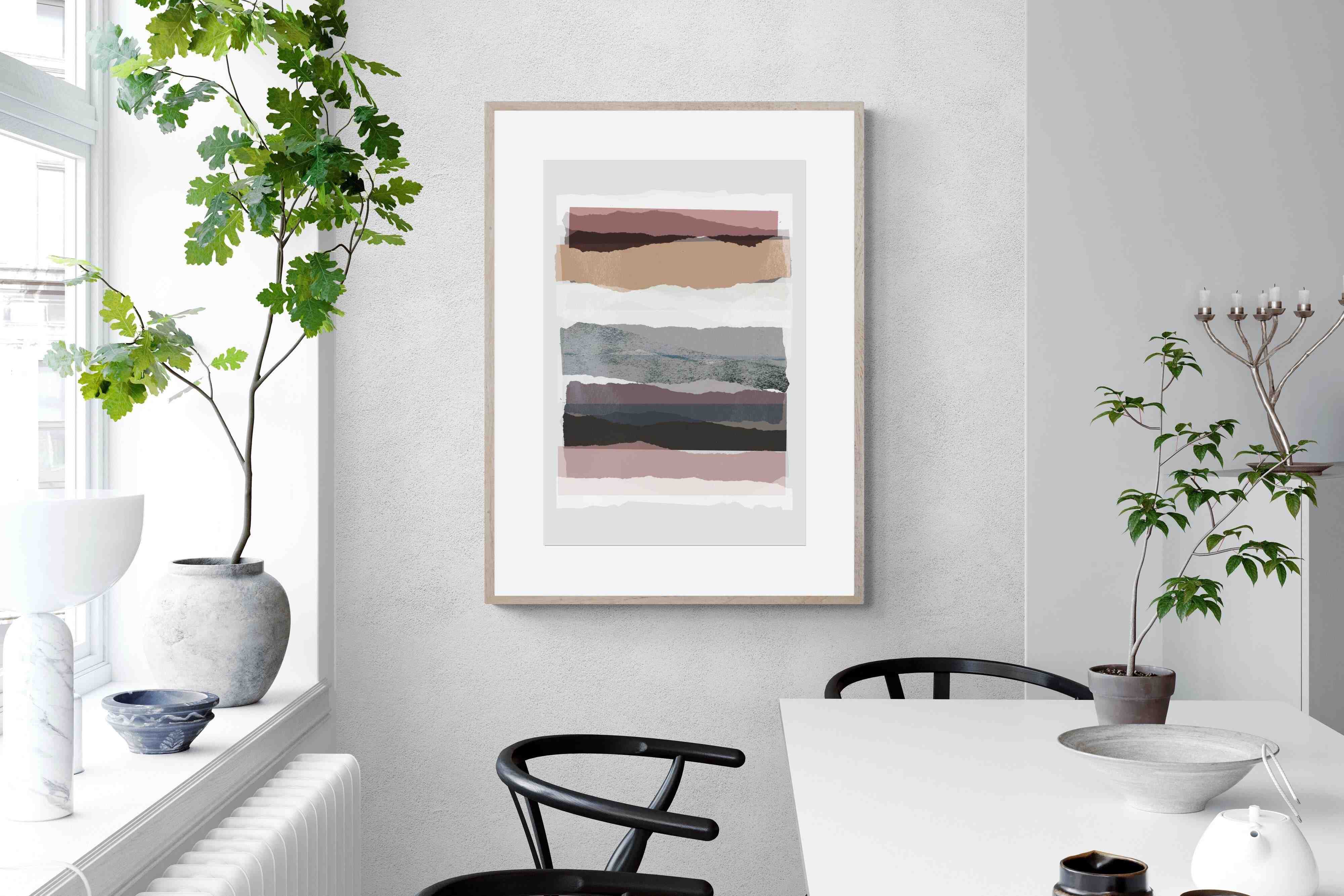 A visually intriguing assemblage of stacked abstract shapes, coloured in pastel shades of earthy browns, creams, and purples. This striking artwork invites viewers to lose themselves in its complex layers and soothing colour palette, making it a powerful focal point in any room. Available as a canvas, framed print, or wallpaper, "Pieces 16" infuses your space with a sophisticated touch of modernist design.