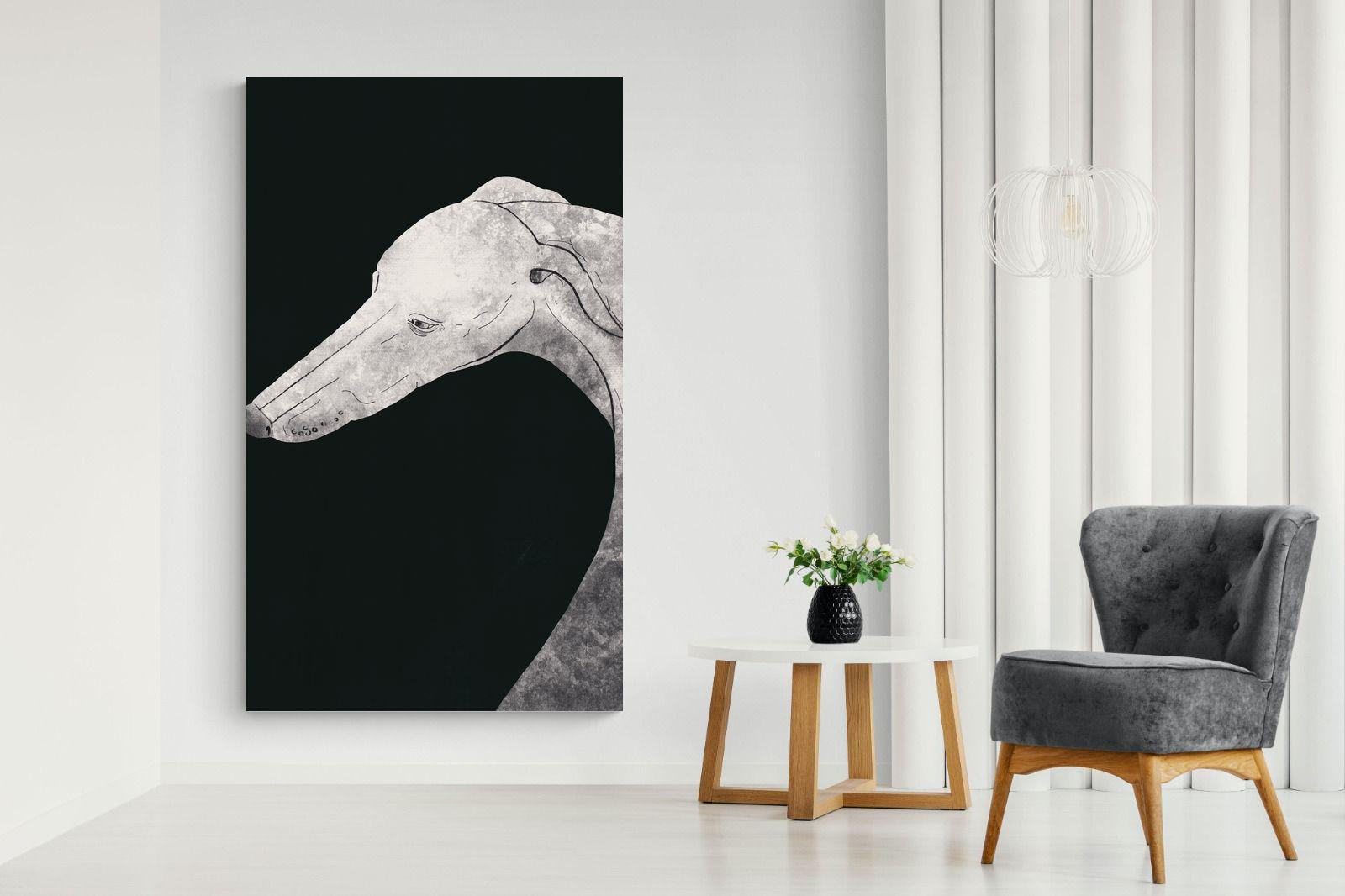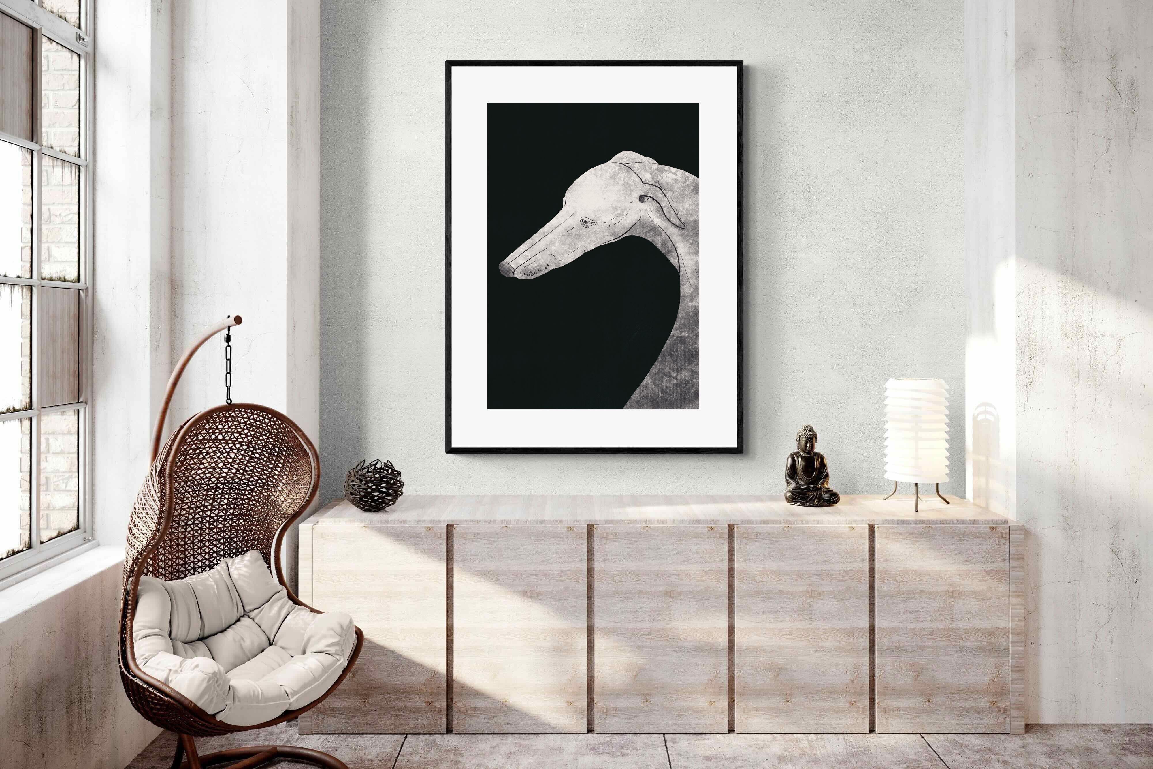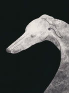 "Noble Gaze" presents the greyhound in a stark, monochromatic palette, emphasising the sleek contours and thoughtful poise that characterise the breed. The use of monochrome intensifies the textural details and the gentle shadows, lending the portrait a timeless quality. This minimalist approach not only honours the subject but also offers a versatile piece suited to any contemporary space.