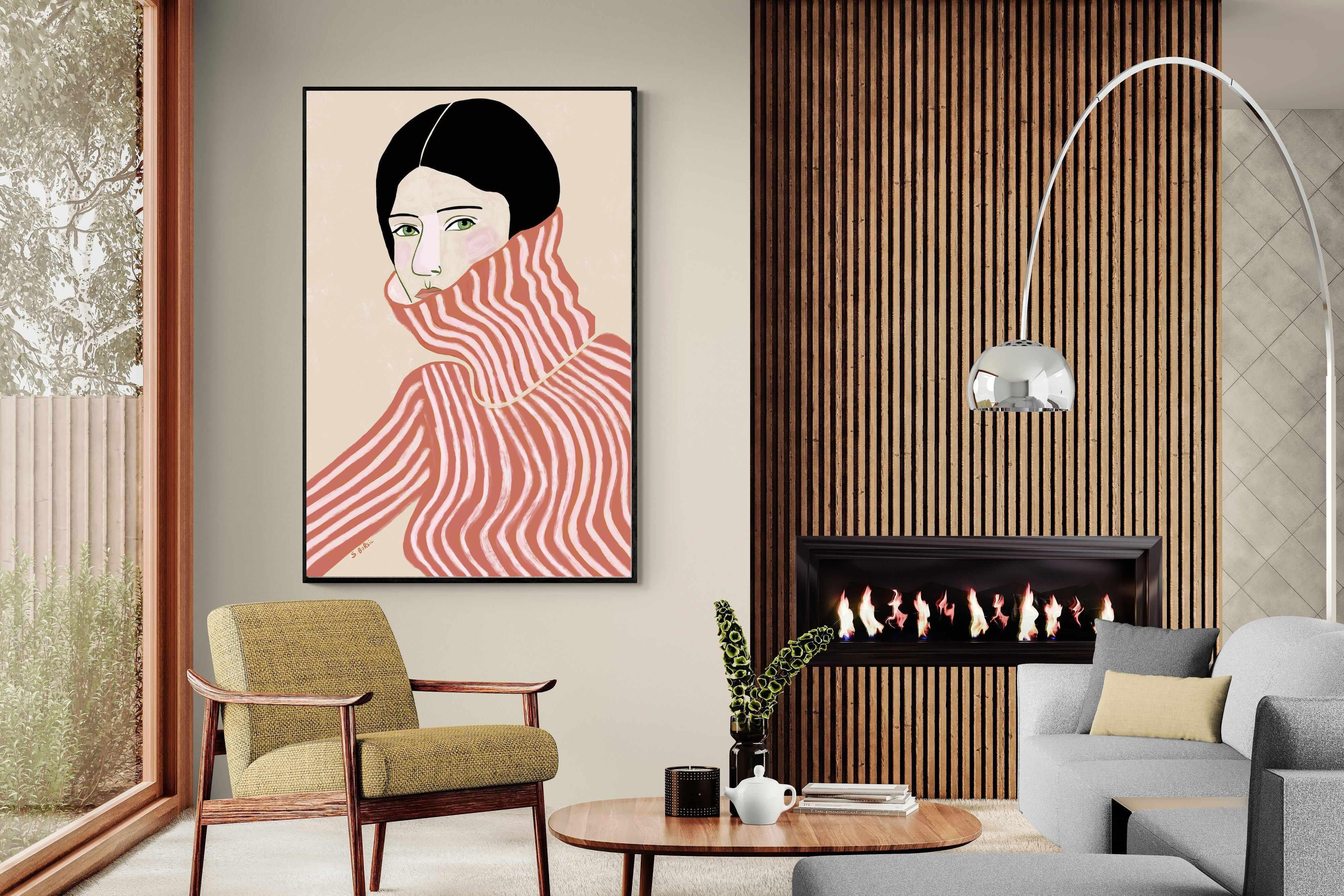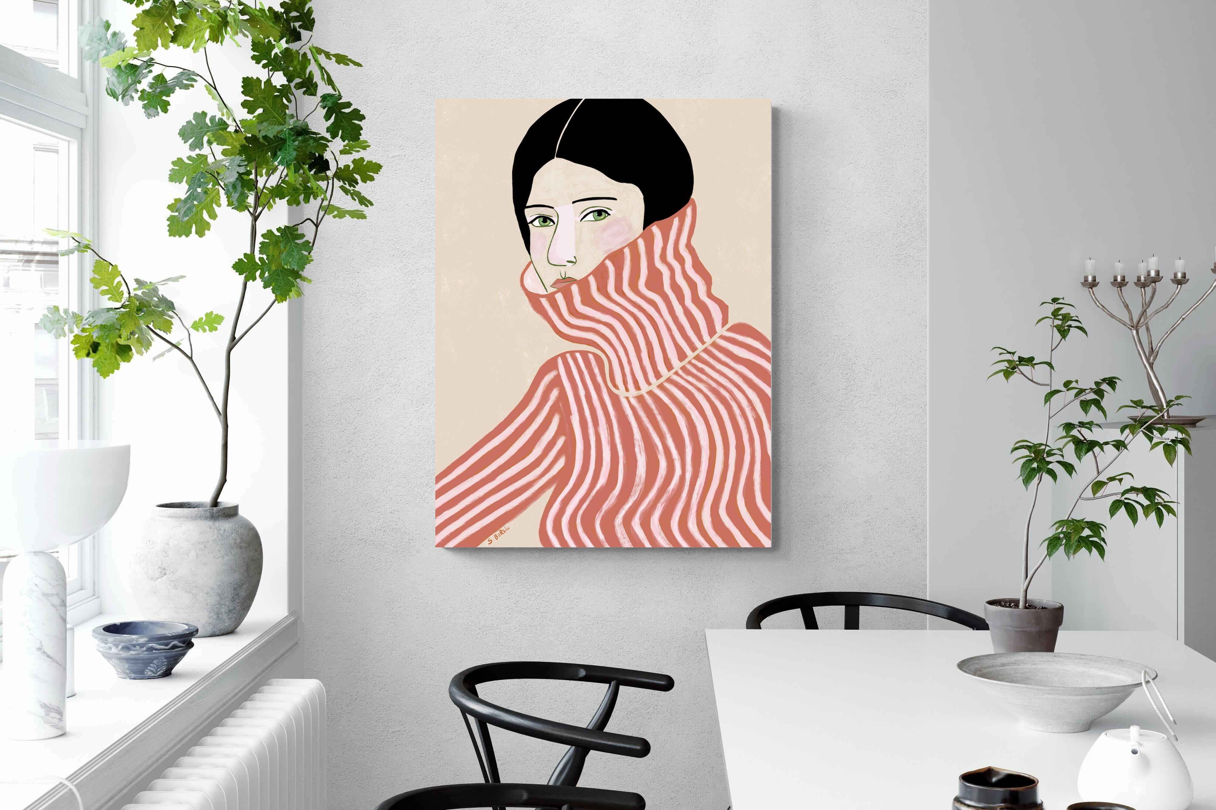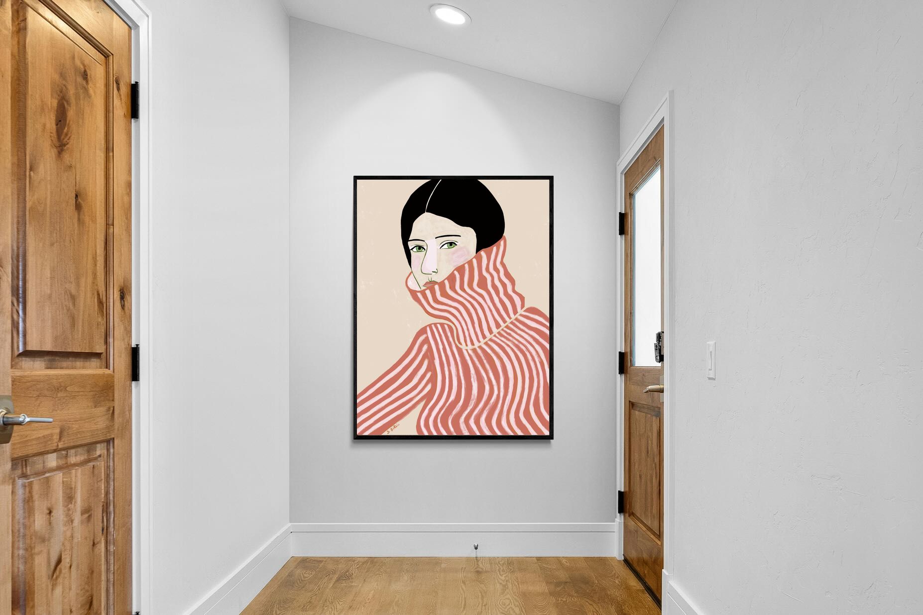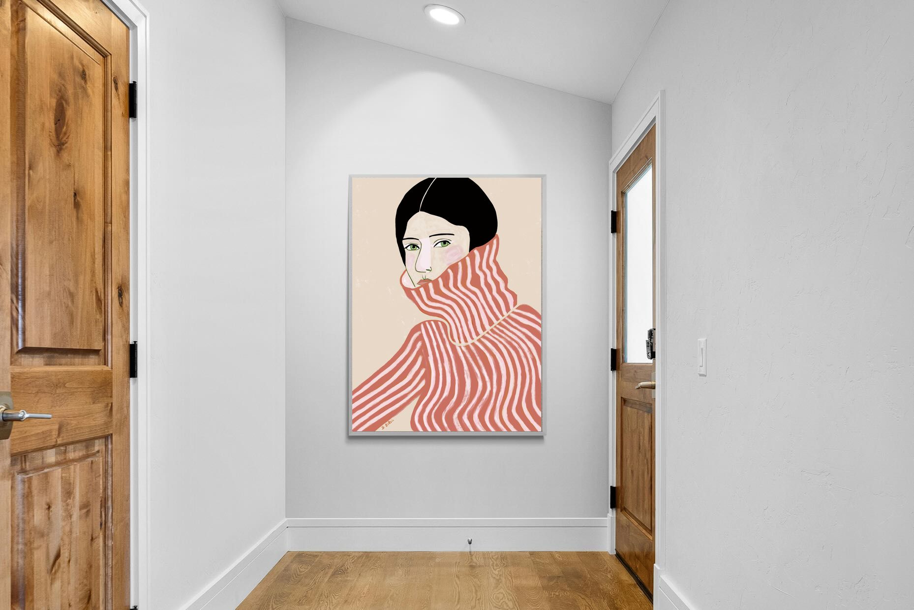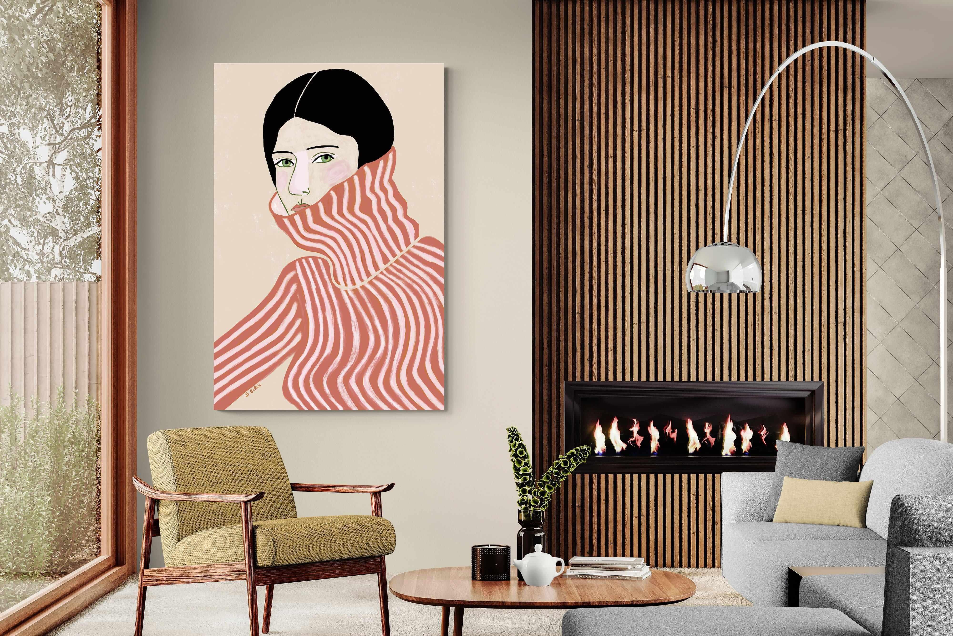 This abstract portrait captivates with its striking use of texture and colour. The soft pink and white stripes of the turtleneck create a sense of movement, while the subject’s piercing green eyes add emotional depth. The combination of minimalist forms and expressive brushwork gives the piece an enigmatic charm. Perfect for a living room or study, this artwork introduces a contemporary yet reflective mood, ideal for sparking thoughtful conversation.