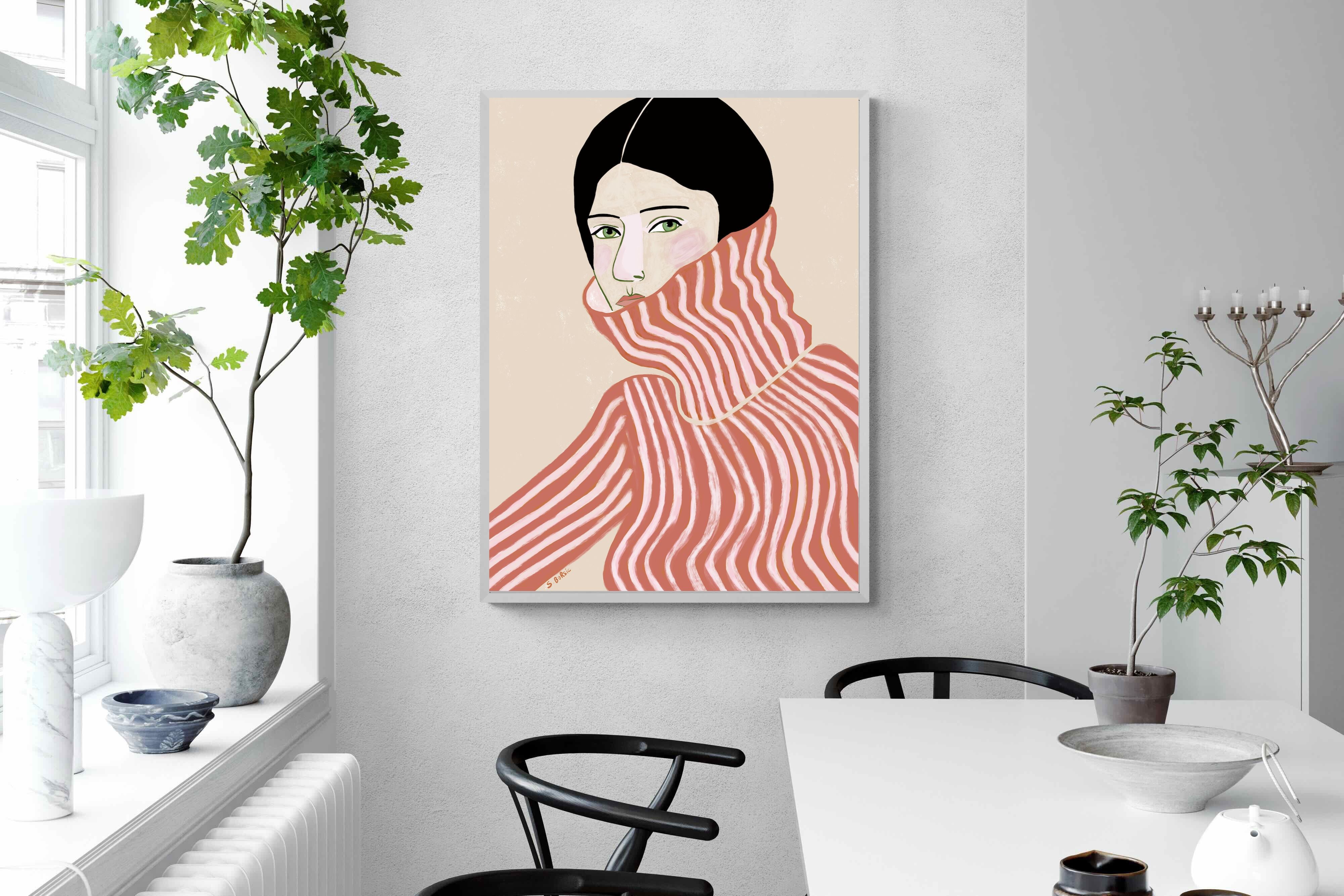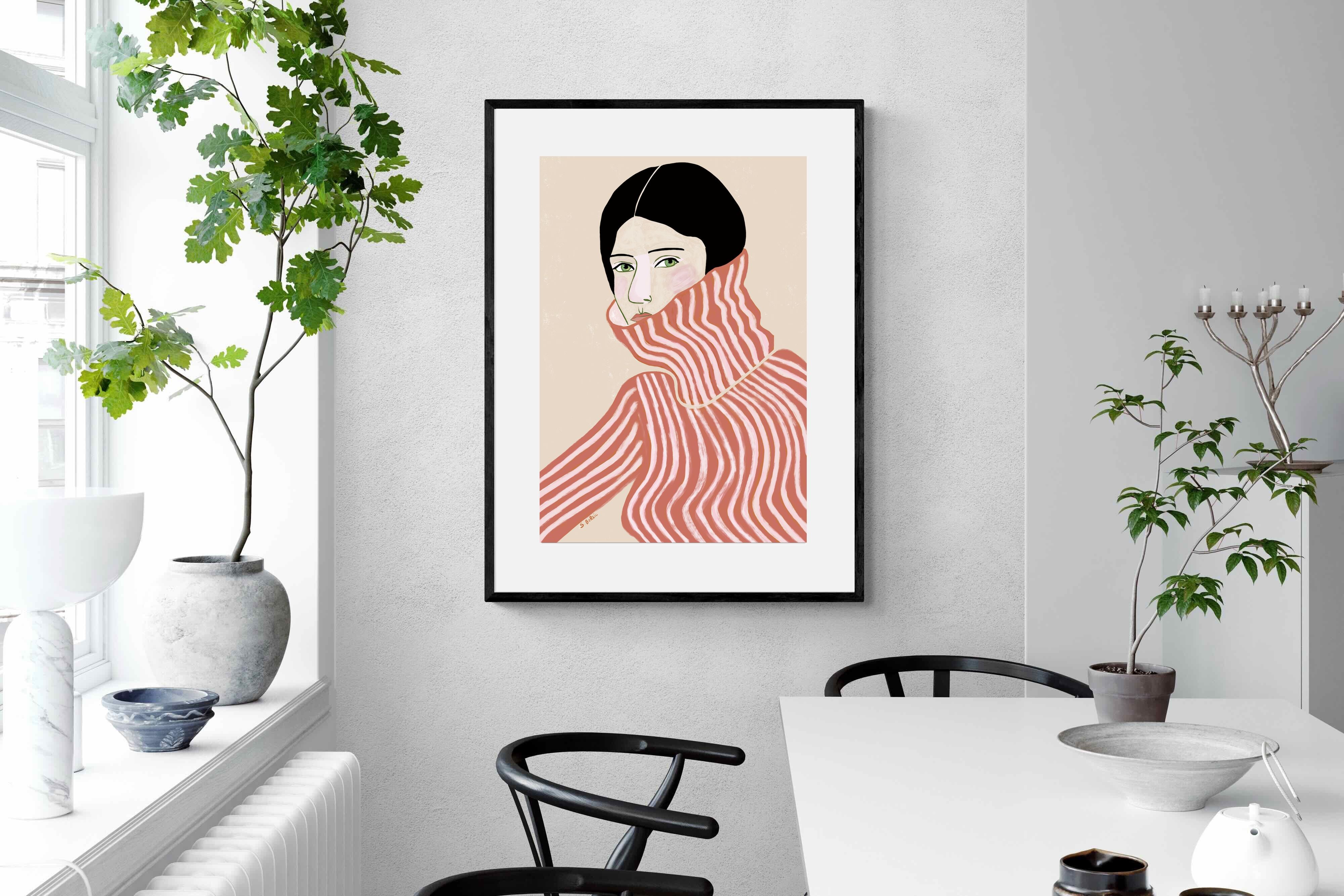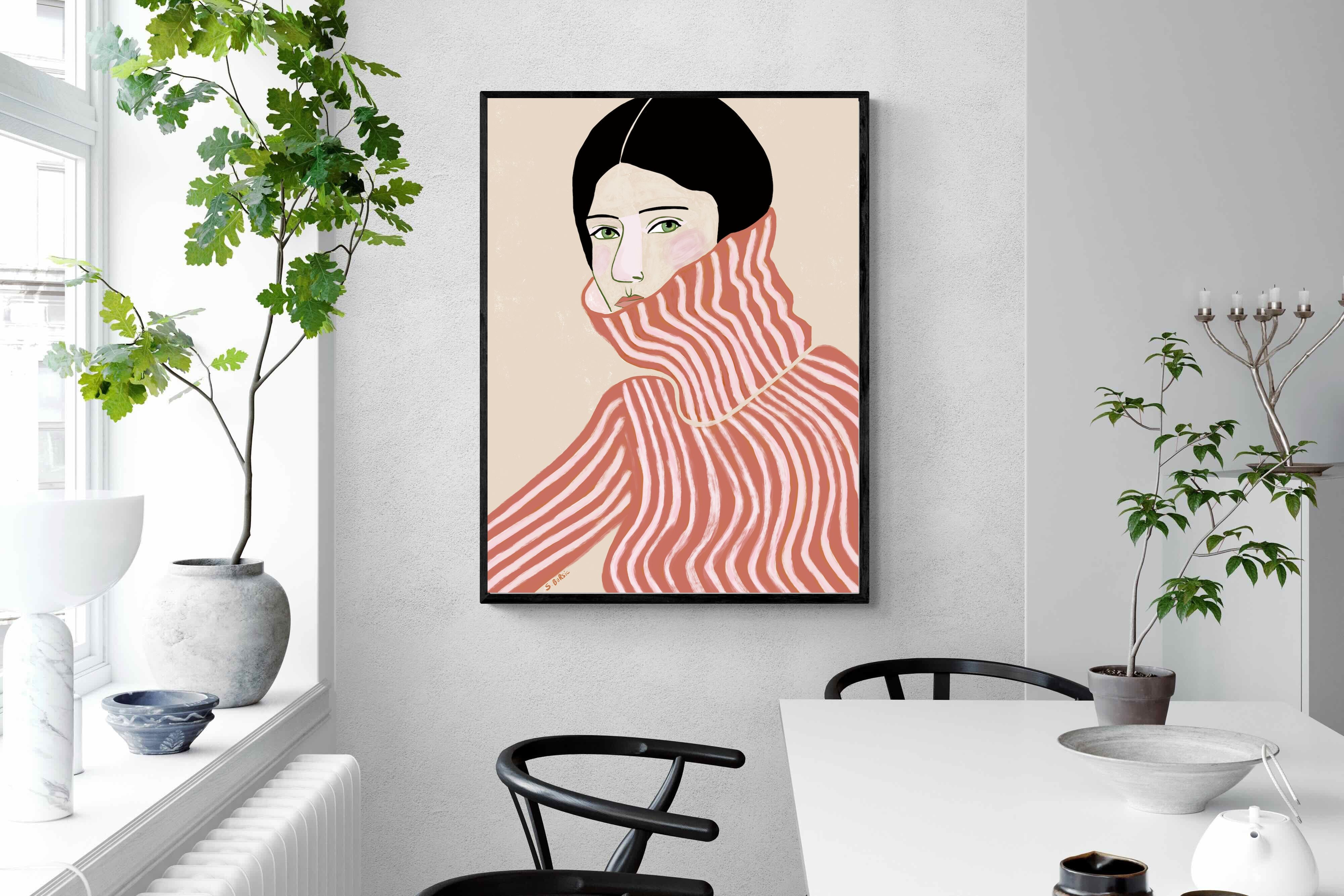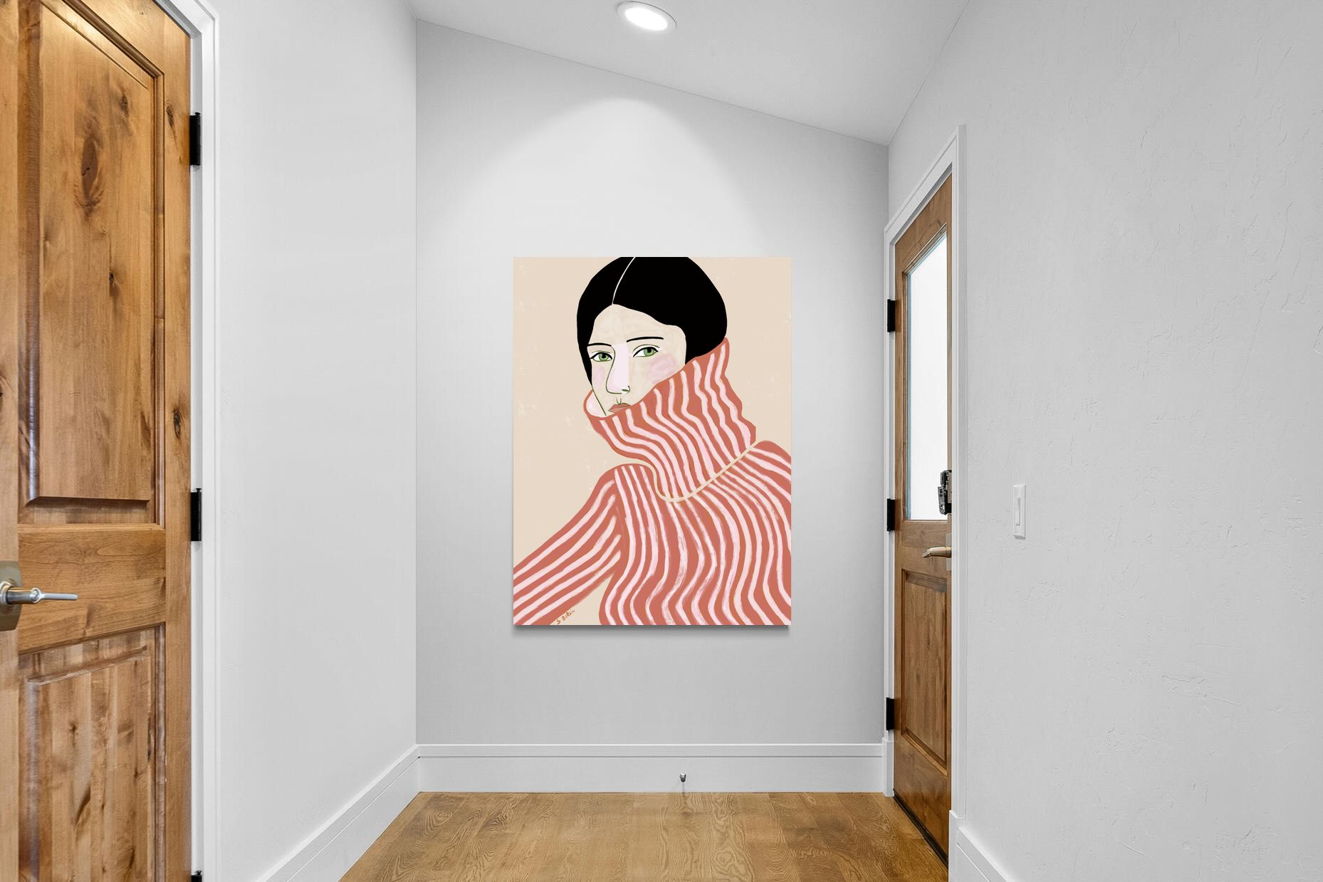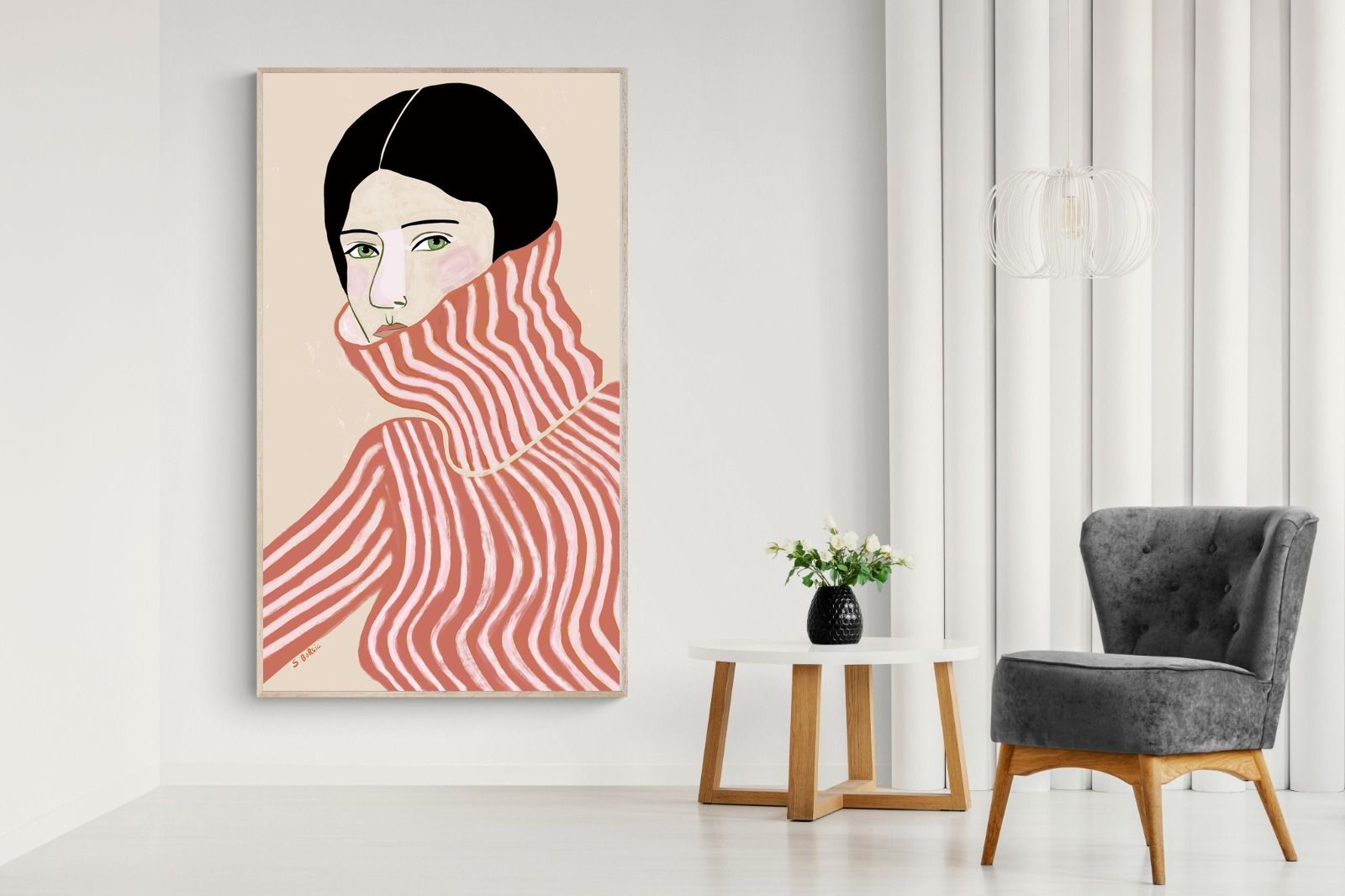 This abstract portrait captivates with its striking use of texture and colour. The soft pink and white stripes of the turtleneck create a sense of movement, while the subject’s piercing green eyes add emotional depth. The combination of minimalist forms and expressive brushwork gives the piece an enigmatic charm. Perfect for a living room or study, this artwork introduces a contemporary yet reflective mood, ideal for sparking thoughtful conversation.