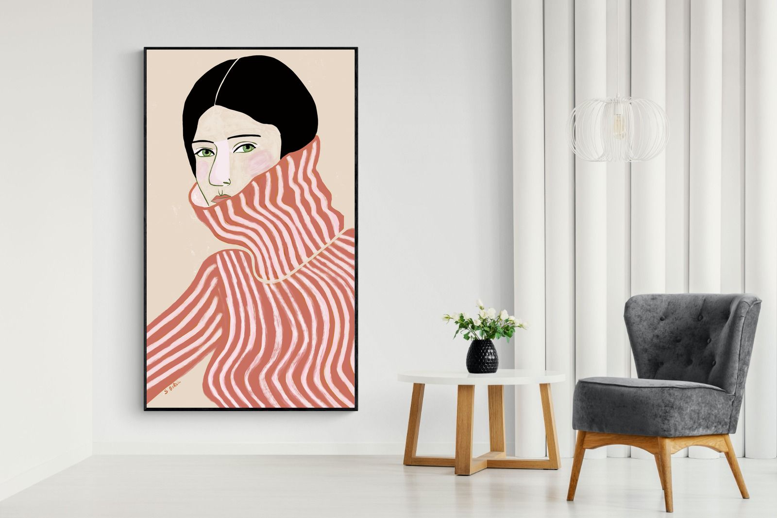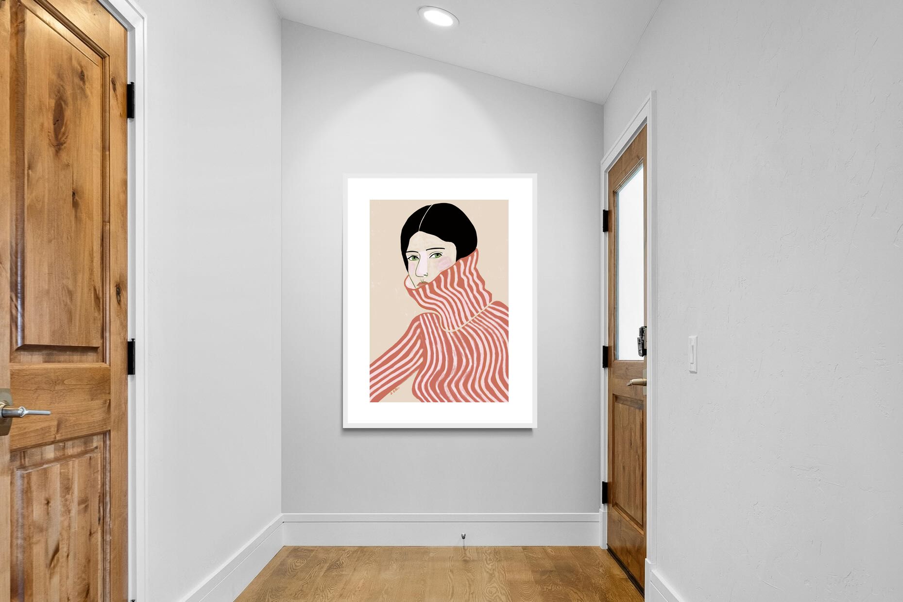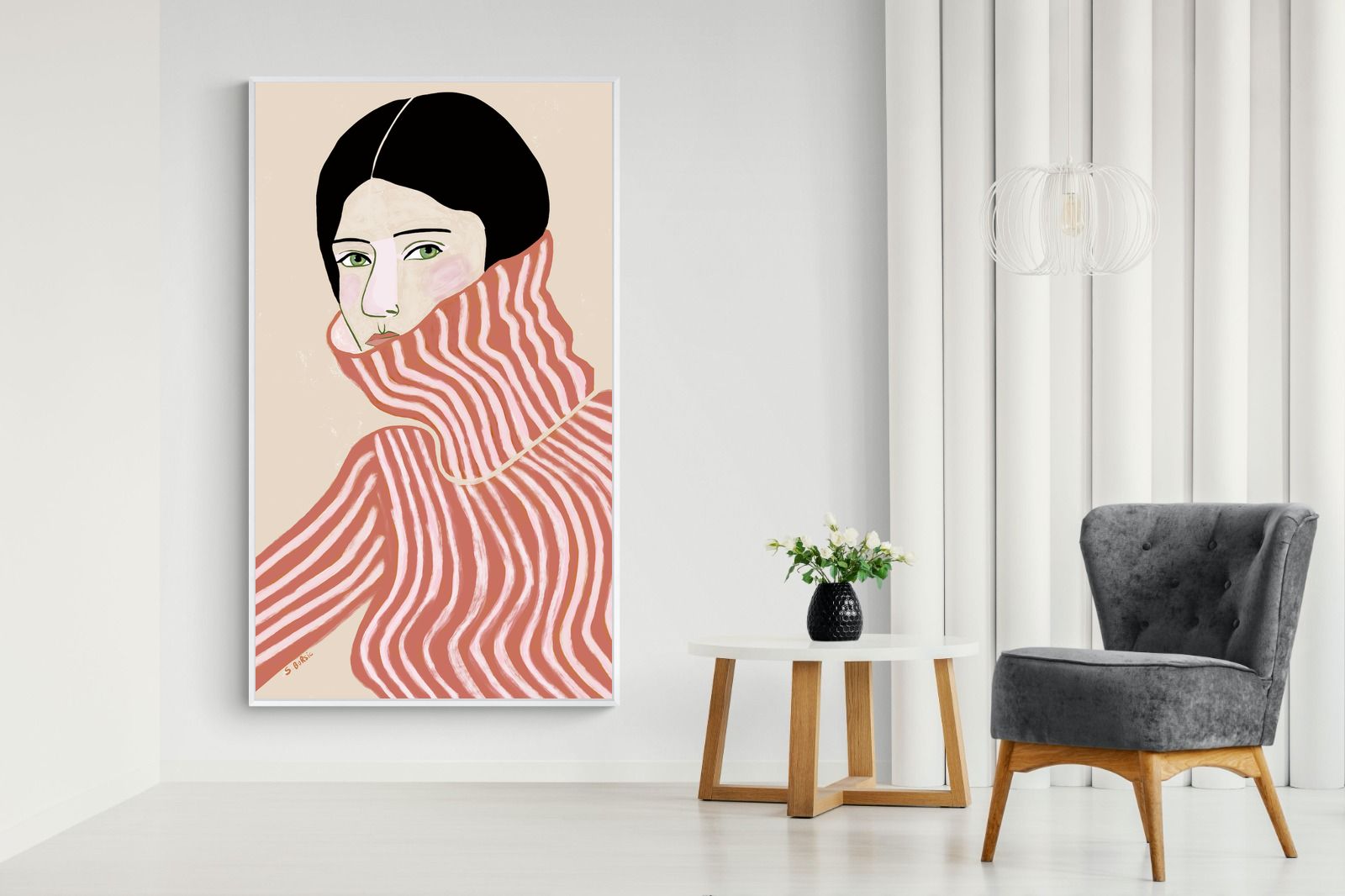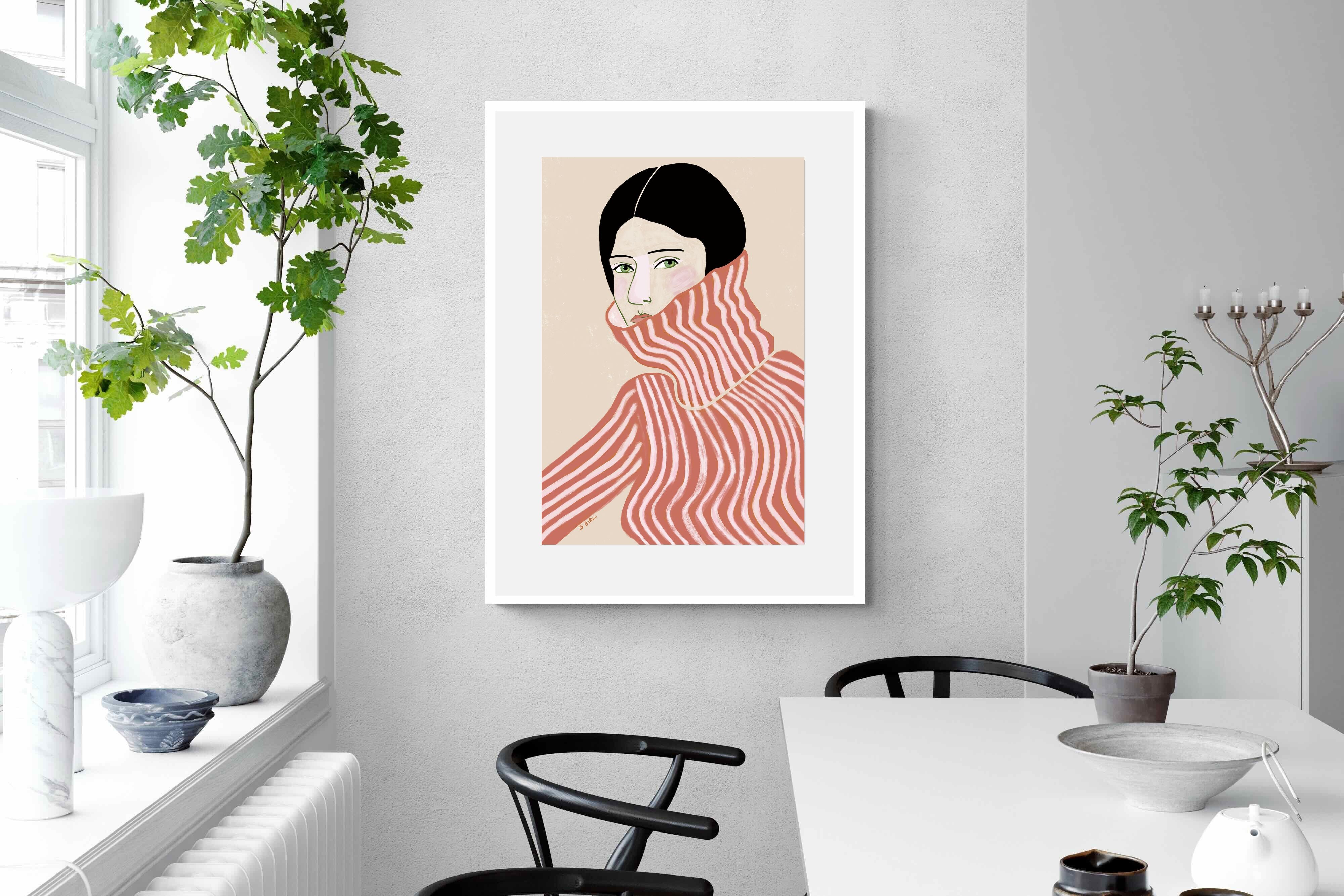 This abstract portrait captivates with its striking use of texture and colour. The soft pink and white stripes of the turtleneck create a sense of movement, while the subject’s piercing green eyes add emotional depth. The combination of minimalist forms and expressive brushwork gives the piece an enigmatic charm. Perfect for a living room or study, this artwork introduces a contemporary yet reflective mood, ideal for sparking thoughtful conversation.