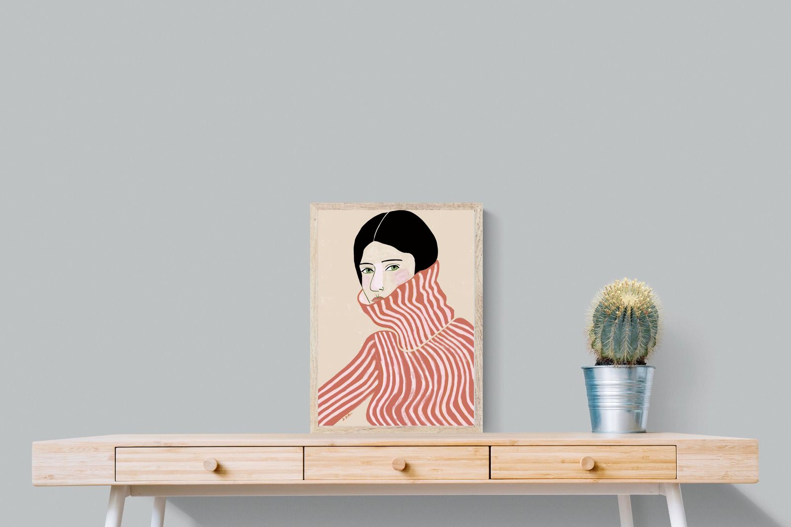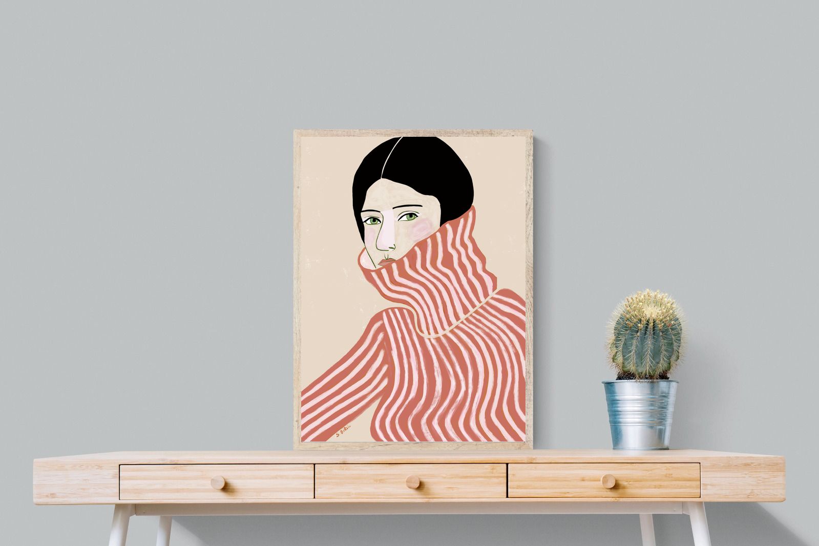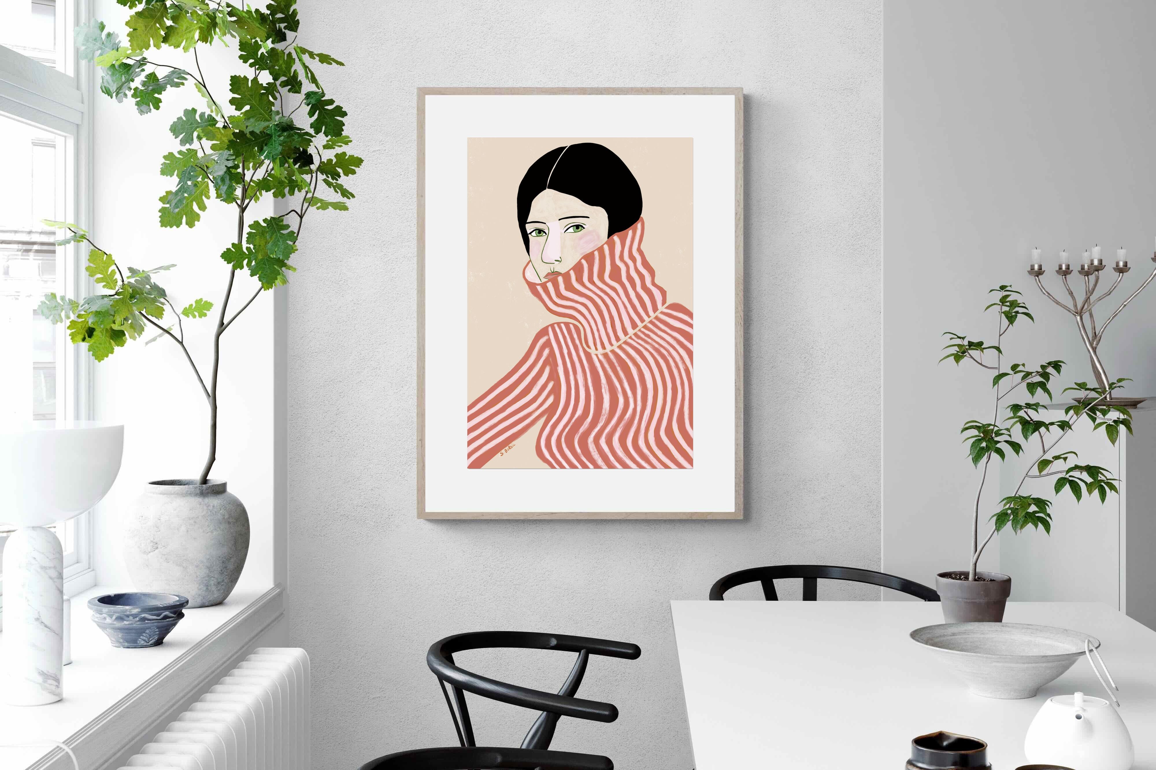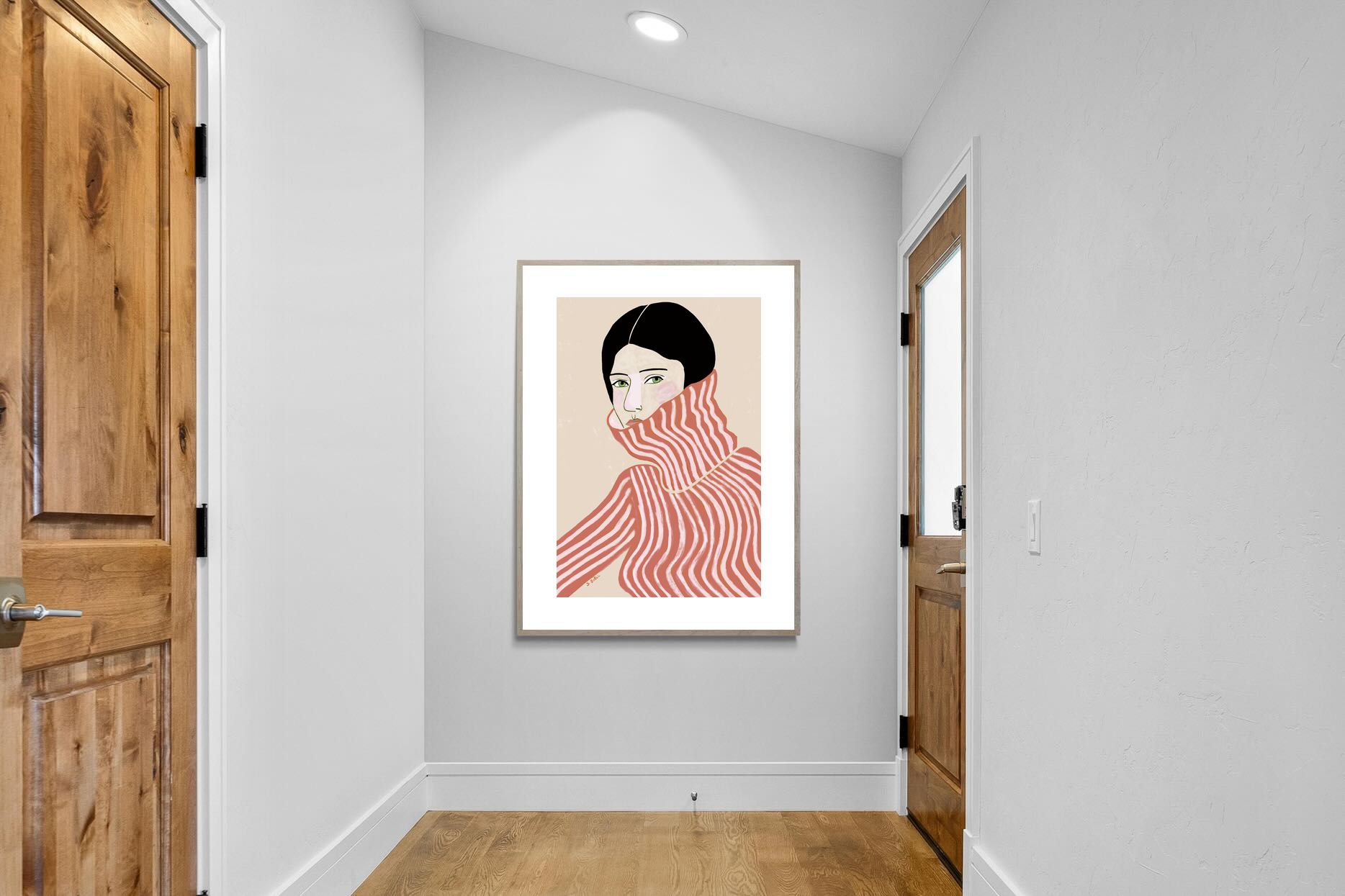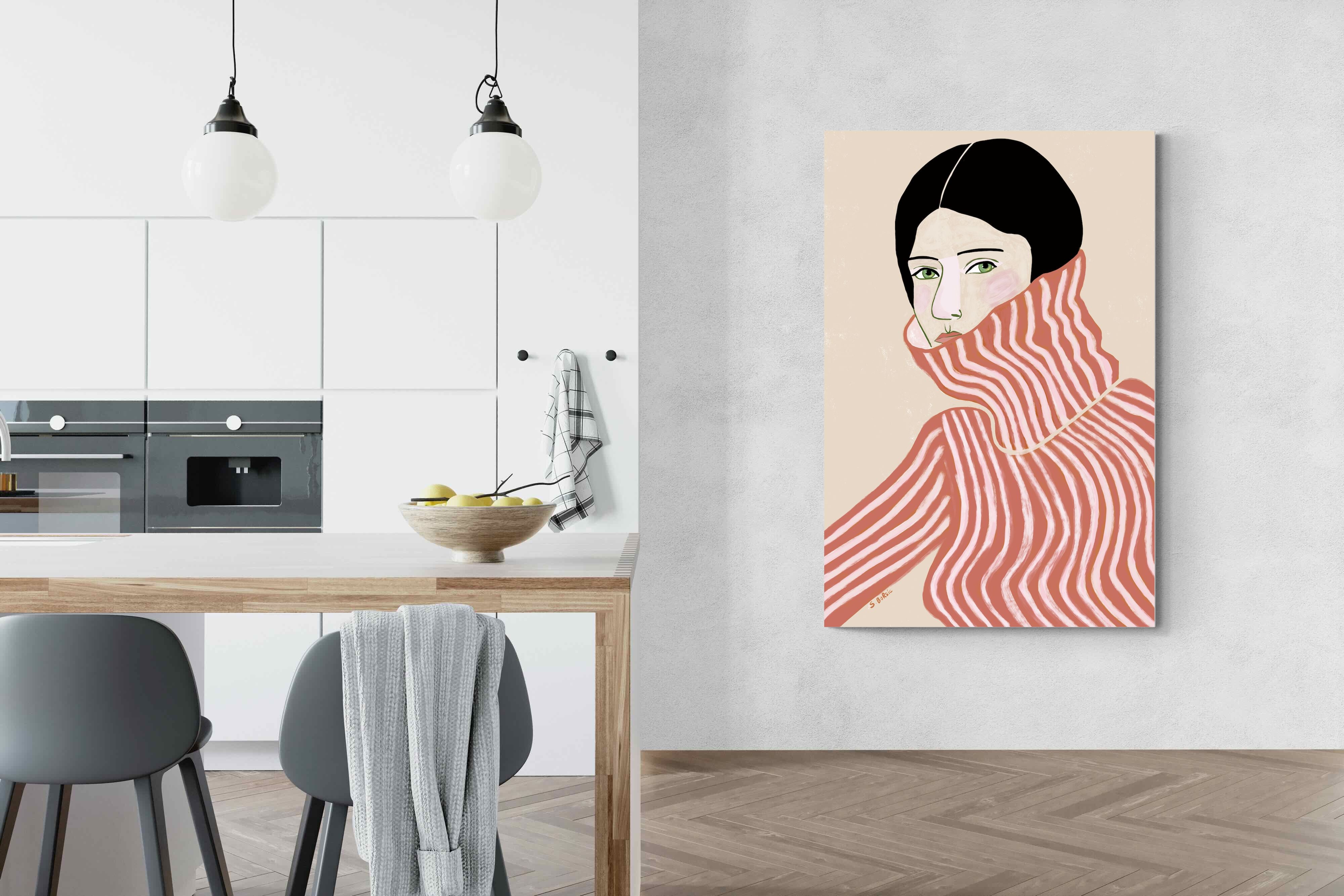 This abstract portrait captivates with its striking use of texture and colour. The soft pink and white stripes of the turtleneck create a sense of movement, while the subject’s piercing green eyes add emotional depth. The combination of minimalist forms and expressive brushwork gives the piece an enigmatic charm. Perfect for a living room or study, this artwork introduces a contemporary yet reflective mood, ideal for sparking thoughtful conversation.