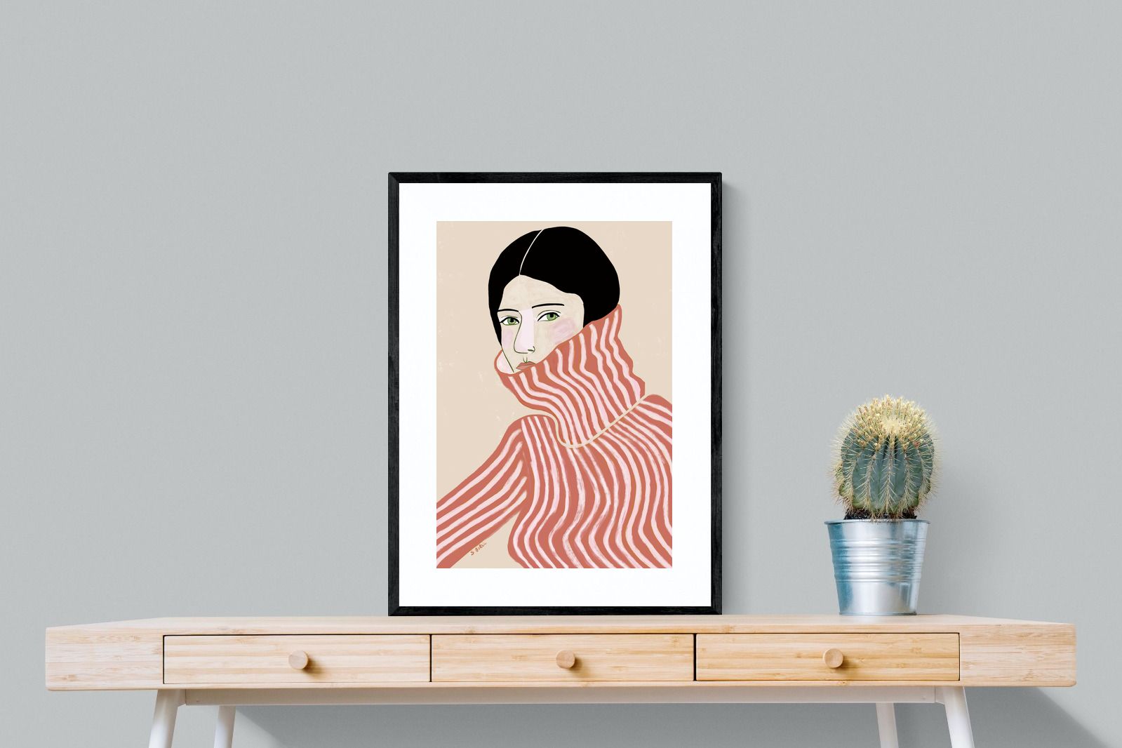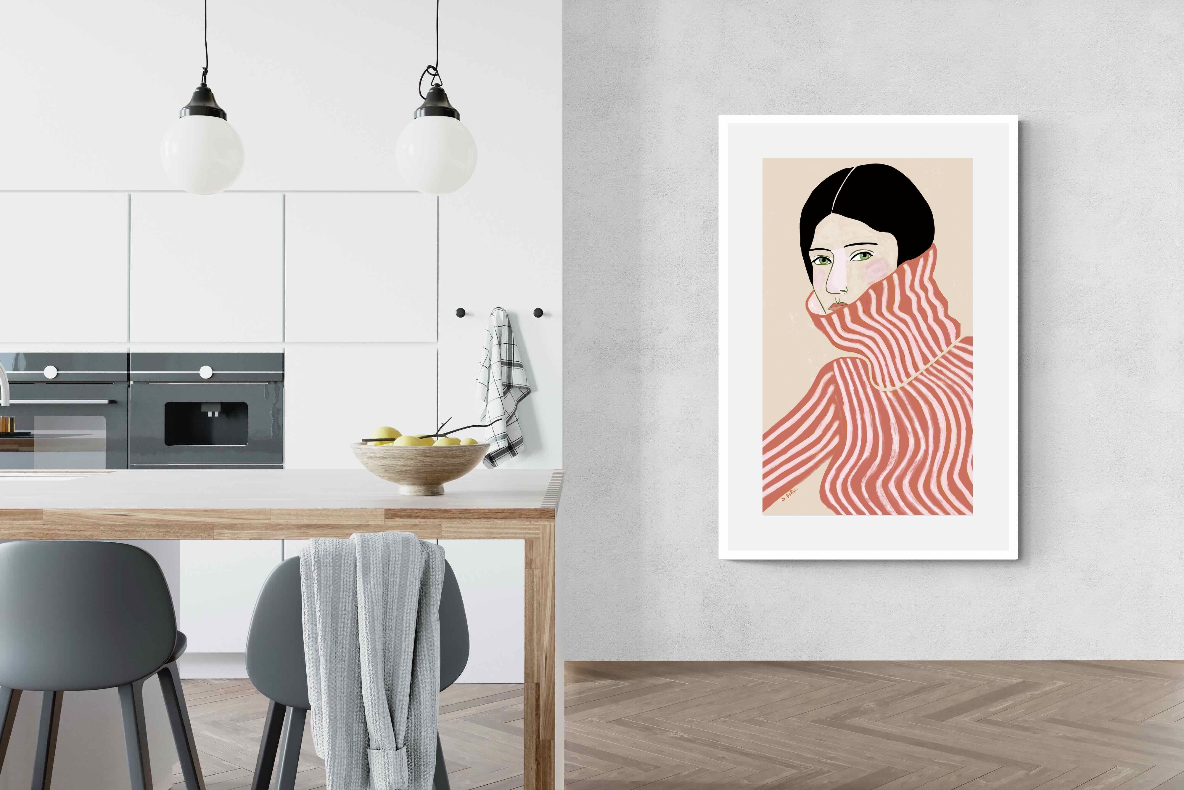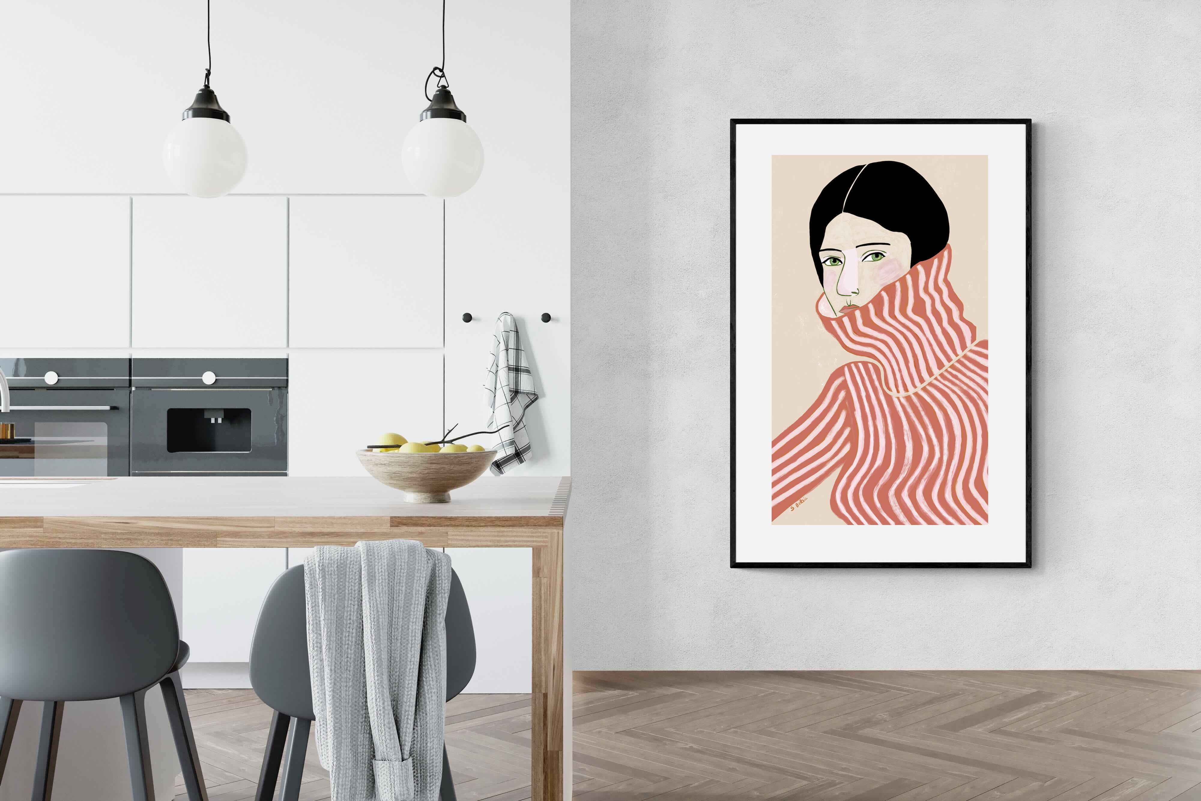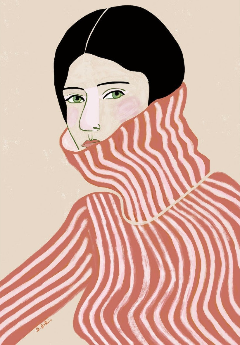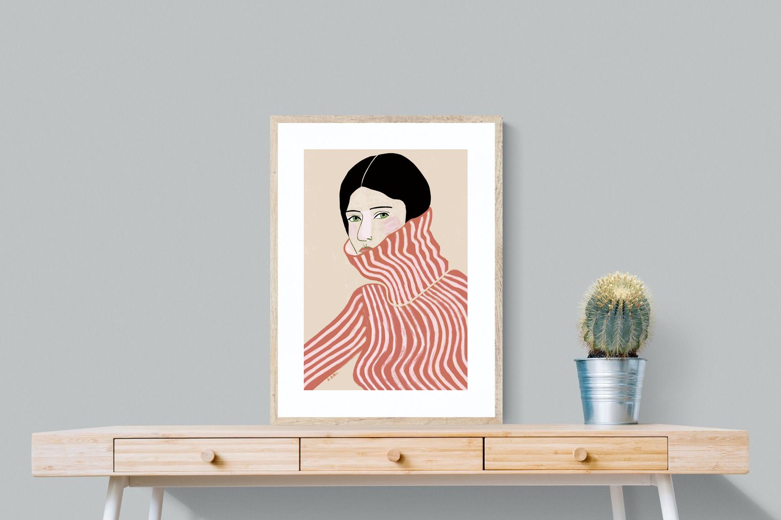This abstract portrait captivates with its striking use of texture and colour. The soft pink and white stripes of the turtleneck create a sense of movement, while the subject’s piercing green eyes add emotional depth. The combination of minimalist forms and expressive brushwork gives the piece an enigmatic charm. Perfect for a living room or study, this artwork introduces a contemporary yet reflective mood, ideal for sparking thoughtful conversation.